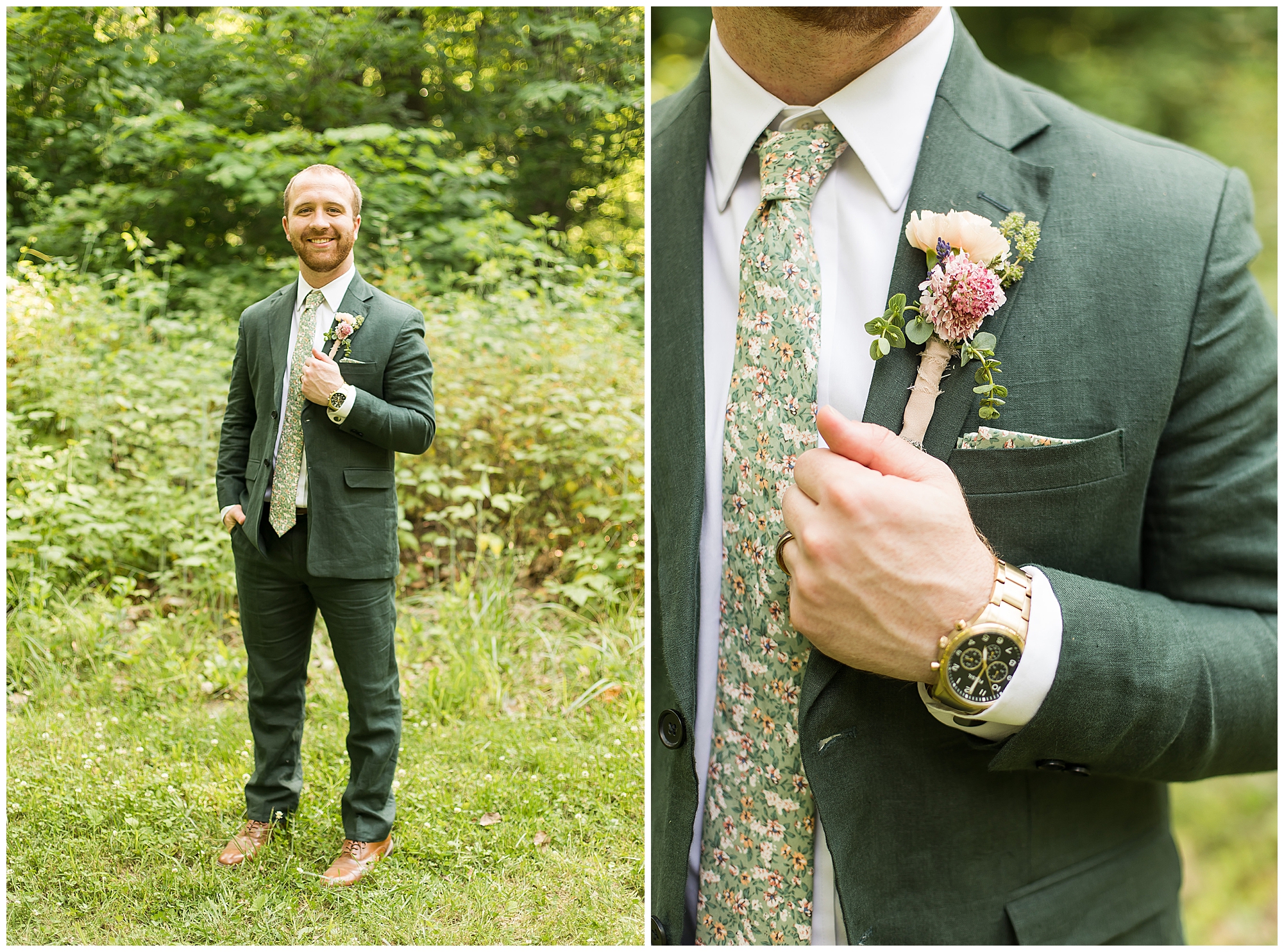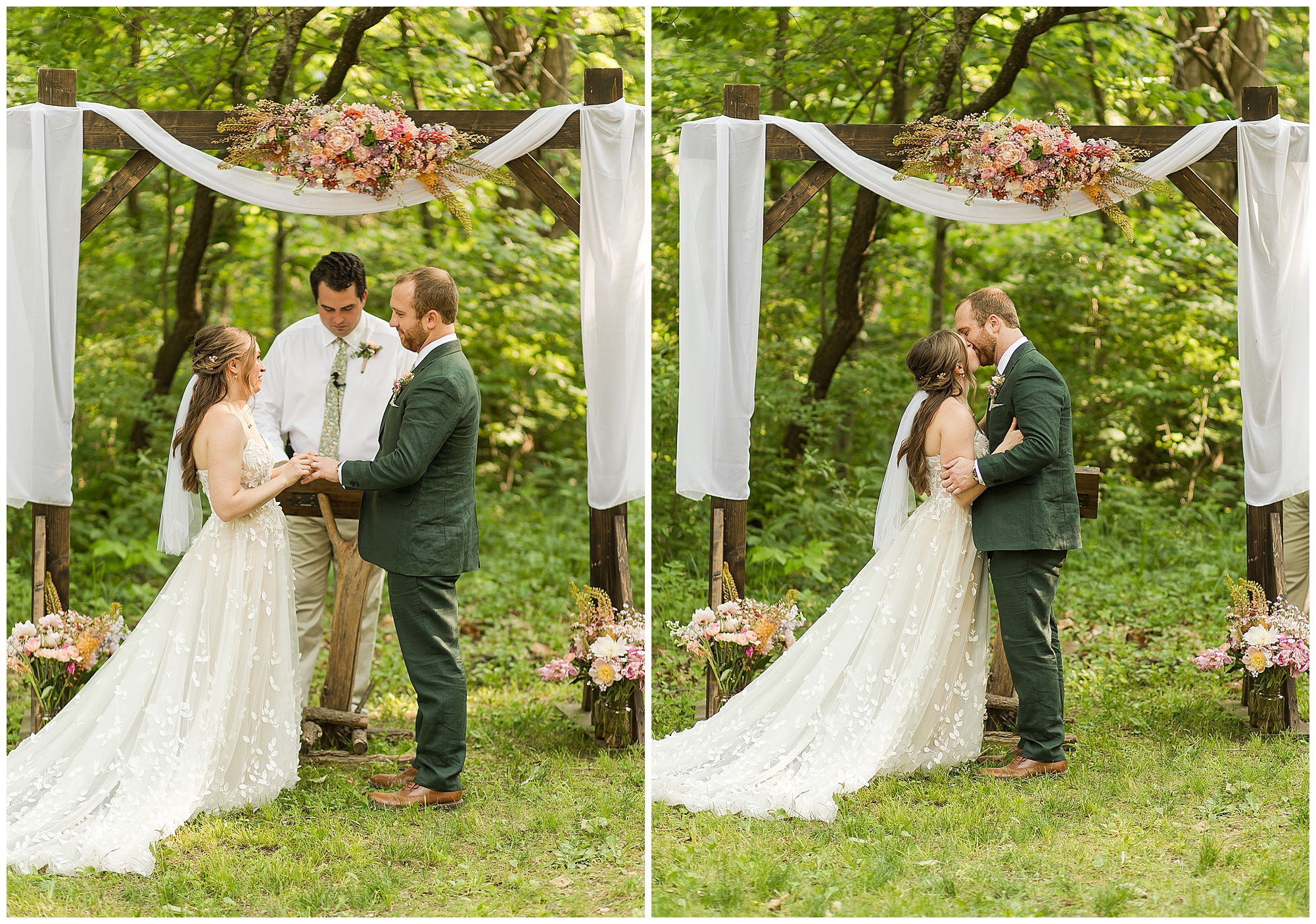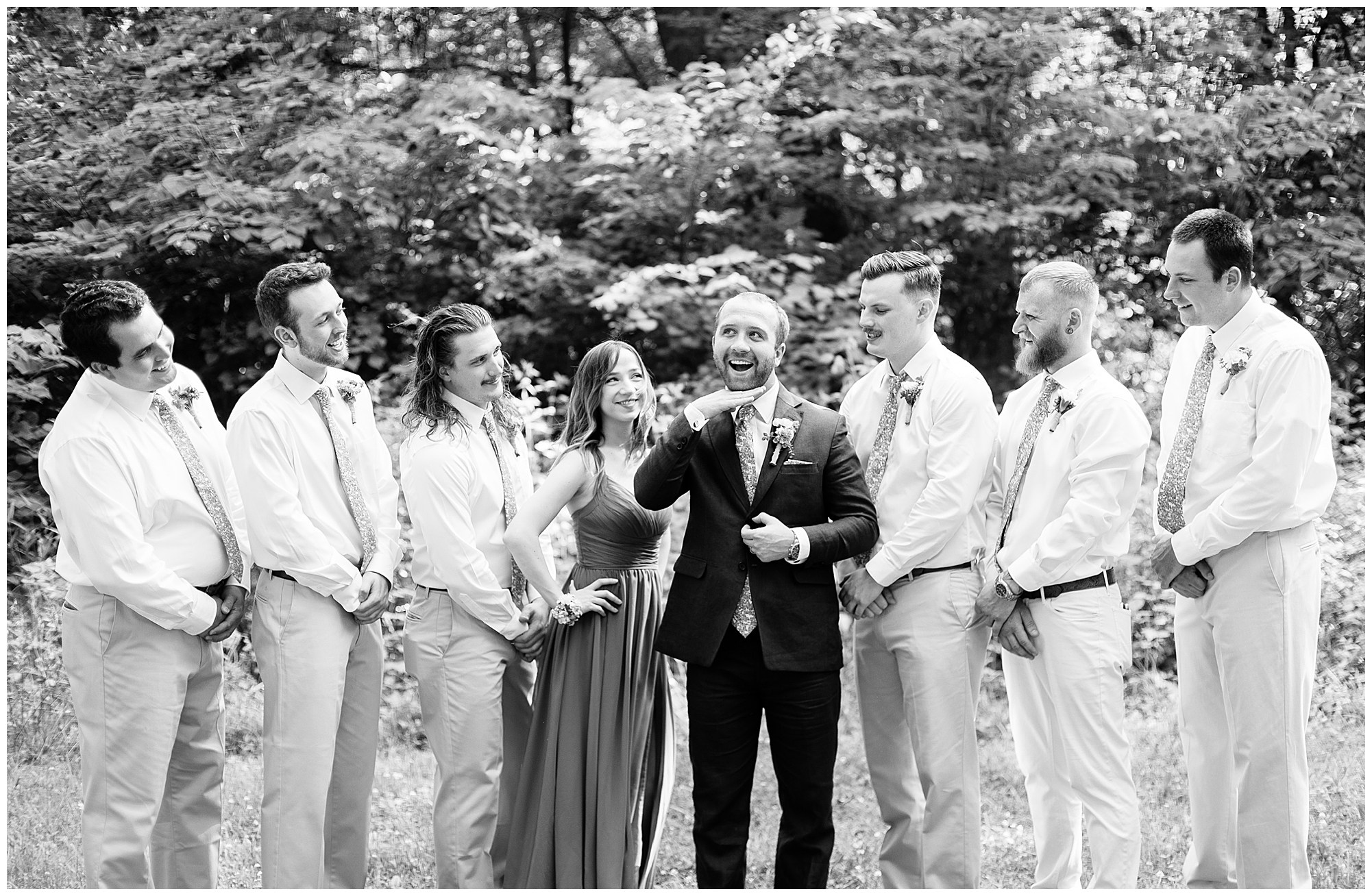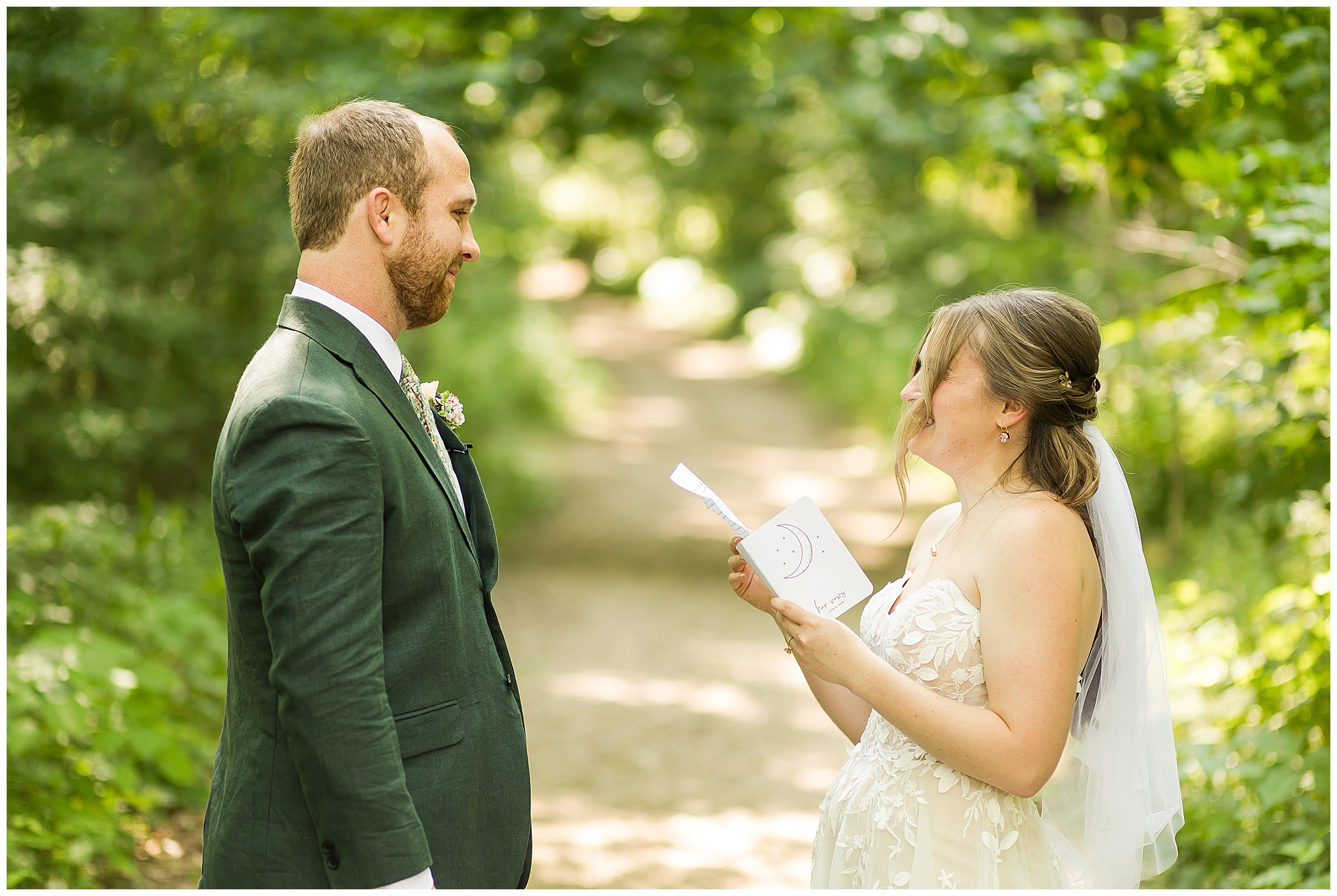 It then came time for Keely and Jake’s first look! We found a little path in the woods tucked away for these two to have a private moment. You couldn’t have wiped off the smile from Jake’s face if you tried after he saw his bride to be. They decided to read their private vows to one another and their heartfelt words were emotional, touching, with a little dash of humor. So sweet! Then it was time to get the whole bridal party together for some fun. This crew was a blast to work with and were so helpful throughout the day. Jake’s crew wore timeless button-down white shirts and the same floral green and cream ties with khakis. And his groomswoman looked awesome and wore a lovely green dress similar to the bridesmaids. Once the enjoyment was done with the bridal party, it was time for these two to say, “I Do”!