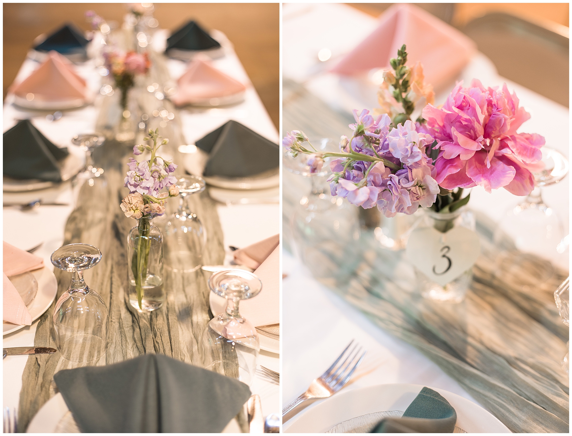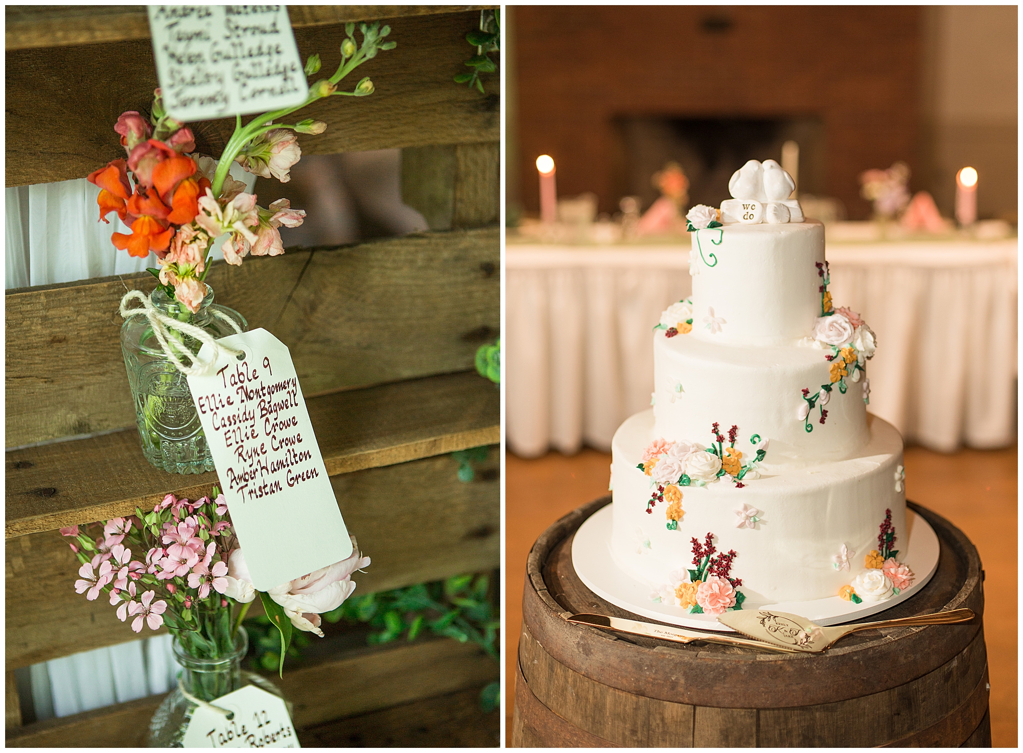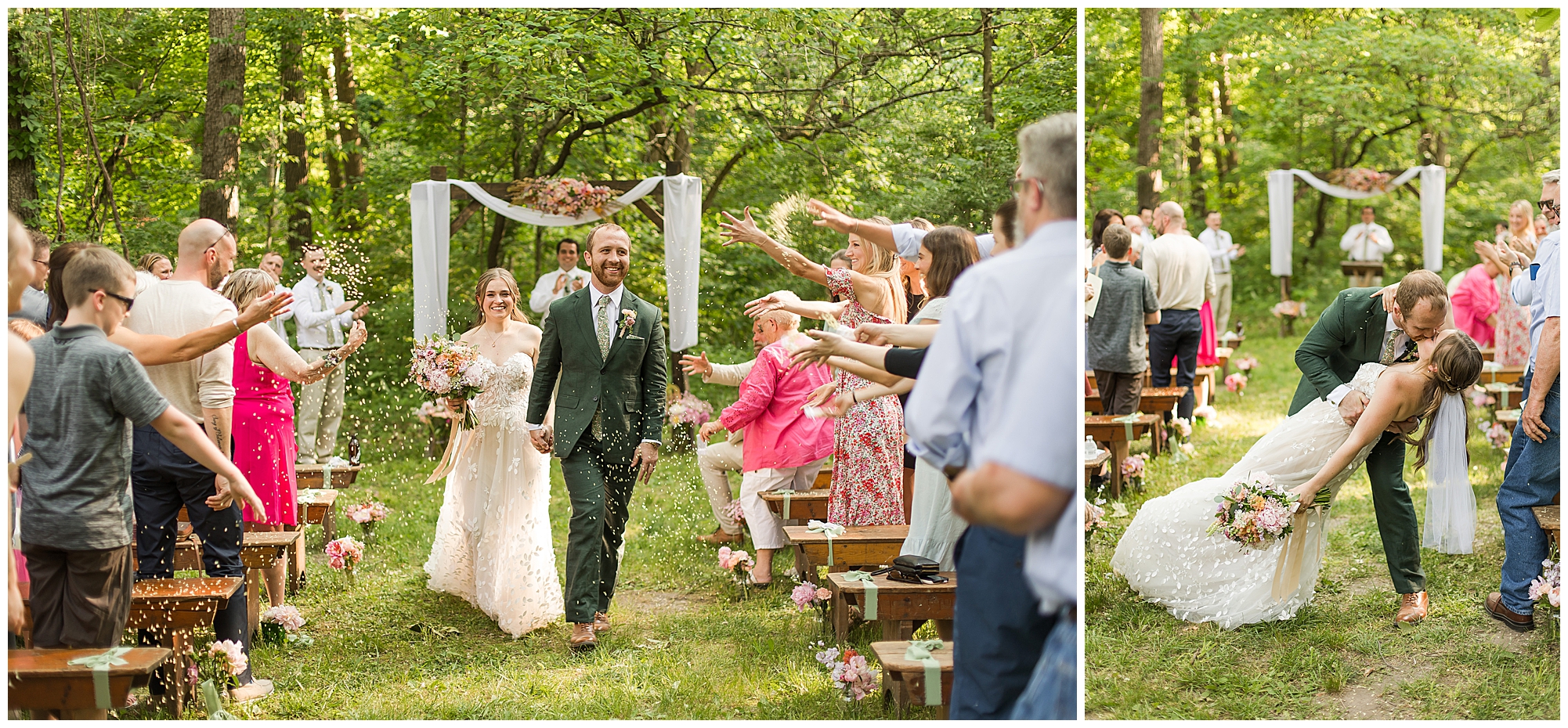 The ceremony was held in a little nook in the forest with a rustic wooden arbor draped with white linen and colorful florals. Keely walked up the aisle with her parents as she made her way to Jake. One sweet idea they incorporated into their ceremony was a ring warming. Keely and Jake’s rings were passed around to all of their guests to say a little prayer for this couple and bless their marriage. These two said their vows to one another, exchanged rings, and sealed it all with a kiss. The new Mr. and Mrs. Morgan walked back up the aisle as guests threw dried flowers before Jake dipped his new wife! How lovely!