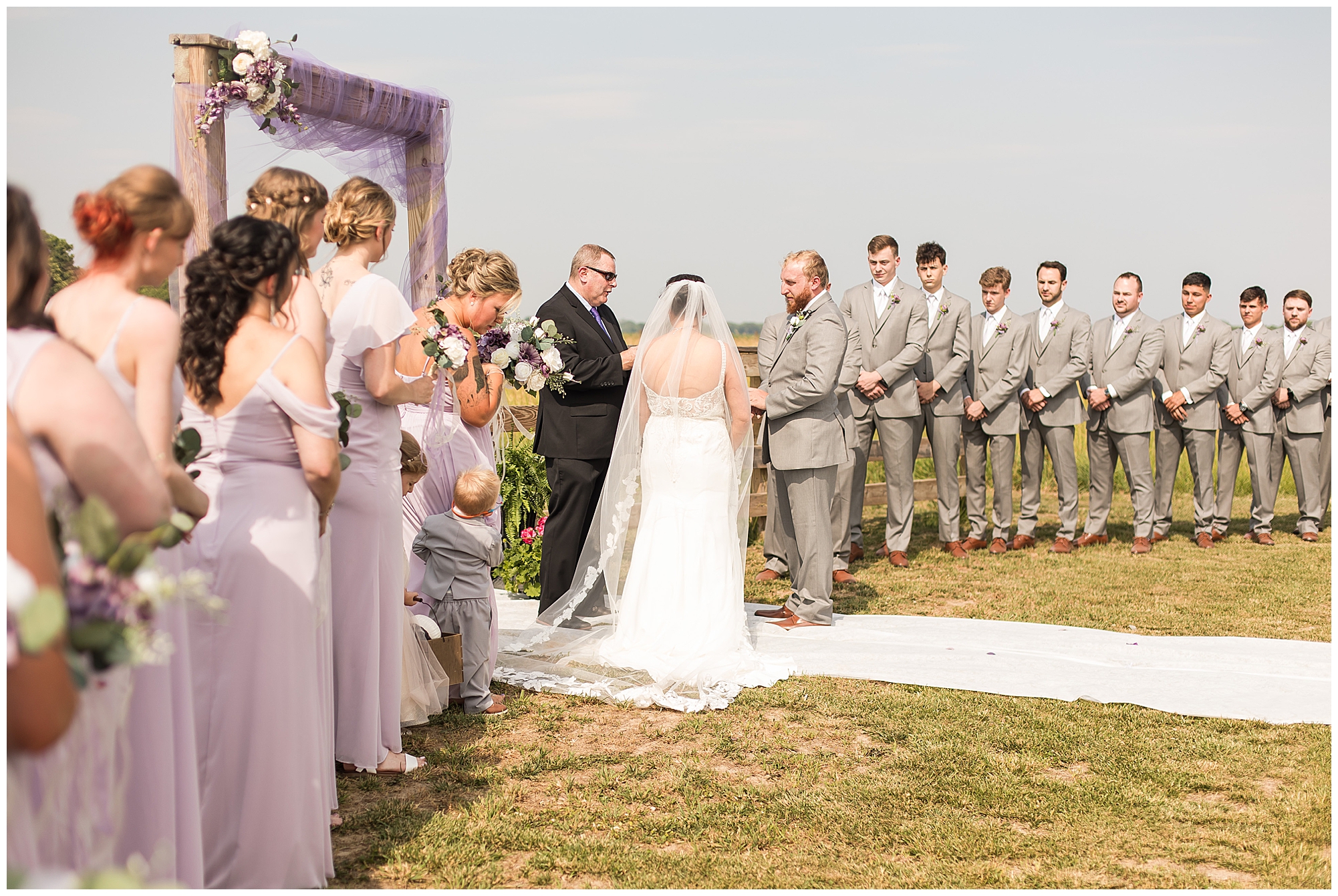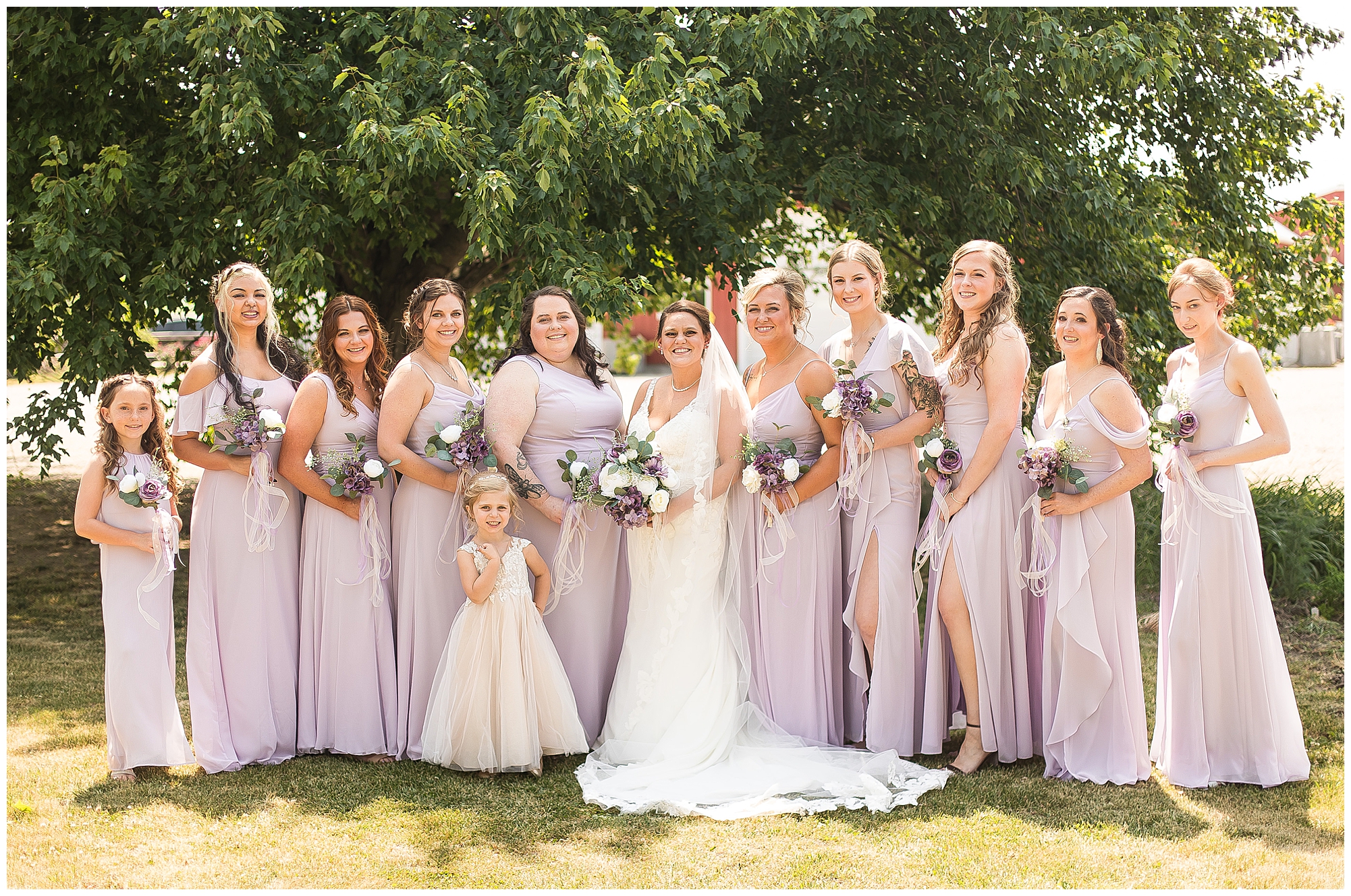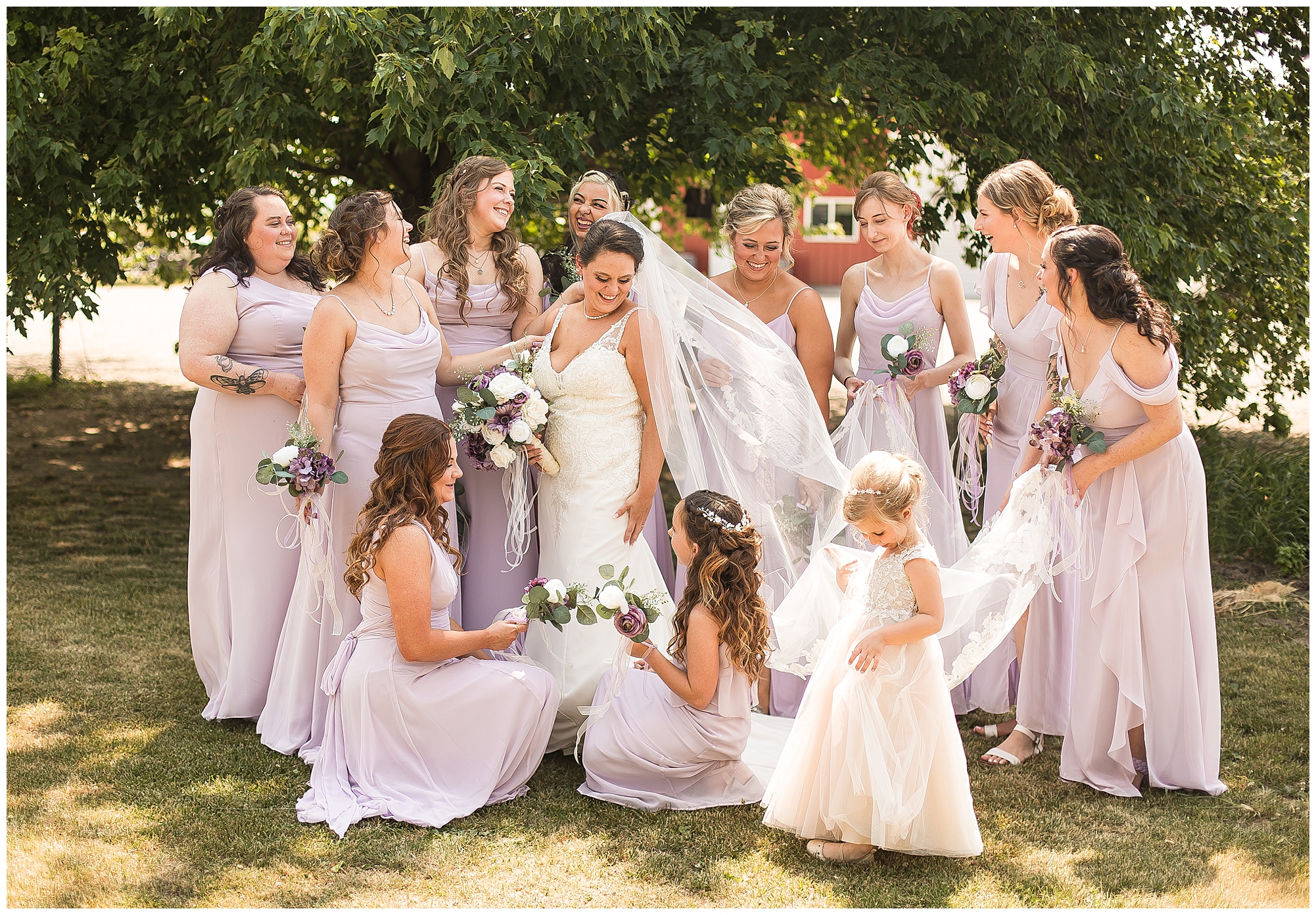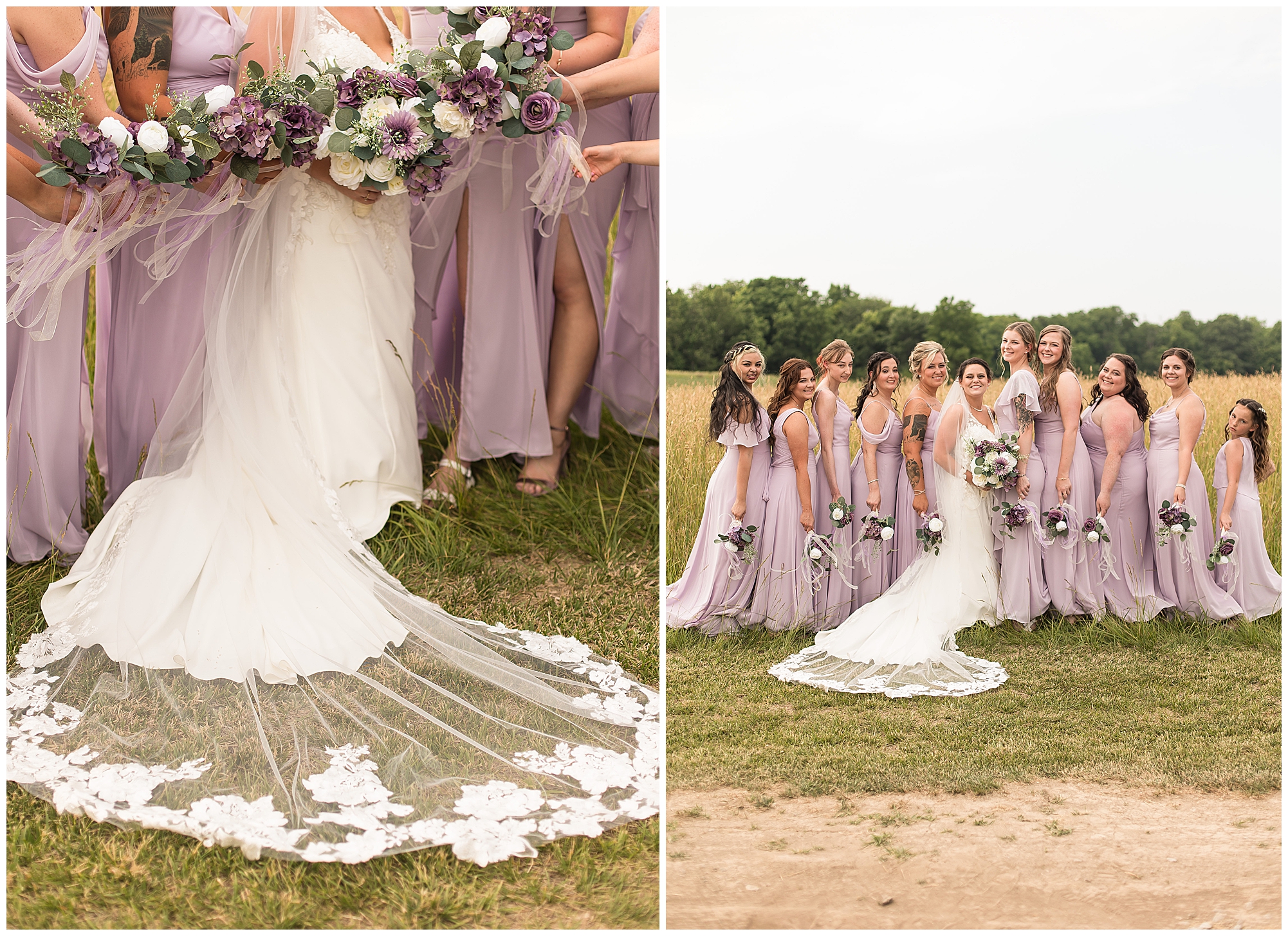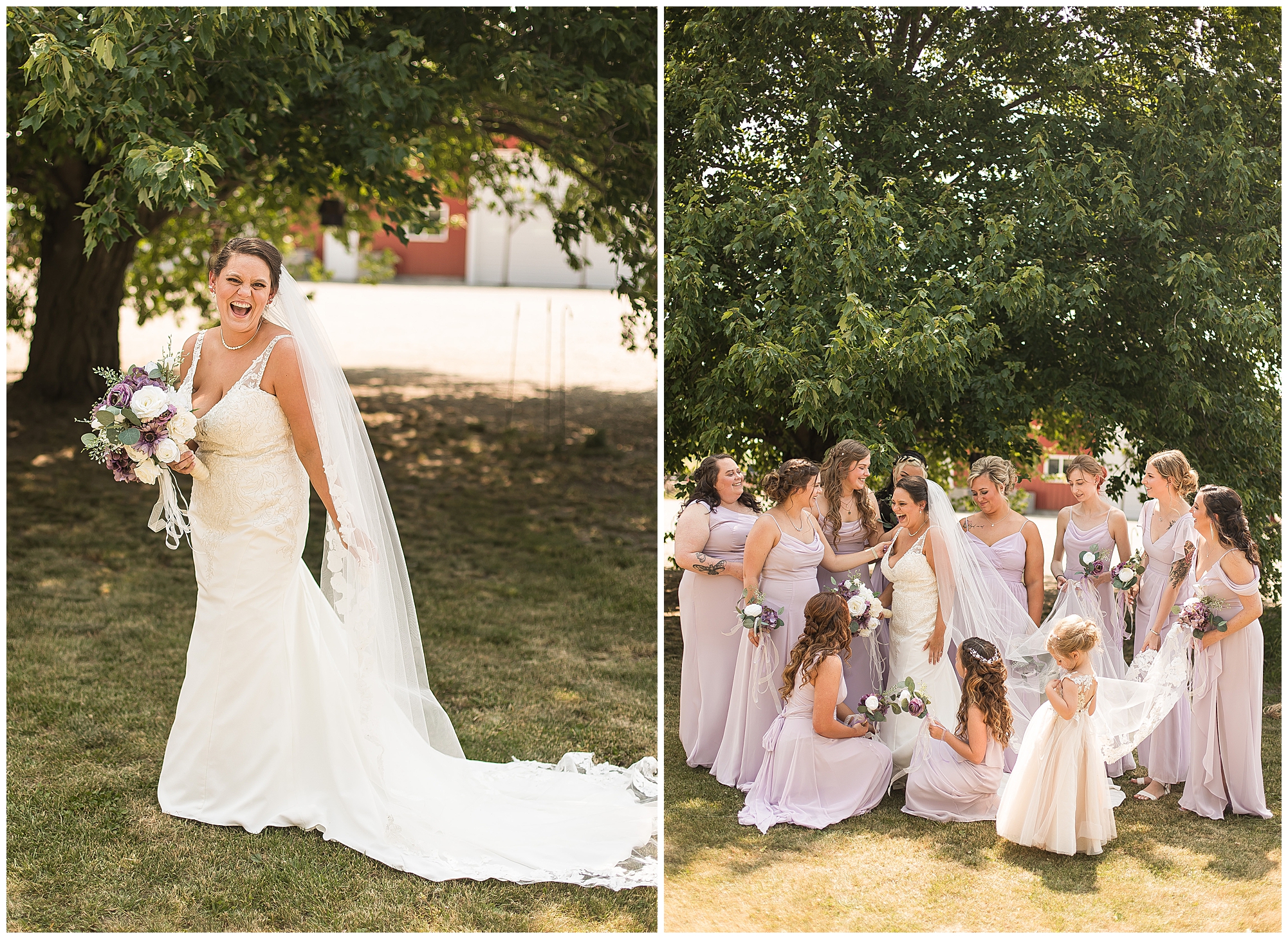 Alena and Zach’s beautiful wedding day out at The Homestead Reception venue was an absolutely gorgeous event! These two have been through so much in the last couple of years and for their special day to finally arrive was a blessing. Throughout the day, Alena and Zach were shown endless amounts of love and support from family and friends as well as showed how much they truly appreciated it all. I mean with a bridal party of 20, how could you not feel the love? The morning began with the hustle and bustle of everyone getting ready. Hair, makeup, and steaming dresses for Alena and her ladies. And Zach and the guys arriving, sharing a couple of drinks, and searching for lost socks. The color palette was a variation of purples throughout the decor and dresses. The ladies looked lovely in a variety of styles of dresses in a delightful lavender shade. The guys had pops of purple as well in their ties and boutonnieres. When it came time for Alena to get dressed she was simply stunning! Her form-fitting gown with intricate beading at the top was complimented by a fabulous cathedral length veil with floral appliqués on the bottom. Perfection at it’s best! Before the ceremony, Alena and Zach chose not to see one another. Yet, we knocked out a few photos of each of them separately with each of their sides of the bridal party. The temperature was hot, but everyone was in good spirits and excited for what was to come!