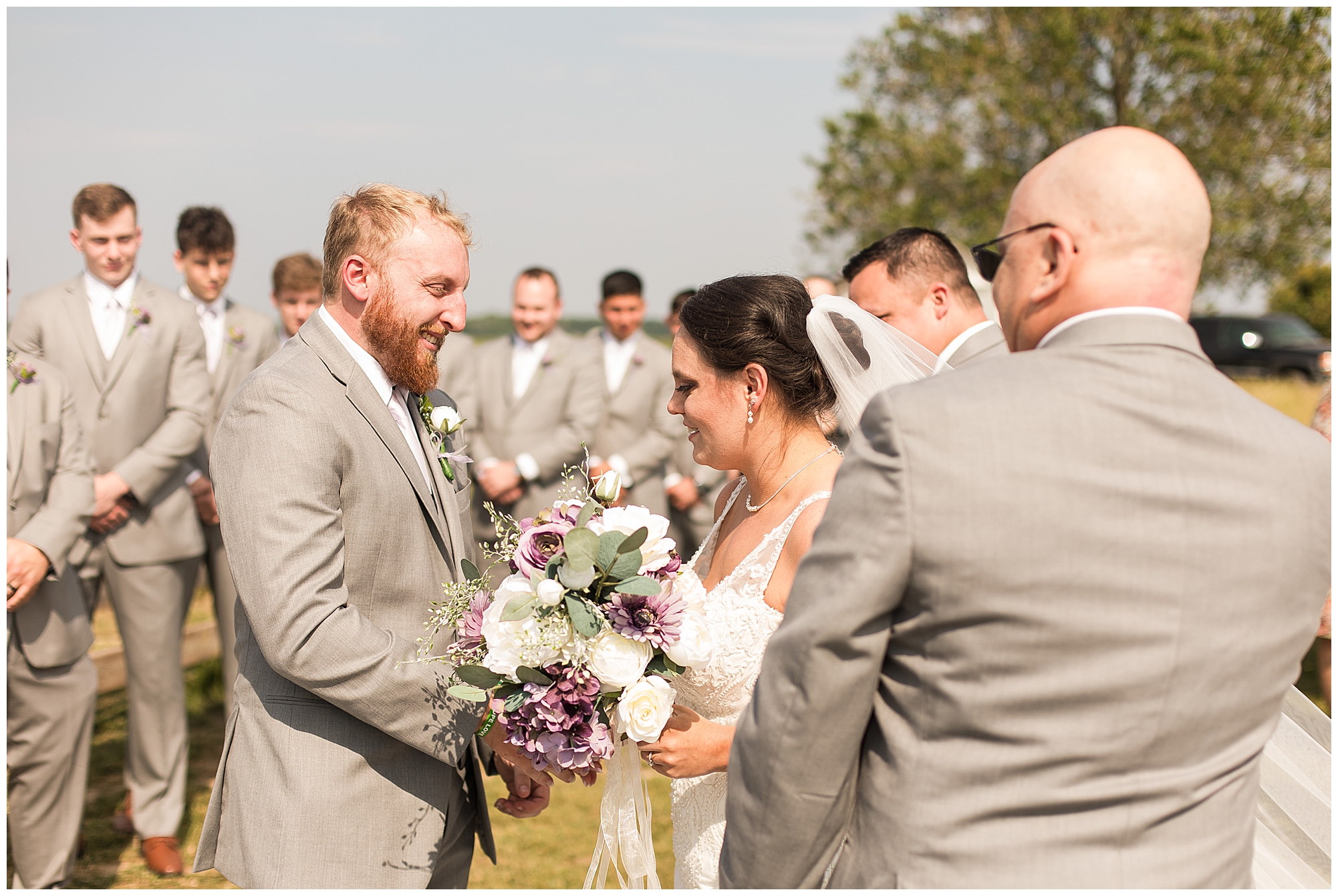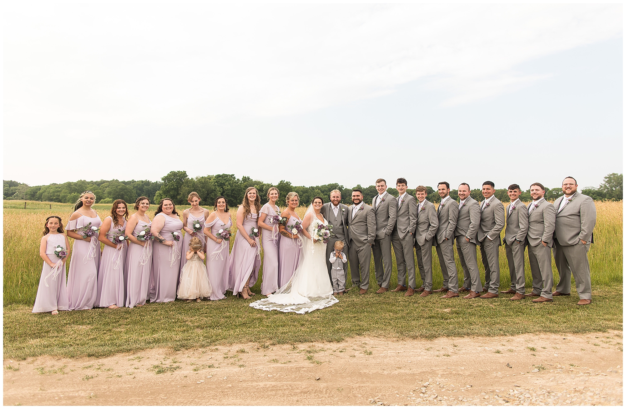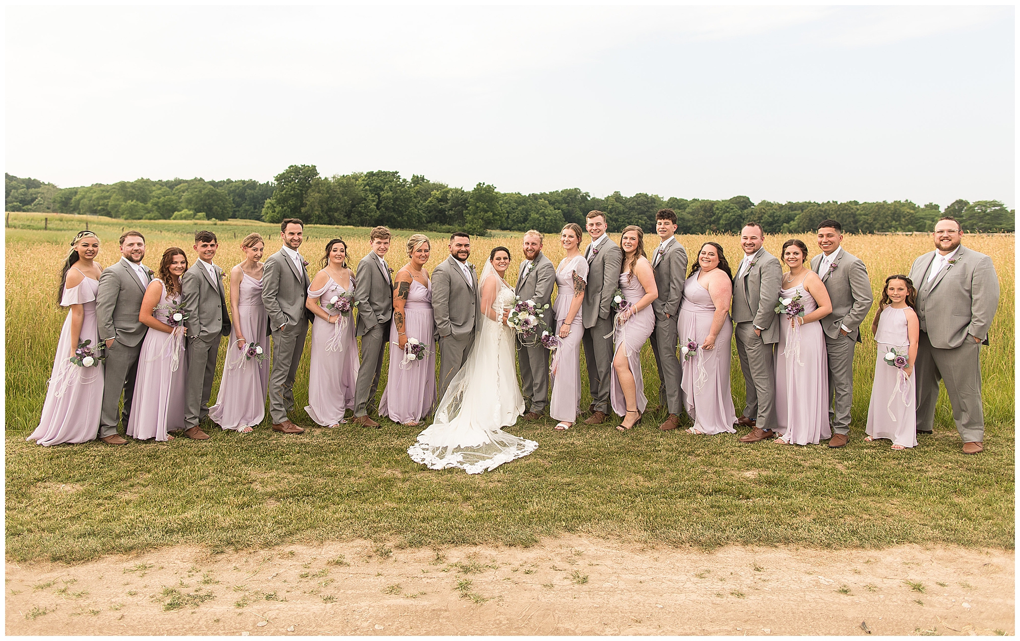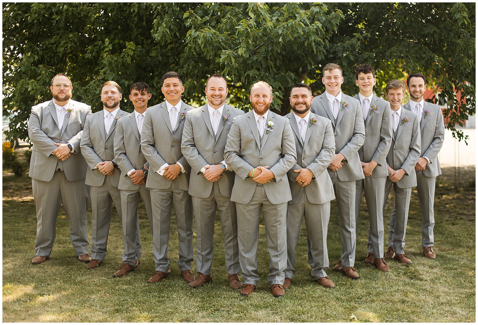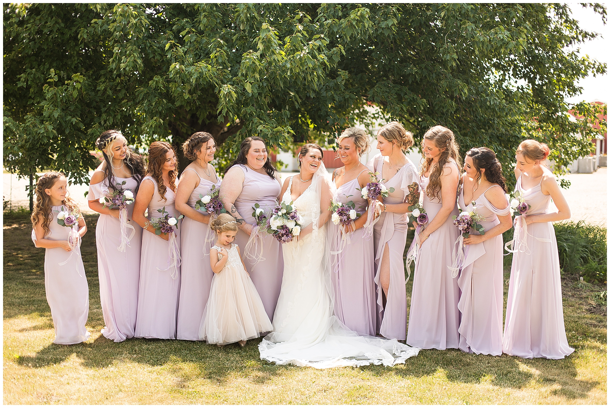 Alena and Zach’s beautiful wedding day out at The Homestead Reception venue was an absolutely gorgeous event! These two have been through so much in the last couple of years and for their special day to finally arrive was a blessing. Throughout the day, Alena and Zach were shown endless amounts of love and support from family and friends as well as showed how much they truly appreciated it all. I mean with a bridal party of 20, how could you not feel the love? The morning began with the hustle and bustle of everyone getting ready. Hair, makeup, and steaming dresses for Alena and her ladies. And Zach and the guys arriving, sharing a couple of drinks, and searching for lost socks. The color palette was a variation of purples throughout the decor and dresses. The ladies looked lovely in a variety of styles of dresses in a delightful lavender shade. The guys had pops of purple as well in their ties and boutonnieres. When it came time for Alena to get dressed she was simply stunning! Her form-fitting gown with intricate beading at the top was complimented by a fabulous cathedral length veil with floral appliqués on the bottom. Perfection at it’s best! Before the ceremony, Alena and Zach chose not to see one another. Yet, we knocked out a few photos of each of them separately with each of their sides of the bridal party. The temperature was hot, but everyone was in good spirits and excited for what was to come!