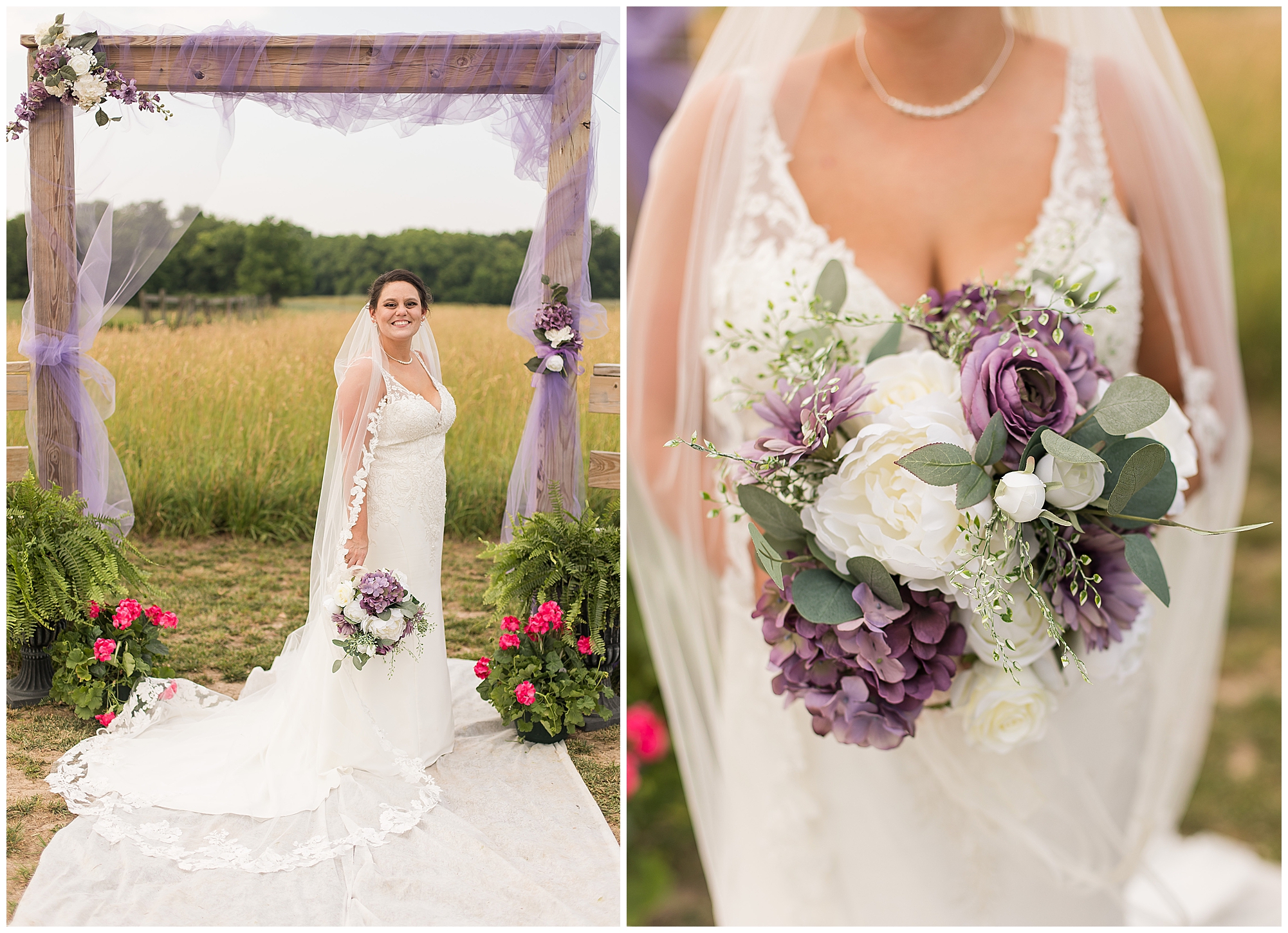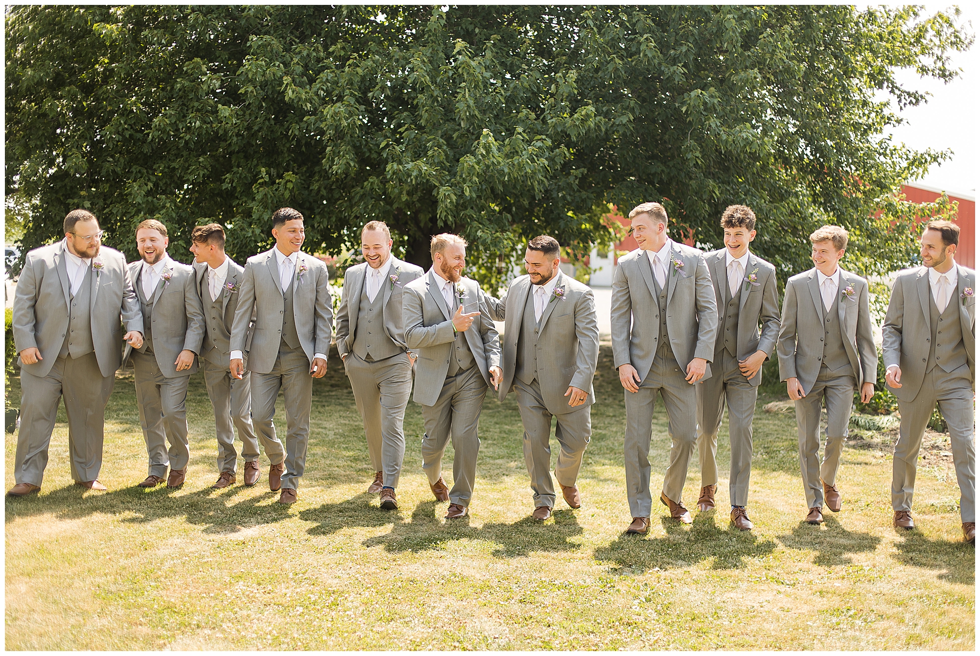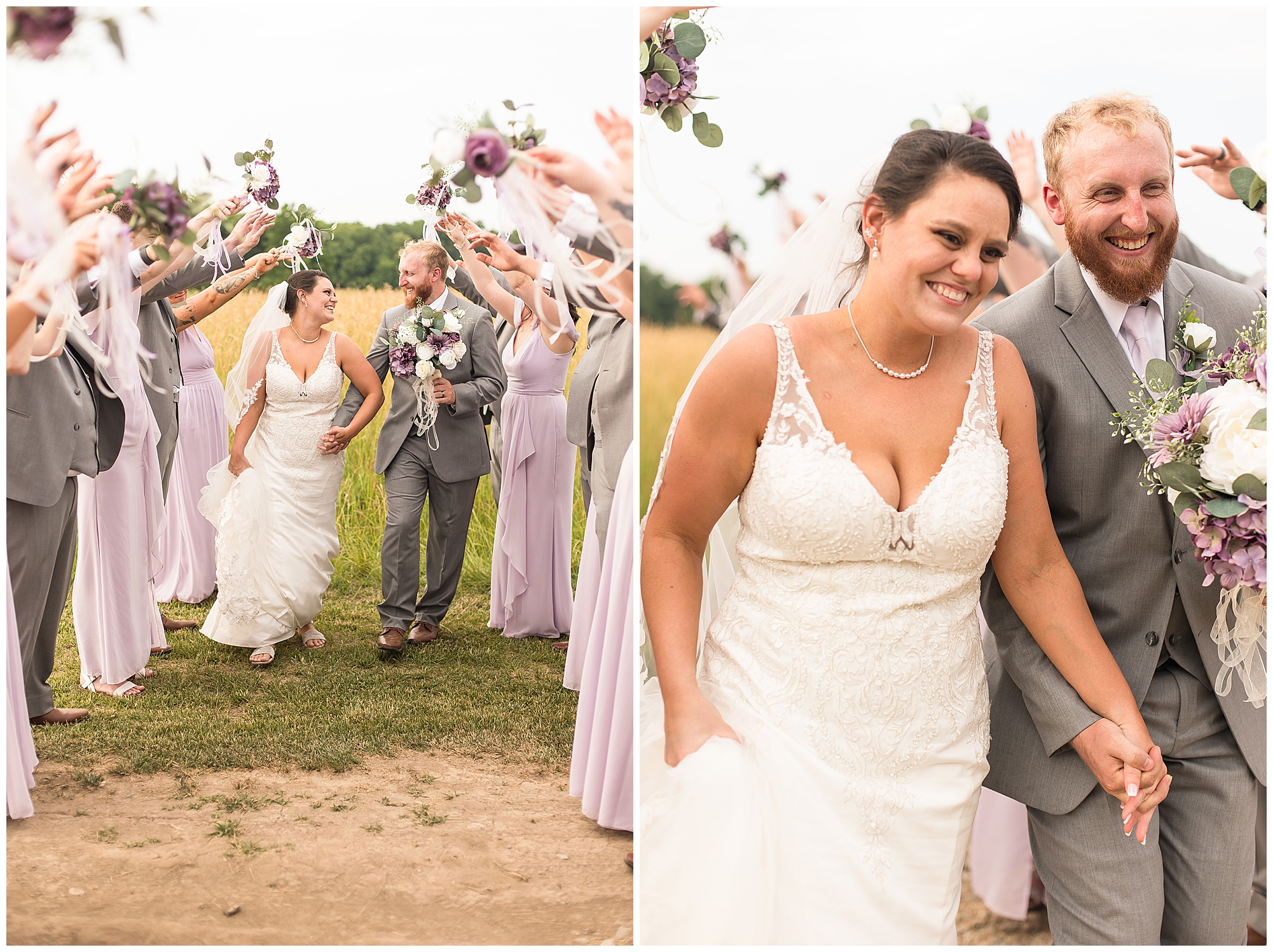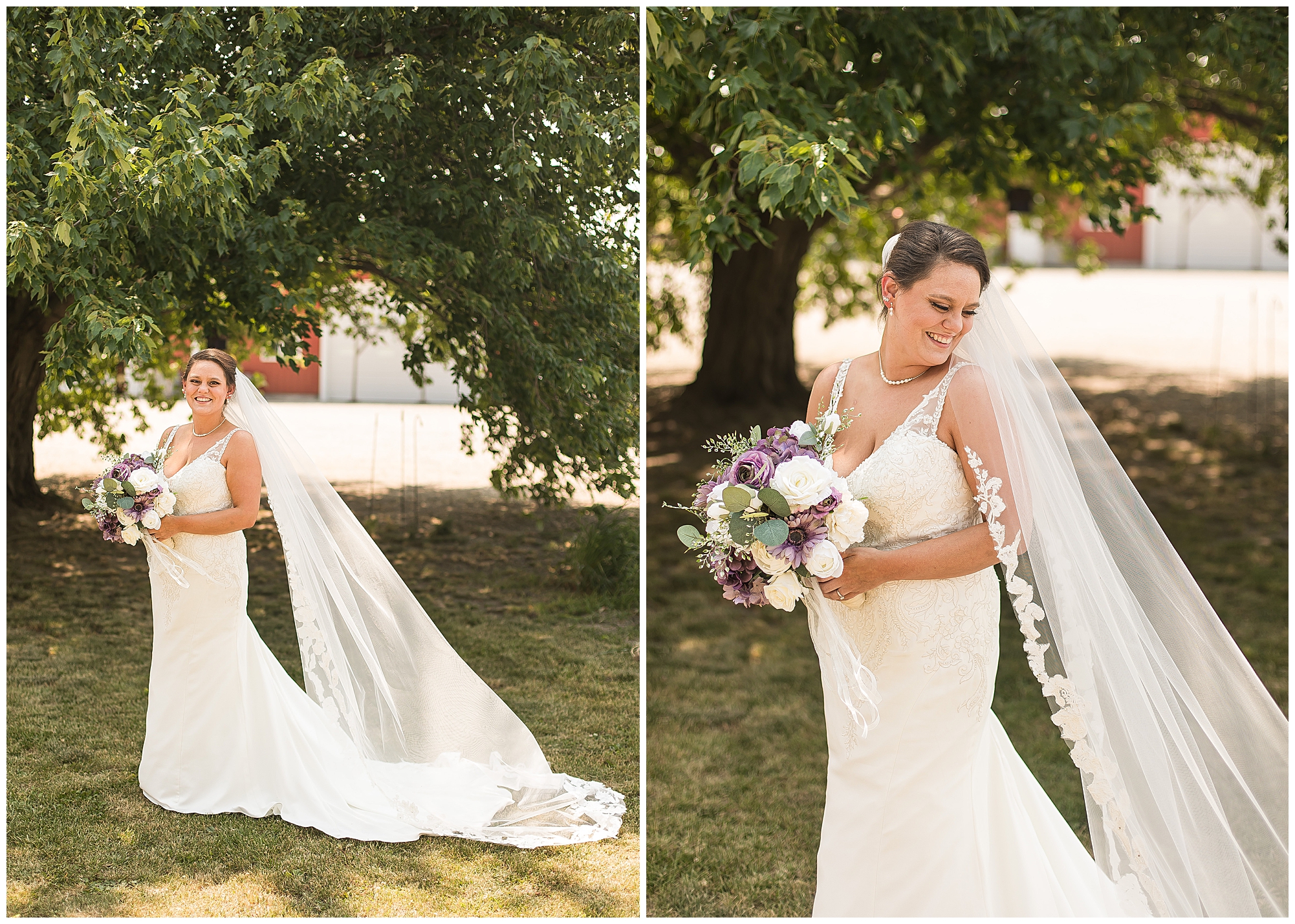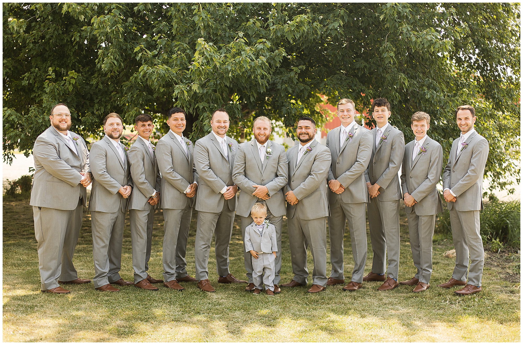 Alena and Zach’s beautiful wedding day out at The Homestead Reception venue was an absolutely gorgeous event! These two have been through so much in the last couple of years and for their special day to finally arrive was a blessing. Throughout the day, Alena and Zach were shown endless amounts of love and support from family and friends as well as showed how much they truly appreciated it all. I mean with a bridal party of 20, how could you not feel the love? The morning began with the hustle and bustle of everyone getting ready. Hair, makeup, and steaming dresses for Alena and her ladies. And Zach and the guys arriving, sharing a couple of drinks, and searching for lost socks. The color palette was a variation of purples throughout the decor and dresses. The ladies looked lovely in a variety of styles of dresses in a delightful lavender shade. The guys had pops of purple as well in their ties and boutonnieres. When it came time for Alena to get dressed she was simply stunning! Her form-fitting gown with intricate beading at the top was complimented by a fabulous cathedral length veil with floral appliqués on the bottom. Perfection at it’s best! Before the ceremony, Alena and Zach chose not to see one another. Yet, we knocked out a few photos of each of them separately with each of their sides of the bridal party. The temperature was hot, but everyone was in good spirits and excited for what was to come!
