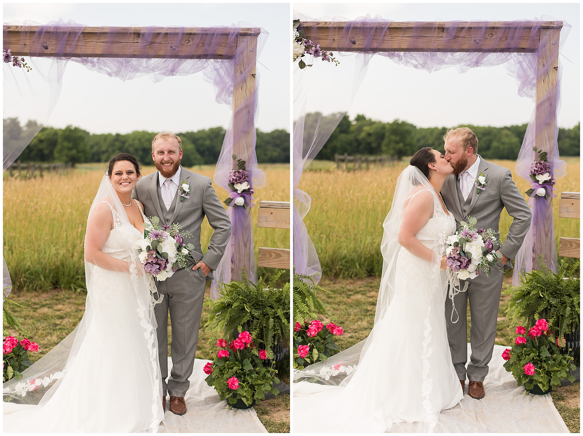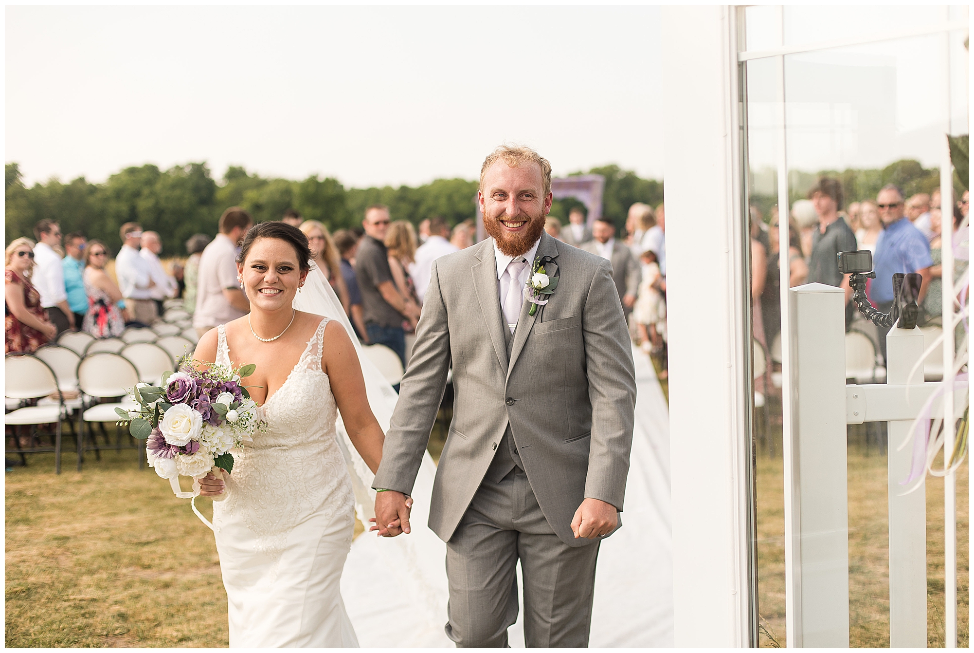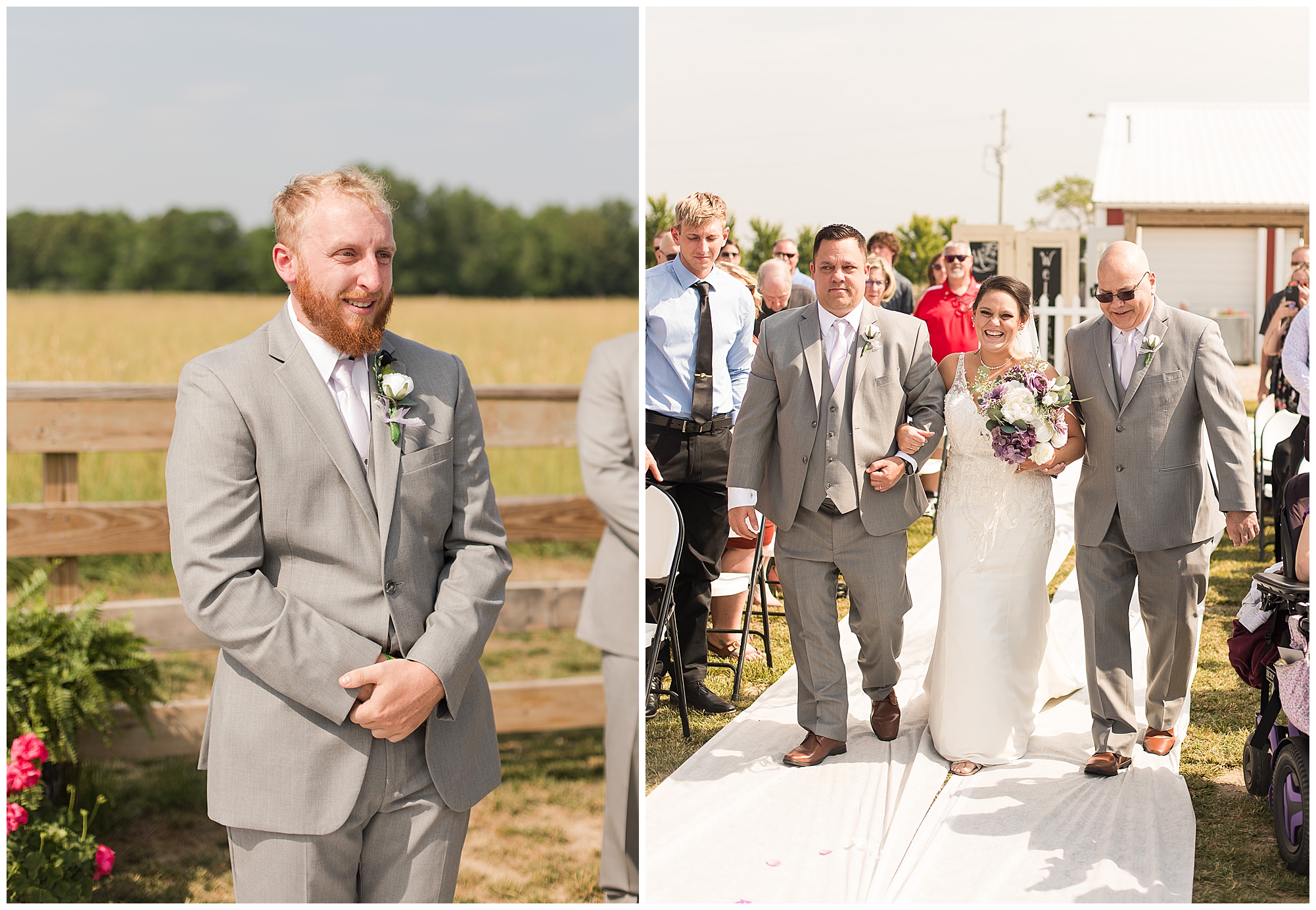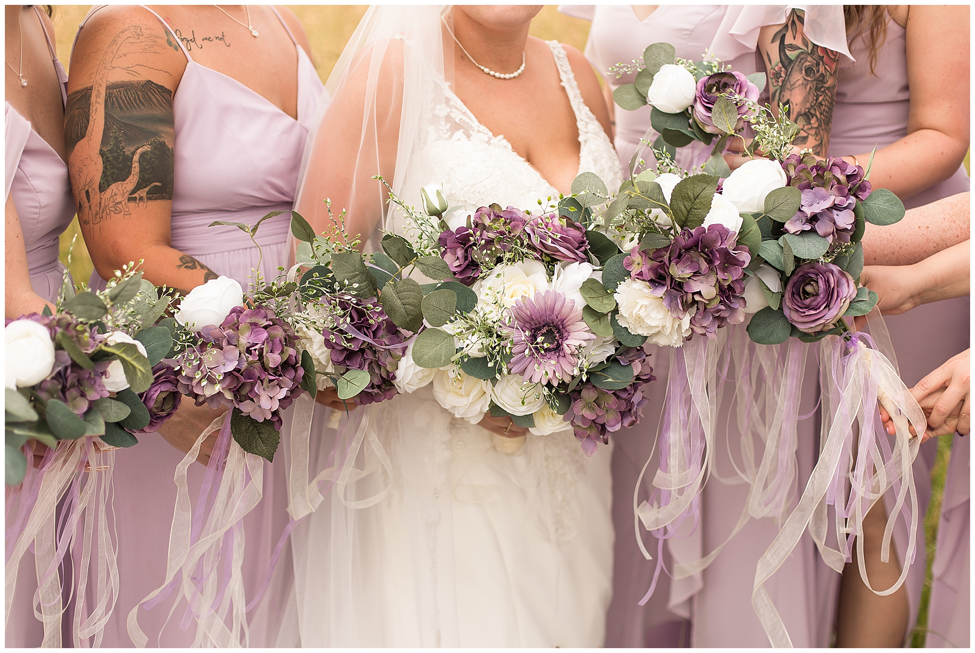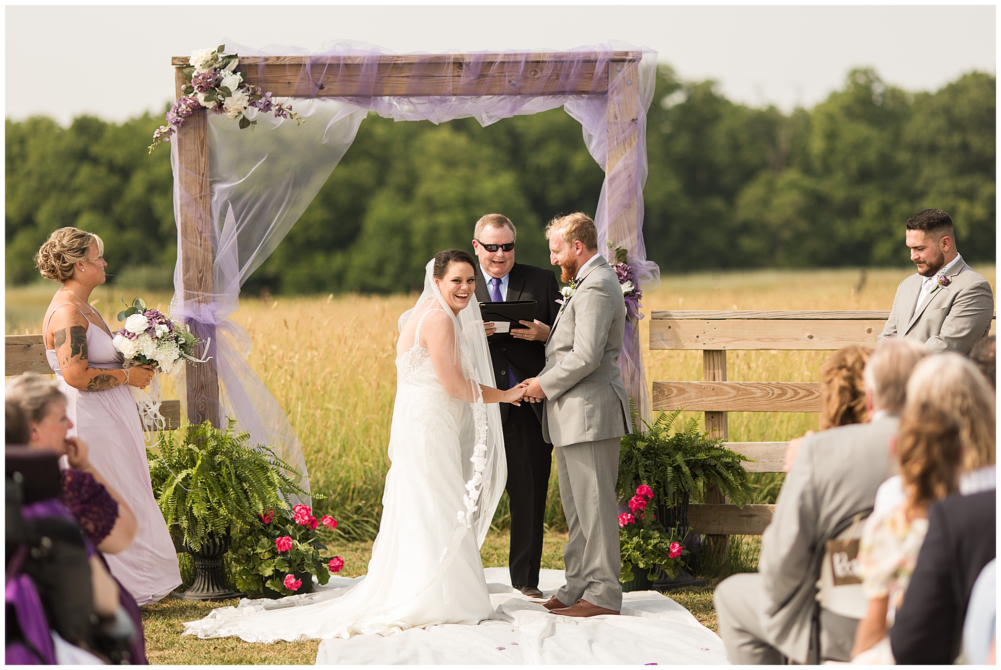 Alena and Zach’s beautiful wedding day out at The Homestead Reception venue was an absolutely gorgeous event! These two have been through so much in the last couple of years and for their special day to finally arrive was a blessing. Throughout the day, Alena and Zach were shown endless amounts of love and support from family and friends as well as showed how much they truly appreciated it all. I mean with a bridal party of 20, how could you not feel the love? The morning began with the hustle and bustle of everyone getting ready. Hair, makeup, and steaming dresses for Alena and her ladies. And Zach and the guys arriving, sharing a couple of drinks, and searching for lost socks. The color palette was a variation of purples throughout the decor and dresses. The ladies looked lovely in a variety of styles of dresses in a delightful lavender shade. The guys had pops of purple as well in their ties and boutonnieres. When it came time for Alena to get dressed she was simply stunning! Her form-fitting gown with intricate beading at the top was complimented by a fabulous cathedral length veil with floral appliqués on the bottom. Perfection at it’s best! Before the ceremony, Alena and Zach chose not to see one another. Yet, we knocked out a few photos of each of them separately with each of their sides of the bridal party. The temperature was hot, but everyone was in good spirits and excited for what was to come!