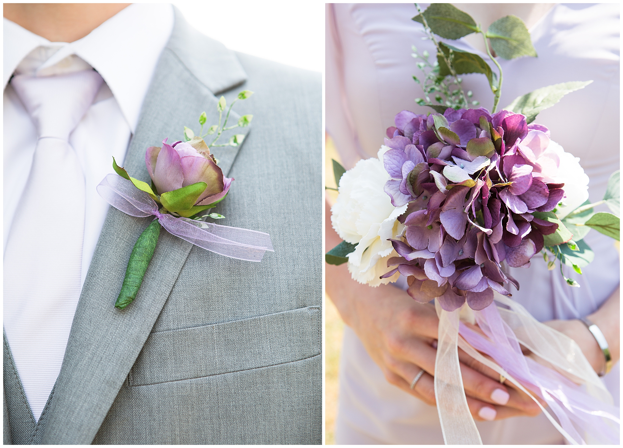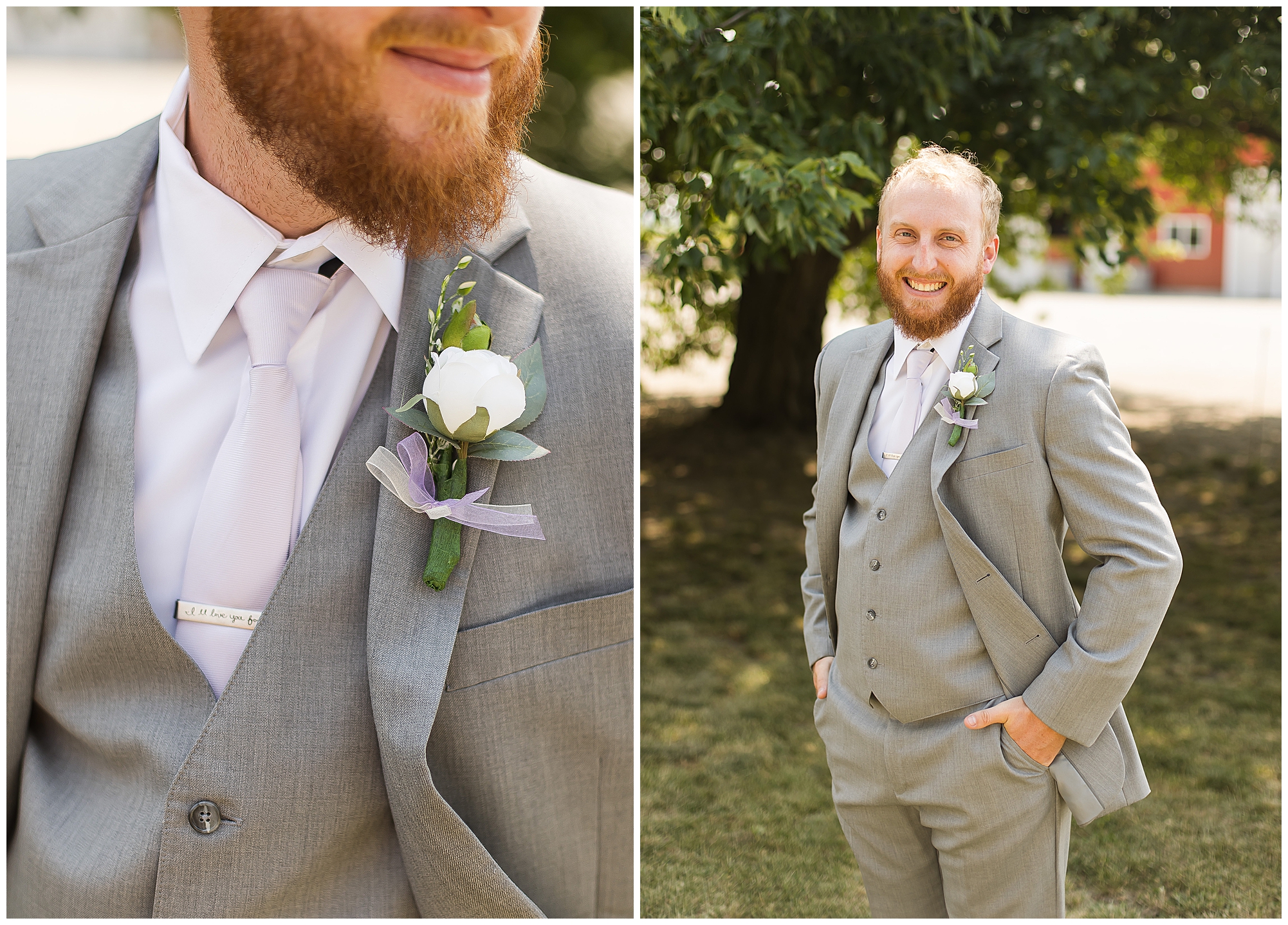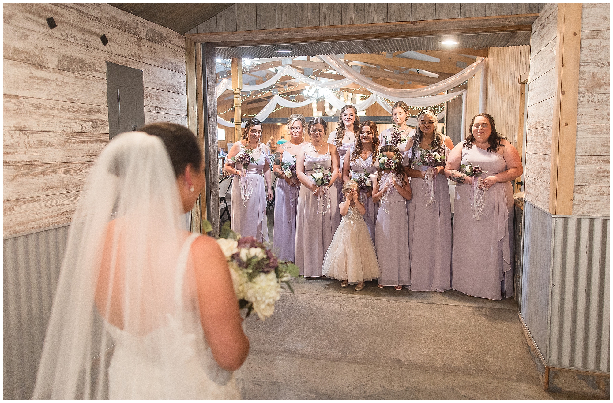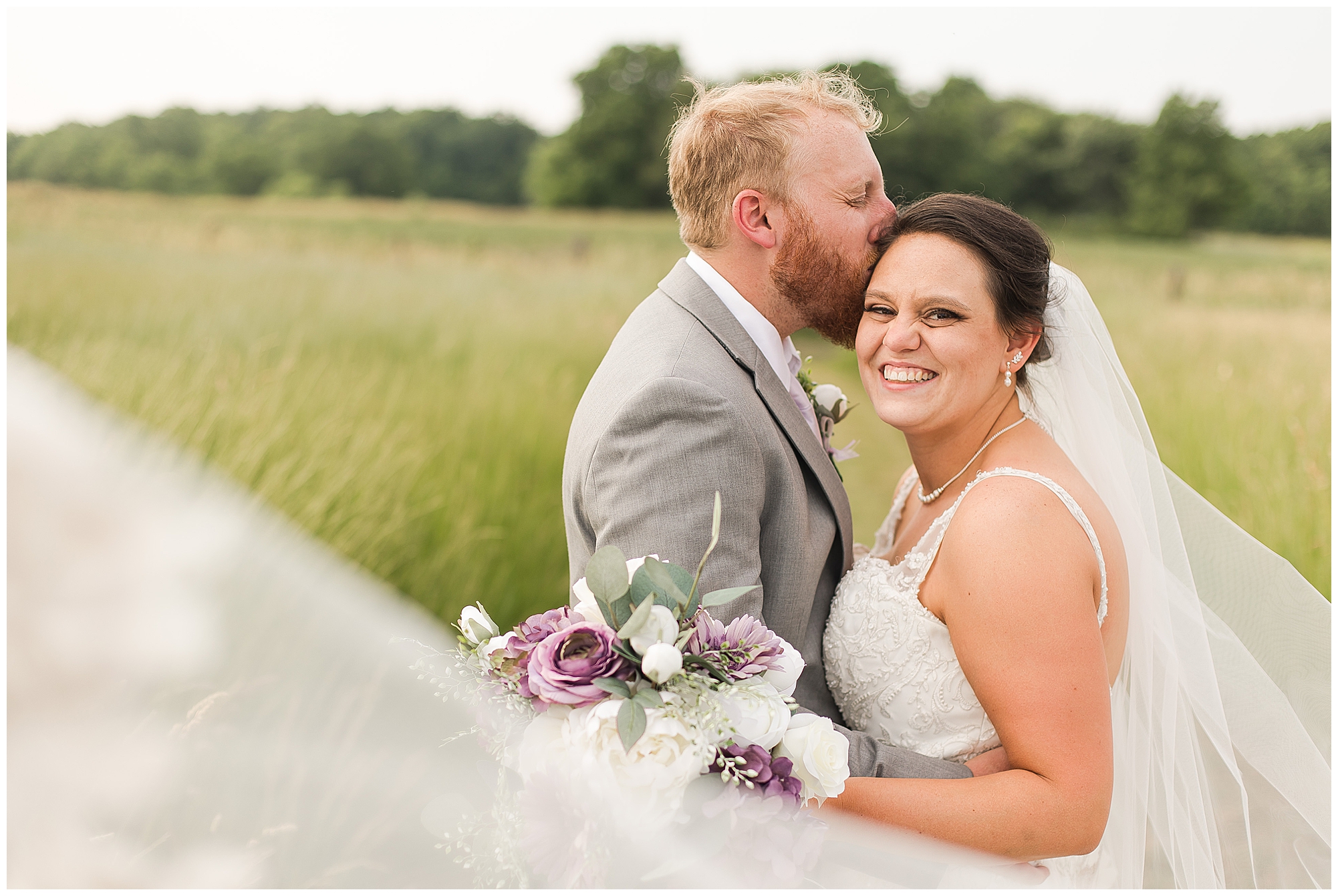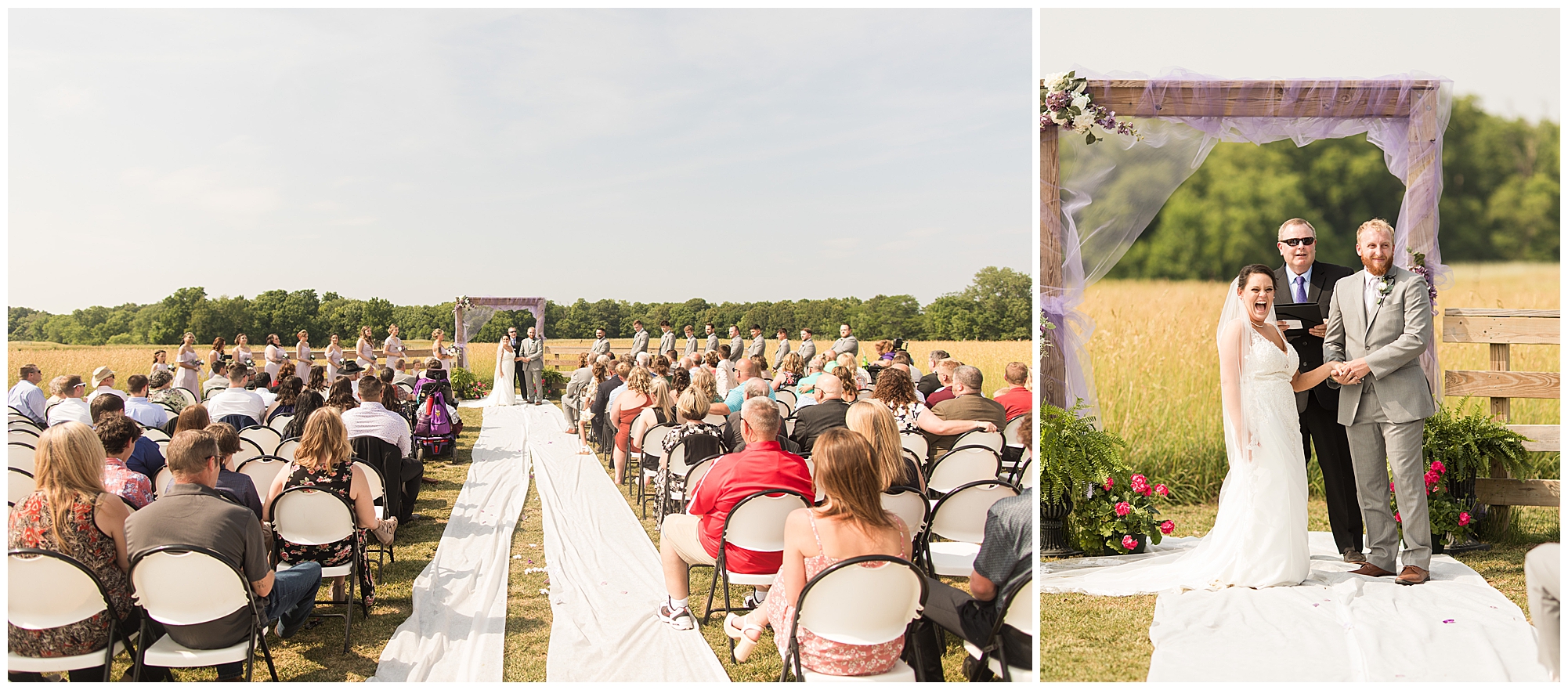 Alena and Zach’s beautiful wedding day out at The Homestead Reception venue was an absolutely gorgeous event! These two have been through so much in the last couple of years and for their special day to finally arrive was a blessing. Throughout the day, Alena and Zach were shown endless amounts of love and support from family and friends as well as showed how much they truly appreciated it all. I mean with a bridal party of 20, how could you not feel the love? The morning began with the hustle and bustle of everyone getting ready. Hair, makeup, and steaming dresses for Alena and her ladies. And Zach and the guys arriving, sharing a couple of drinks, and searching for lost socks. The color palette was a variation of purples throughout the decor and dresses. The ladies looked lovely in a variety of styles of dresses in a delightful lavender shade. The guys had pops of purple as well in their ties and boutonnieres. When it came time for Alena to get dressed she was simply stunning! Her form-fitting gown with intricate beading at the top was complimented by a fabulous cathedral length veil with floral appliqués on the bottom. Perfection at it’s best! Before the ceremony, Alena and Zach chose not to see one another. Yet, we knocked out a few photos of each of them separately with each of their sides of the bridal party. The temperature was hot, but everyone was in good spirits and excited for what was to come!