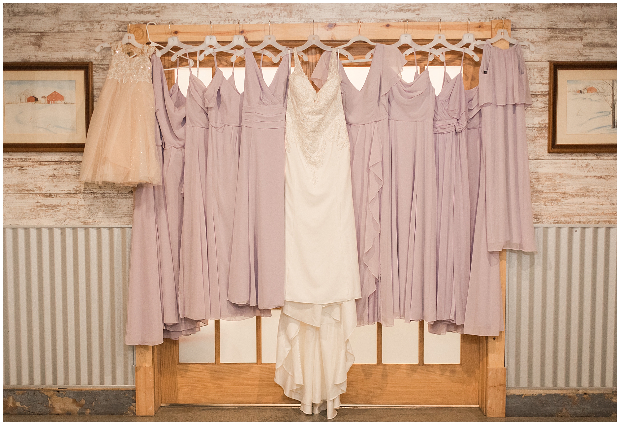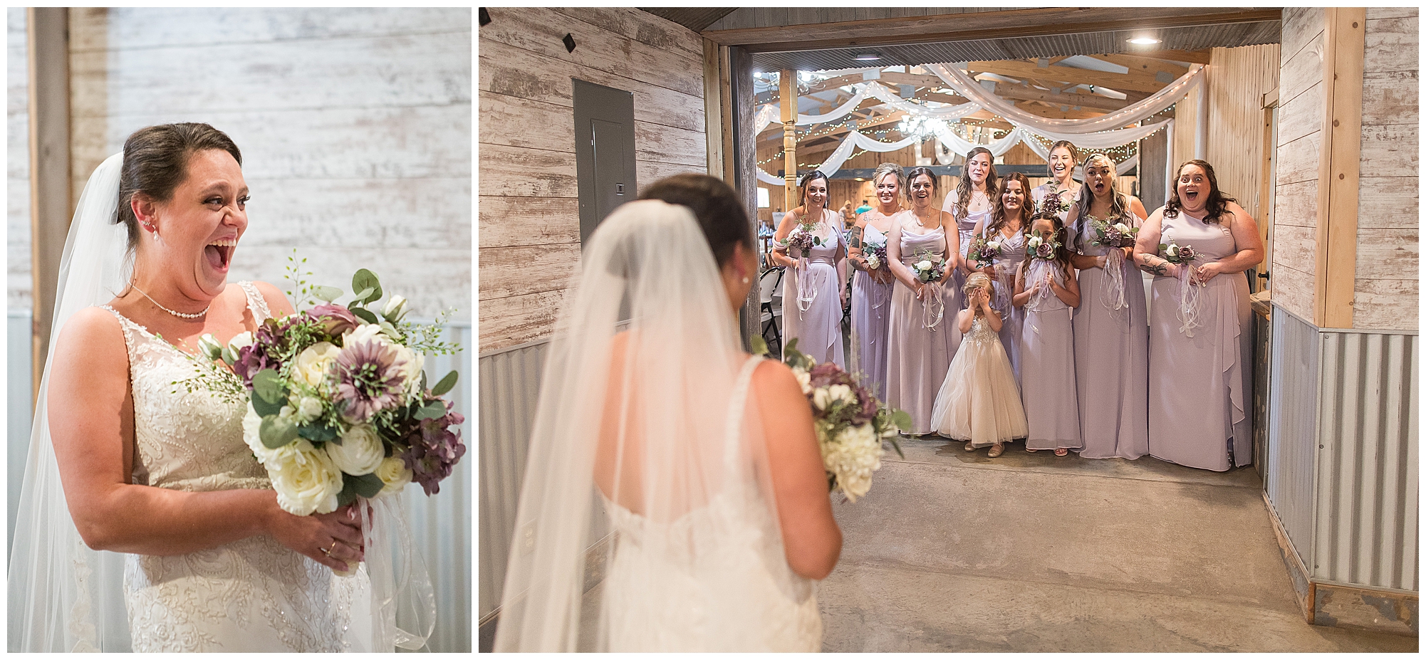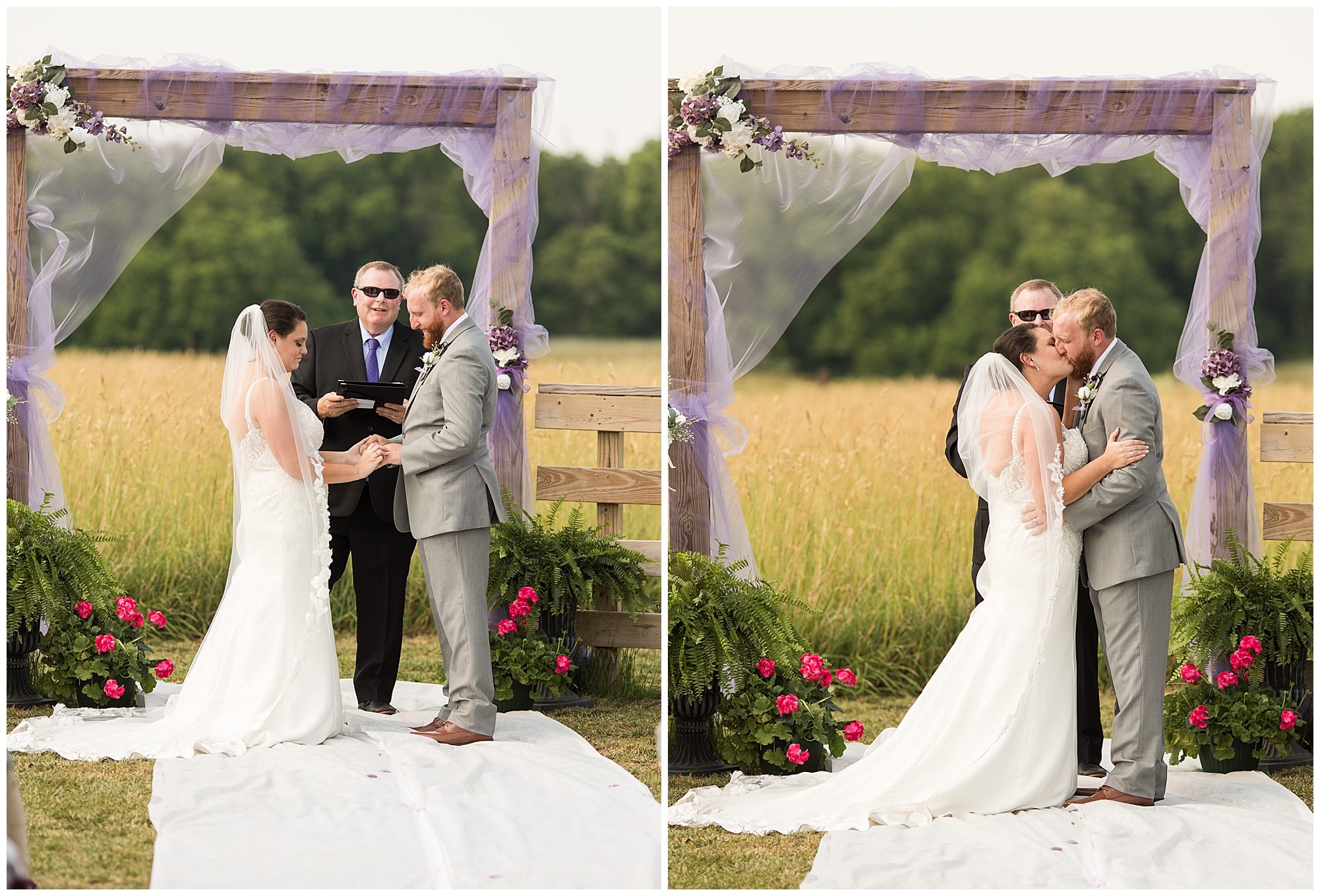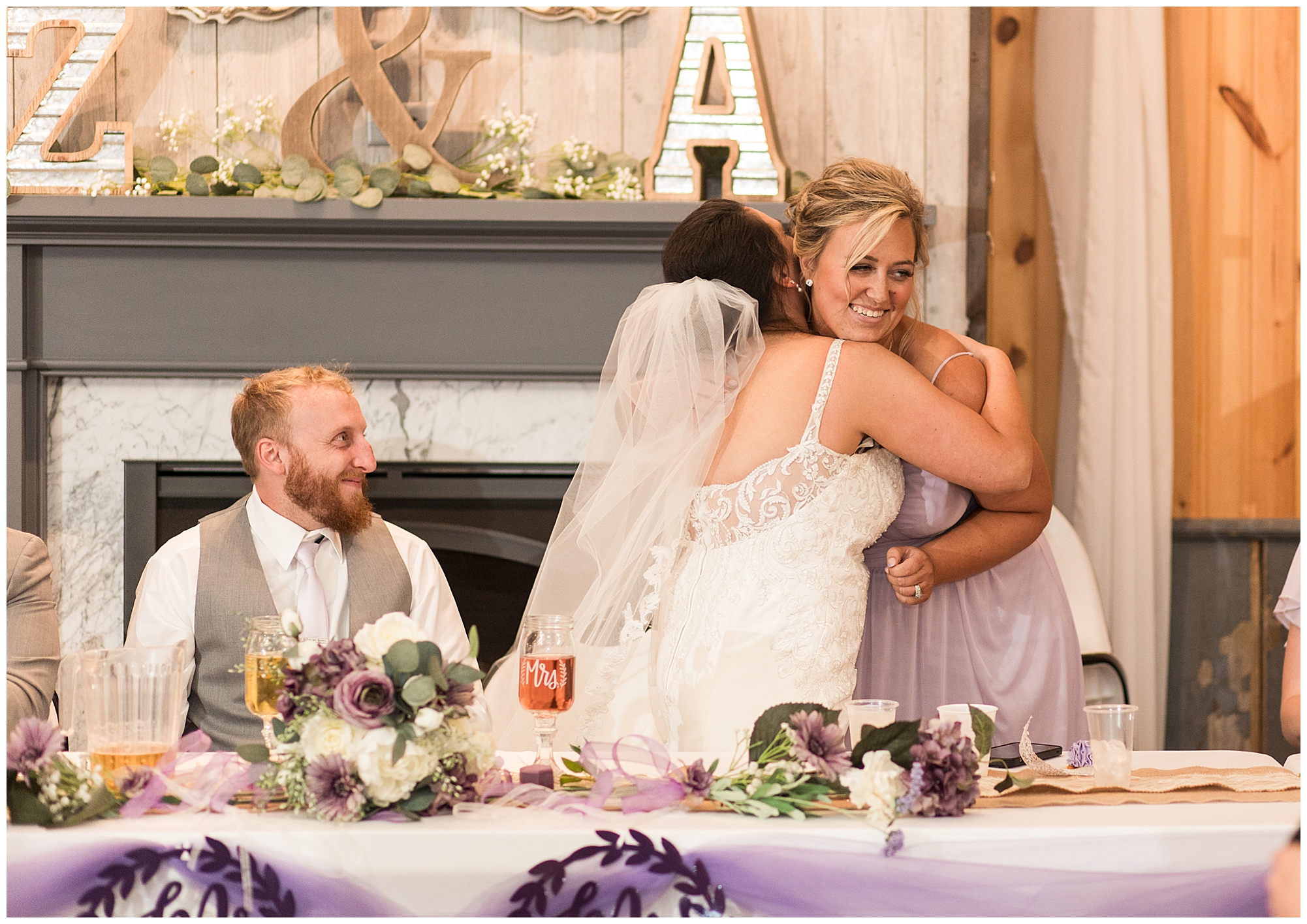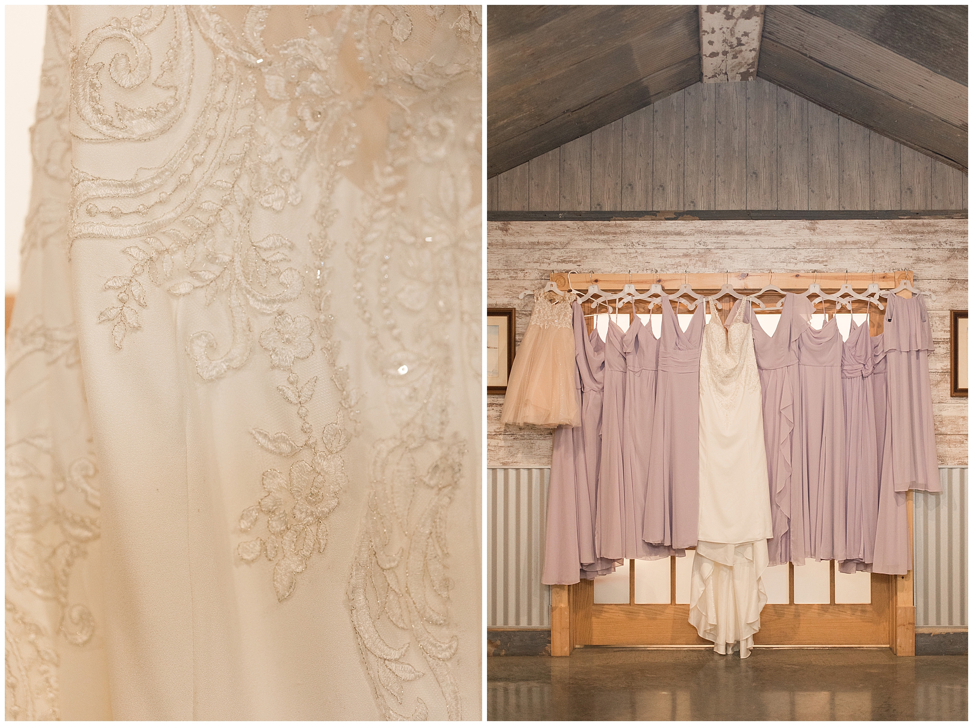 Alena and Zach’s beautiful wedding day out at The Homestead Reception venue was an absolutely gorgeous event! These two have been through so much in the last couple of years and for their special day to finally arrive was a blessing. Throughout the day, Alena and Zach were shown endless amounts of love and support from family and friends as well as showed how much they truly appreciated it all. I mean with a bridal party of 20, how could you not feel the love? The morning began with the hustle and bustle of everyone getting ready. Hair, makeup, and steaming dresses for Alena and her ladies. And Zach and the guys arriving, sharing a couple of drinks, and searching for lost socks. The color palette was a variation of purples throughout the decor and dresses. The ladies looked lovely in a variety of styles of dresses in a delightful lavender shade. The guys had pops of purple as well in their ties and boutonnieres. When it came time for Alena to get dressed she was simply stunning! Her form-fitting gown with intricate beading at the top was complimented by a fabulous cathedral length veil with floral appliqués on the bottom. Perfection at it’s best! Before the ceremony, Alena and Zach chose not to see one another. Yet, we knocked out a few photos of each of them separately with each of their sides of the bridal party. The temperature was hot, but everyone was in good spirits and excited for what was to come!