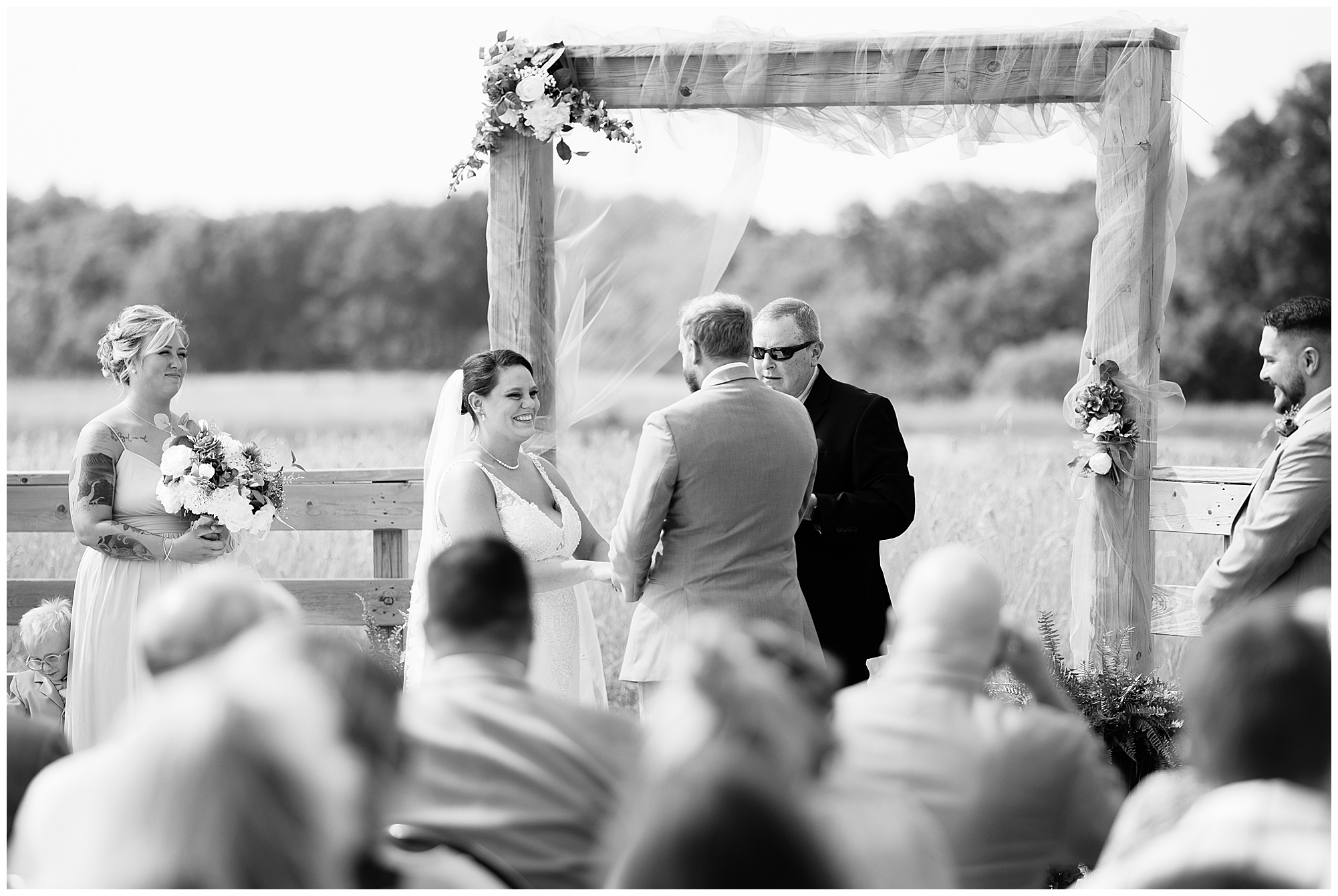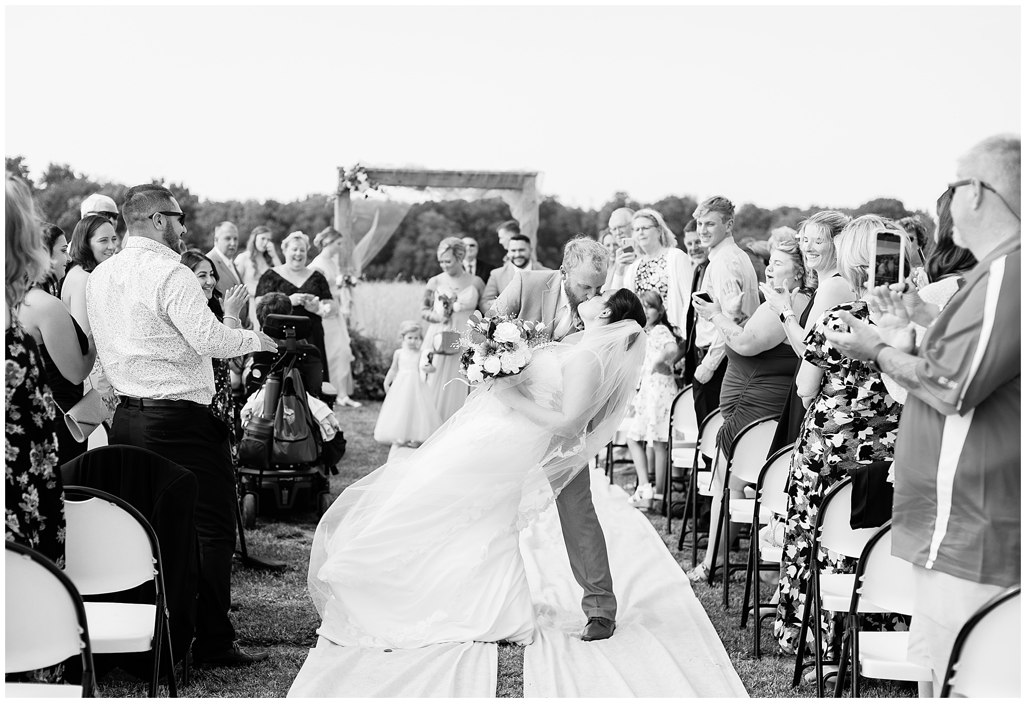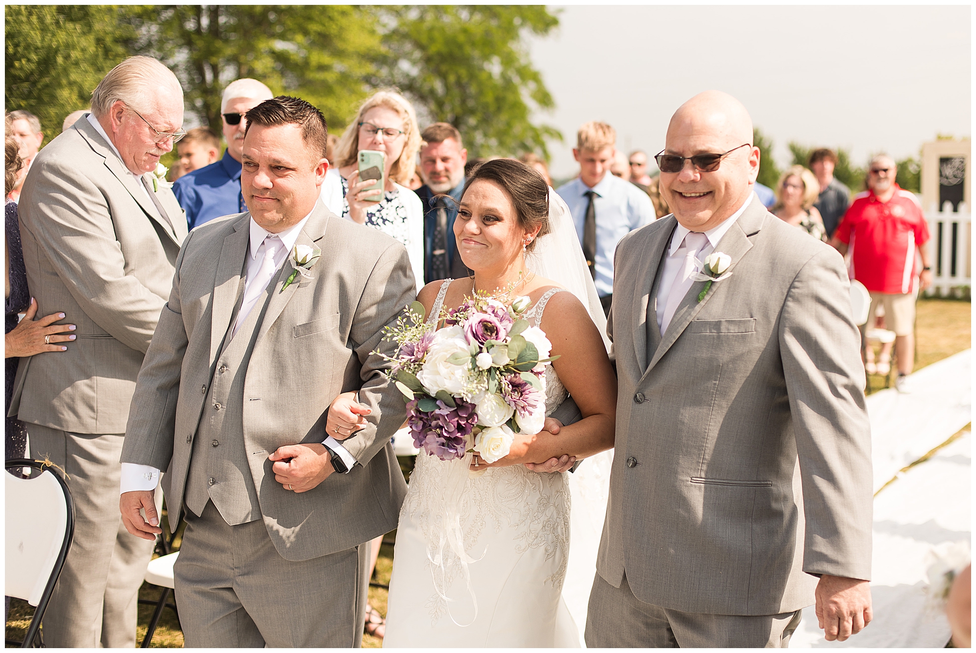 The ceremony time rolled around and it did not disappoint. Zach’s reaction to seeing Alena walking down the aisle with both her dad and step dad was so sweet. The moment even got to Alena as she and her groom finally got to see each other on their big day. Zach’s uncle officiated over the nuptials and threw in many hilarious and emotional stories about the couple which had them laughing and crying during their time at the arbor. These two exchanged rings, spoke their meaningful vows, and sealed it with a kiss. Congrats to the new Mr. and Mrs. Prochaska!