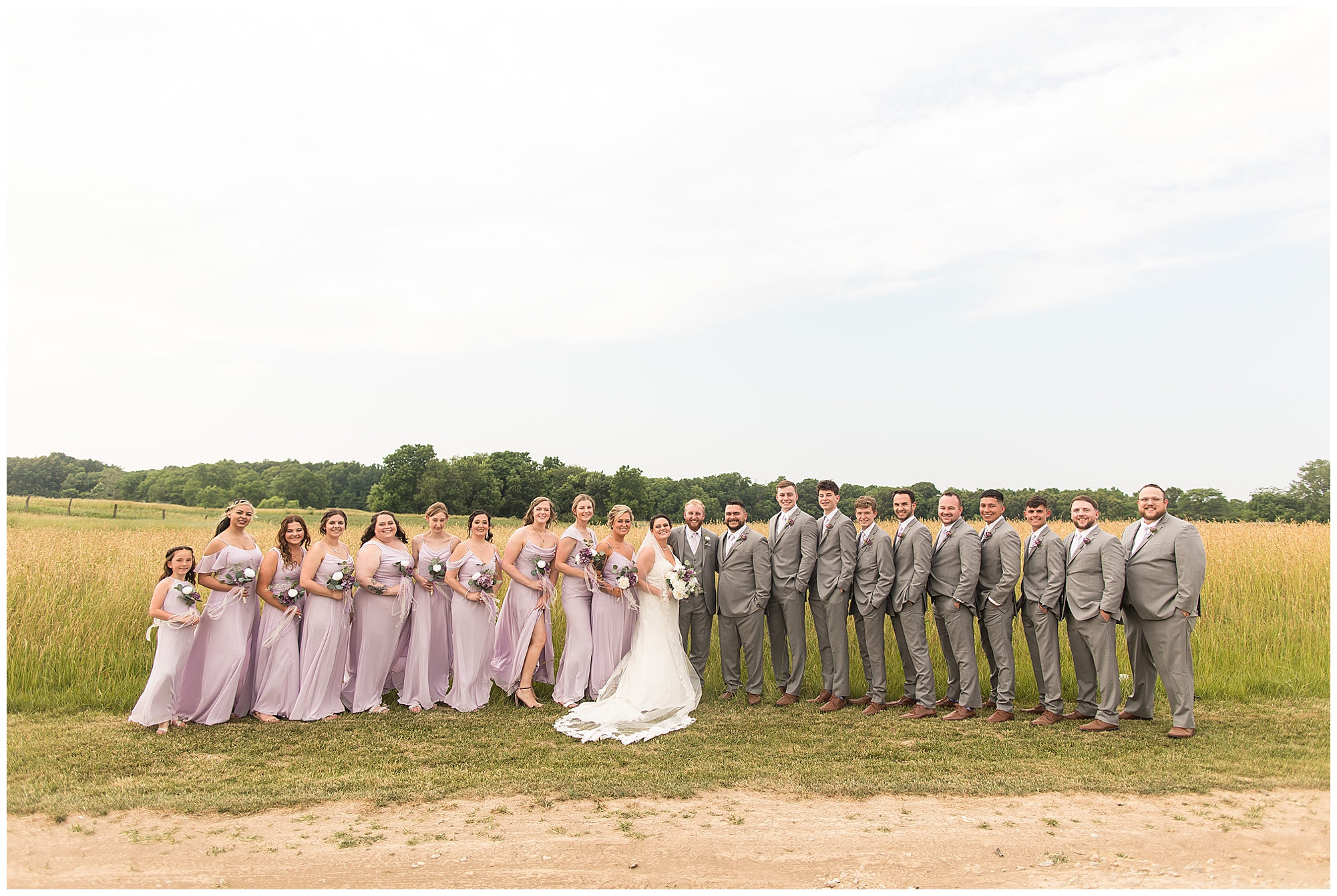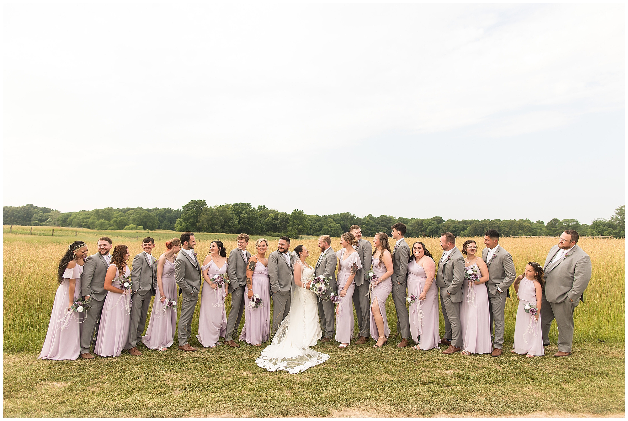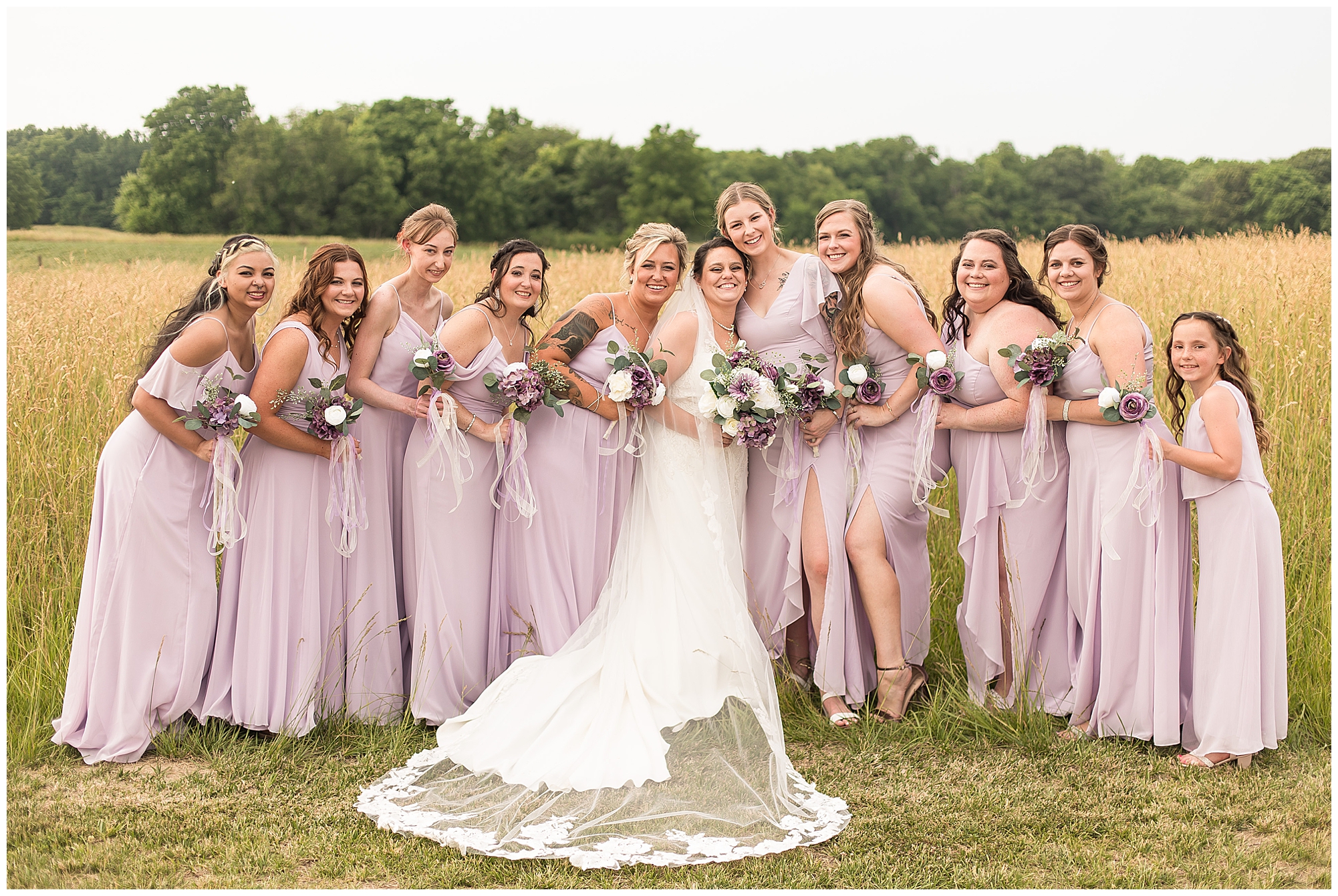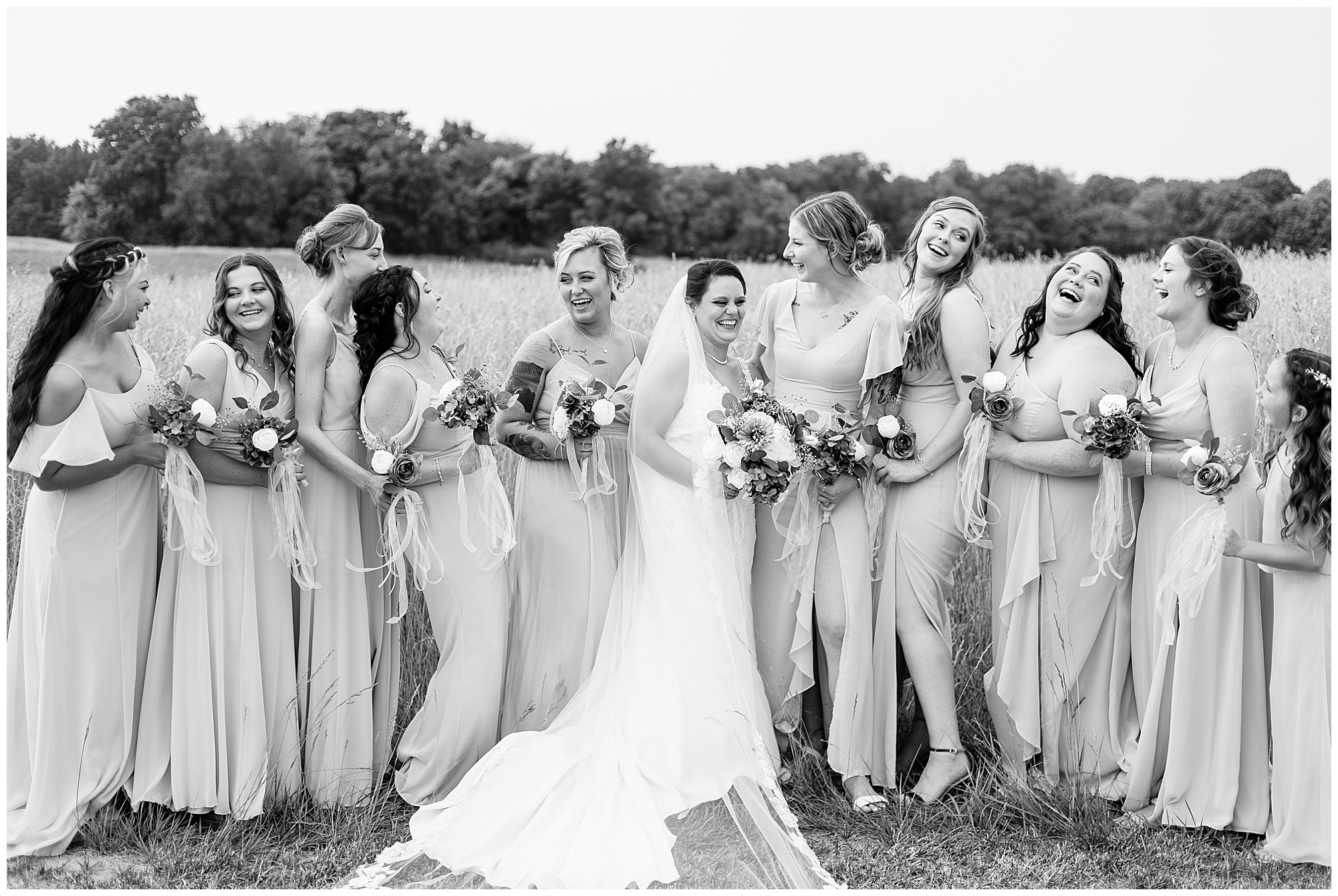 Once family photos were completed, the huge bridal party all got together for some fun times with their bride and groom! This group was fired up and brought the excitement! Then it was my favorite part of the day…Photos of the newlyweds! Everything these two had been planning and waiting for was now here and Alena and Zach were married! They were beautiful together surrounded by the tall grasses and open fields of the property. I loved spending this time with Alena and Zach before the party started at the reception.