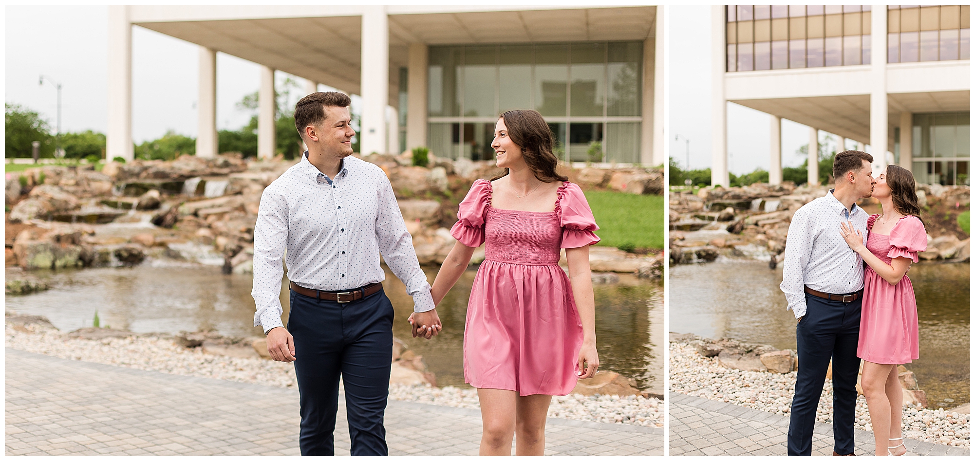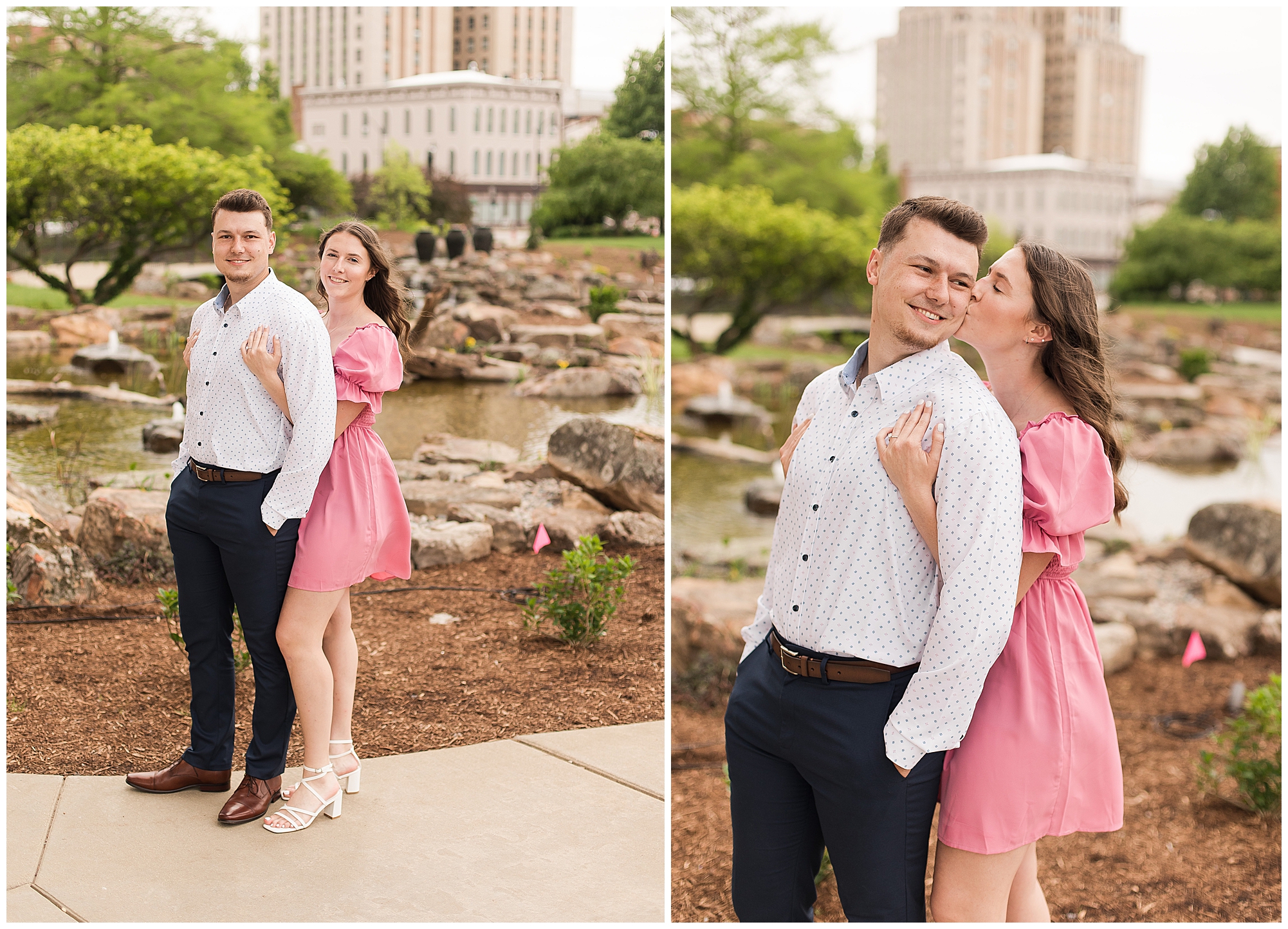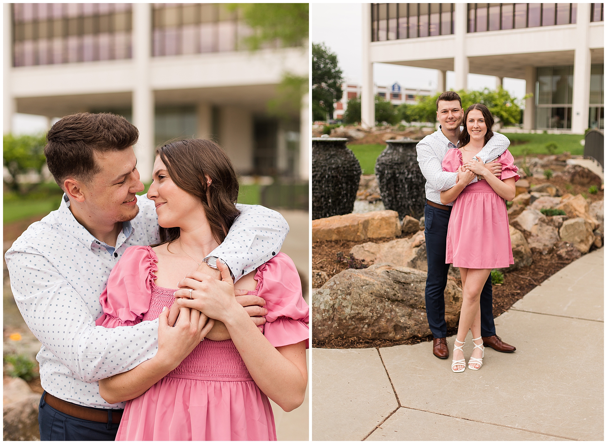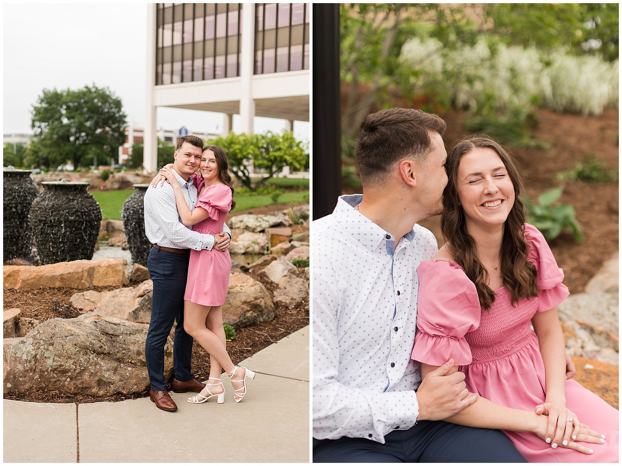 Bree and Daniel currently reside in Bloomington, Illinois. However, Bree is from the Springfield area and they decided to come back to her hometown for their engagement session. I met up with this adorable couple at the Horace Mann Building, where they have newly renovated landscaping. I could tell they were excited for photos but they were a little nervous. But, within a few minutes, Bree and Daniel settled in and nailed their e-session! These two met while in college at UIS. Bree played softball while Daniel was on the soccer team. These two hit it off and the rest is history. This location with its beautiful pond and rustic rocks was the perfect settling for this sweet couple.