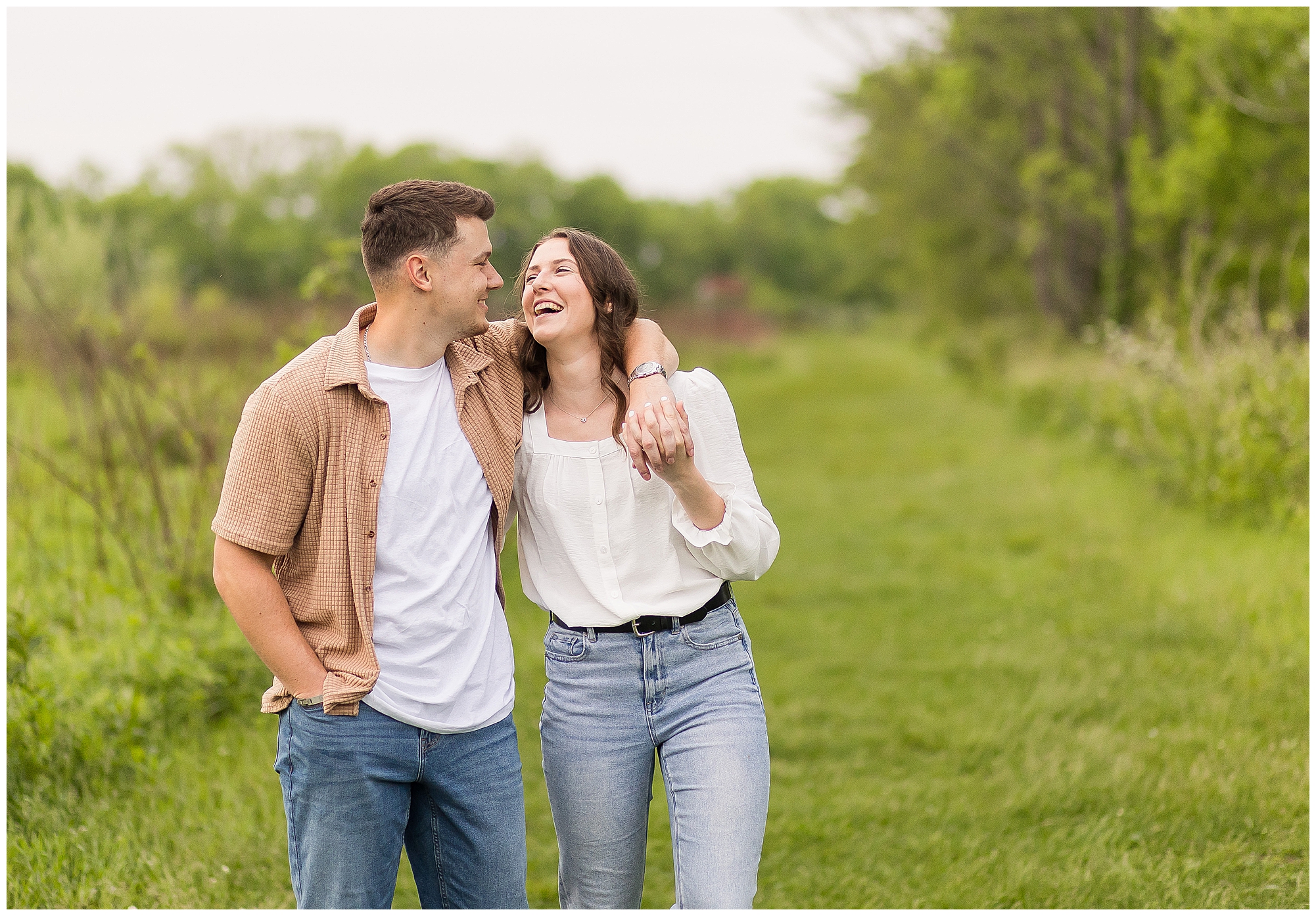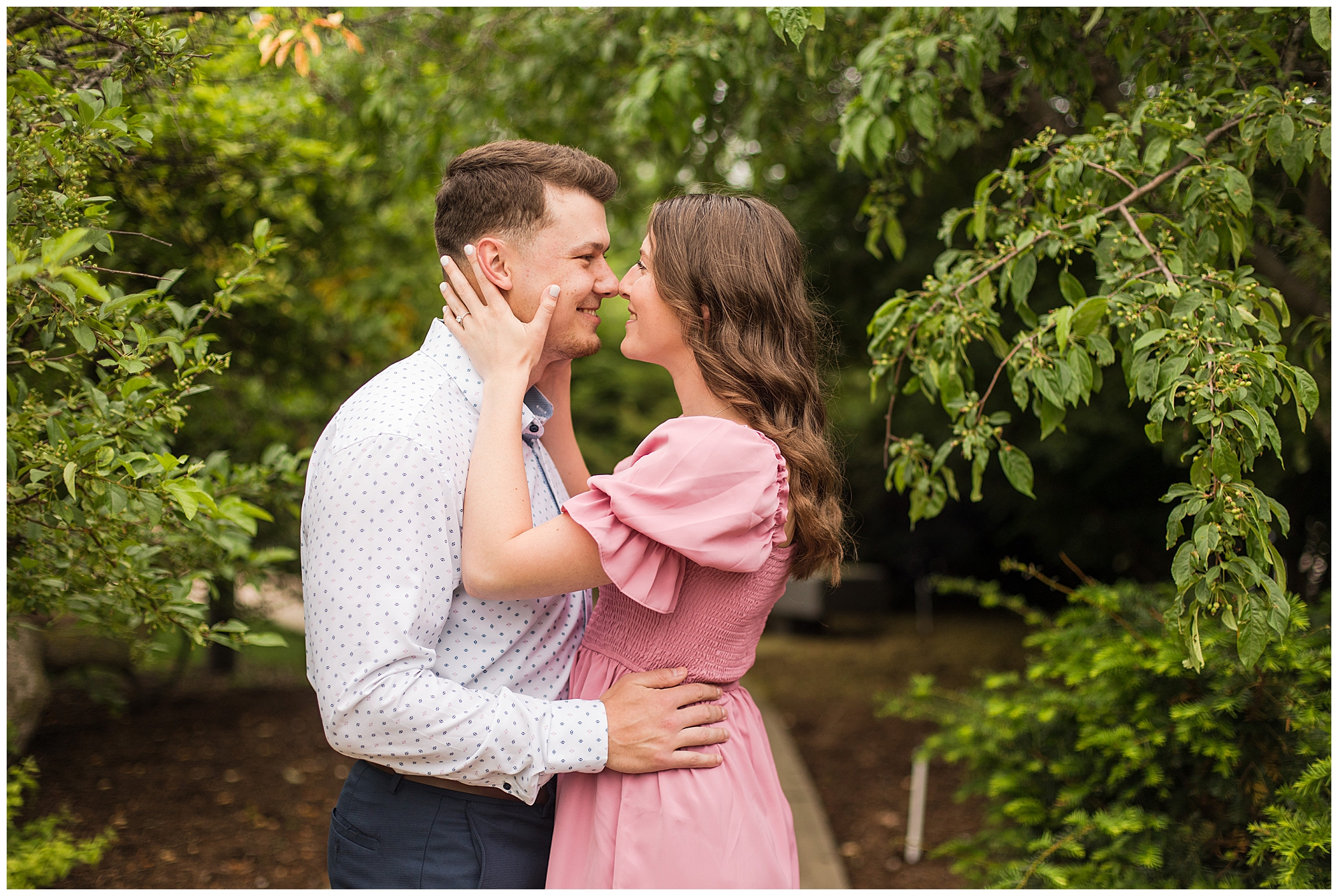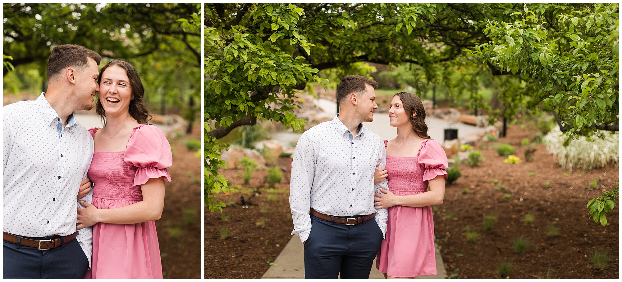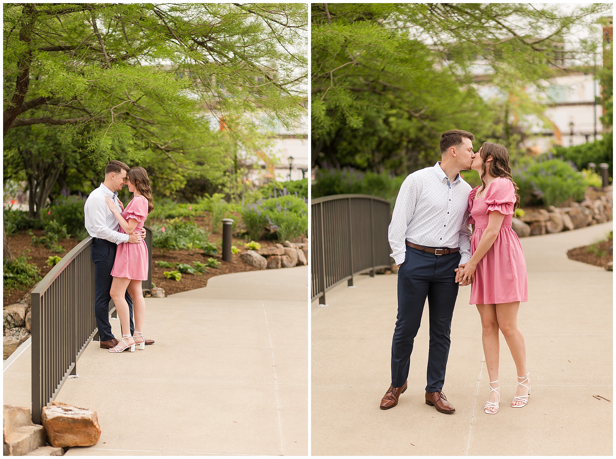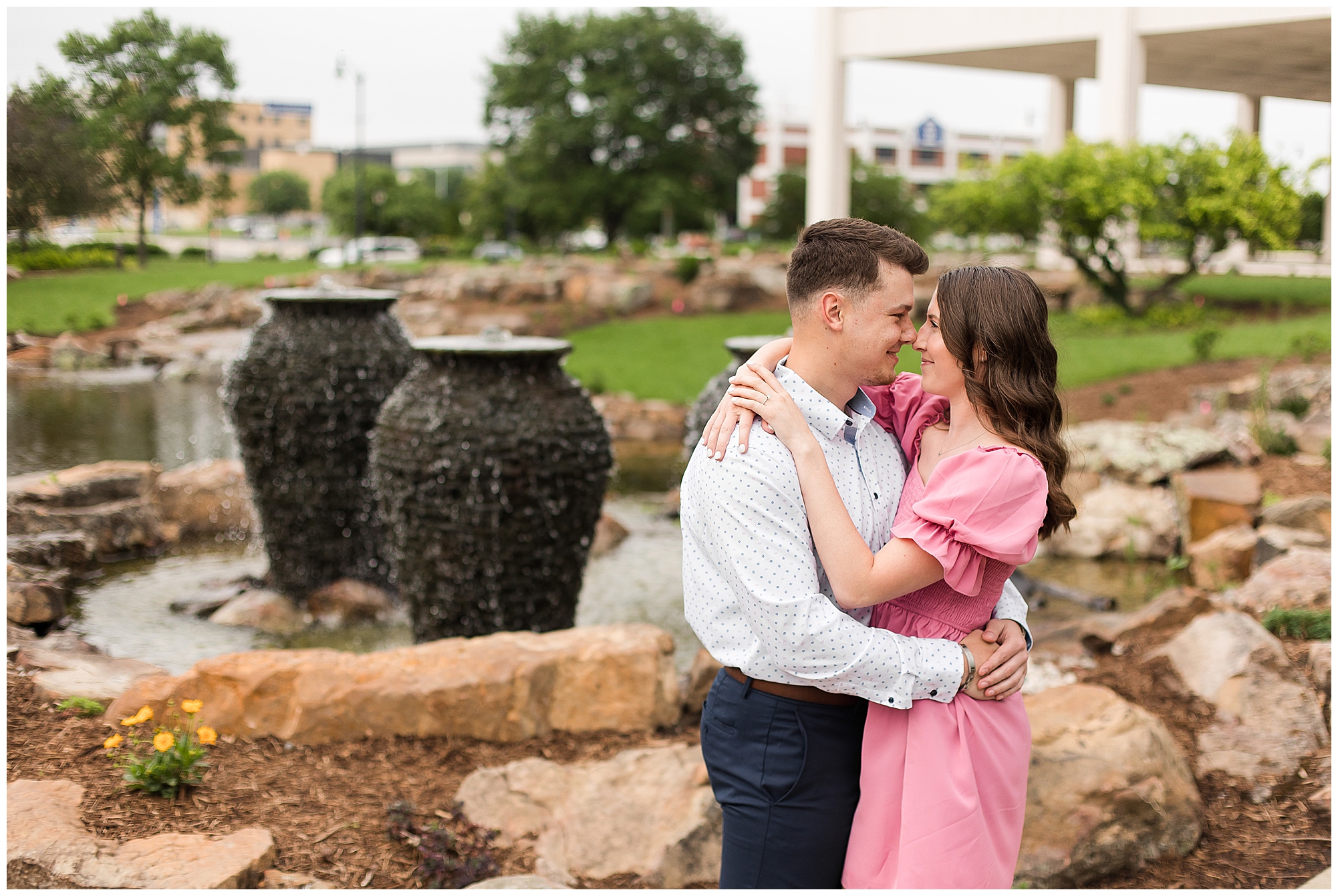 Bree and Daniel currently reside in Bloomington, Illinois. However, Bree is from the Springfield area and they decided to come back to her hometown for their engagement session. I met up with this adorable couple at the Horace Mann Building, where they have newly renovated landscaping. I could tell they were excited for photos but they were a little nervous. But, within a few minutes, Bree and Daniel settled in and nailed their e-session! These two met while in college at UIS. Bree played softball while Daniel was on the soccer team. These two hit it off and the rest is history. This location with its beautiful pond and rustic rocks was the perfect settling for this sweet couple.