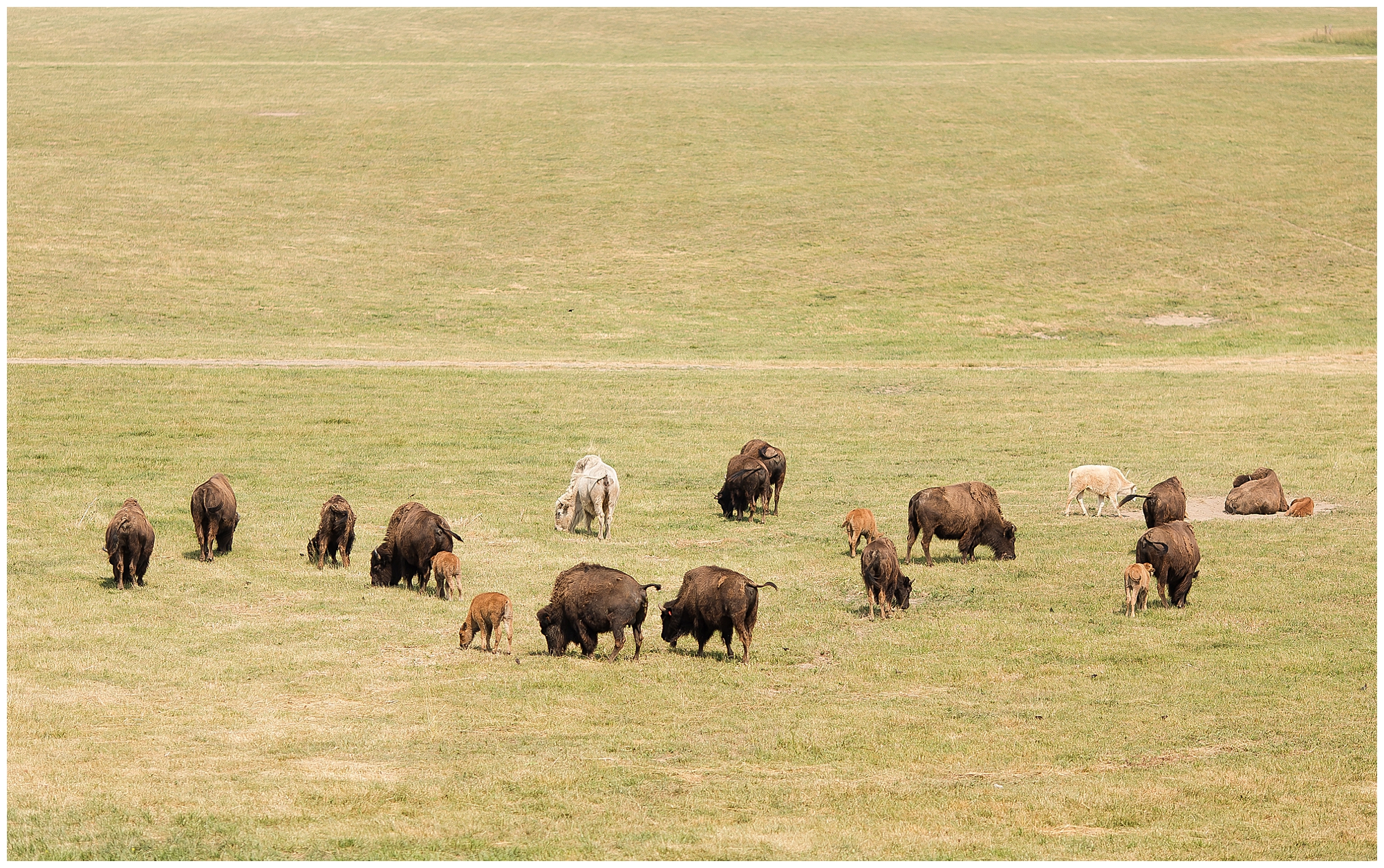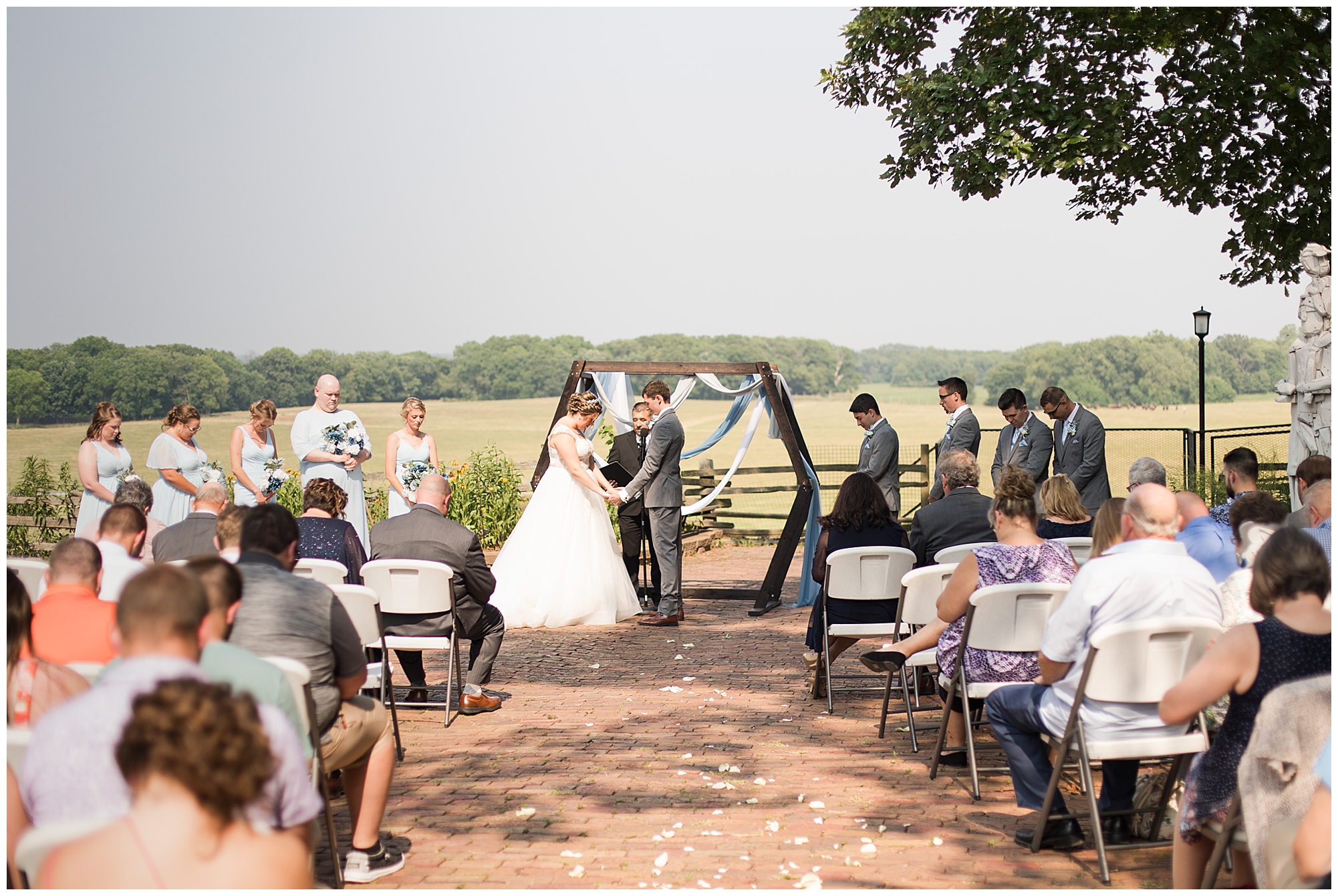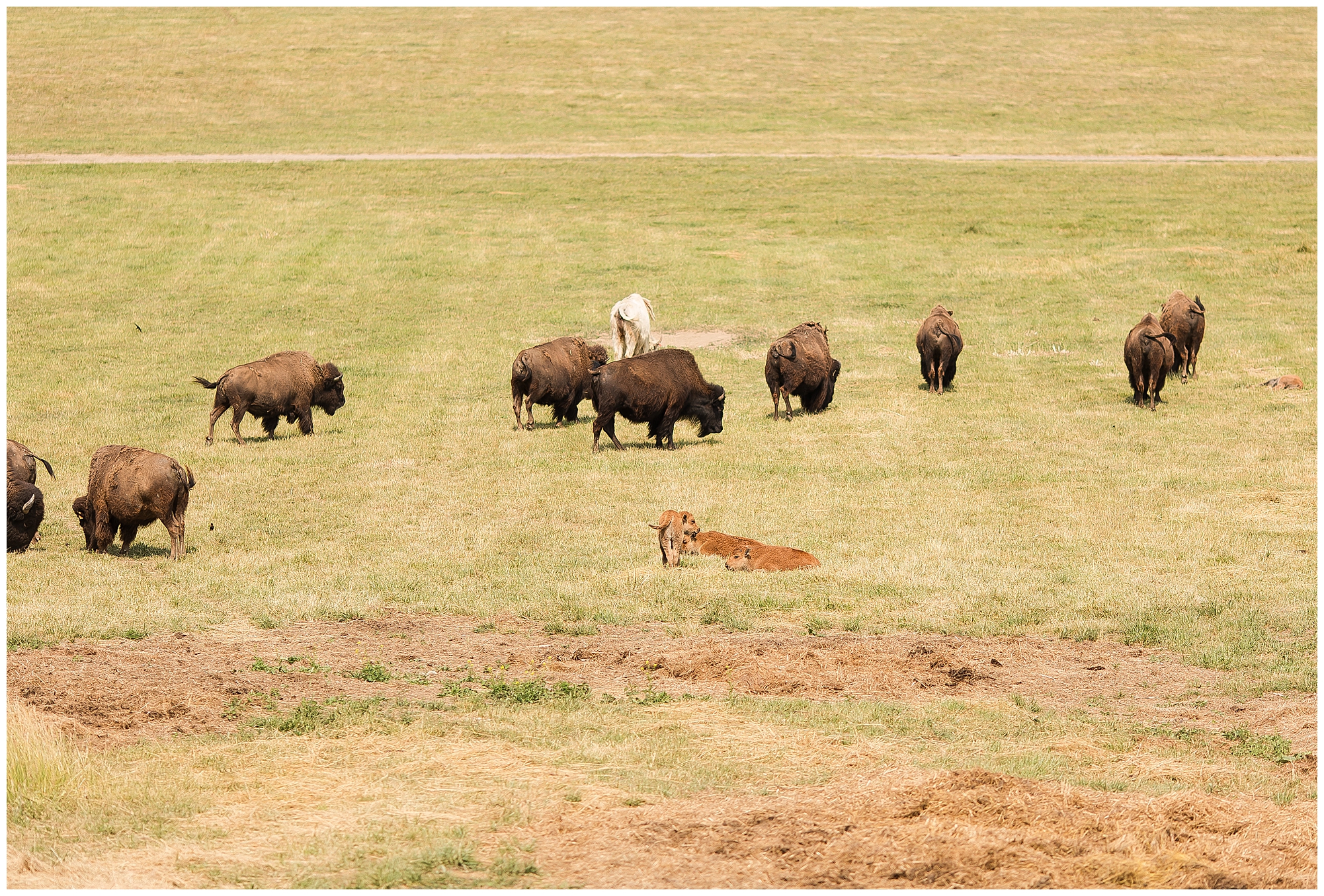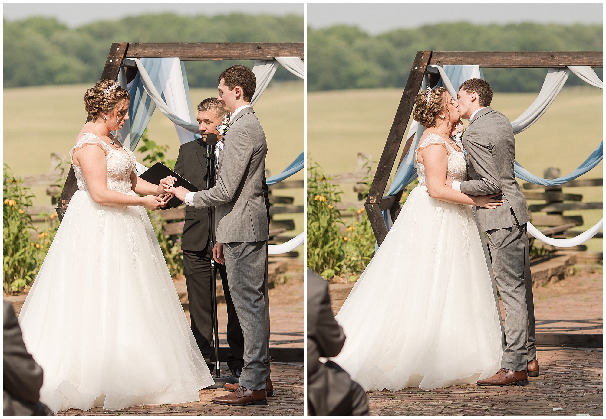 The bridal party was so full of energy and fun that I almost forgot it was super hot outside! Kassondra and Zac’s crew were made up of family and friends, including another LWP Bride, Kassondra’s sister, Brittney. I took a few extra minutes for some photos of the lovely couple before whisking them off to hide prior to the ceremony. And before we knew it, the ceremony was upon us! The outdoor ceremony was set up overlooking a huge pasture with Bison and Elk roaming around. Such an awesome scene! The nuptials began with special sight of the honorary ring bearer and flower girl walking down the aisle (aka Kassondra’s grandparents). It was the sweetest thing watching her grandfather walk the rings down the aisle followed by her grandmother throwing petals from her basket. Absolutely adorable! Then the bride made her way up the aisle with her father towards her awaiting groom. These two shared their vows, exchanged rings, and made it official with a kiss! The new Mr. & Mrs. Simon!