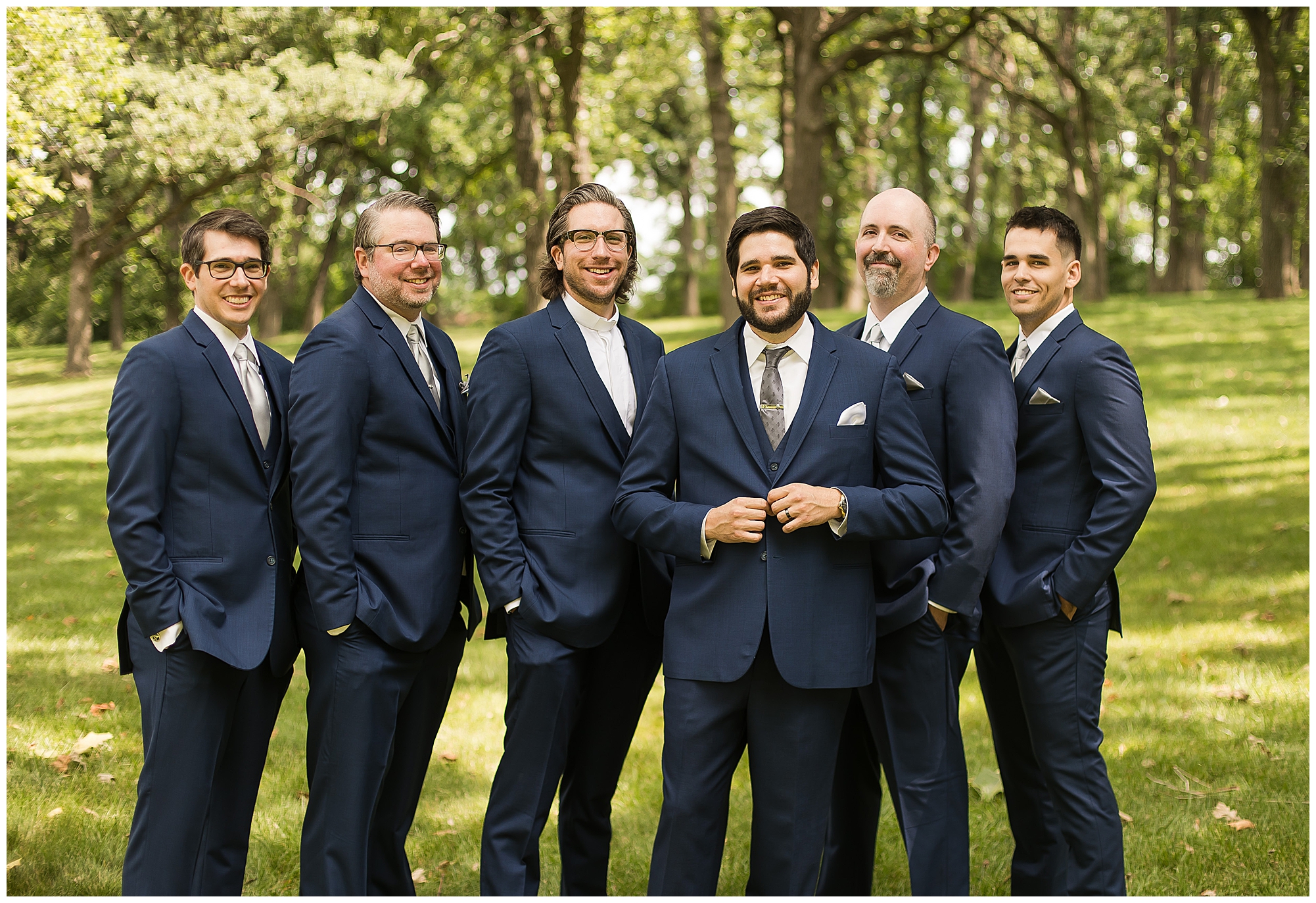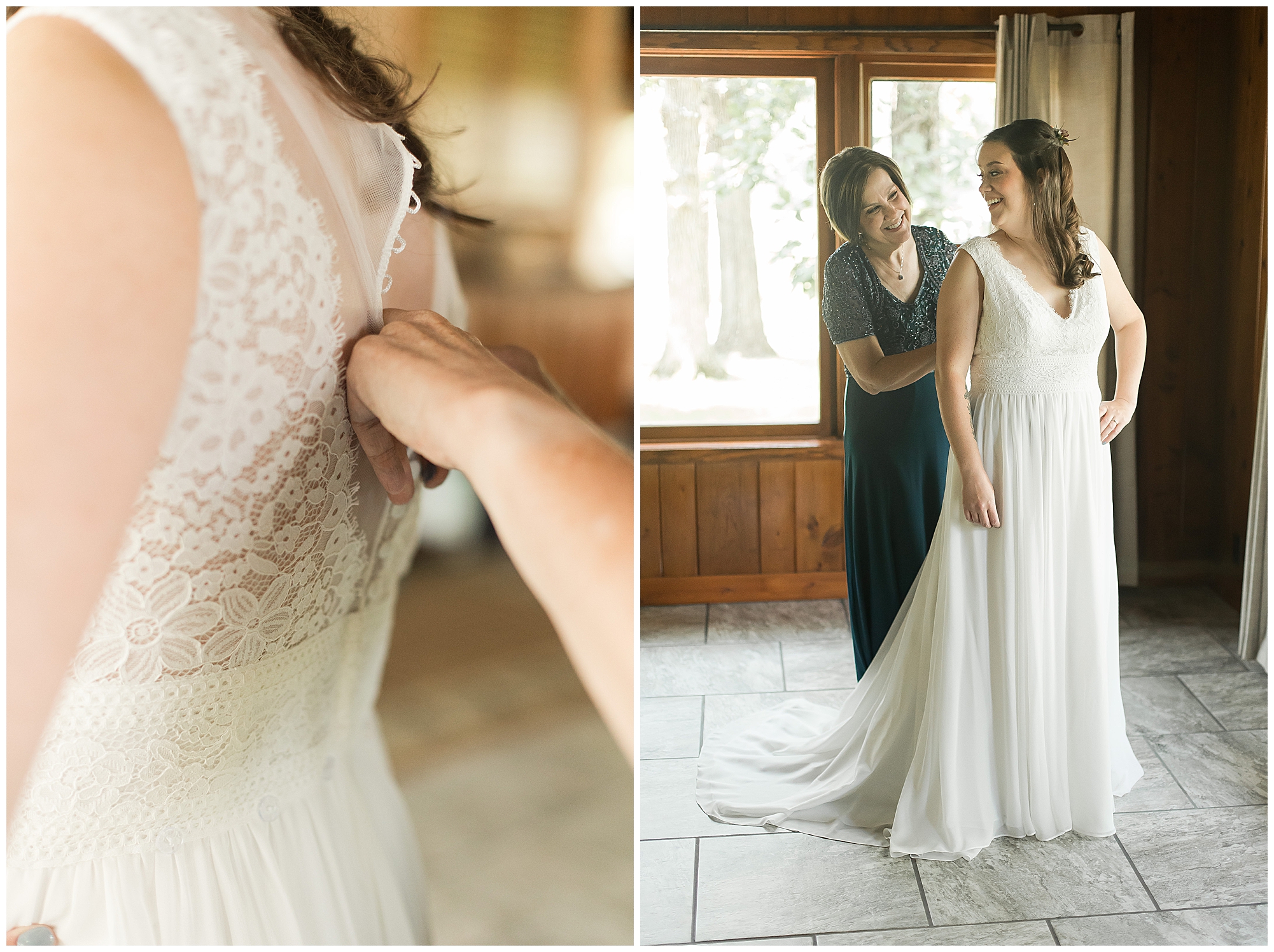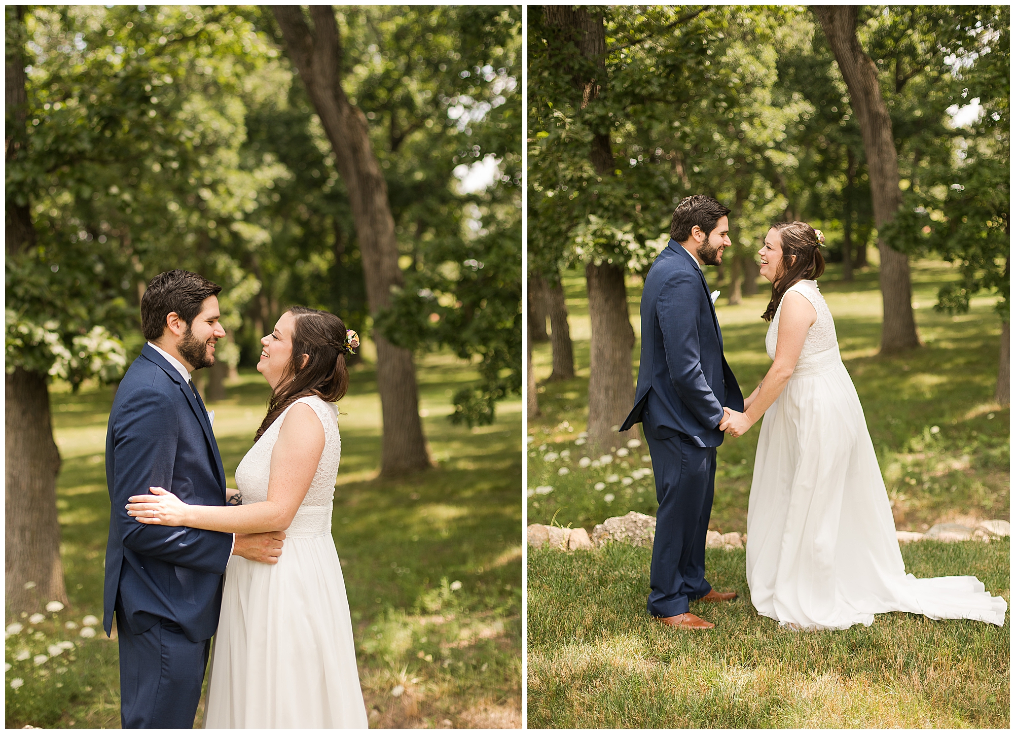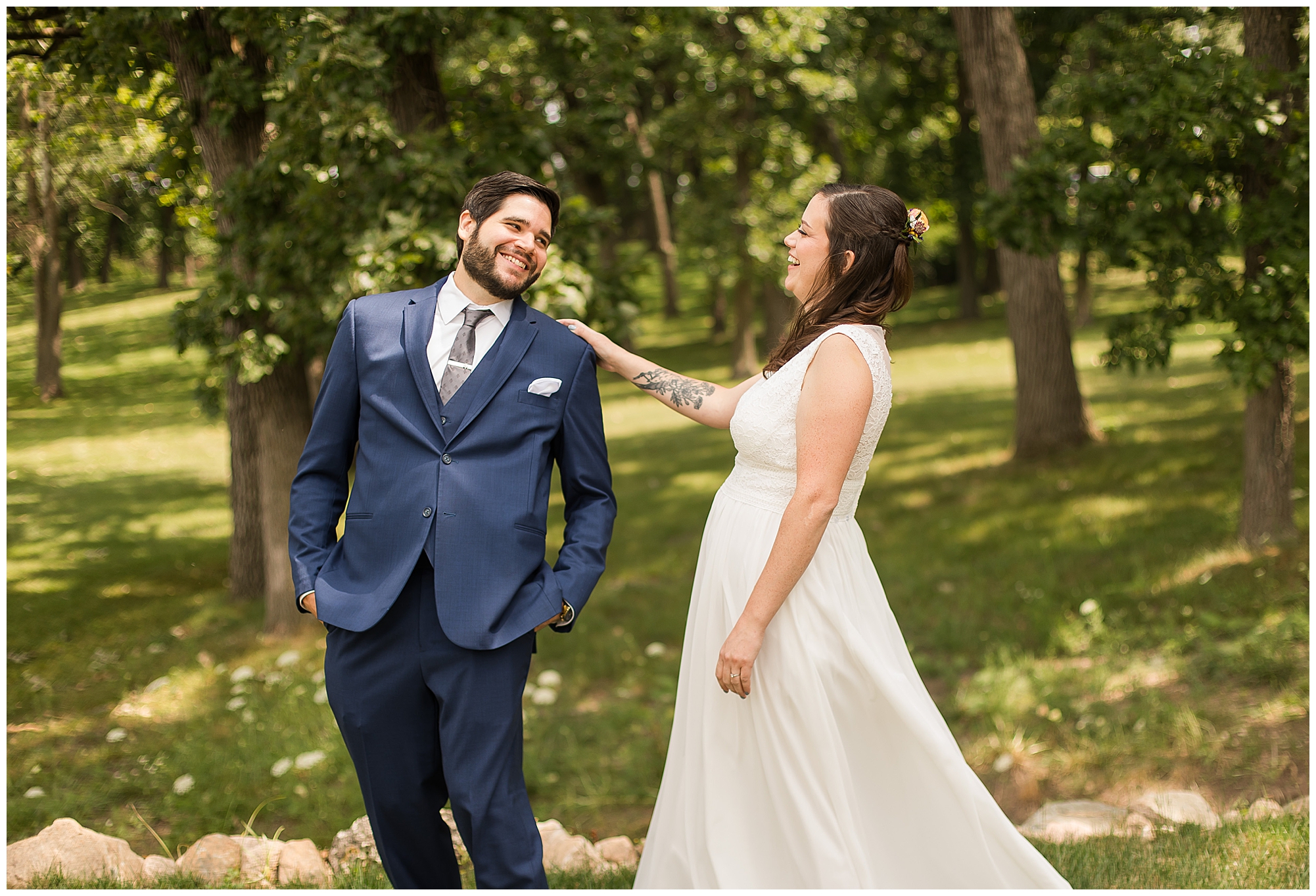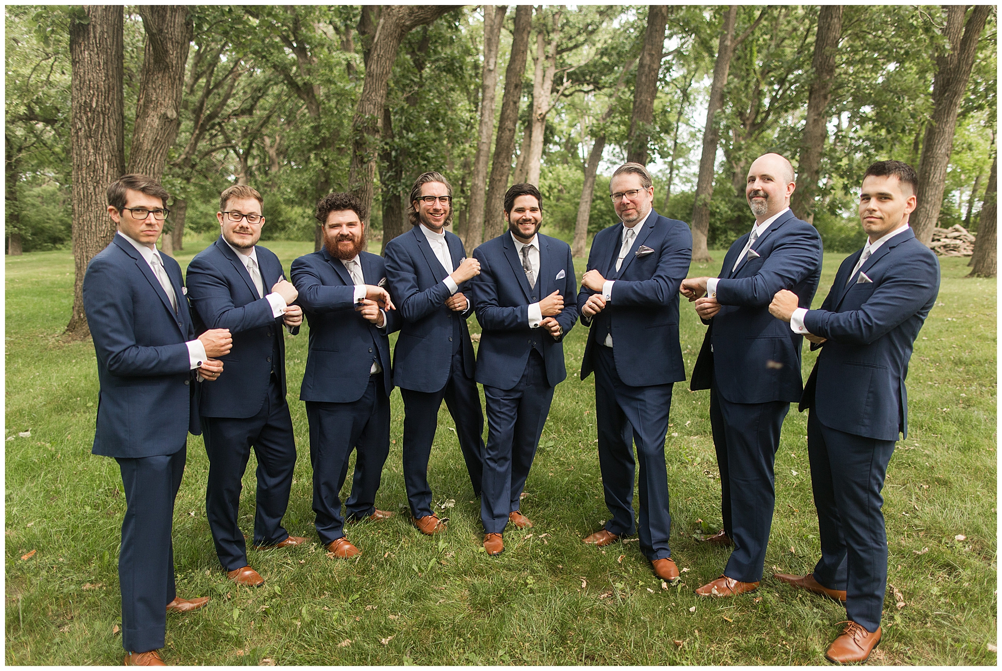 I knew going into Caitlin and Jake’s summer wedding it was going to be a good one. During their engagement session, they showed me their laid back, ready for a fun time energy and I was absolutely down for it! So when their big day arrived at the gorgeous Whispering Woods venue in Harvard, Illinois, about an hour outside of Rockford and close to the Wisconsin boarder, I wasn’t surprised by the loving, supportive, and hilarious people they surrounded themselves with. From their welcoming families and incredible bridal party, I already felt the love and was ready to capture it all for this adorable couple. Caitlin was calm and cool when I met up with her in one of the cabins on the venue’s property. She was taking in all the small moments with her bridesmaids, mom, and friends. She was going for a classic, simple, wedding infused with some of their favorite “Nerd Stuff” (Caitlin’s words, not mine). See, Caitlin and Jake are huge Star Wars fans, as well as other popular franchises, and they peppered them throughout their wedding day. The many nephews and nieces sported Pikachu, Fortnite, and Star Wars bowties and hair bows, while Jake even had a subtle Star Wars pattern in his tie. Plus the groomsmen were gifted themed socks and cufflinks. How fun!