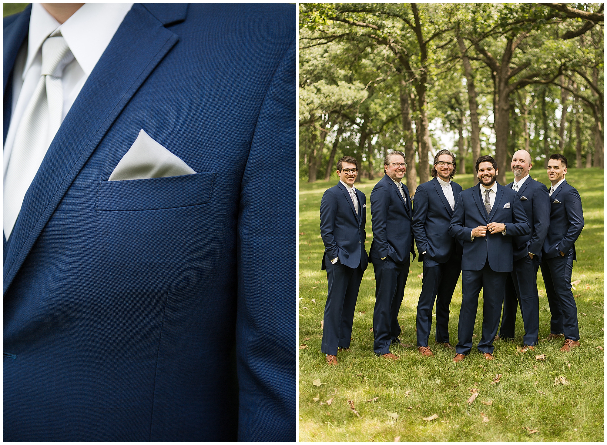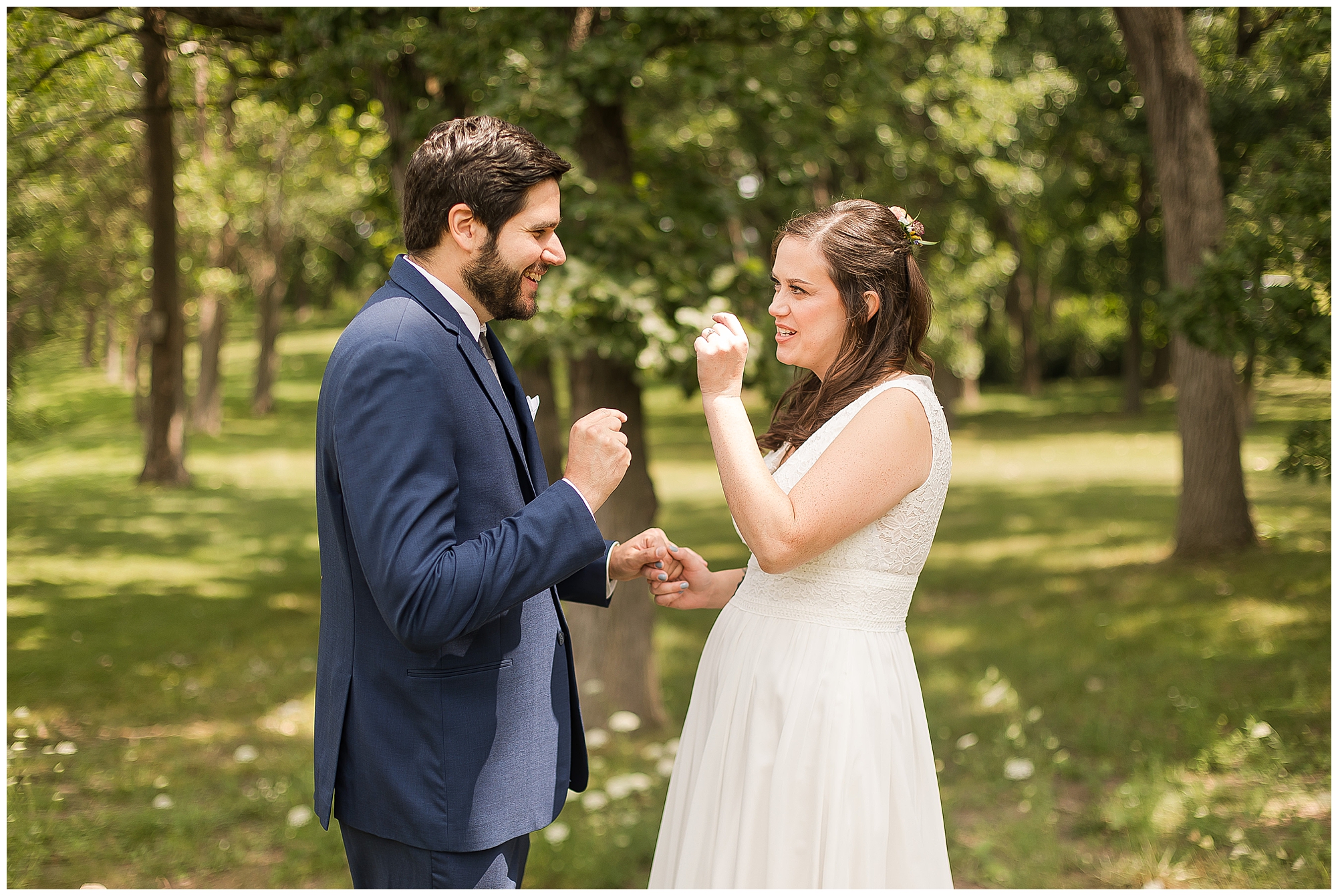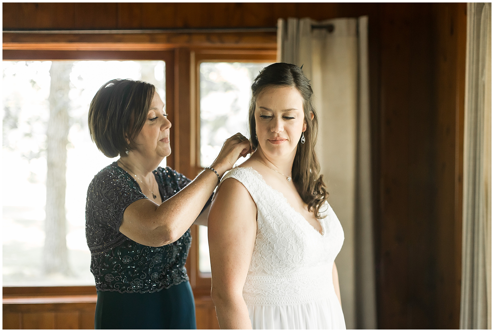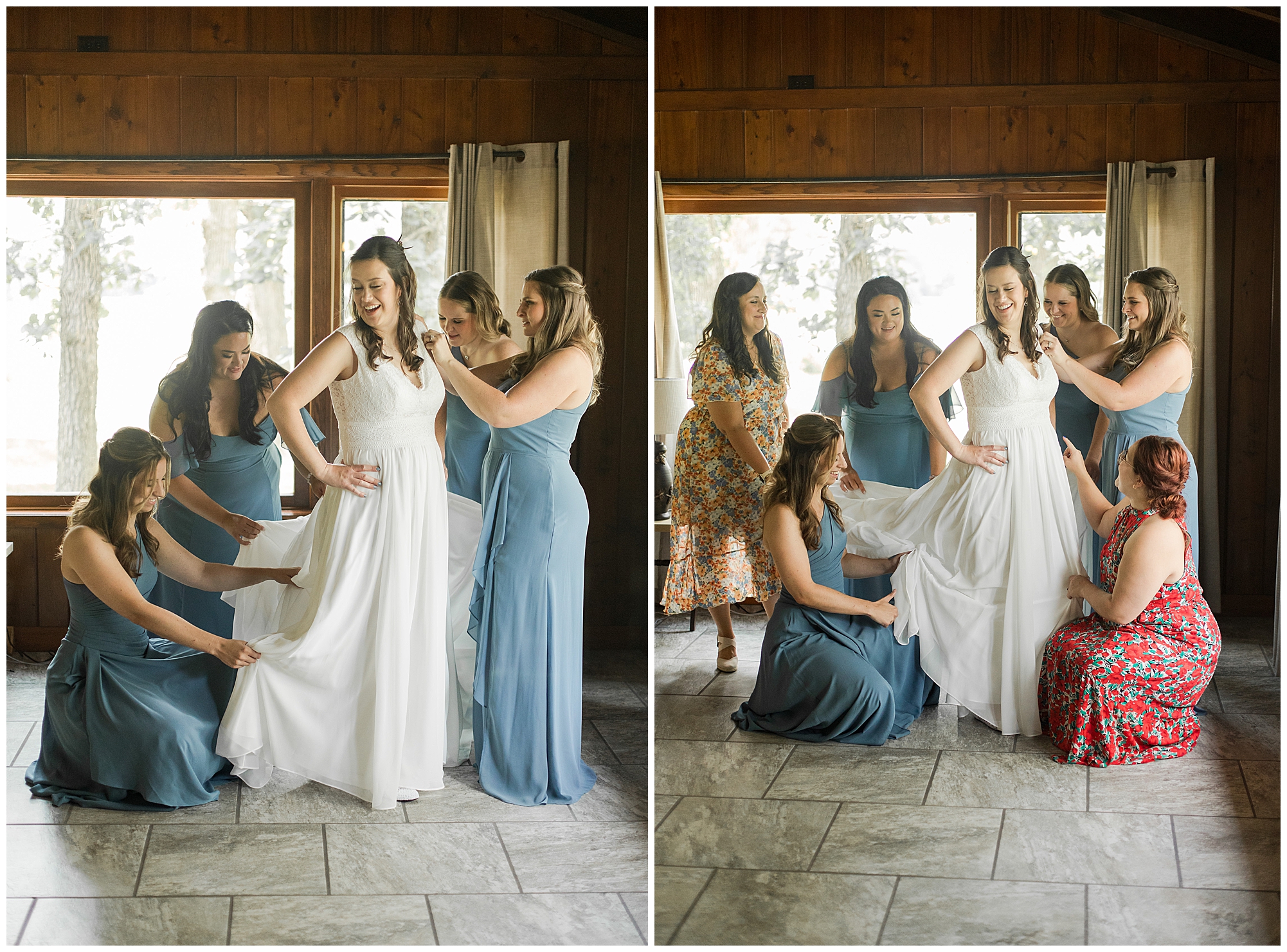 I knew going into Caitlin and Jake’s summer wedding it was going to be a good one. During their engagement session, they showed me their laid back, ready for a fun time energy and I was absolutely down for it! So when their big day arrived at the gorgeous Whispering Woods venue in Harvard, Illinois, about an hour outside of Rockford and close to the Wisconsin boarder, I wasn’t surprised by the loving, supportive, and hilarious people they surrounded themselves with. From their welcoming families and incredible bridal party, I already felt the love and was ready to capture it all for this adorable couple. Caitlin was calm and cool when I met up with her in one of the cabins on the venue’s property. She was taking in all the small moments with her bridesmaids, mom, and friends. She was going for a classic, simple, wedding infused with some of their favorite “Nerd Stuff” (Caitlin’s words, not mine). See, Caitlin and Jake are huge Star Wars fans, as well as other popular franchises, and they peppered them throughout their wedding day. The many nephews and nieces sported Pikachu, Fortnite, and Star Wars bowties and hair bows, while Jake even had a subtle Star Wars pattern in his tie. Plus the groomsmen were gifted themed socks and cufflinks. How fun!