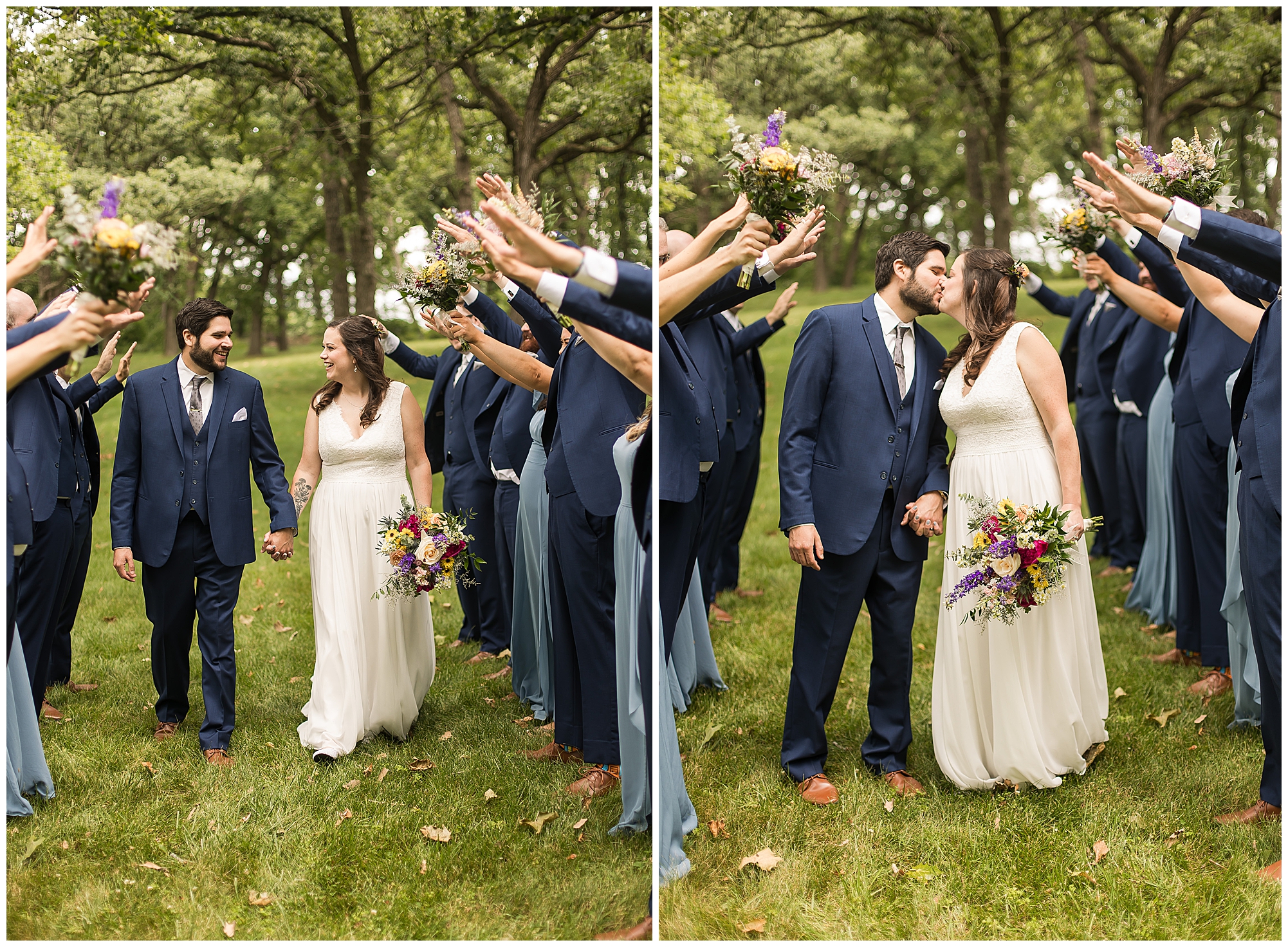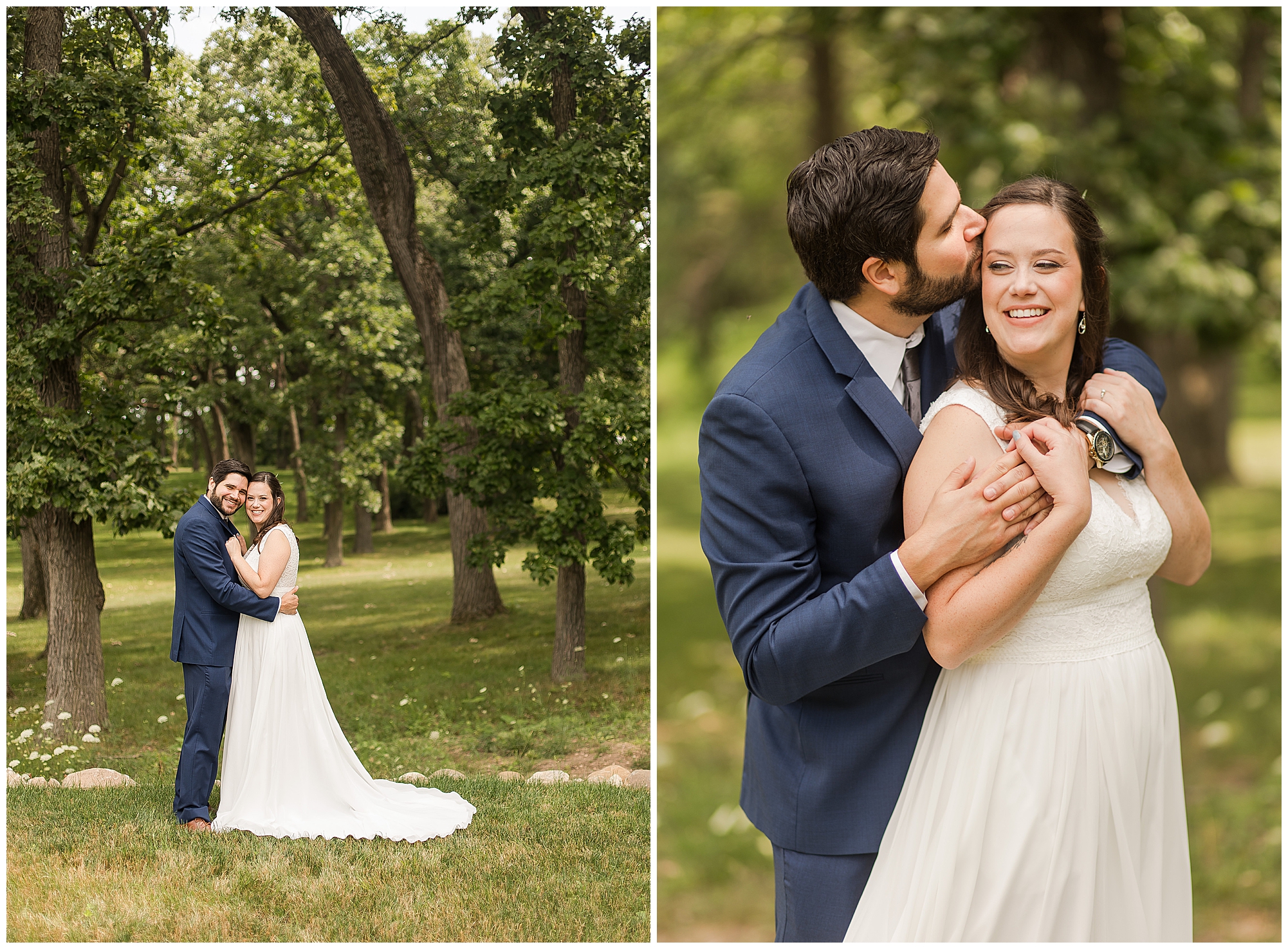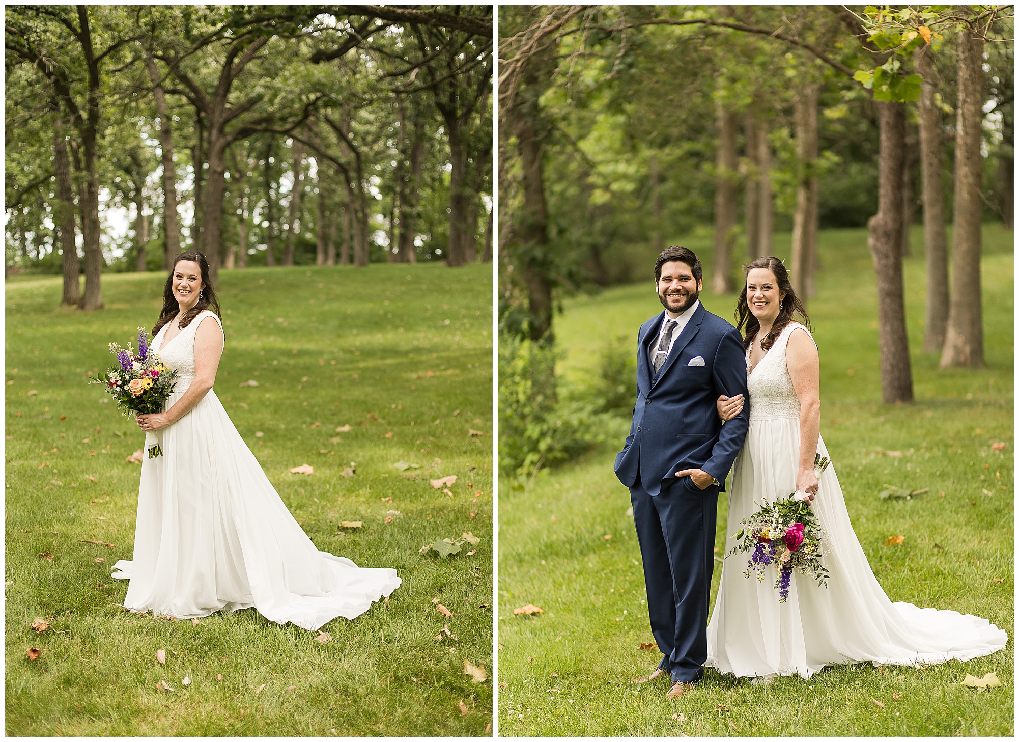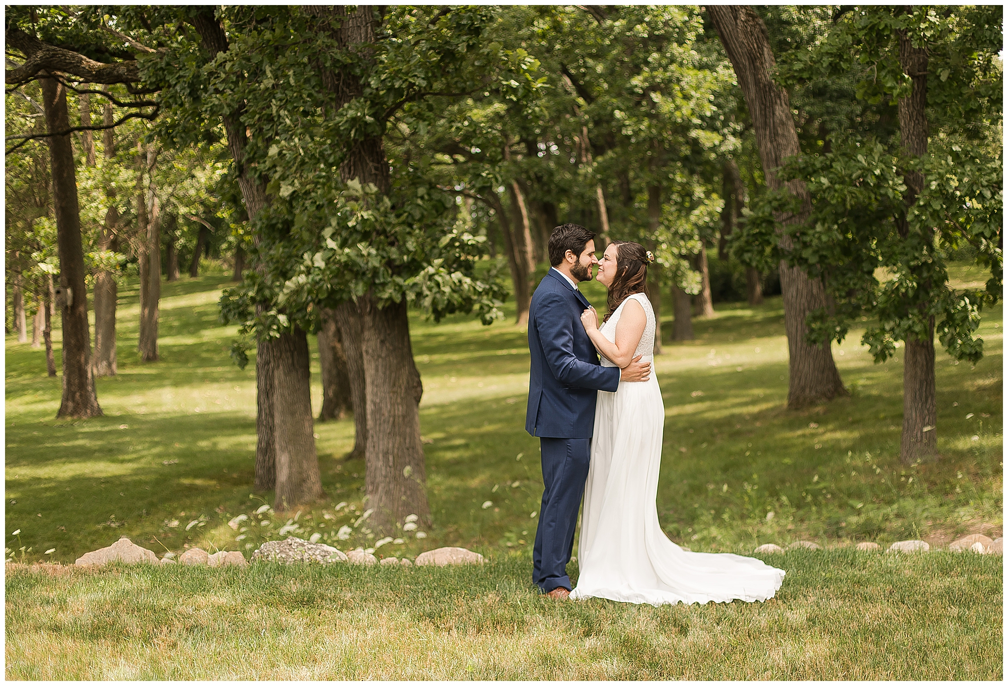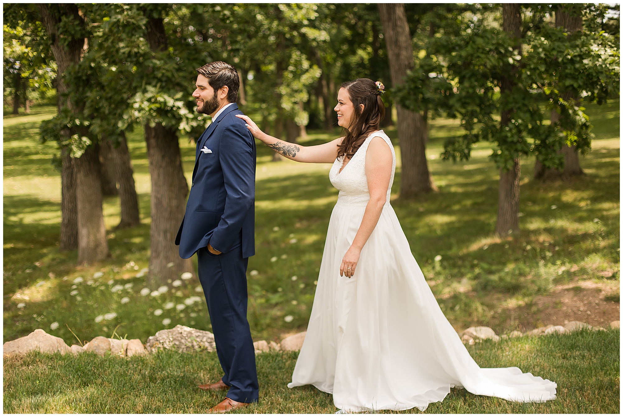 I knew going into Caitlin and Jake’s summer wedding it was going to be a good one. During their engagement session, they showed me their laid back, ready for a fun time energy and I was absolutely down for it! So when their big day arrived at the gorgeous Whispering Woods venue in Harvard, Illinois, about an hour outside of Rockford and close to the Wisconsin boarder, I wasn’t surprised by the loving, supportive, and hilarious people they surrounded themselves with. From their welcoming families and incredible bridal party, I already felt the love and was ready to capture it all for this adorable couple. Caitlin was calm and cool when I met up with her in one of the cabins on the venue’s property. She was taking in all the small moments with her bridesmaids, mom, and friends. She was going for a classic, simple, wedding infused with some of their favorite “Nerd Stuff” (Caitlin’s words, not mine). See, Caitlin and Jake are huge Star Wars fans, as well as other popular franchises, and they peppered them throughout their wedding day. The many nephews and nieces sported Pikachu, Fortnite, and Star Wars bowties and hair bows, while Jake even had a subtle Star Wars pattern in his tie. Plus the groomsmen were gifted themed socks and cufflinks. How fun!