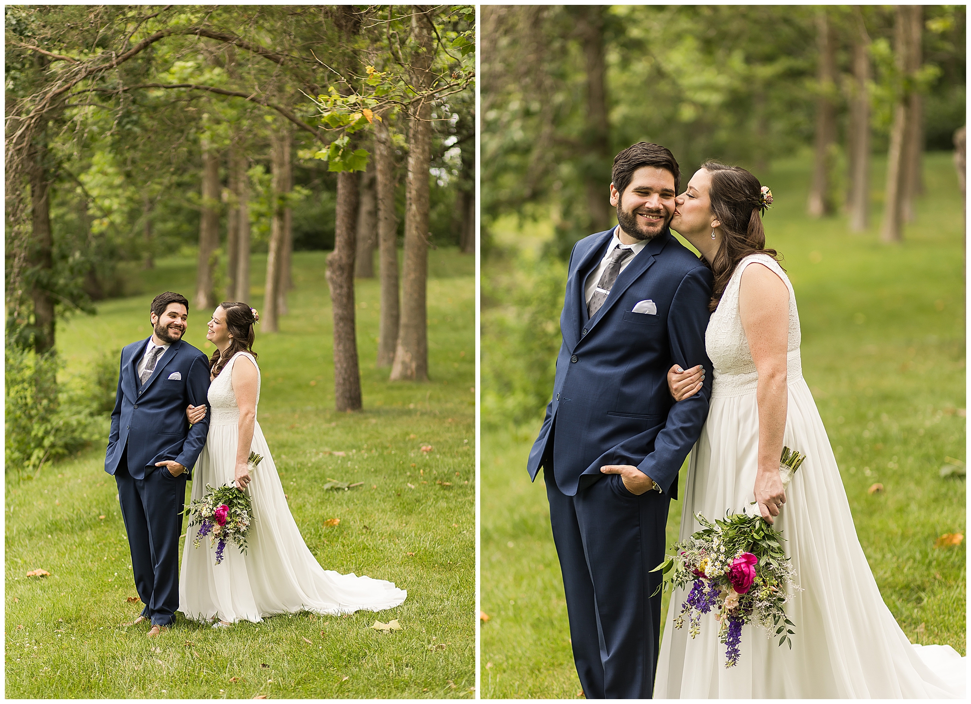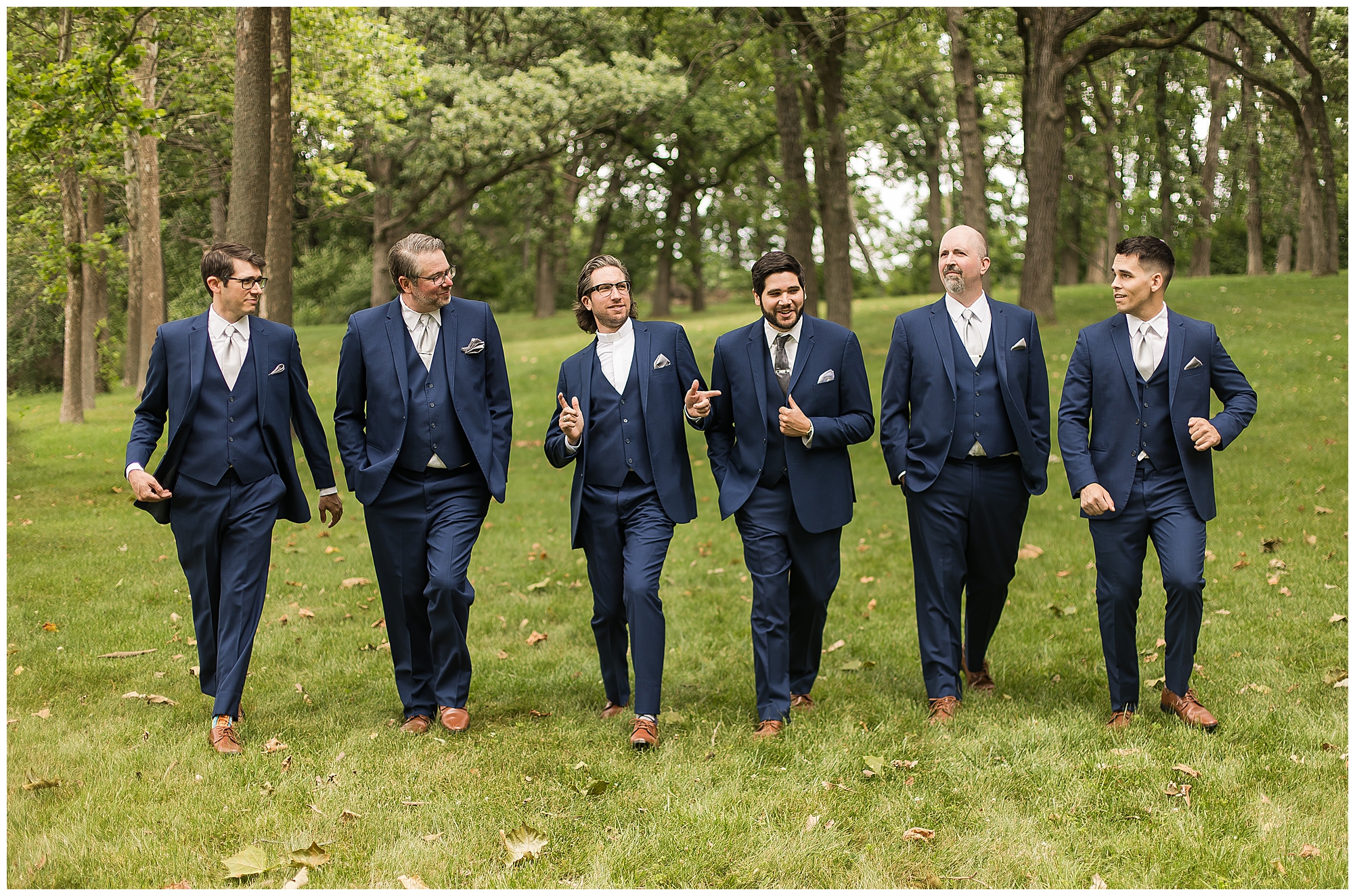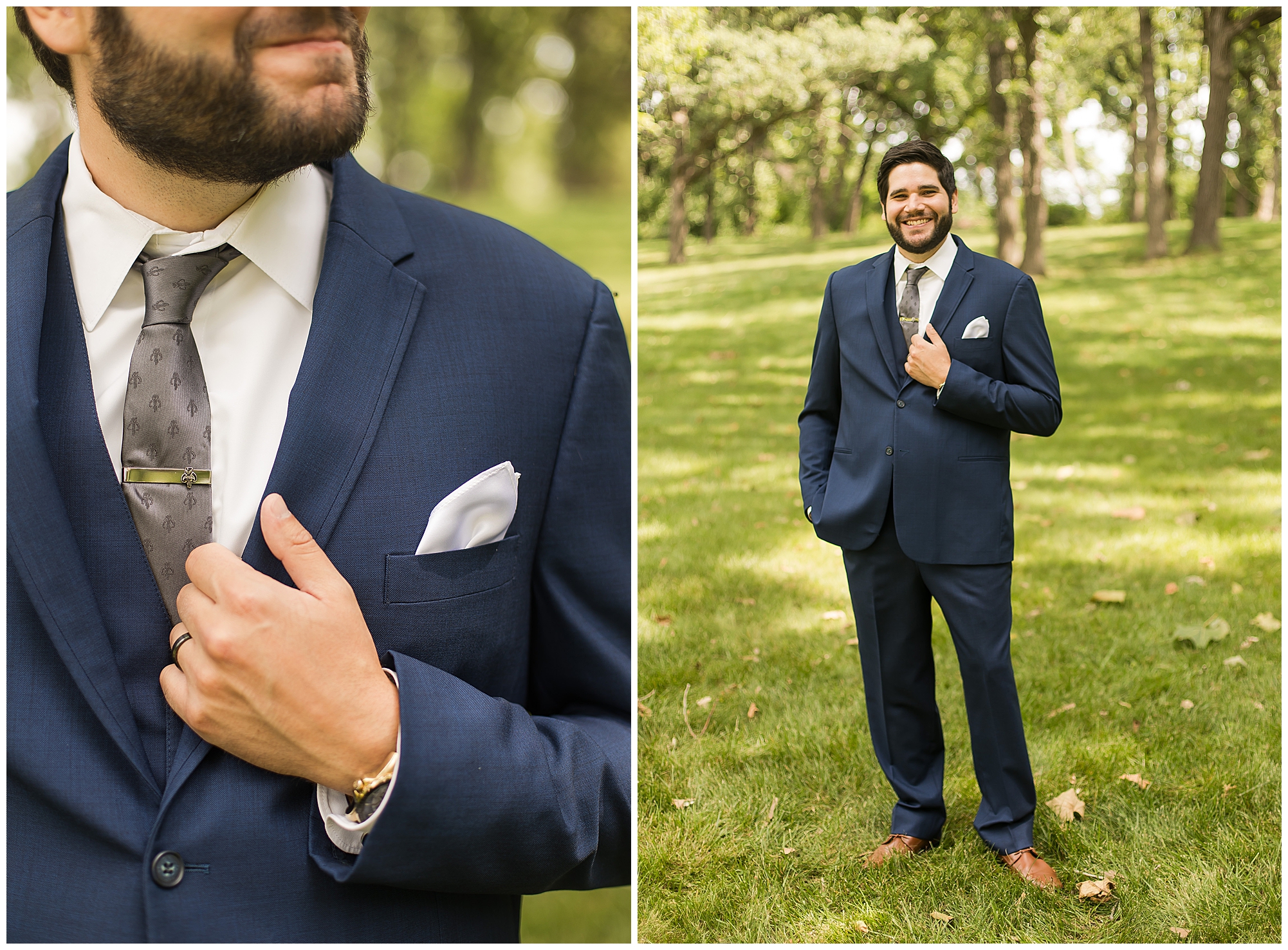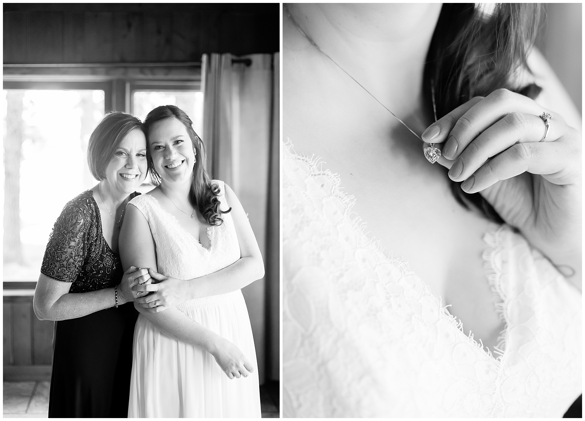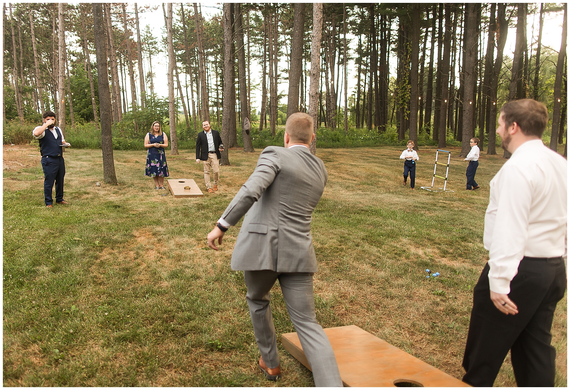 I knew going into Caitlin and Jake’s summer wedding it was going to be a good one. During their engagement session, they showed me their laid back, ready for a fun time energy and I was absolutely down for it! So when their big day arrived at the gorgeous Whispering Woods venue in Harvard, Illinois, about an hour outside of Rockford and close to the Wisconsin boarder, I wasn’t surprised by the loving, supportive, and hilarious people they surrounded themselves with. From their welcoming families and incredible bridal party, I already felt the love and was ready to capture it all for this adorable couple. Caitlin was calm and cool when I met up with her in one of the cabins on the venue’s property. She was taking in all the small moments with her bridesmaids, mom, and friends. She was going for a classic, simple, wedding infused with some of their favorite “Nerd Stuff” (Caitlin’s words, not mine). See, Caitlin and Jake are huge Star Wars fans, as well as other popular franchises, and they peppered them throughout their wedding day. The many nephews and nieces sported Pikachu, Fortnite, and Star Wars bowties and hair bows, while Jake even had a subtle Star Wars pattern in his tie. Plus the groomsmen were gifted themed socks and cufflinks. How fun!