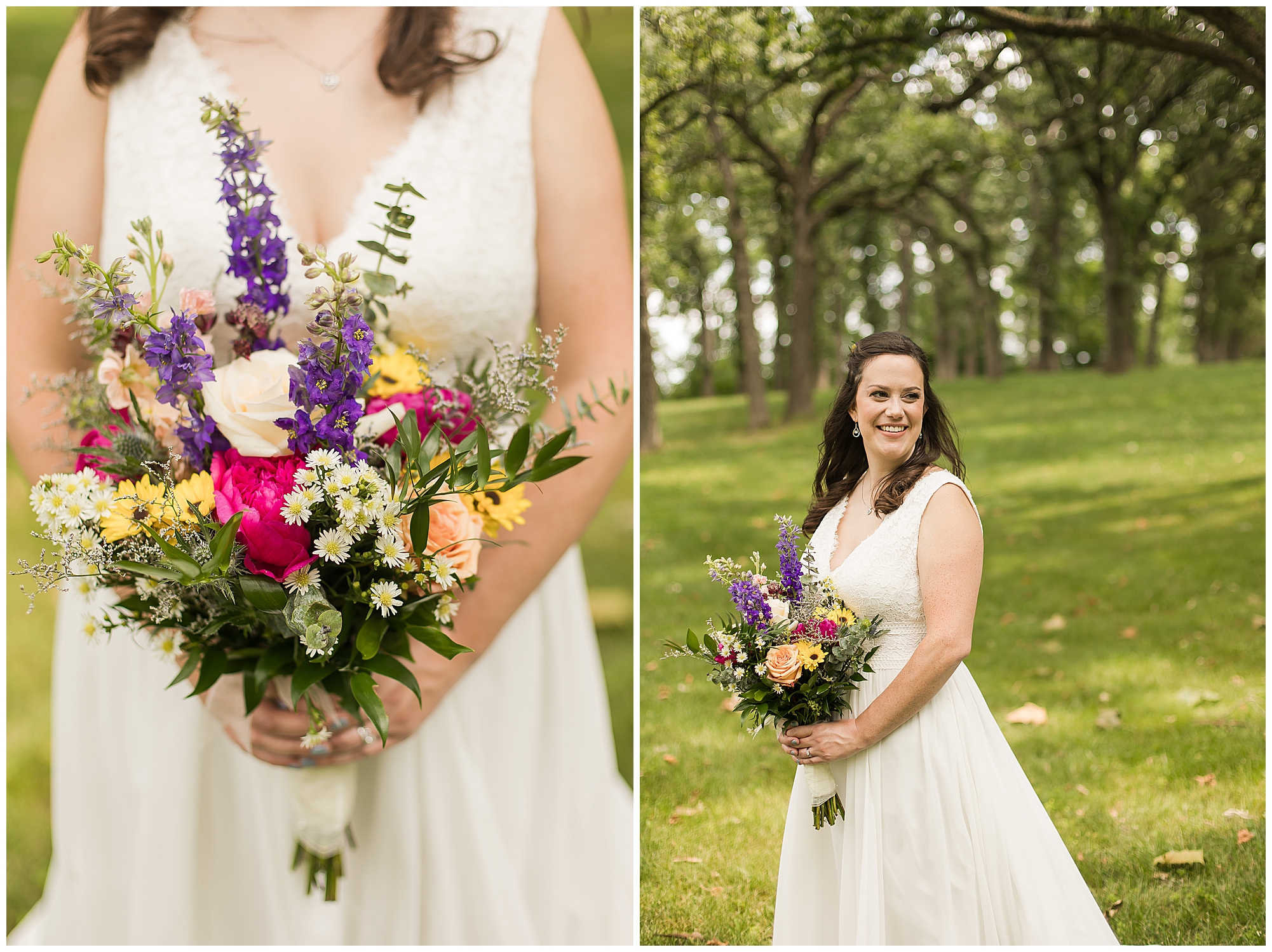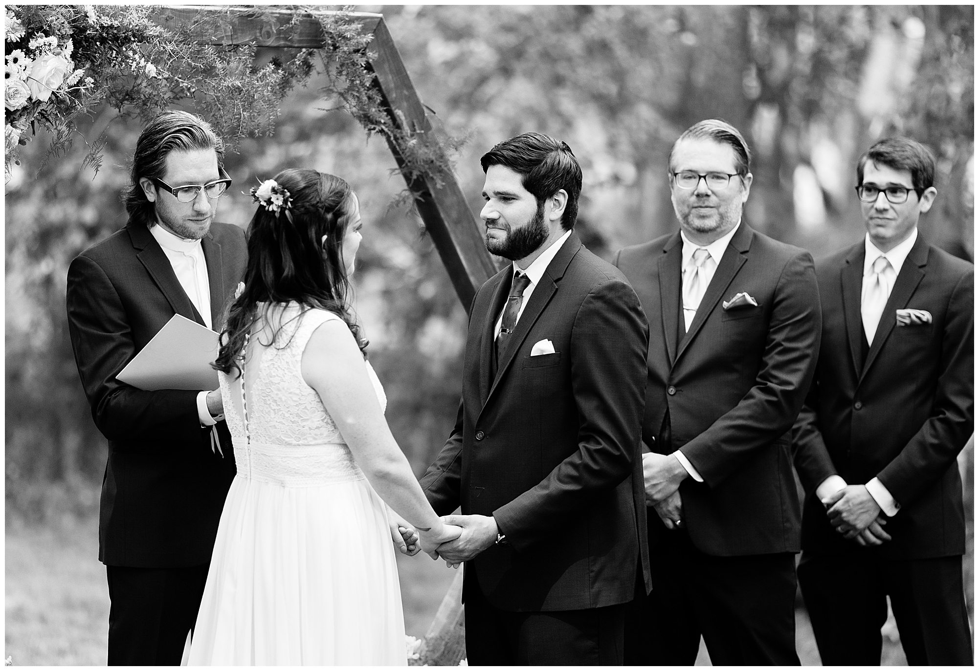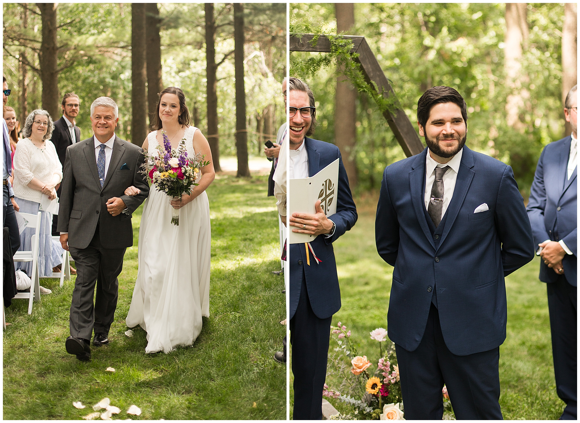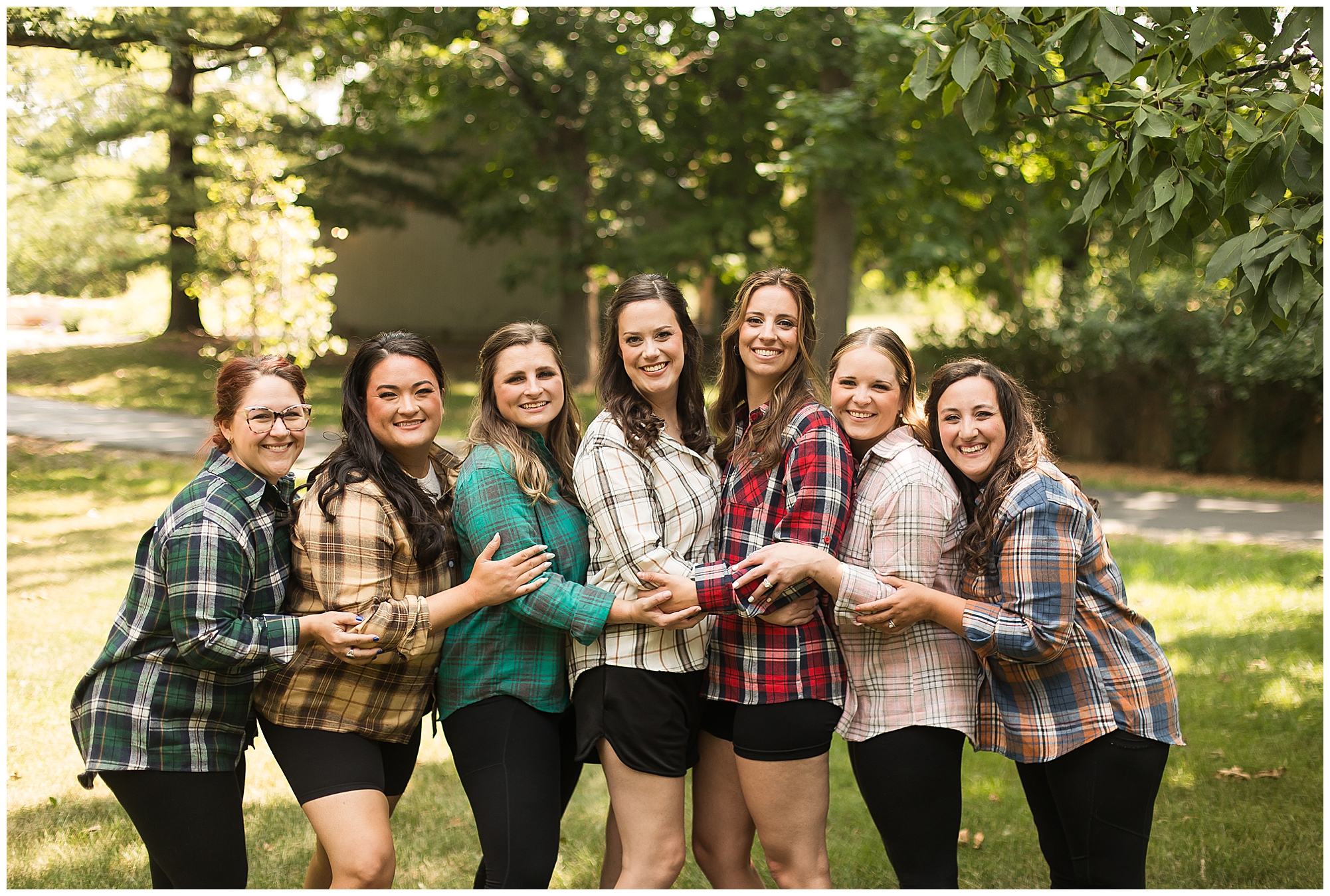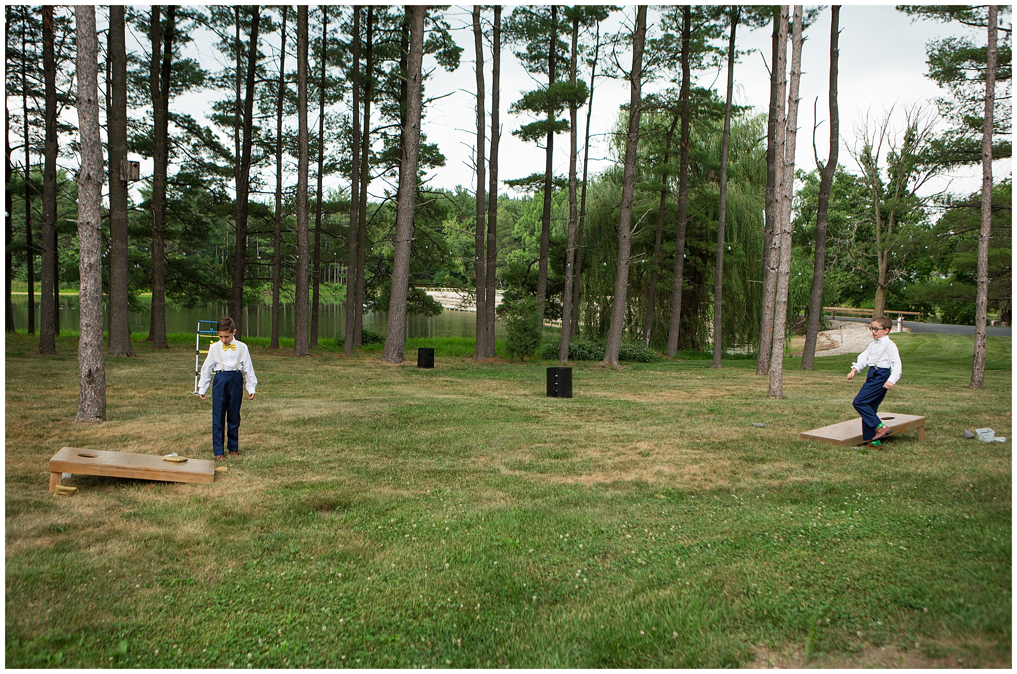 I knew going into Caitlin and Jake’s summer wedding it was going to be a good one. During their engagement session, they showed me their laid back, ready for a fun time energy and I was absolutely down for it! So when their big day arrived at the gorgeous Whispering Woods venue in Harvard, Illinois, about an hour outside of Rockford and close to the Wisconsin boarder, I wasn’t surprised by the loving, supportive, and hilarious people they surrounded themselves with. From their welcoming families and incredible bridal party, I already felt the love and was ready to capture it all for this adorable couple. Caitlin was calm and cool when I met up with her in one of the cabins on the venue’s property. She was taking in all the small moments with her bridesmaids, mom, and friends. She was going for a classic, simple, wedding infused with some of their favorite “Nerd Stuff” (Caitlin’s words, not mine). See, Caitlin and Jake are huge Star Wars fans, as well as other popular franchises, and they peppered them throughout their wedding day. The many nephews and nieces sported Pikachu, Fortnite, and Star Wars bowties and hair bows, while Jake even had a subtle Star Wars pattern in his tie. Plus the groomsmen were gifted themed socks and cufflinks. How fun!