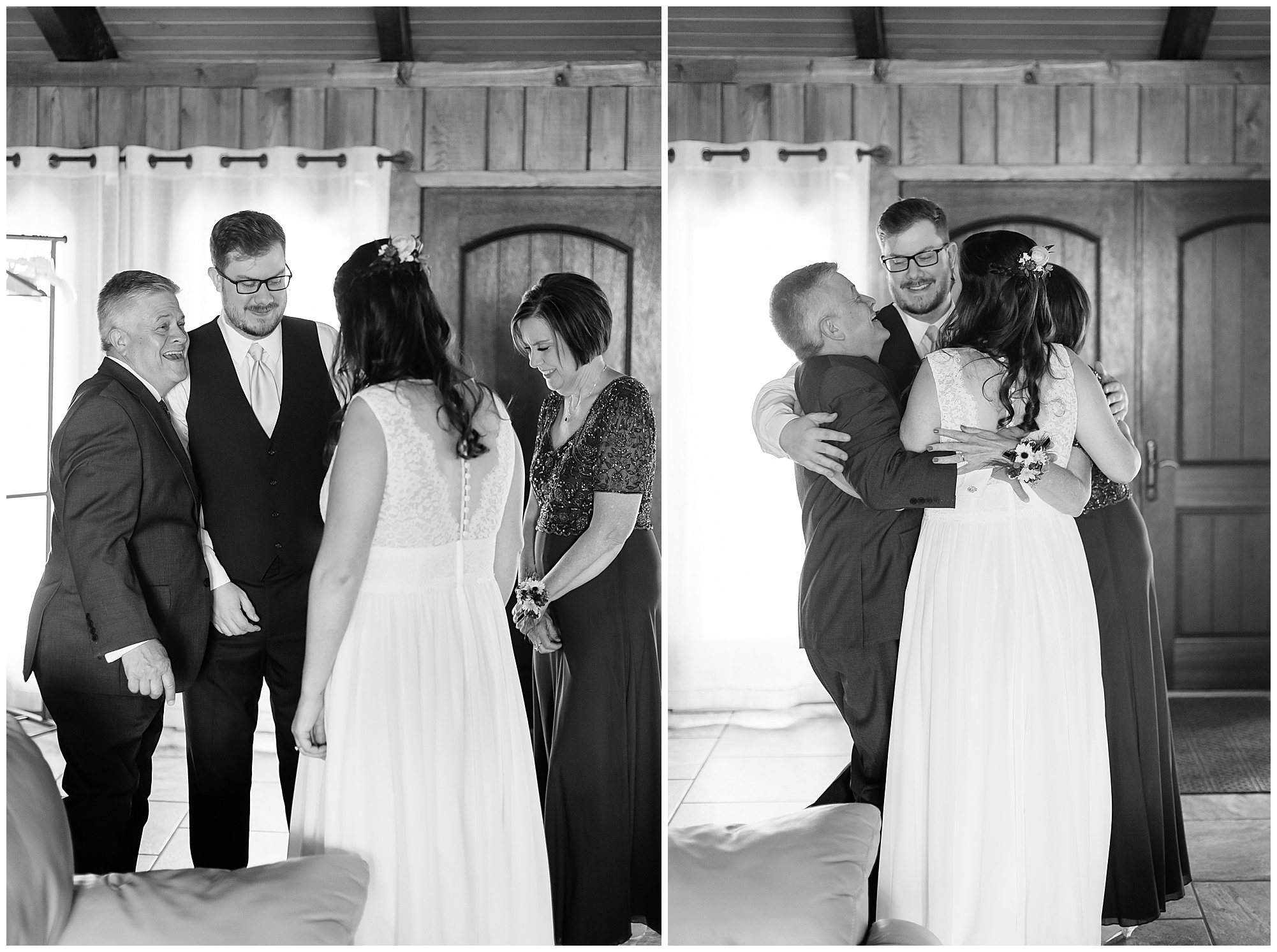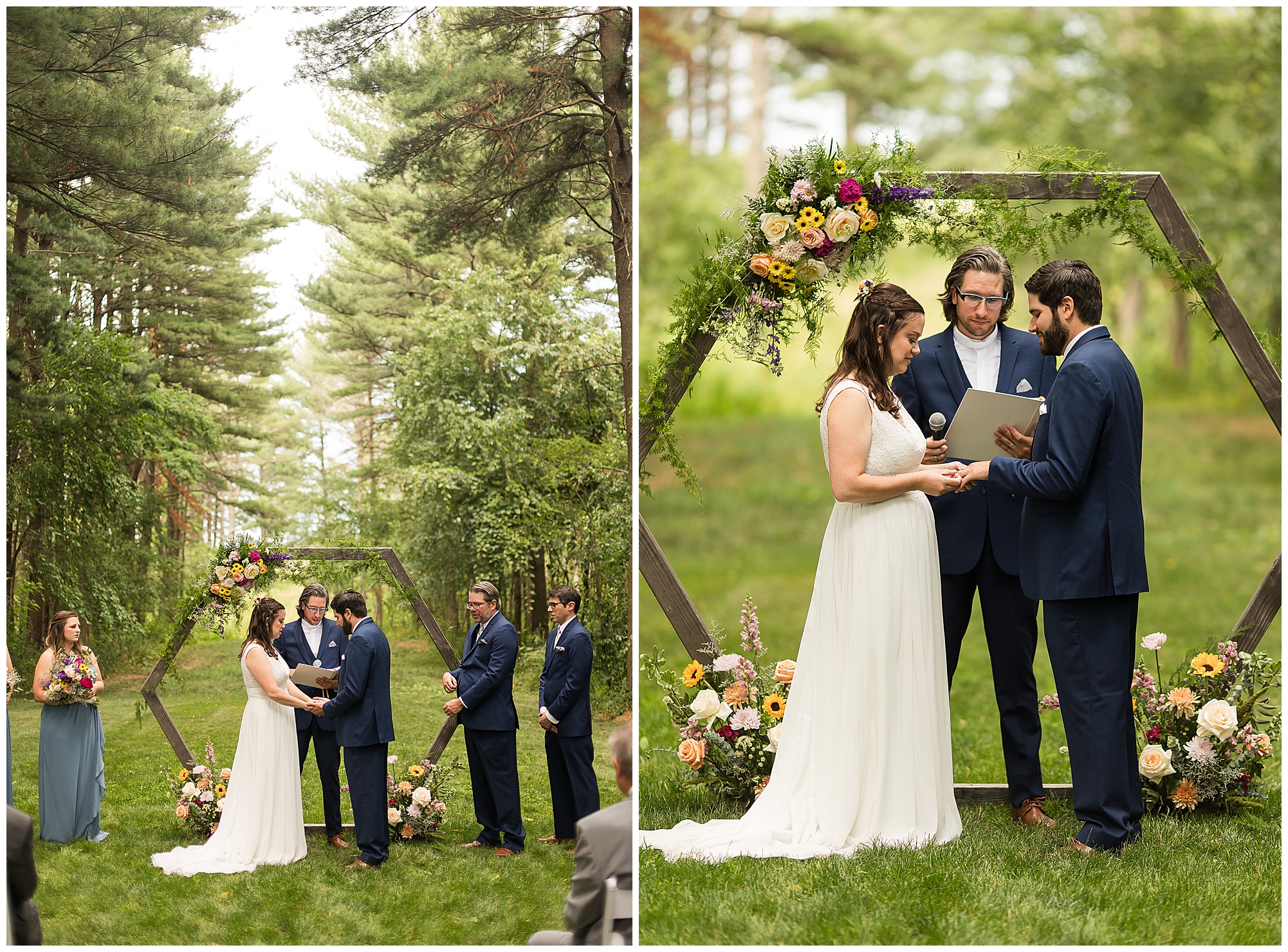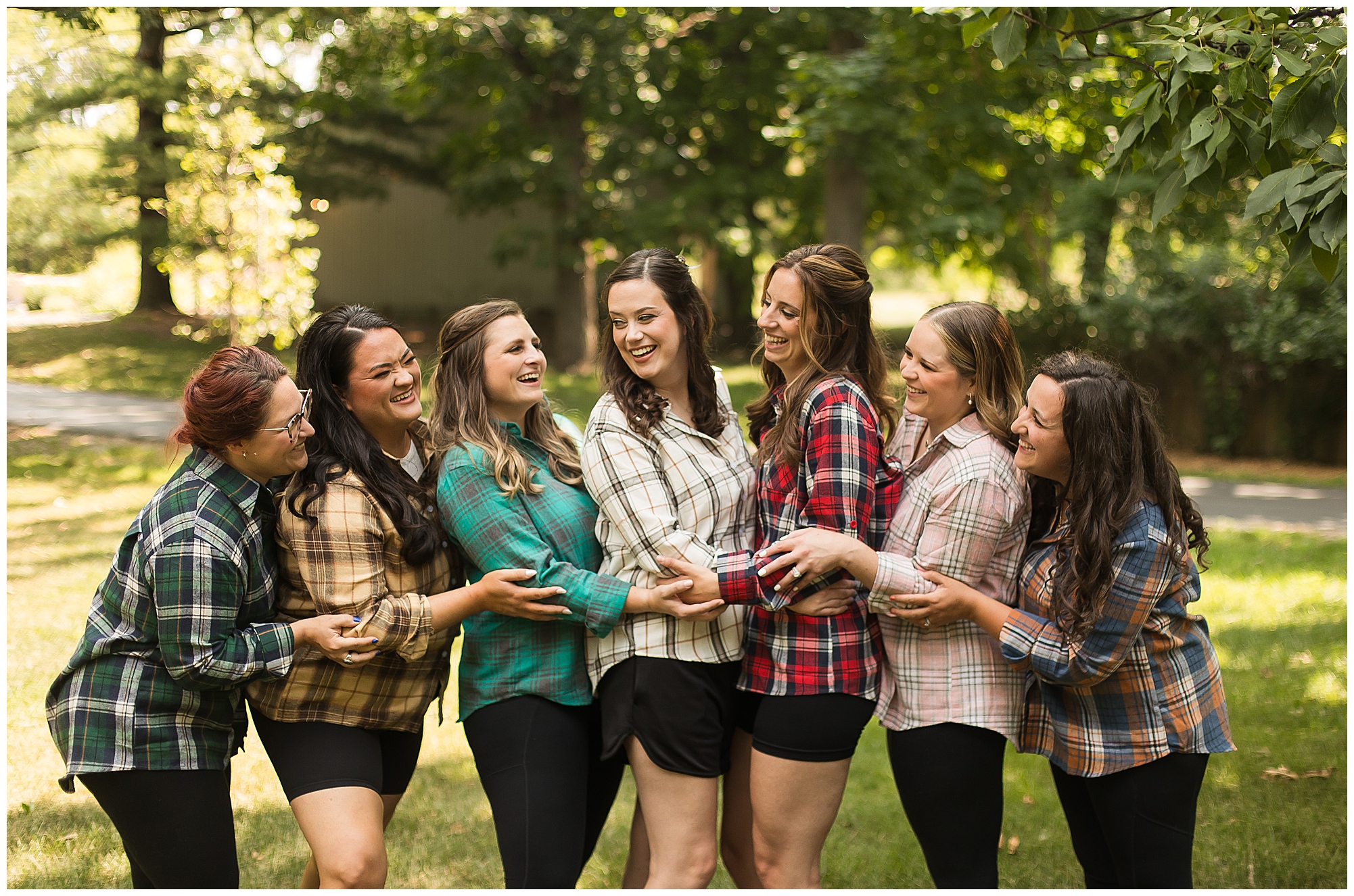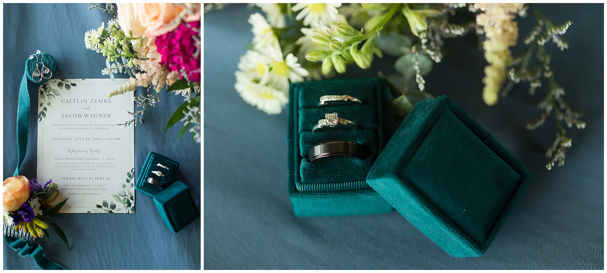 I knew going into Caitlin and Jake’s summer wedding it was going to be a good one. During their engagement session, they showed me their laid back, ready for a fun time energy and I was absolutely down for it! So when their big day arrived at the gorgeous Whispering Woods venue in Harvard, Illinois, about an hour outside of Rockford and close to the Wisconsin boarder, I wasn’t surprised by the loving, supportive, and hilarious people they surrounded themselves with. From their welcoming families and incredible bridal party, I already felt the love and was ready to capture it all for this adorable couple. Caitlin was calm and cool when I met up with her in one of the cabins on the venue’s property. She was taking in all the small moments with her bridesmaids, mom, and friends. She was going for a classic, simple, wedding infused with some of their favorite “Nerd Stuff” (Caitlin’s words, not mine). See, Caitlin and Jake are huge Star Wars fans, as well as other popular franchises, and they peppered them throughout their wedding day. The many nephews and nieces sported Pikachu, Fortnite, and Star Wars bowties and hair bows, while Jake even had a subtle Star Wars pattern in his tie. Plus the groomsmen were gifted themed socks and cufflinks. How fun!