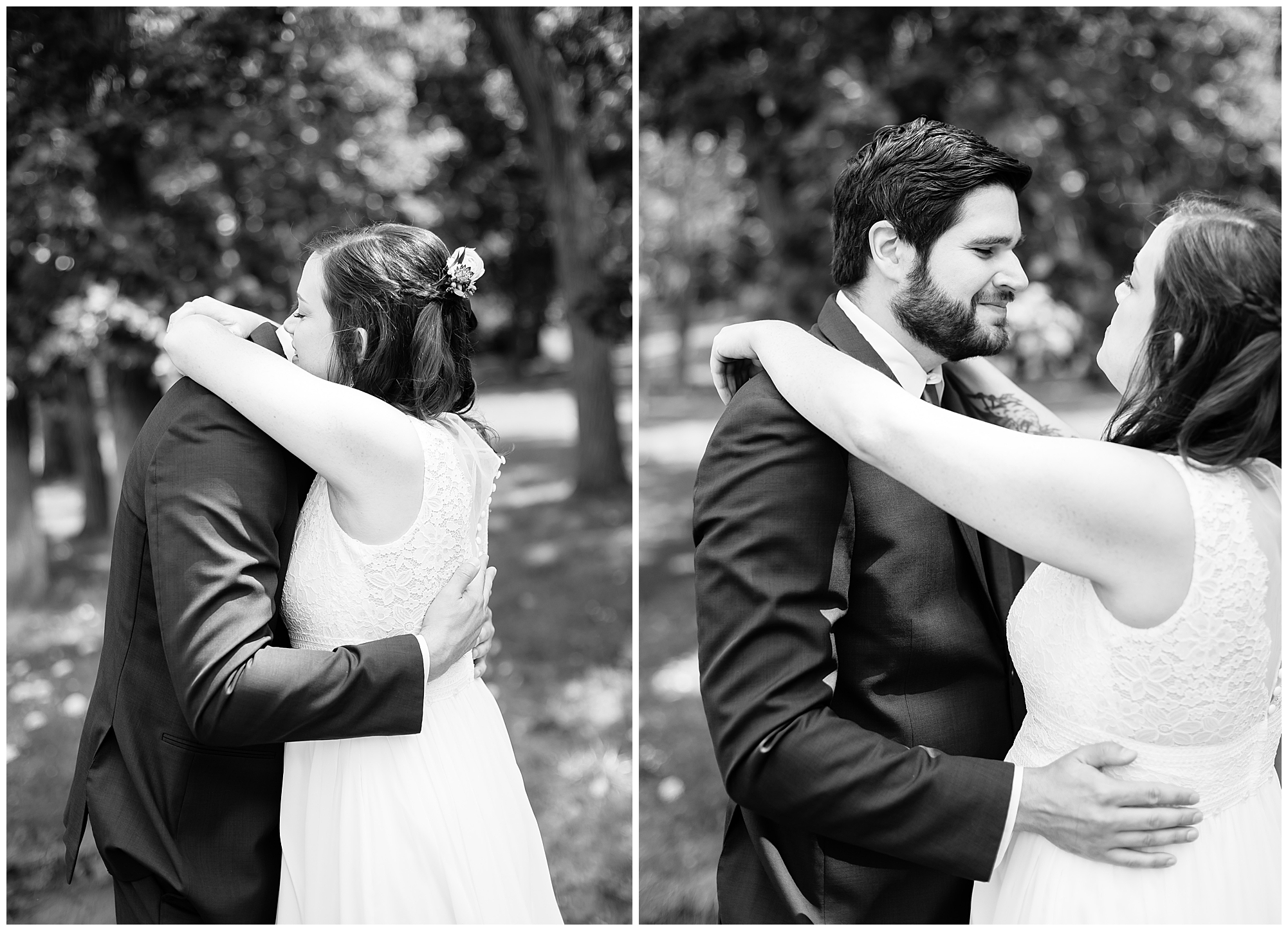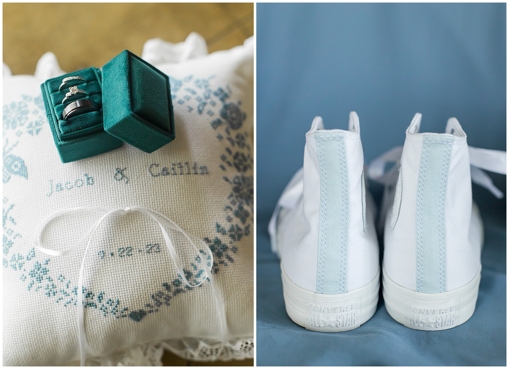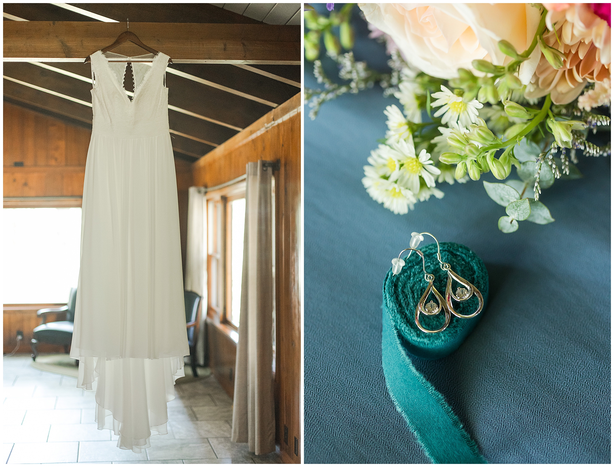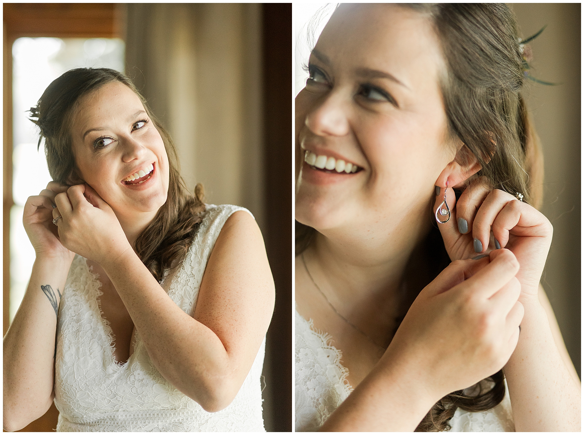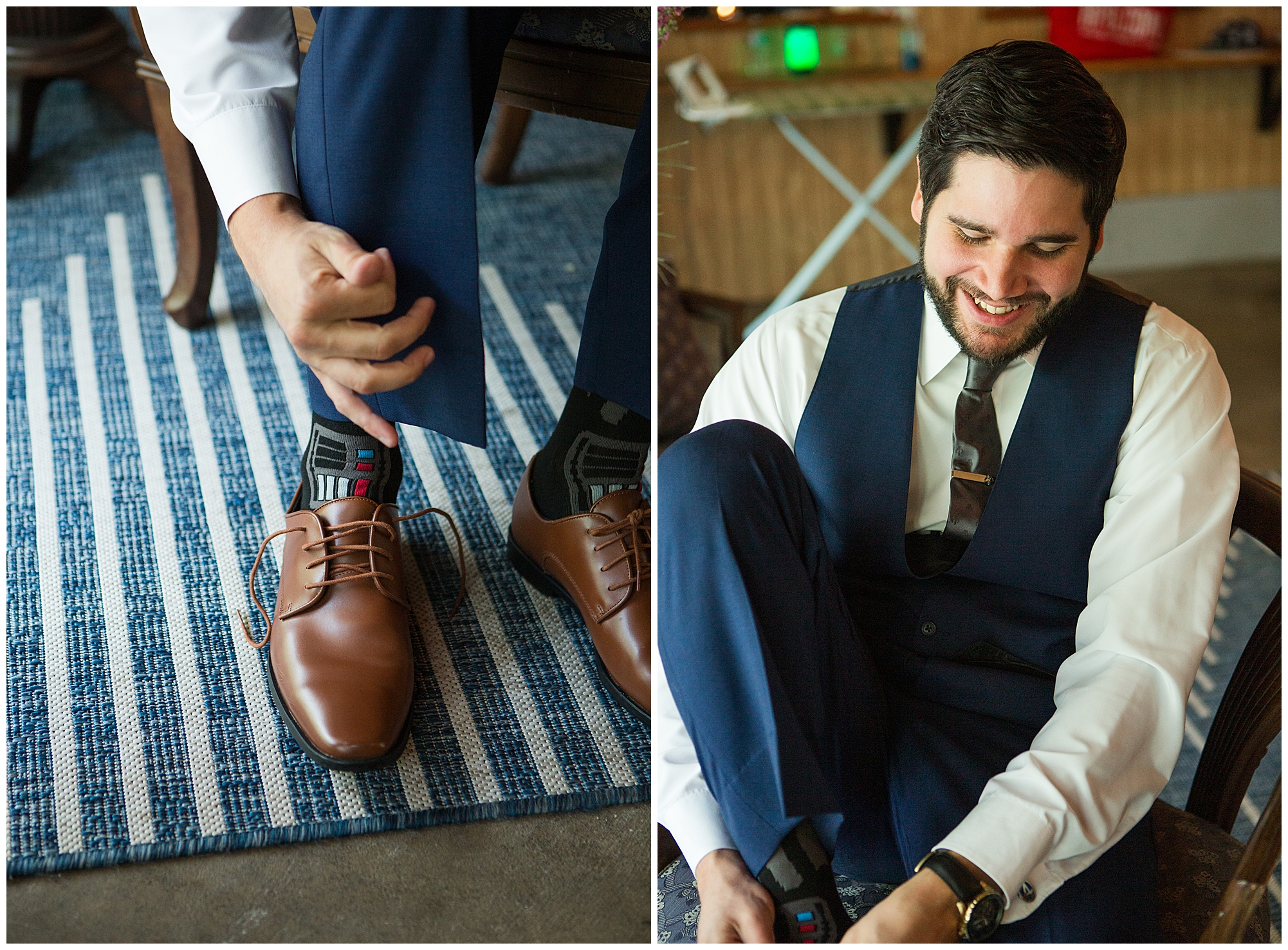 I knew going into Caitlin and Jake’s summer wedding it was going to be a good one. During their engagement session, they showed me their laid back, ready for a fun time energy and I was absolutely down for it! So when their big day arrived at the gorgeous Whispering Woods venue in Harvard, Illinois, about an hour outside of Rockford and close to the Wisconsin boarder, I wasn’t surprised by the loving, supportive, and hilarious people they surrounded themselves with. From their welcoming families and incredible bridal party, I already felt the love and was ready to capture it all for this adorable couple. Caitlin was calm and cool when I met up with her in one of the cabins on the venue’s property. She was taking in all the small moments with her bridesmaids, mom, and friends. She was going for a classic, simple, wedding infused with some of their favorite “Nerd Stuff” (Caitlin’s words, not mine). See, Caitlin and Jake are huge Star Wars fans, as well as other popular franchises, and they peppered them throughout their wedding day. The many nephews and nieces sported Pikachu, Fortnite, and Star Wars bowties and hair bows, while Jake even had a subtle Star Wars pattern in his tie. Plus the groomsmen were gifted themed socks and cufflinks. How fun!