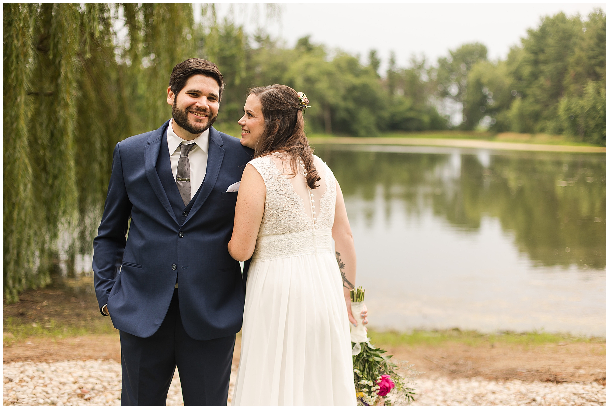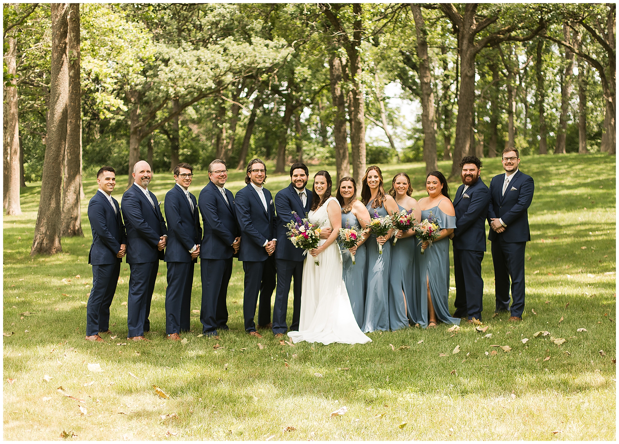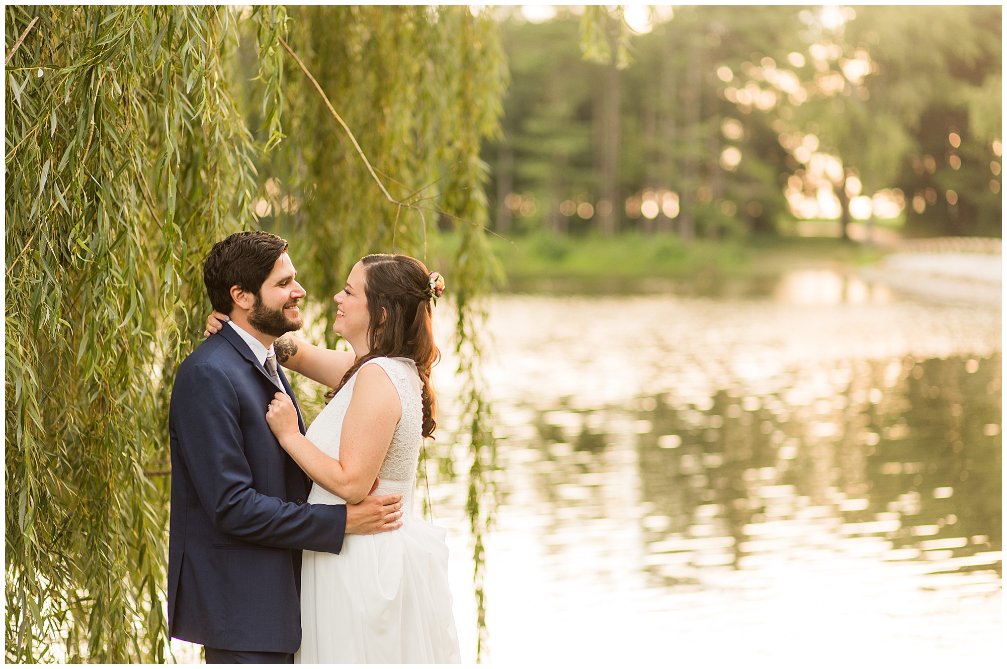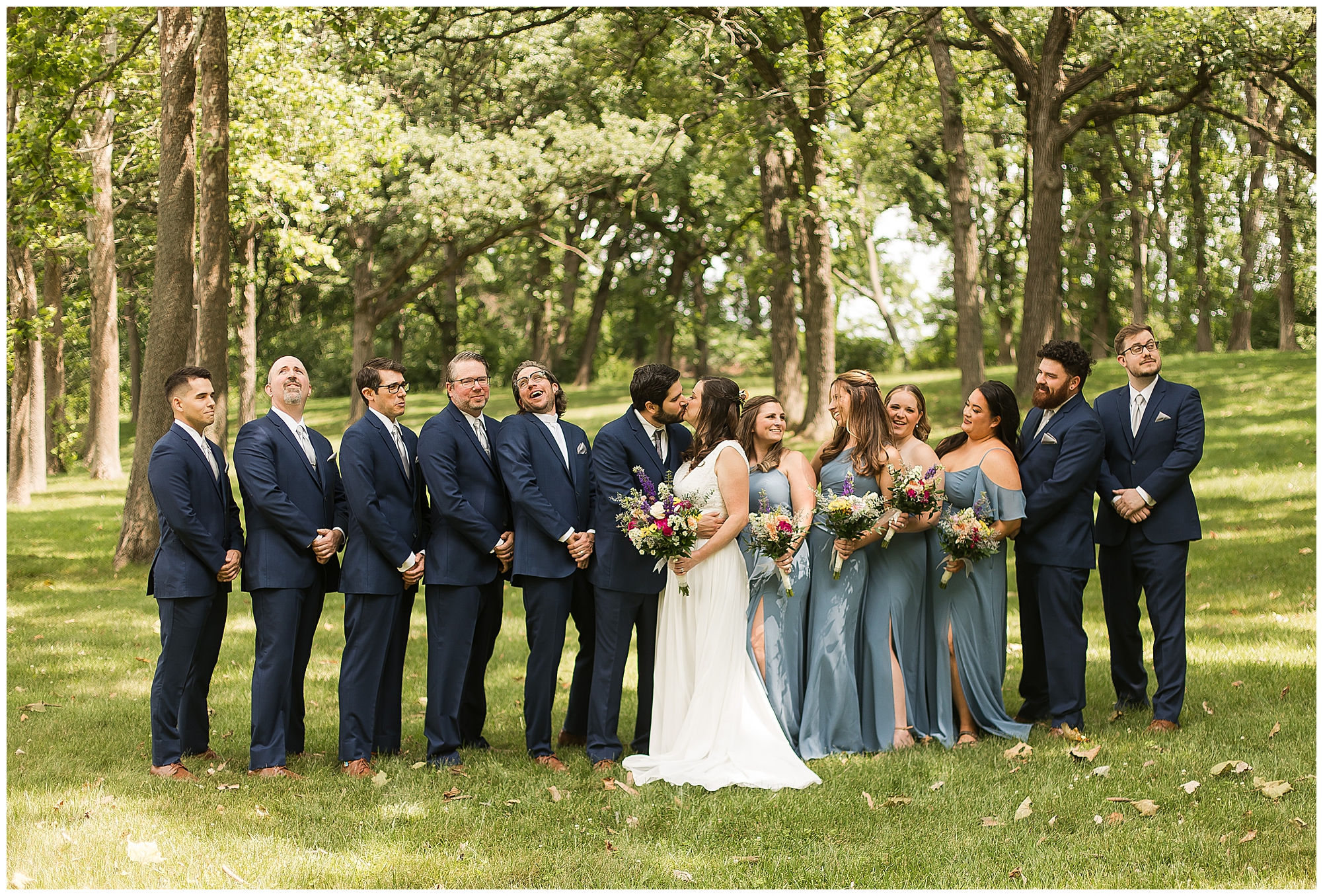 When it came time for Caitlin to get dressed she was absolutely beautiful in her lace bodice dress and flowy skirt! For another romantic touch, she added a floral headpiece with colorful and textured flowers. Her bridesmaids wore varying styled dresses in a dusty blue color that has quickly become one of my personal favorite colors. And before Jake and his groomsmen (made up of his brothers, Caitlin’s brother, and friends) all got dressed, he gifted them loud and bright Hawaiian shirts! Told you these guys were a blast! They did exchange out the crazy shirts for more formal navy suits for the big event. Caitlin and Jake decided to see one another prior to the ceremony. Their first look was sweet and lovely, just like this awesome couple! Then it was time to get the full bridal party together. They all looked incredible in their different shades of blue and the delightful bouquets Caitlin’s crew held. Before heading over to the ceremony spot, I stole the couple for a few more photos around the pond as well as an alluring willow tree. These two are meant to be together and it’s obvious! Now it’s time to get them married!