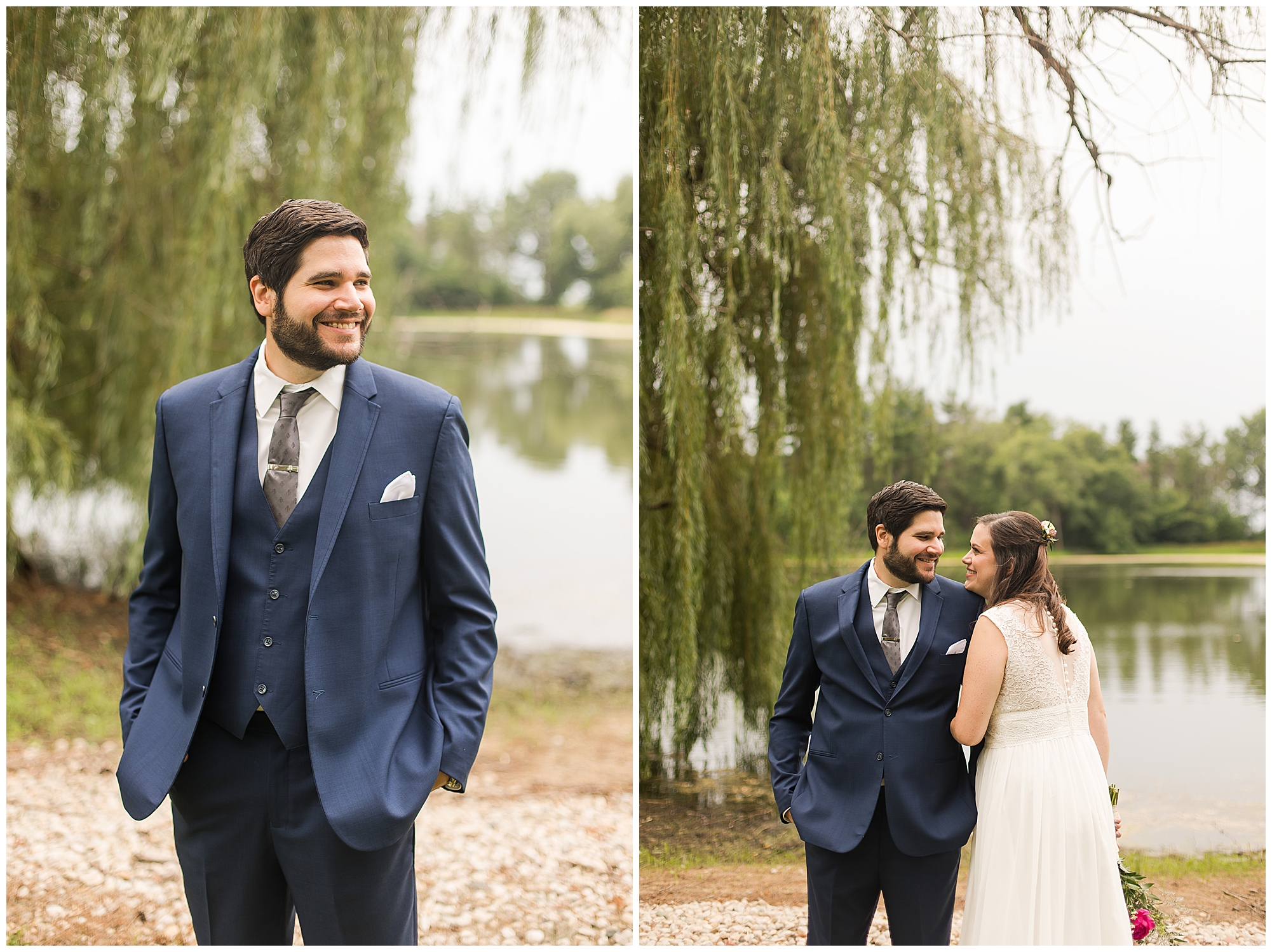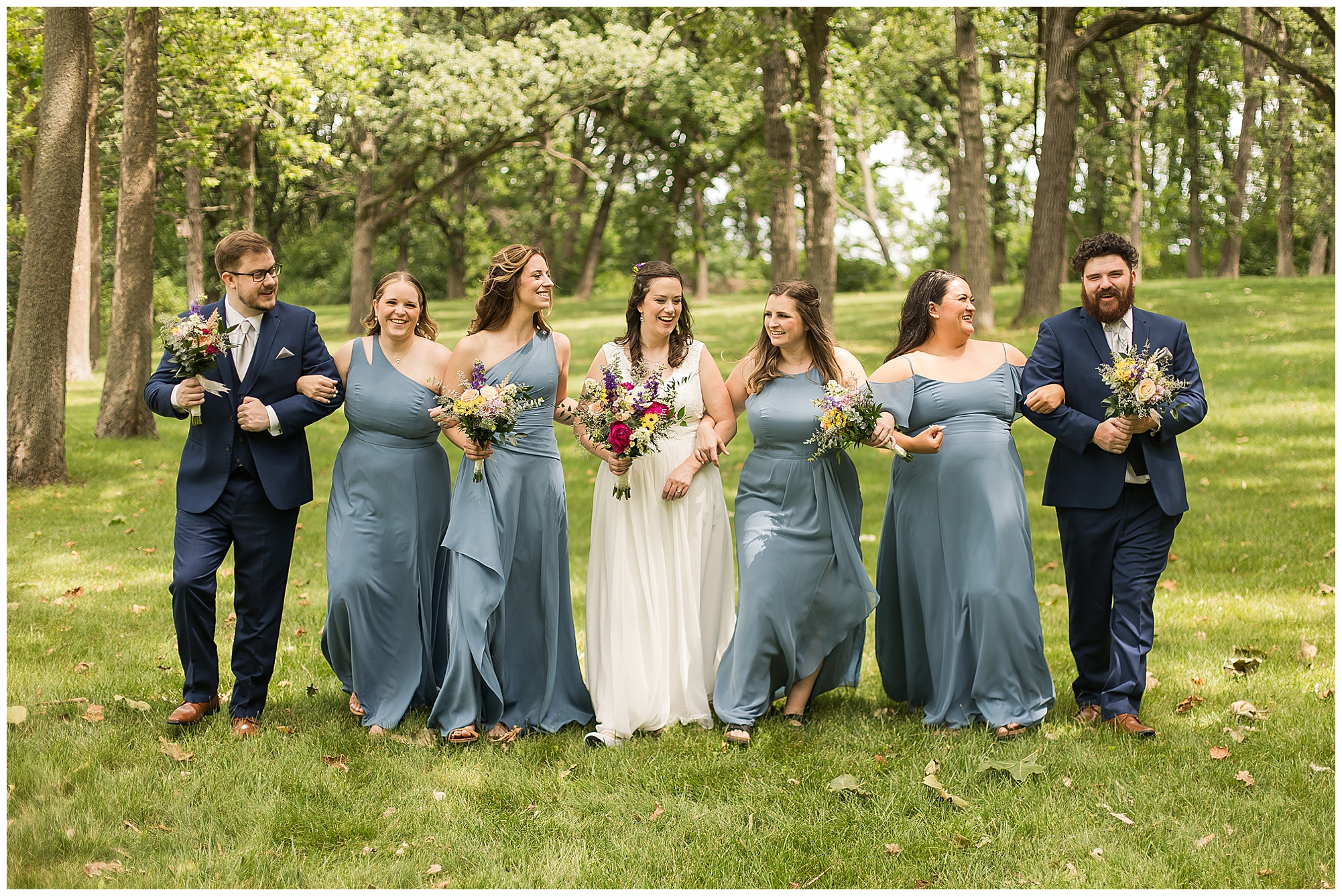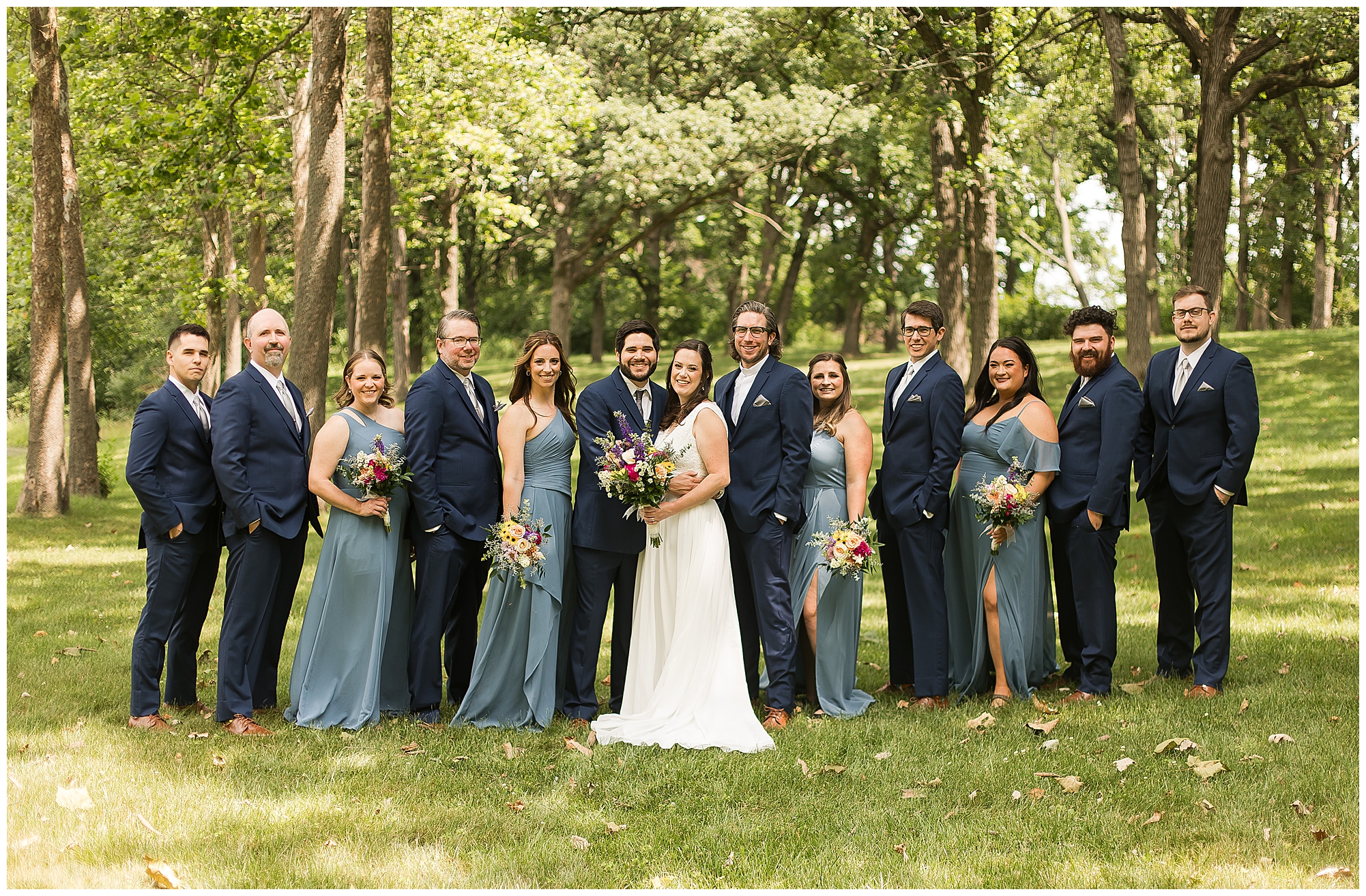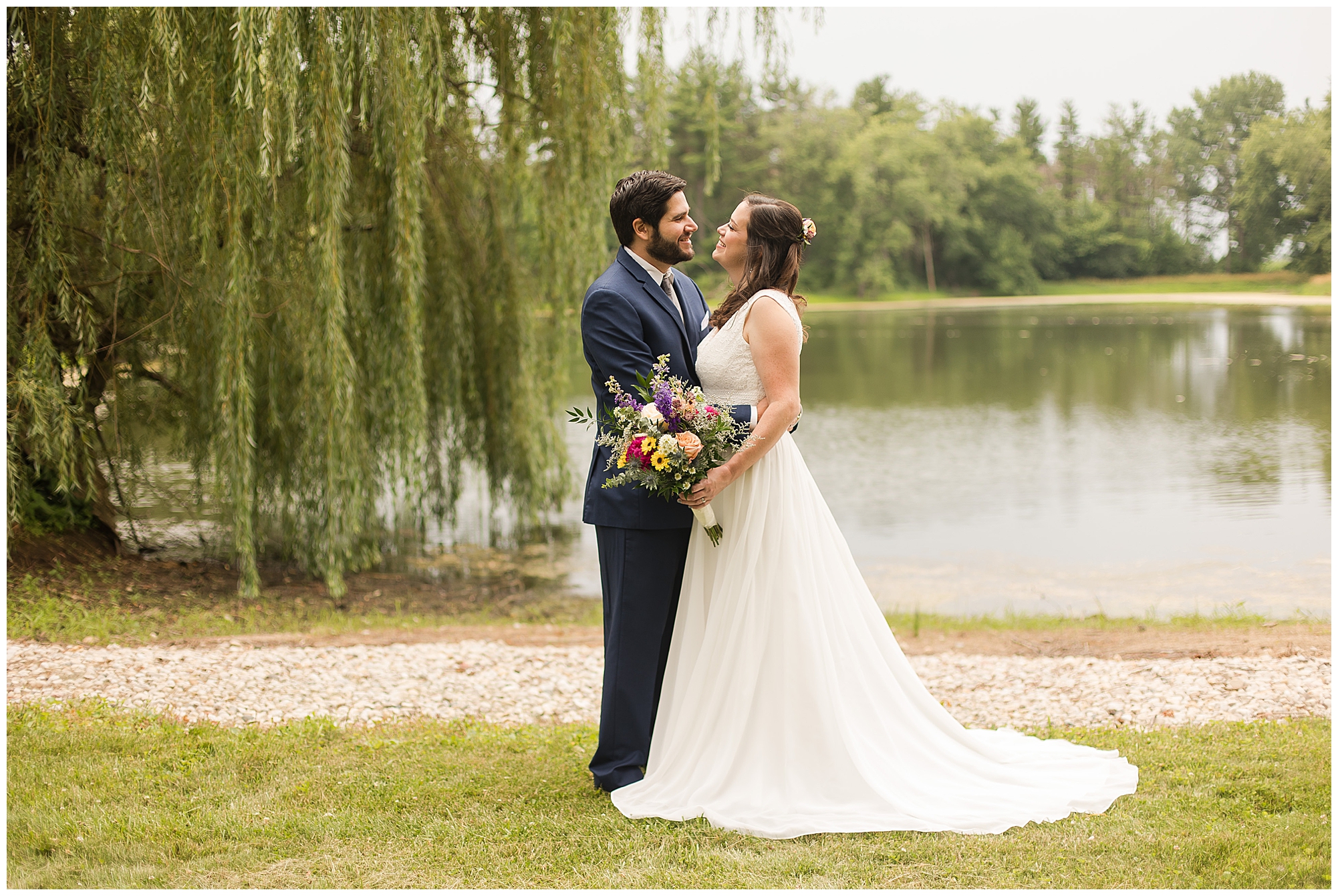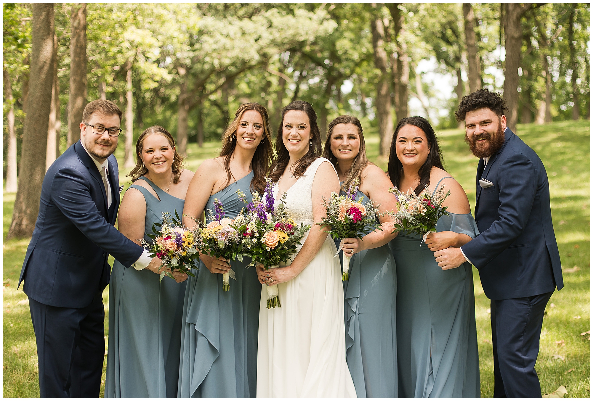 When it came time for Caitlin to get dressed she was absolutely beautiful in her lace bodice dress and flowy skirt! For another romantic touch, she added a floral headpiece with colorful and textured flowers. Her bridesmaids wore varying styled dresses in a dusty blue color that has quickly become one of my personal favorite colors. And before Jake and his groomsmen (made up of his brothers, Caitlin’s brother, and friends) all got dressed, he gifted them loud and bright Hawaiian shirts! Told you these guys were a blast! They did exchange out the crazy shirts for more formal navy suits for the big event. Caitlin and Jake decided to see one another prior to the ceremony. Their first look was sweet and lovely, just like this awesome couple! Then it was time to get the full bridal party together. They all looked incredible in their different shades of blue and the delightful bouquets Caitlin’s crew held. Before heading over to the ceremony spot, I stole the couple for a few more photos around the pond as well as an alluring willow tree. These two are meant to be together and it’s obvious! Now it’s time to get them married!