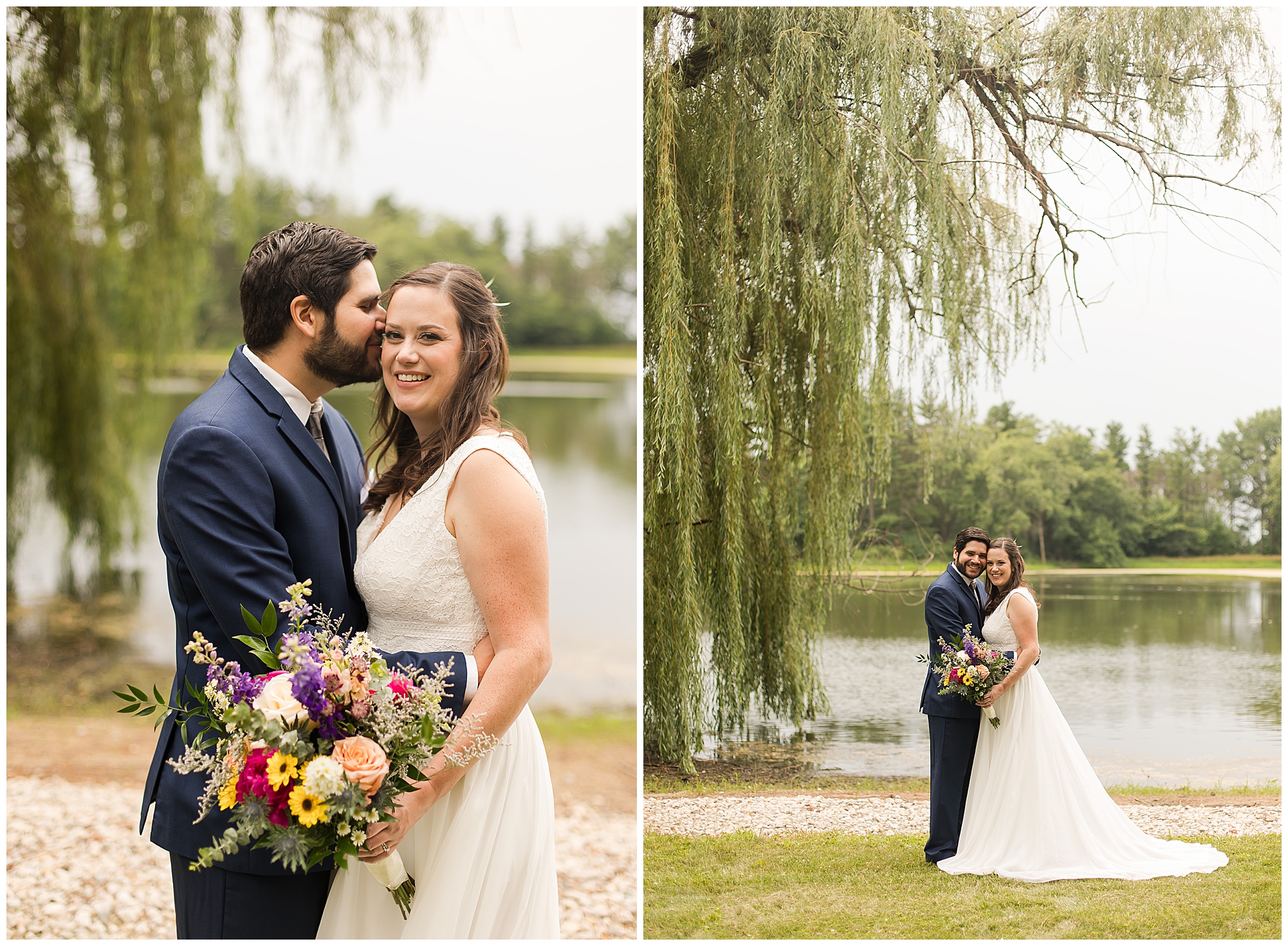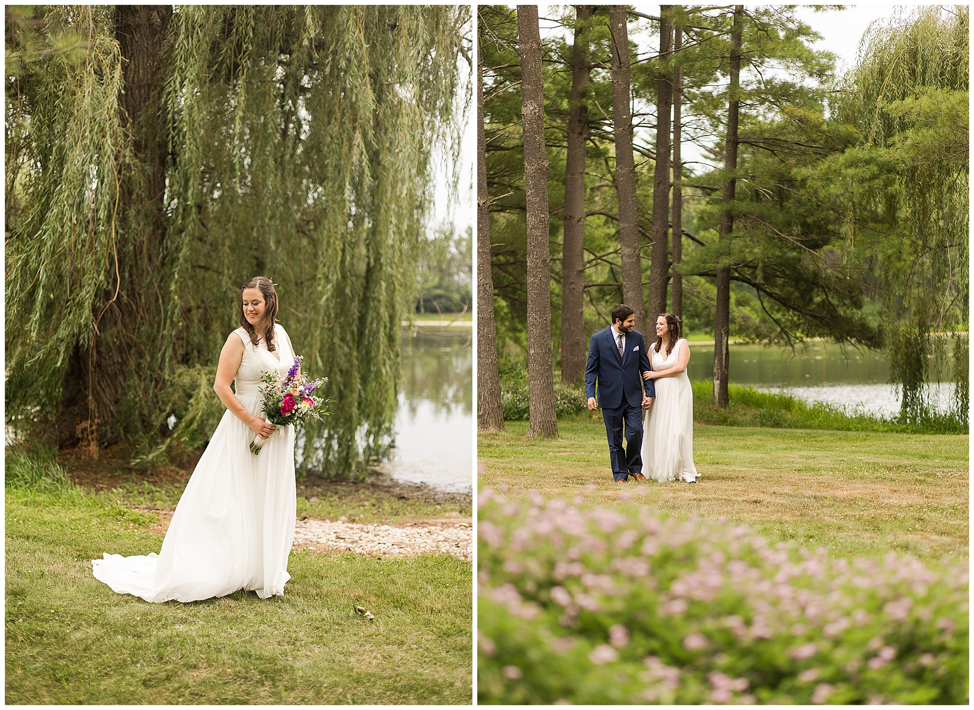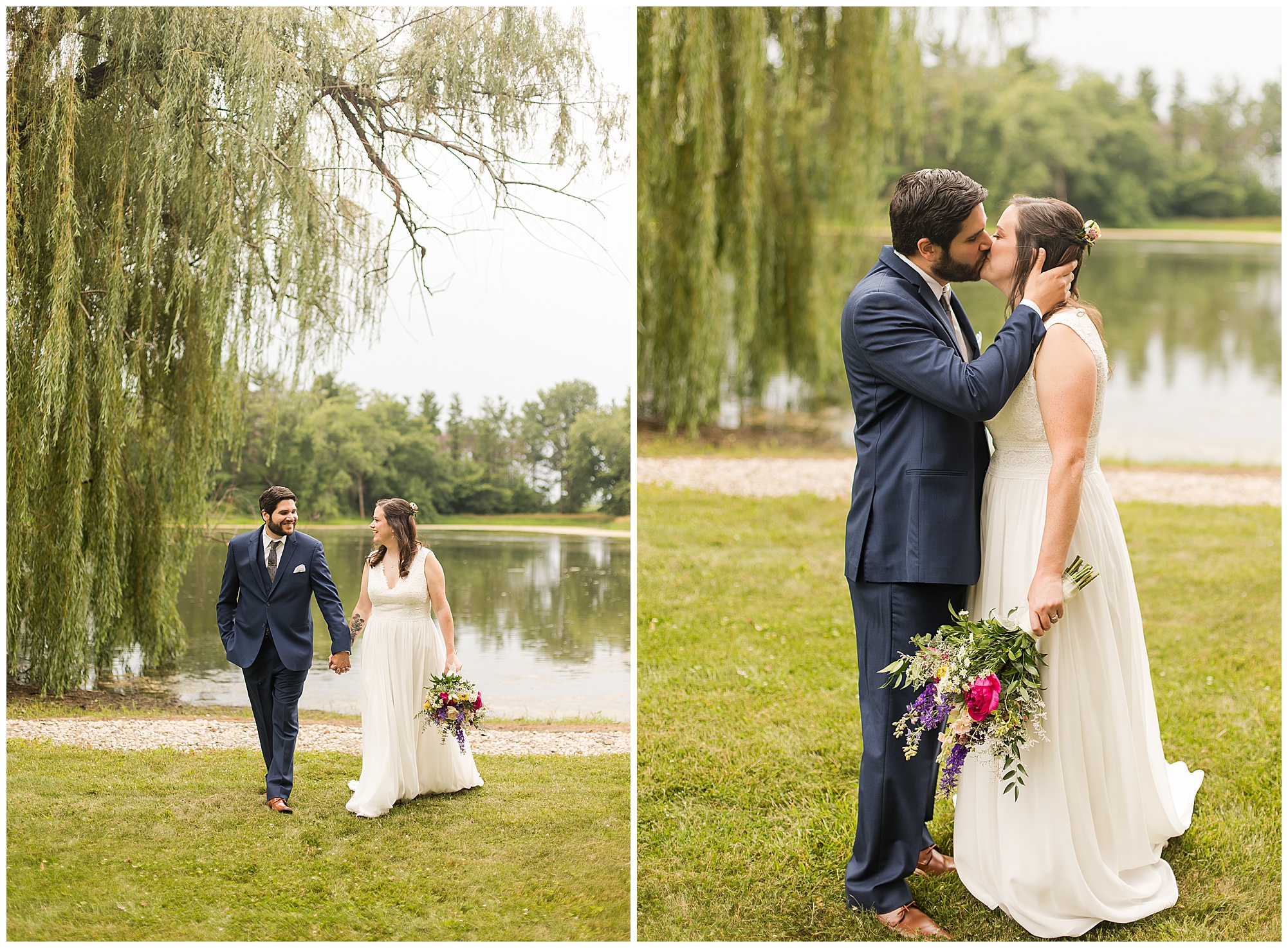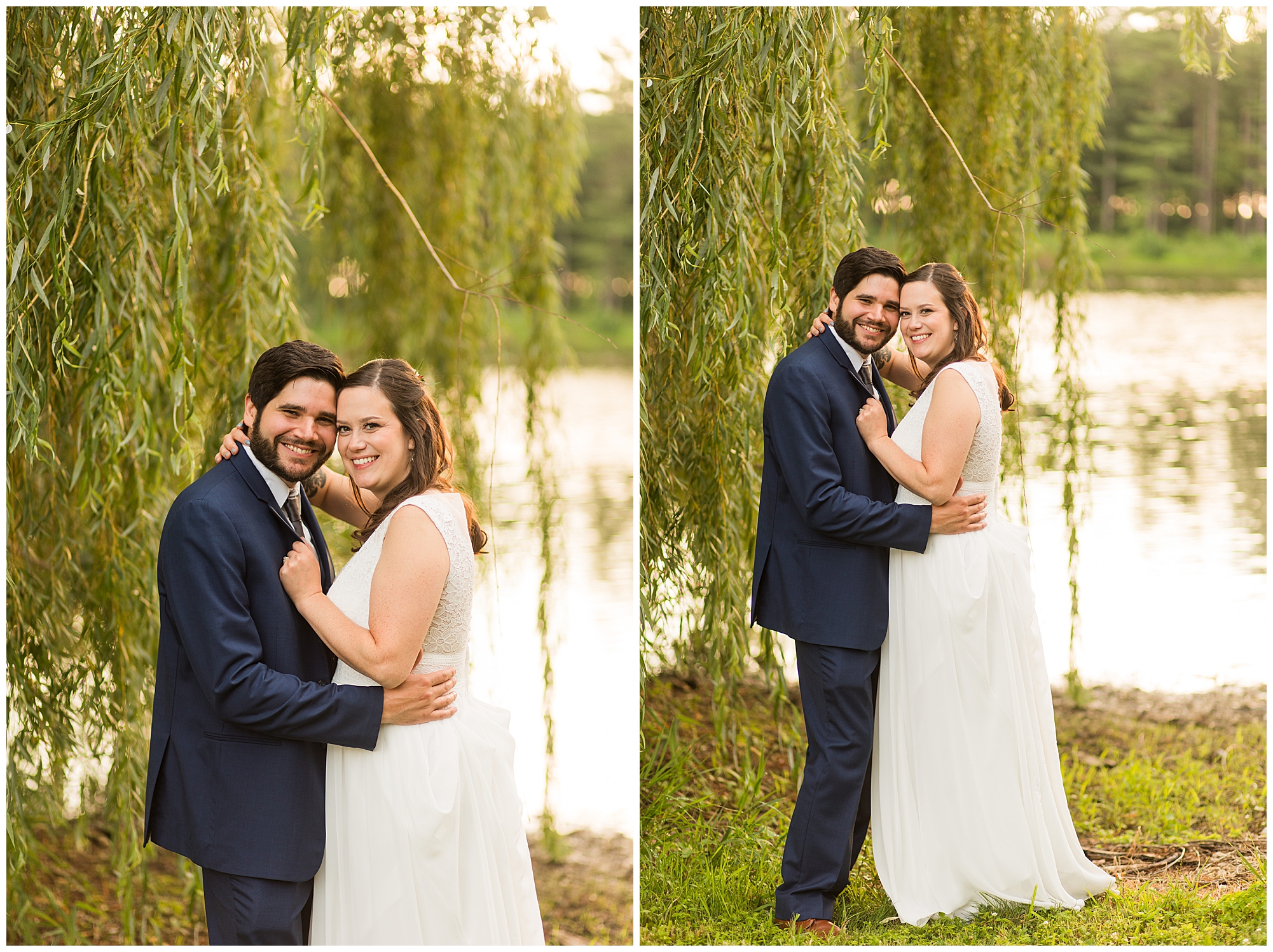 When it came time for Caitlin to get dressed she was absolutely beautiful in her lace bodice dress and flowy skirt! For another romantic touch, she added a floral headpiece with colorful and textured flowers. Her bridesmaids wore varying styled dresses in a dusty blue color that has quickly become one of my personal favorite colors. And before Jake and his groomsmen (made up of his brothers, Caitlin’s brother, and friends) all got dressed, he gifted them loud and bright Hawaiian shirts! Told you these guys were a blast! They did exchange out the crazy shirts for more formal navy suits for the big event. Caitlin and Jake decided to see one another prior to the ceremony. Their first look was sweet and lovely, just like this awesome couple! Then it was time to get the full bridal party together. They all looked incredible in their different shades of blue and the delightful bouquets Caitlin’s crew held. Before heading over to the ceremony spot, I stole the couple for a few more photos around the pond as well as an alluring willow tree. These two are meant to be together and it’s obvious! Now it’s time to get them married!