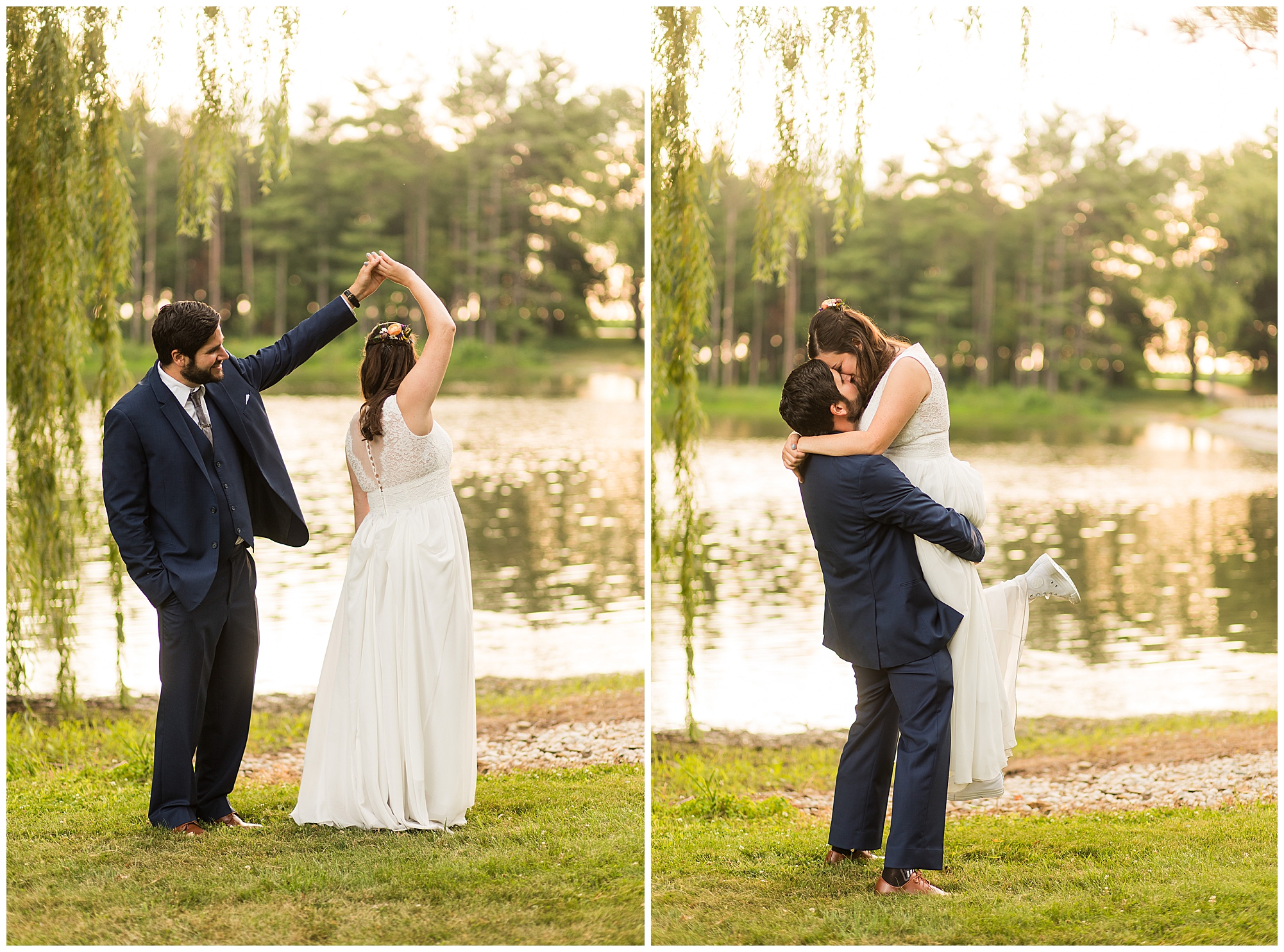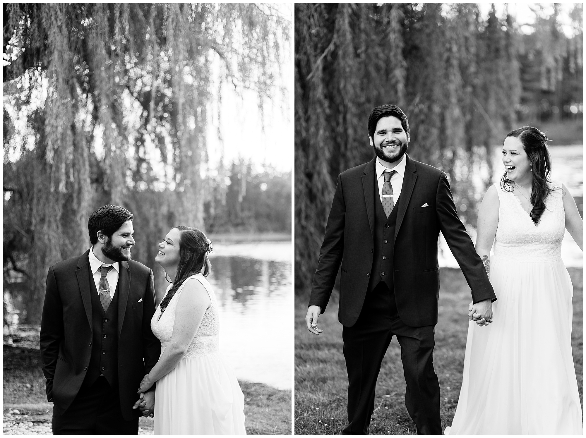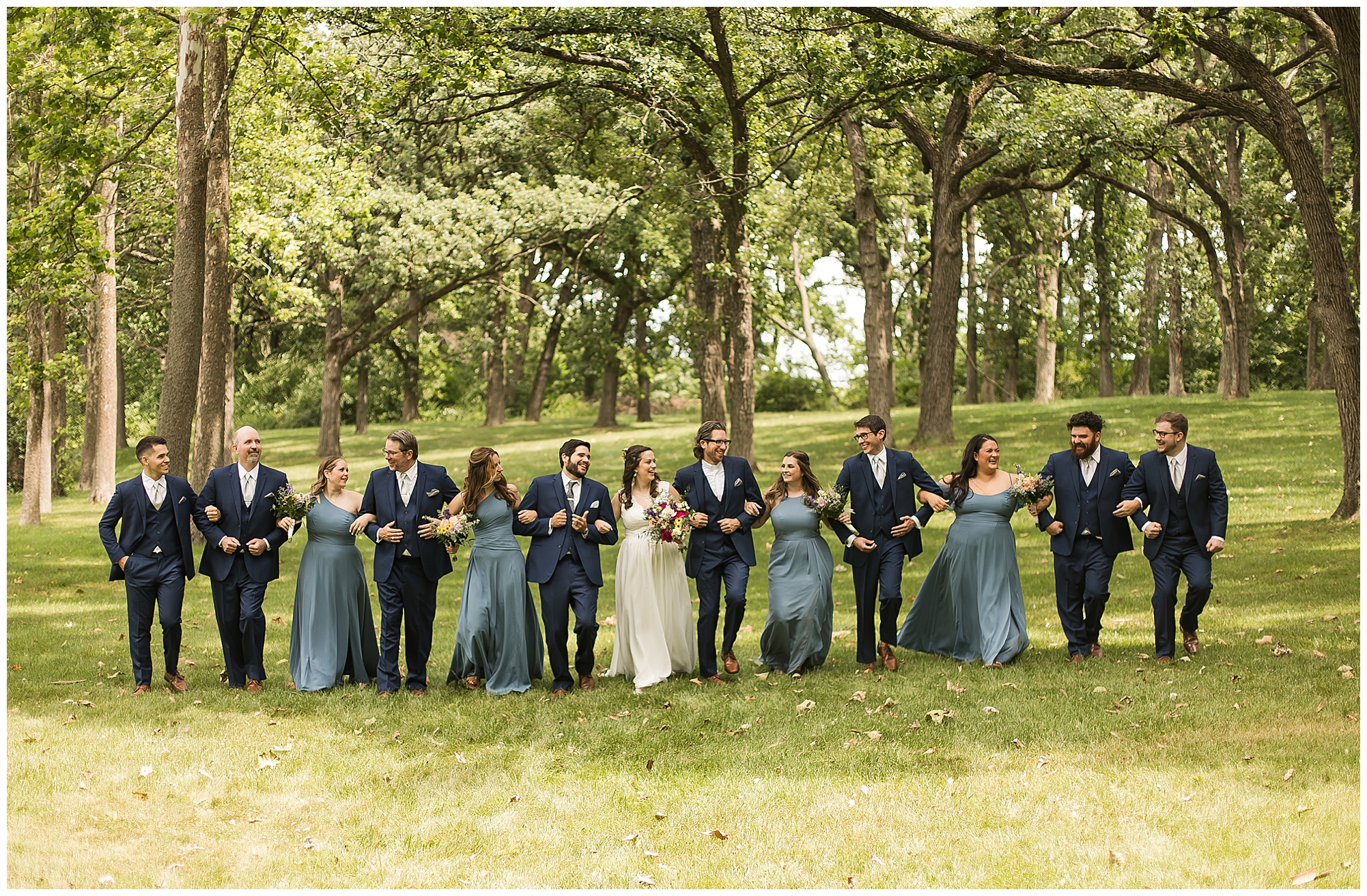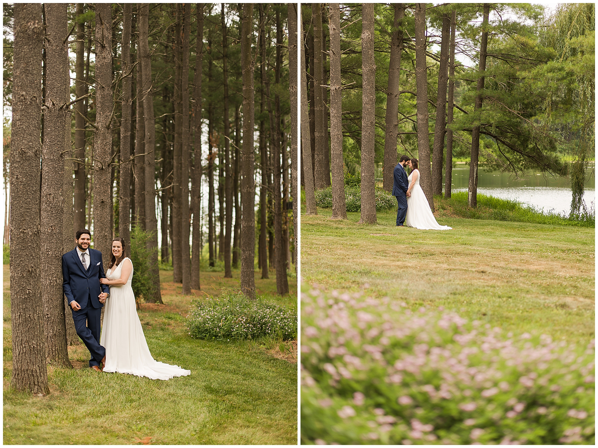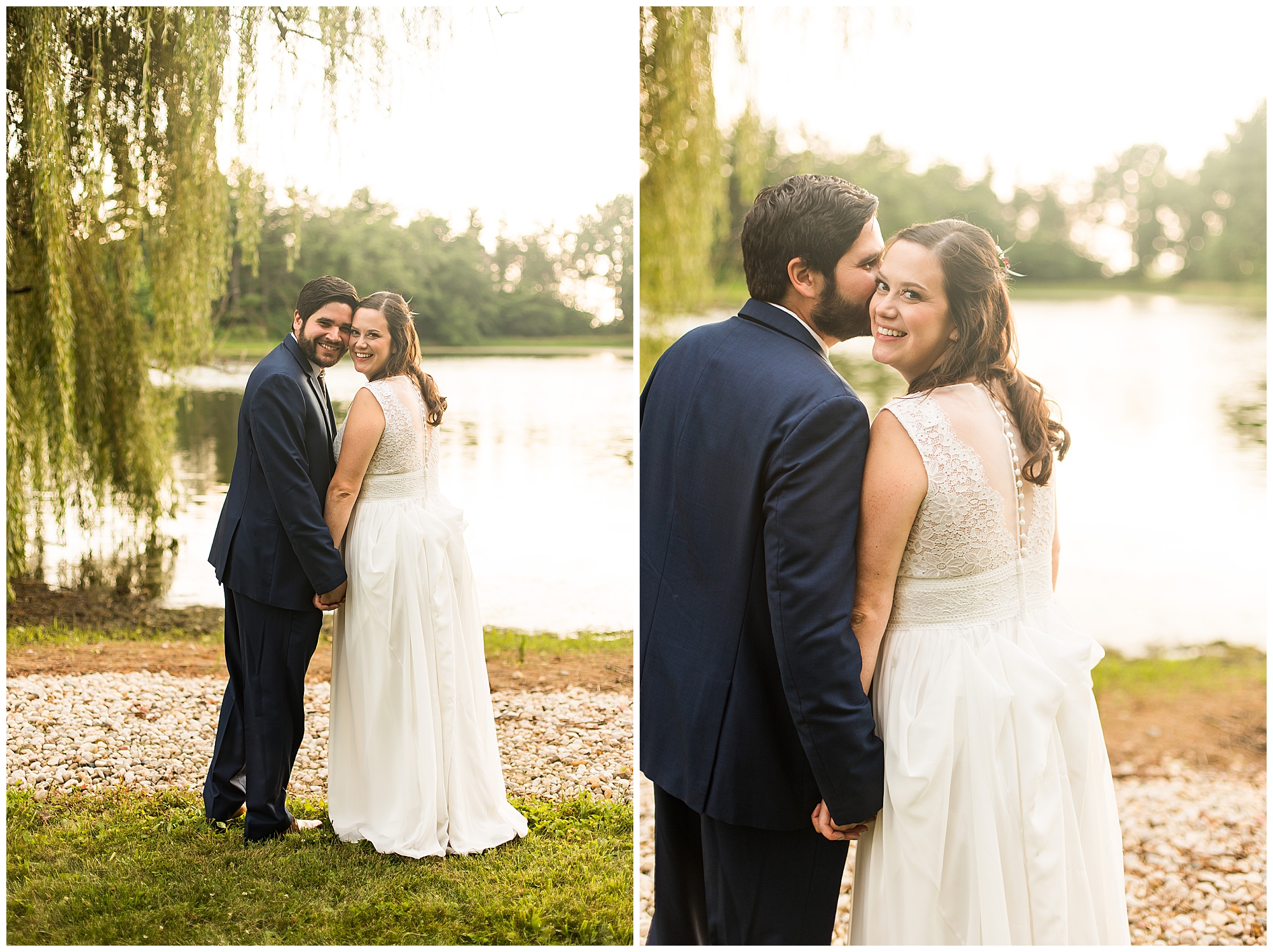 When it came time for Caitlin to get dressed she was absolutely beautiful in her lace bodice dress and flowy skirt! For another romantic touch, she added a floral headpiece with colorful and textured flowers. Her bridesmaids wore varying styled dresses in a dusty blue color that has quickly become one of my personal favorite colors. And before Jake and his groomsmen (made up of his brothers, Caitlin’s brother, and friends) all got dressed, he gifted them loud and bright Hawaiian shirts! Told you these guys were a blast! They did exchange out the crazy shirts for more formal navy suits for the big event. Caitlin and Jake decided to see one another prior to the ceremony. Their first look was sweet and lovely, just like this awesome couple! Then it was time to get the full bridal party together. They all looked incredible in their different shades of blue and the delightful bouquets Caitlin’s crew held. Before heading over to the ceremony spot, I stole the couple for a few more photos around the pond as well as an alluring willow tree. These two are meant to be together and it’s obvious! Now it’s time to get them married!