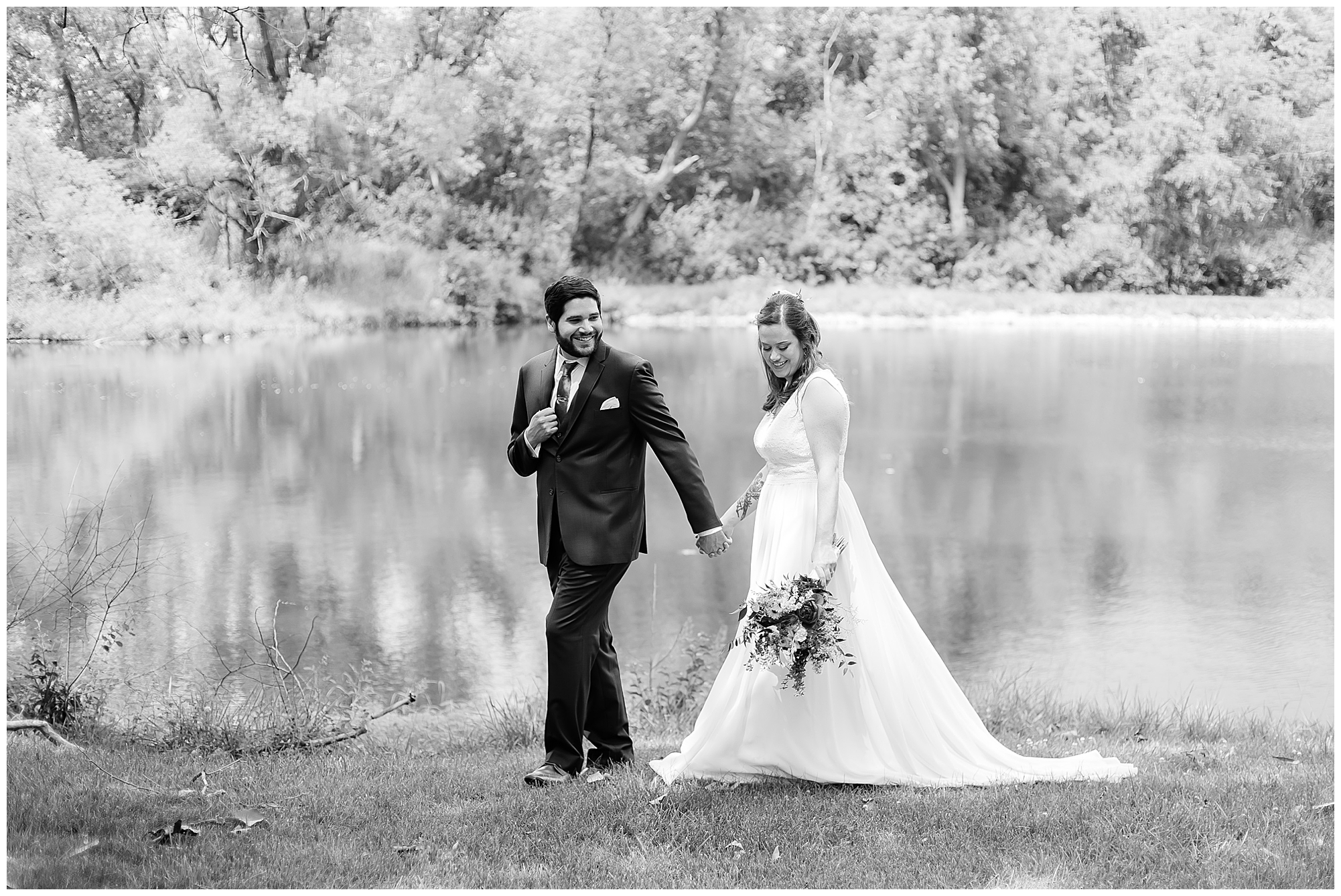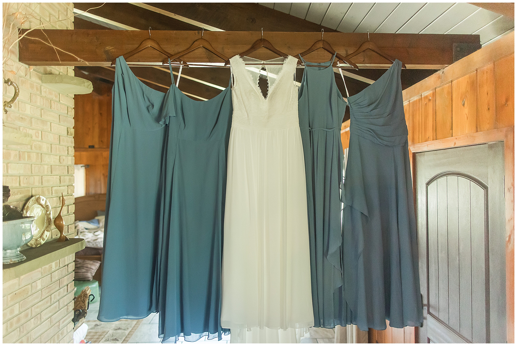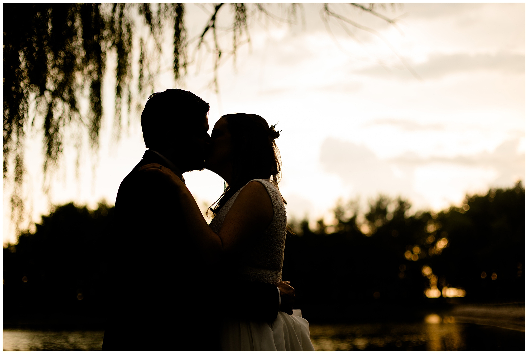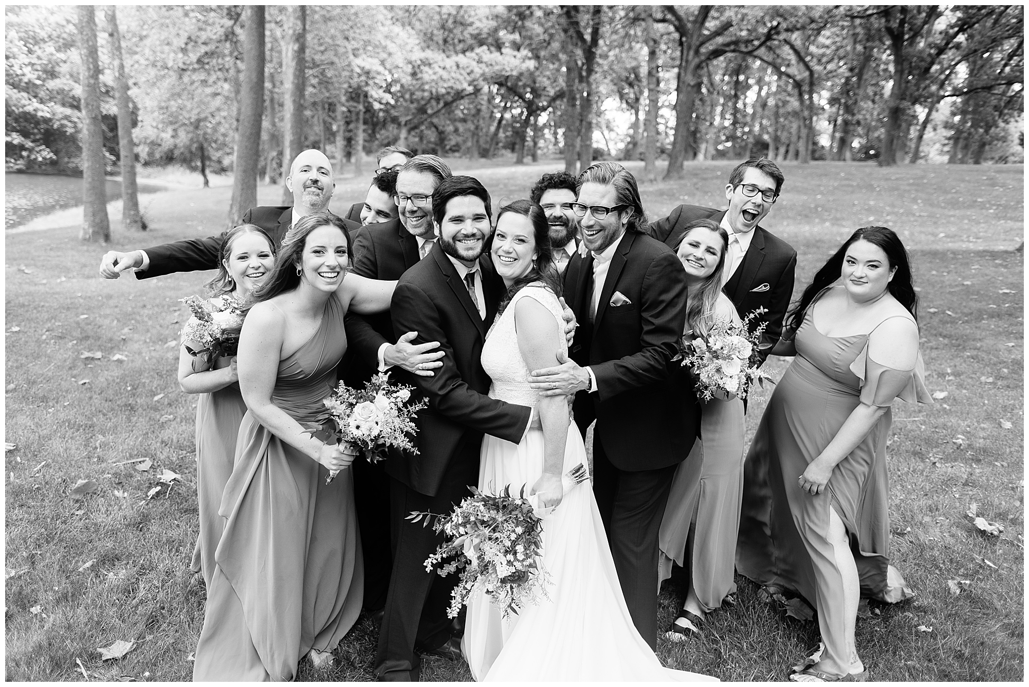 When it came time for Caitlin to get dressed she was absolutely beautiful in her lace bodice dress and flowy skirt! For another romantic touch, she added a floral headpiece with colorful and textured flowers. Her bridesmaids wore varying styled dresses in a dusty blue color that has quickly become one of my personal favorite colors. And before Jake and his groomsmen (made up of his brothers, Caitlin’s brother, and friends) all got dressed, he gifted them loud and bright Hawaiian shirts! Told you these guys were a blast! They did exchange out the crazy shirts for more formal navy suits for the big event. Caitlin and Jake decided to see one another prior to the ceremony. Their first look was sweet and lovely, just like this awesome couple! Then it was time to get the full bridal party together. They all looked incredible in their different shades of blue and the delightful bouquets Caitlin’s crew held. Before heading over to the ceremony spot, I stole the couple for a few more photos around the pond as well as an alluring willow tree. These two are meant to be together and it’s obvious! Now it’s time to get them married!