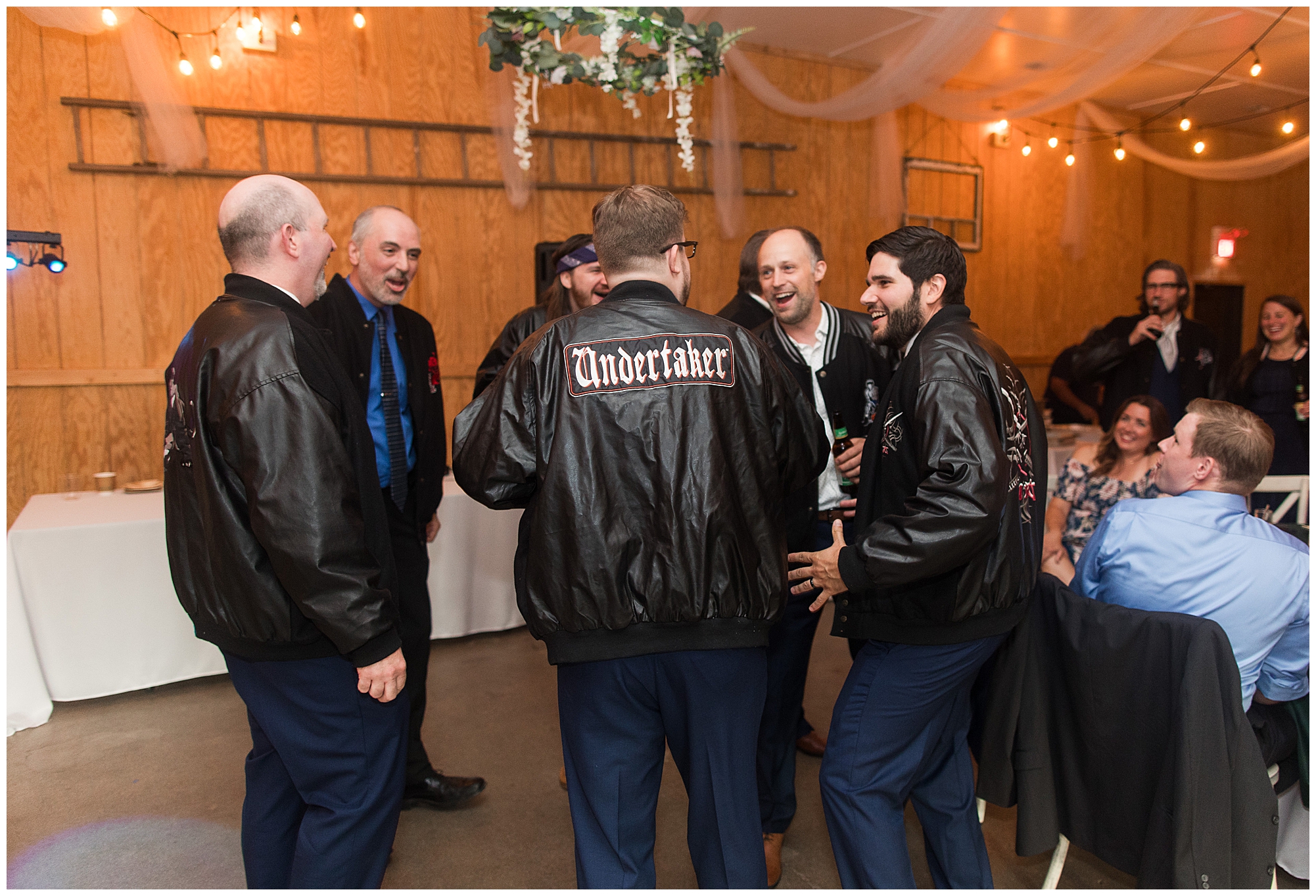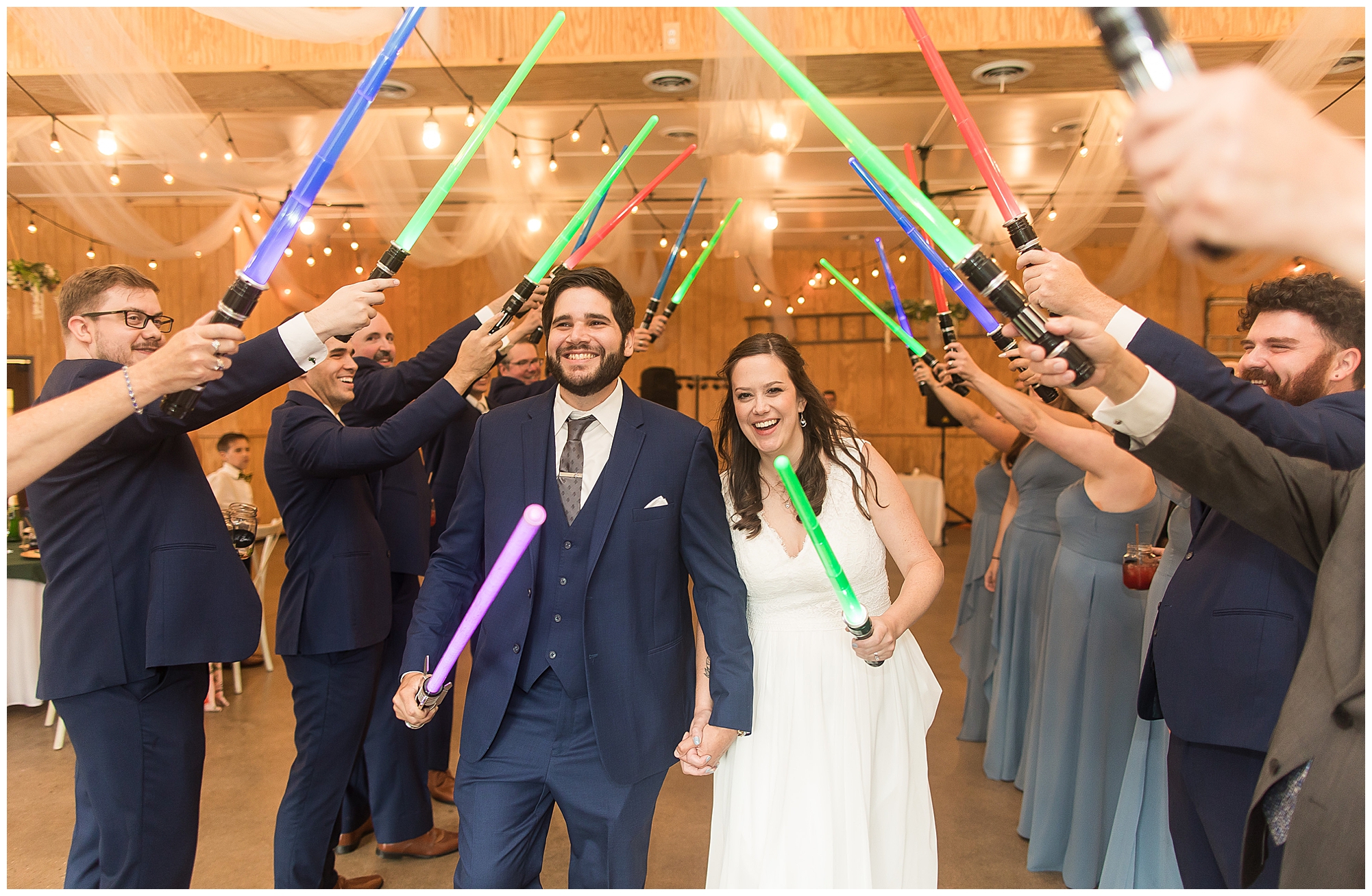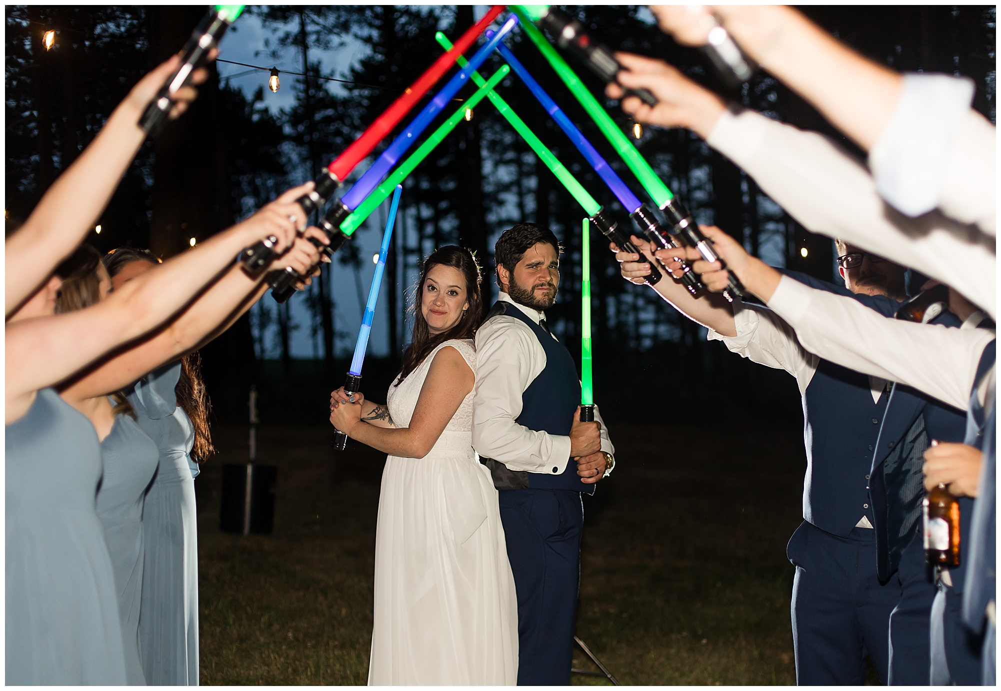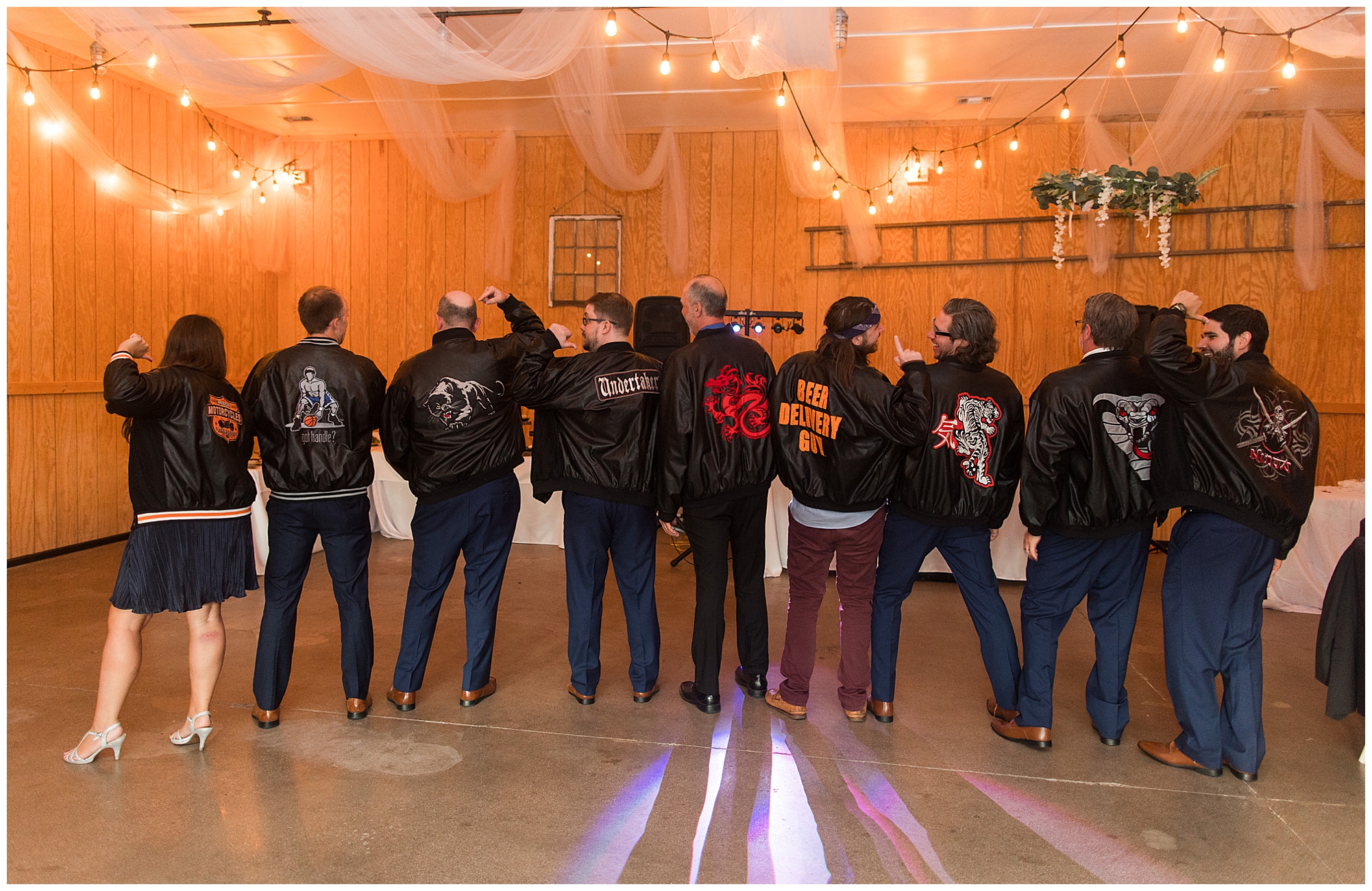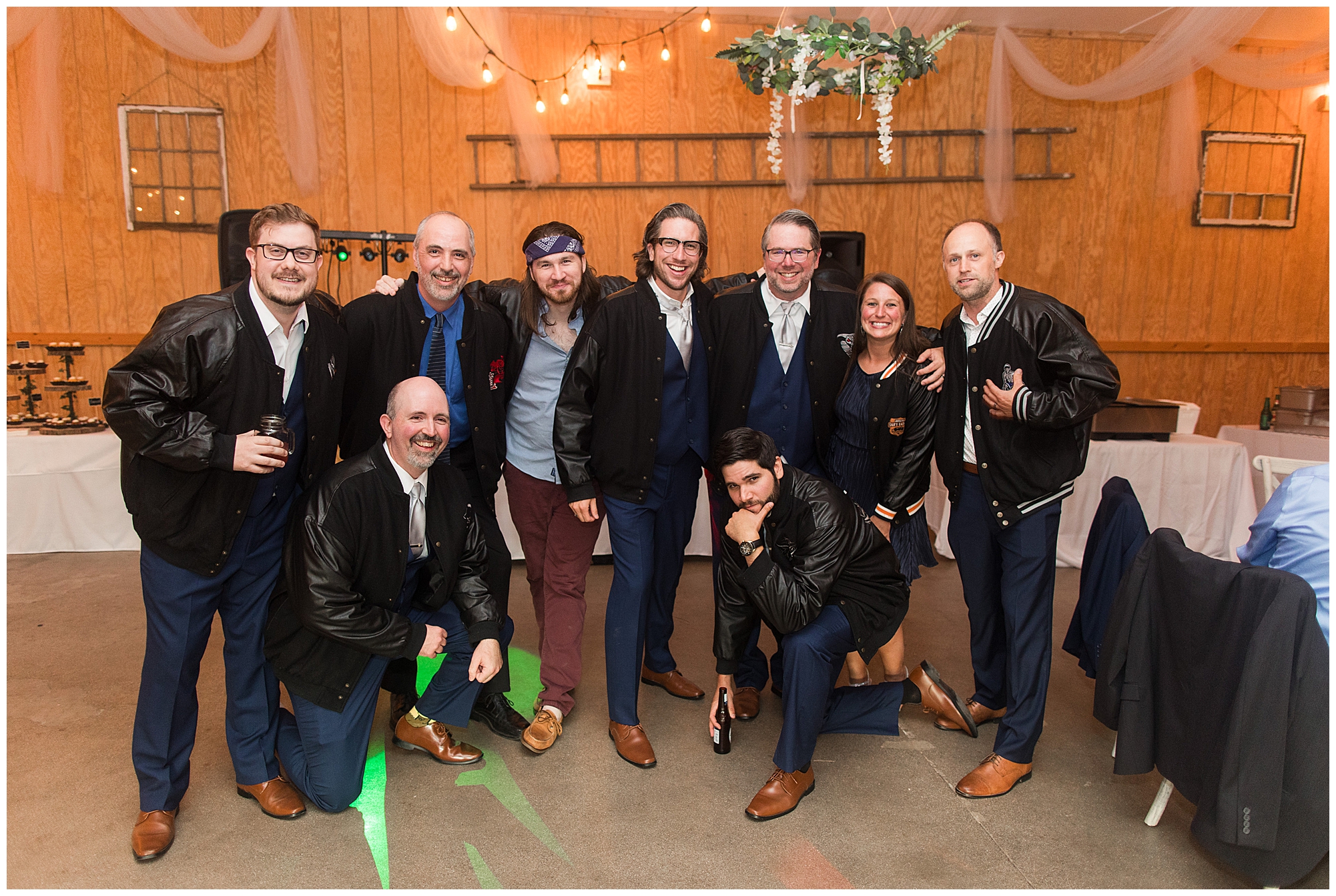 The reception was filled with many more favorites of the newlyweds including tables named after beloved breweries, accents of hunter green, a Star Wars cake topper, as well as lightsaber bridal party entrance. And while we are talking about the cake, it was made by Caitlin’s previous teacher, who she had for many years in a row as her class grew to the next grade level. Over the last few years, they have reconnected and call each other friends. Her teacher shared with me that she called the students her “Little Peeps” and as a surprise to Caitlin, she snuck the tiniest of yellow Peeps (like the Easter Peeps) onto the top of the cake. The reaction of the bride was so meaningful to both of them. The couple listened to many funny and thoughtful toasts, the bride and groom shared their first dance along with lovely dances with Caitlin’s father and Jake’s mother. And don’t worry, there was plenty of dancing, however this couple envisioned relaxing and spending time with their guests as much as possible. Jake’s brothers and family members even busted out their black leather jackets with various nostalgic emblems. I asked the backstory of the jackets and apparently years ago at a thrift story they had a huge box of these jackets. So they bought them and bring them out at special events and hand them out to new “club members” including Caitlin’s brother, who was given his jacket to celebrate. Hilarious! Before I left for the evening, I stole the couple, along with their bridal party of one more nod to Star Wars with some lightsaber photos. I adore Caitlin and Jake and wish them all the blessing in the galaxy for their marriage! May the Force be with you both!