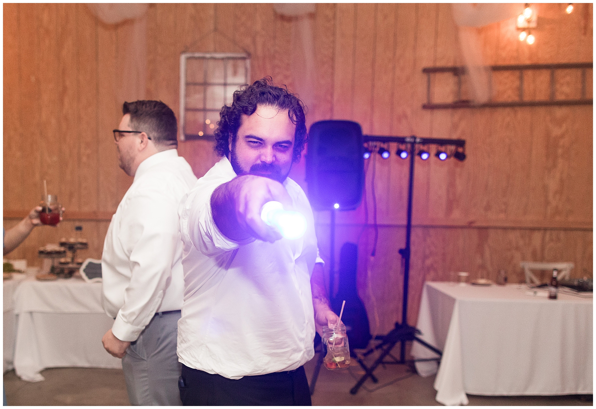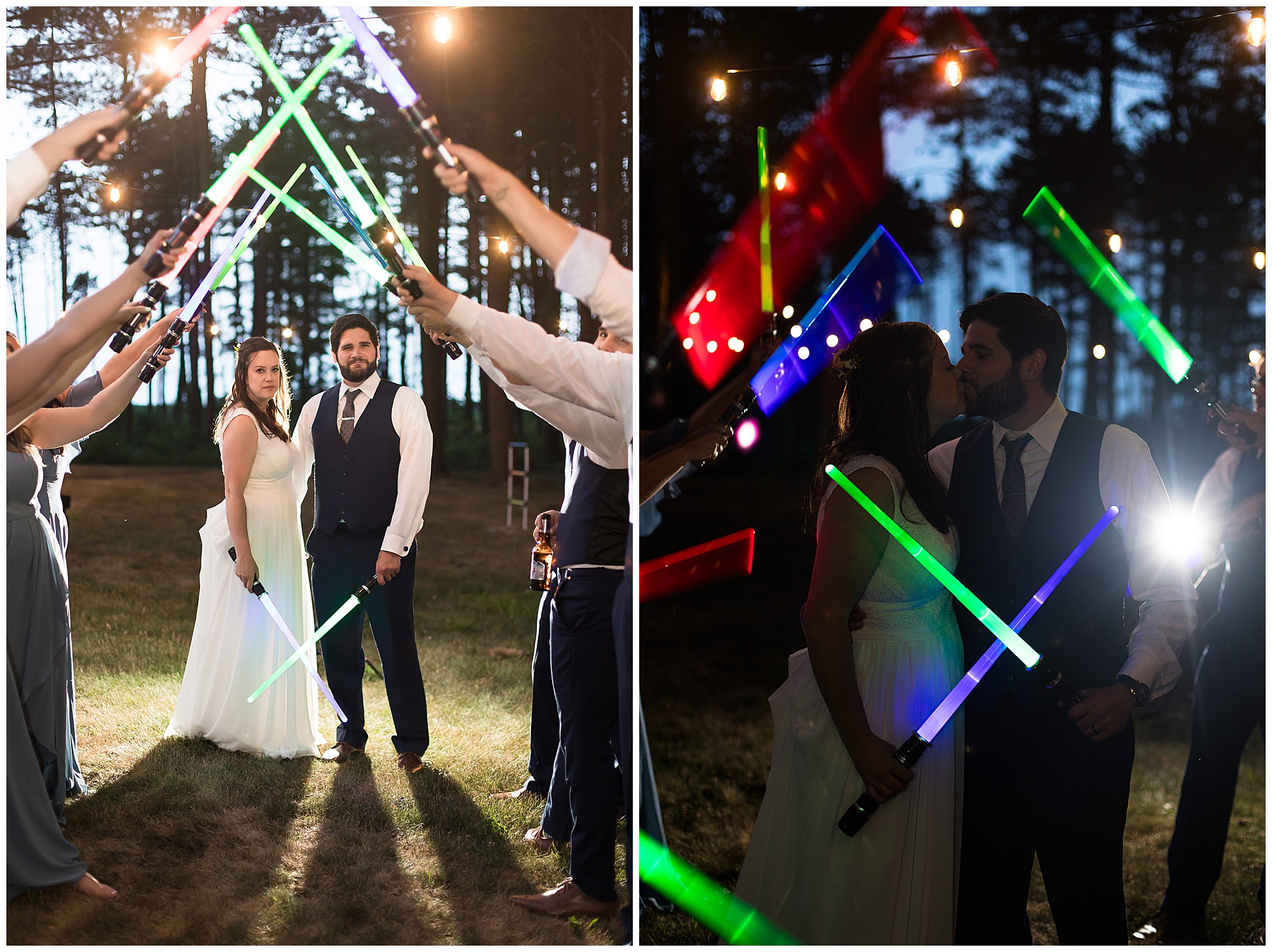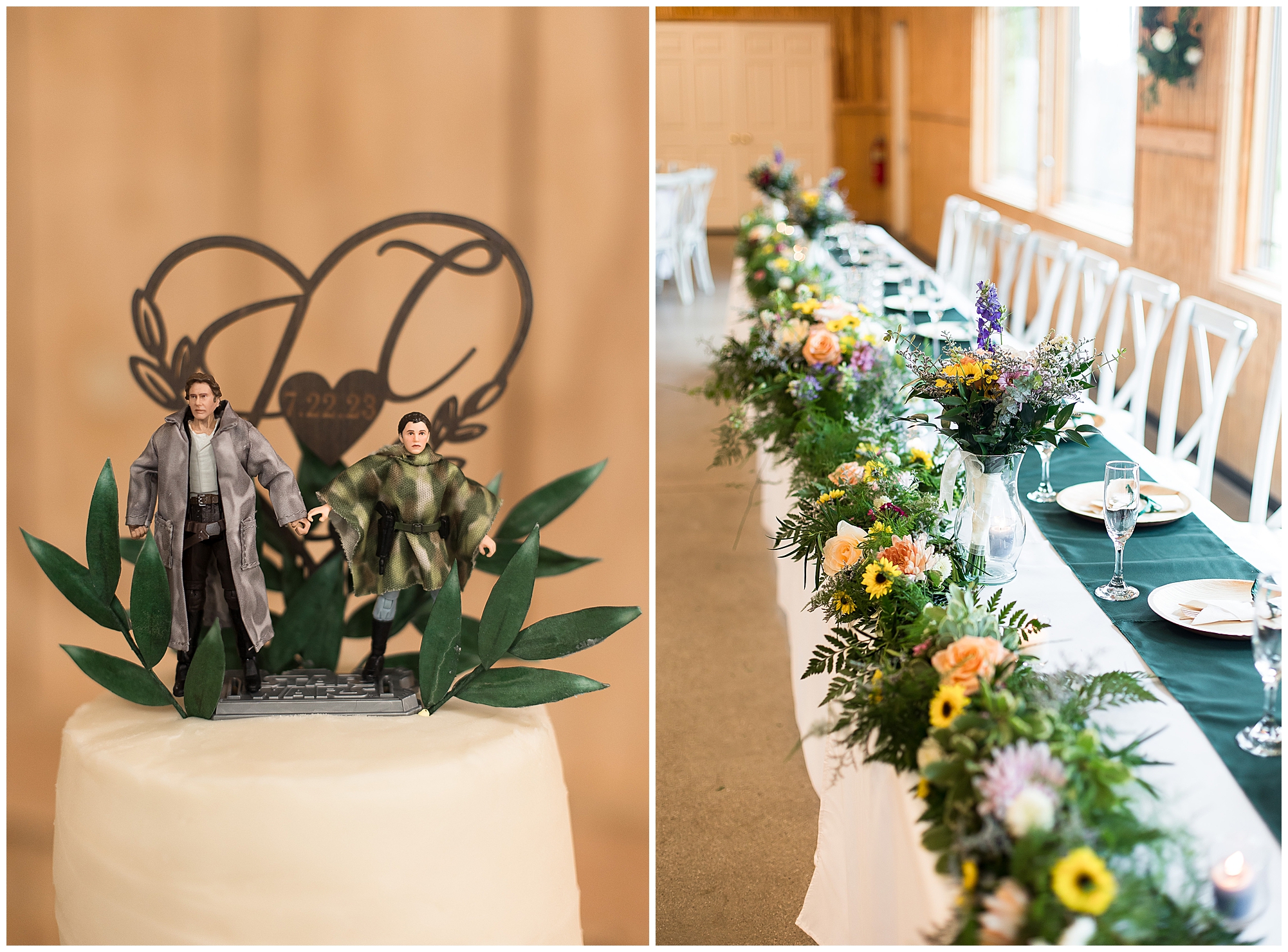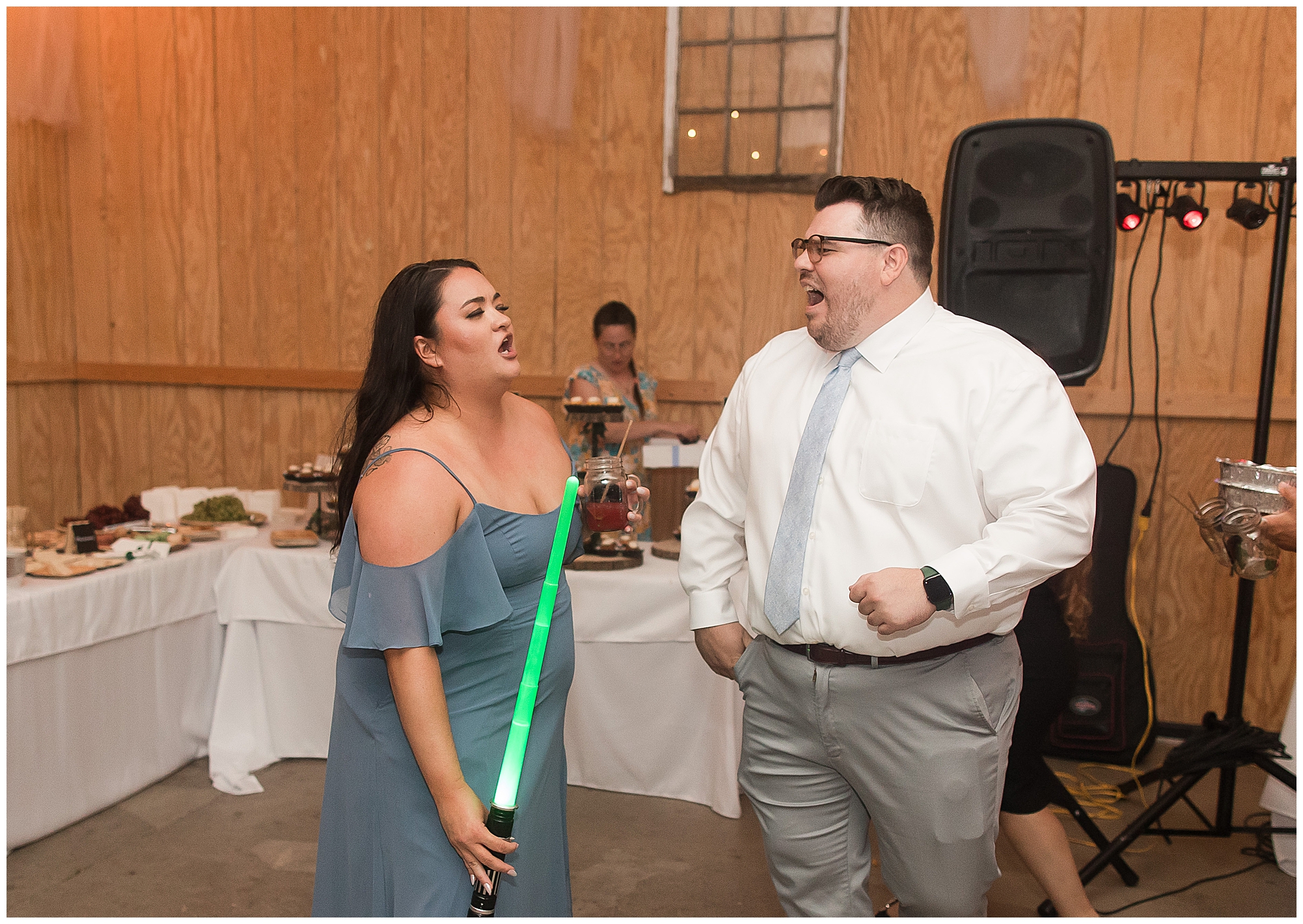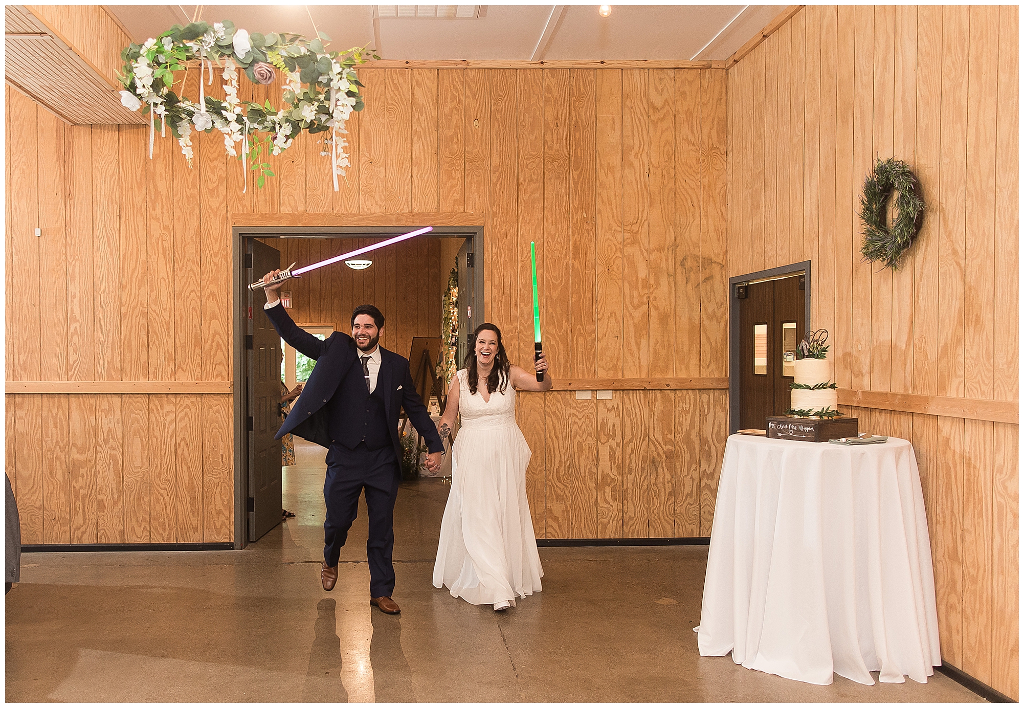 The reception was filled with many more favorites of the newlyweds including tables named after beloved breweries, accents of hunter green, a Star Wars cake topper, as well as lightsaber bridal party entrance. And while we are talking about the cake, it was made by Caitlin’s previous teacher, who she had for many years in a row as her class grew to the next grade level. Over the last few years, they have reconnected and call each other friends. Her teacher shared with me that she called the students her “Little Peeps” and as a surprise to Caitlin, she snuck the tiniest of yellow Peeps (like the Easter Peeps) onto the top of the cake. The reaction of the bride was so meaningful to both of them. The couple listened to many funny and thoughtful toasts, the bride and groom shared their first dance along with lovely dances with Caitlin’s father and Jake’s mother. And don’t worry, there was plenty of dancing, however this couple envisioned relaxing and spending time with their guests as much as possible. Jake’s brothers and family members even busted out their black leather jackets with various nostalgic emblems. I asked the backstory of the jackets and apparently years ago at a thrift story they had a huge box of these jackets. So they bought them and bring them out at special events and hand them out to new “club members” including Caitlin’s brother, who was given his jacket to celebrate. Hilarious! Before I left for the evening, I stole the couple, along with their bridal party of one more nod to Star Wars with some lightsaber photos. I adore Caitlin and Jake and wish them all the blessing in the galaxy for their marriage! May the Force be with you both!