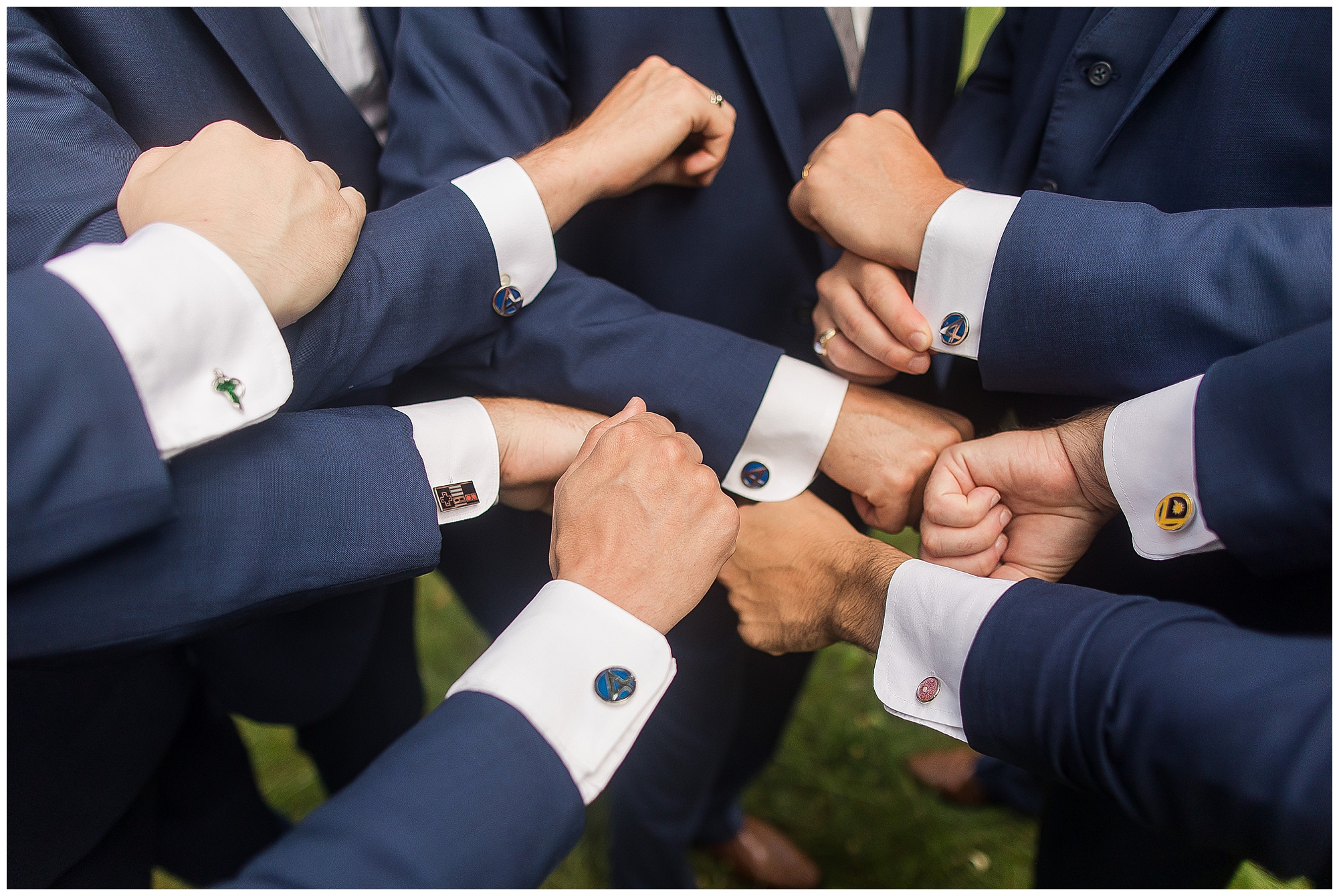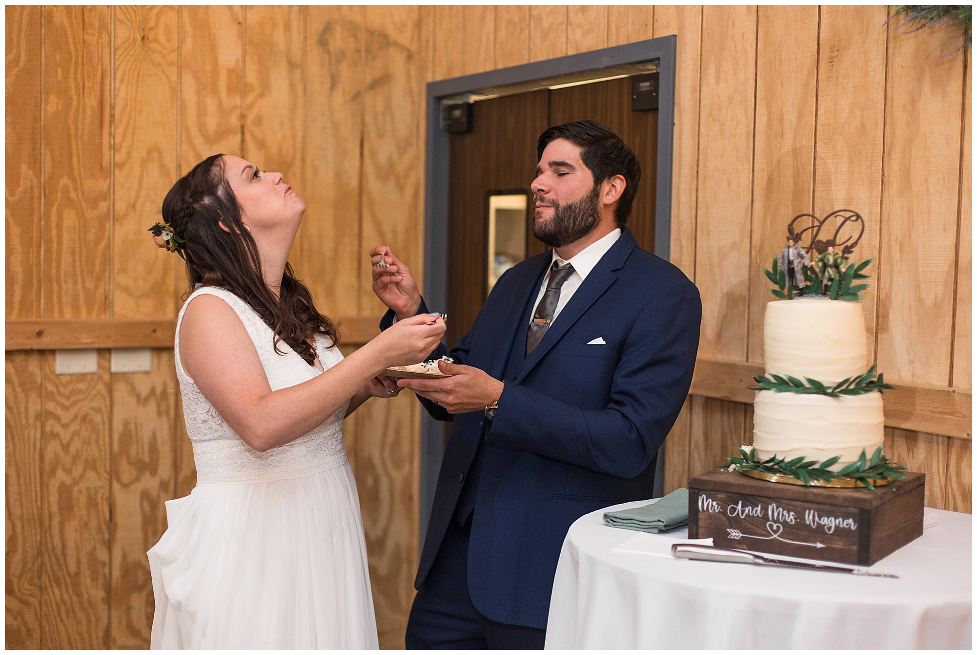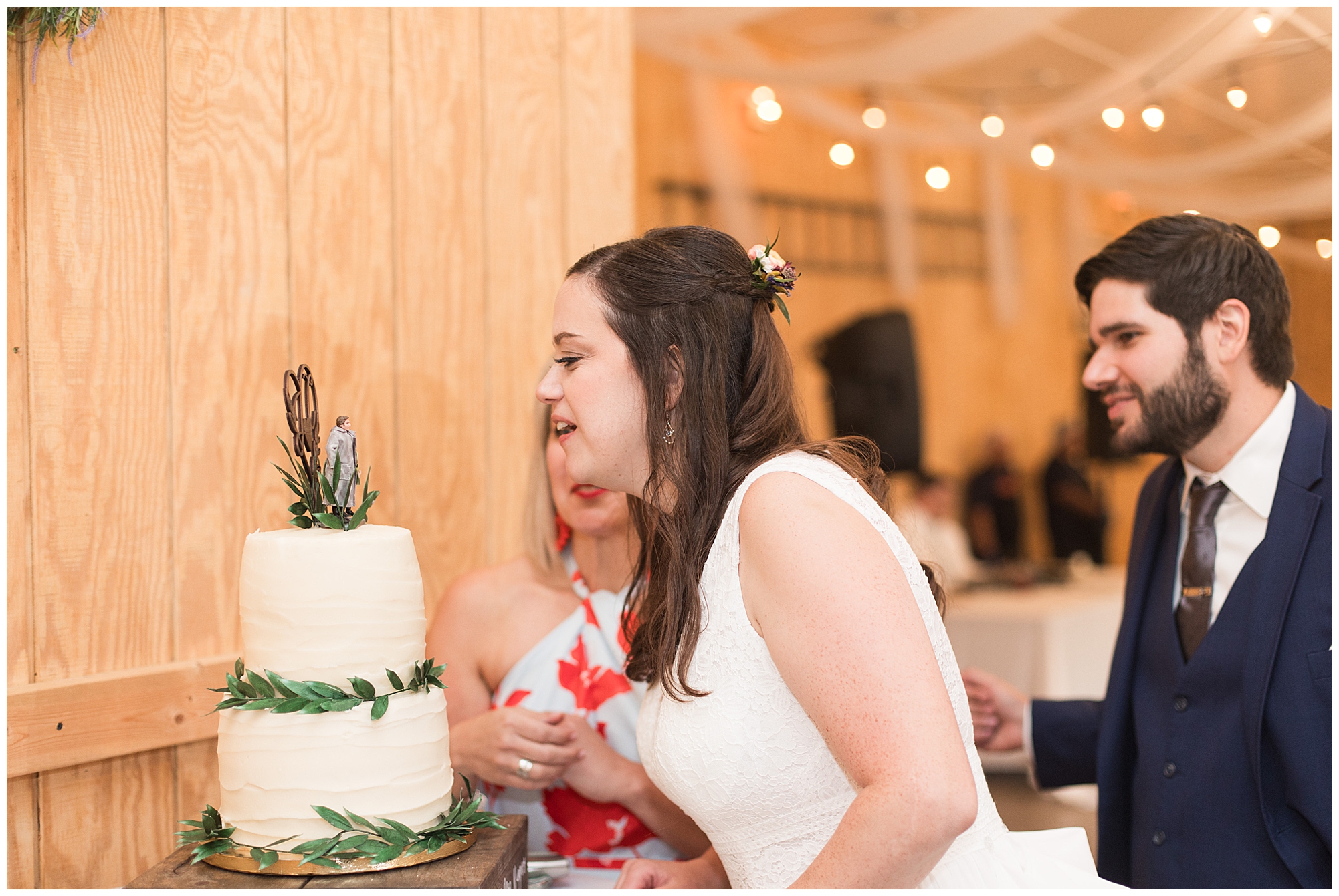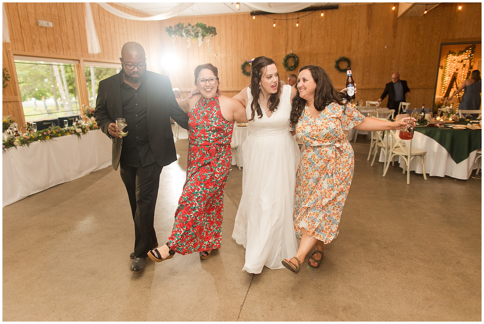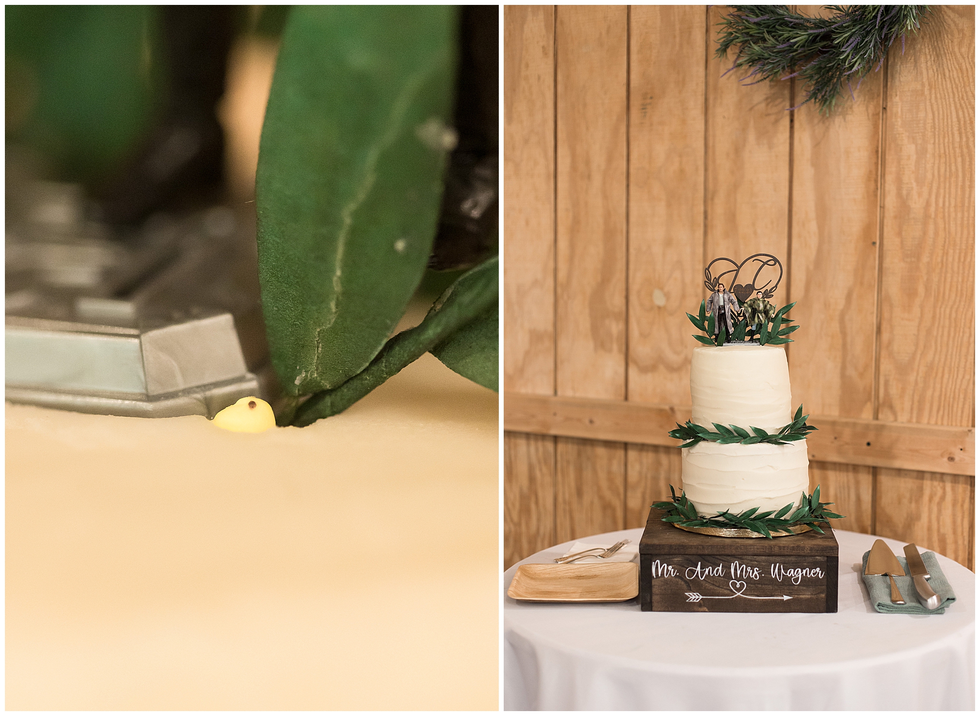 The reception was filled with many more favorites of the newlyweds including tables named after beloved breweries, accents of hunter green, a Star Wars cake topper, as well as lightsaber bridal party entrance. And while we are talking about the cake, it was made by Caitlin’s previous teacher, who she had for many years in a row as her class grew to the next grade level. Over the last few years, they have reconnected and call each other friends. Her teacher shared with me that she called the students her “Little Peeps” and as a surprise to Caitlin, she snuck the tiniest of yellow Peeps (like the Easter Peeps) onto the top of the cake. The reaction of the bride was so meaningful to both of them. The couple listened to many funny and thoughtful toasts, the bride and groom shared their first dance along with lovely dances with Caitlin’s father and Jake’s mother. And don’t worry, there was plenty of dancing, however this couple envisioned relaxing and spending time with their guests as much as possible. Jake’s brothers and family members even busted out their black leather jackets with various nostalgic emblems. I asked the backstory of the jackets and apparently years ago at a thrift story they had a huge box of these jackets. So they bought them and bring them out at special events and hand them out to new “club members” including Caitlin’s brother, who was given his jacket to celebrate. Hilarious! Before I left for the evening, I stole the couple, along with their bridal party of one more nod to Star Wars with some lightsaber photos. I adore Caitlin and Jake and wish them all the blessing in the galaxy for their marriage! May the Force be with you both!