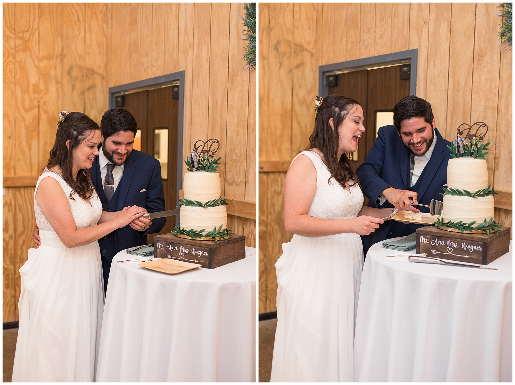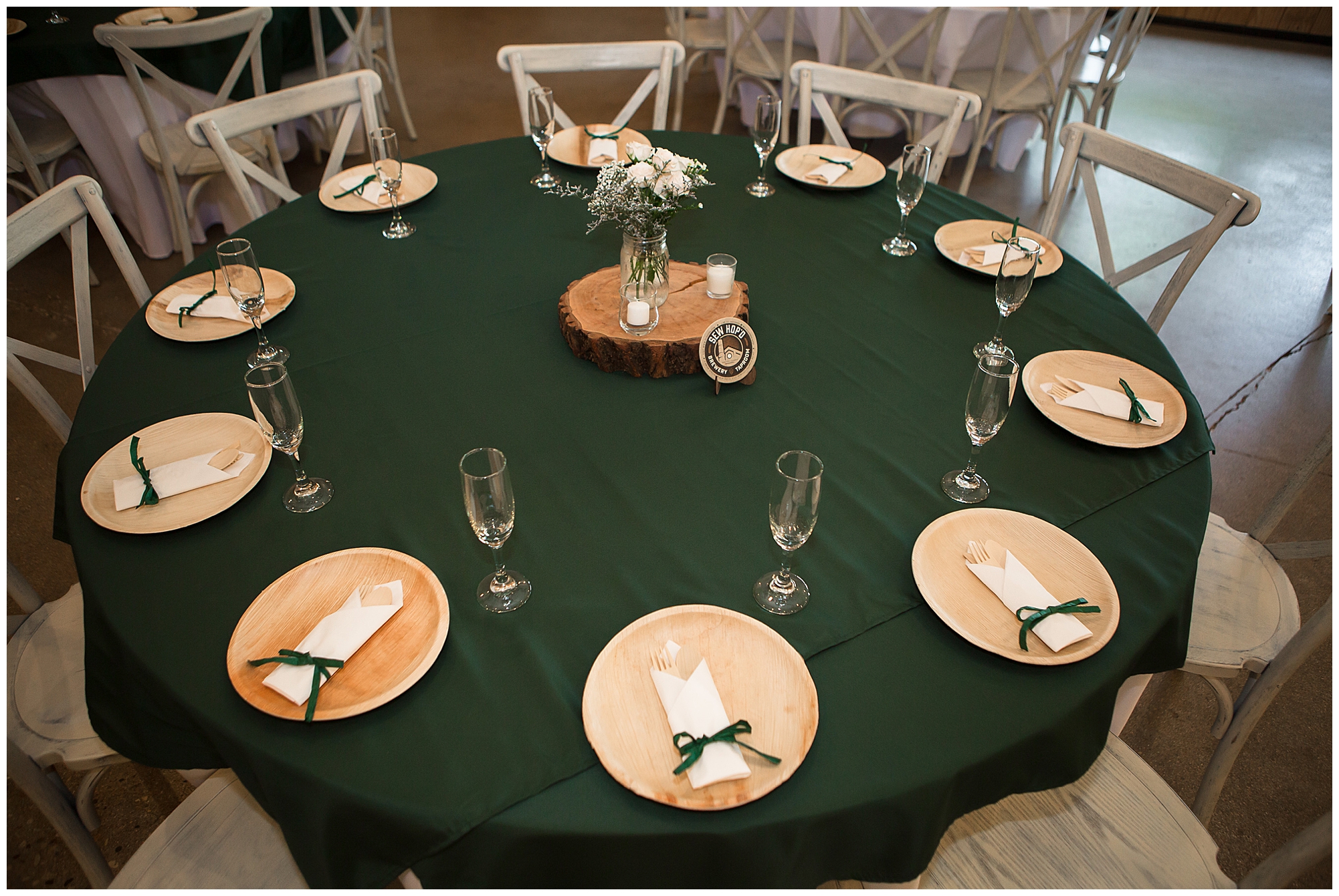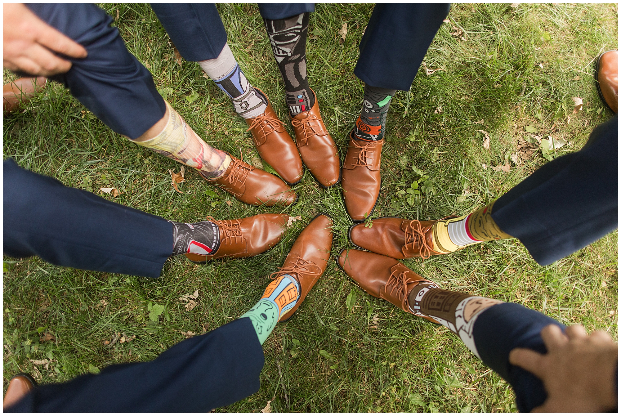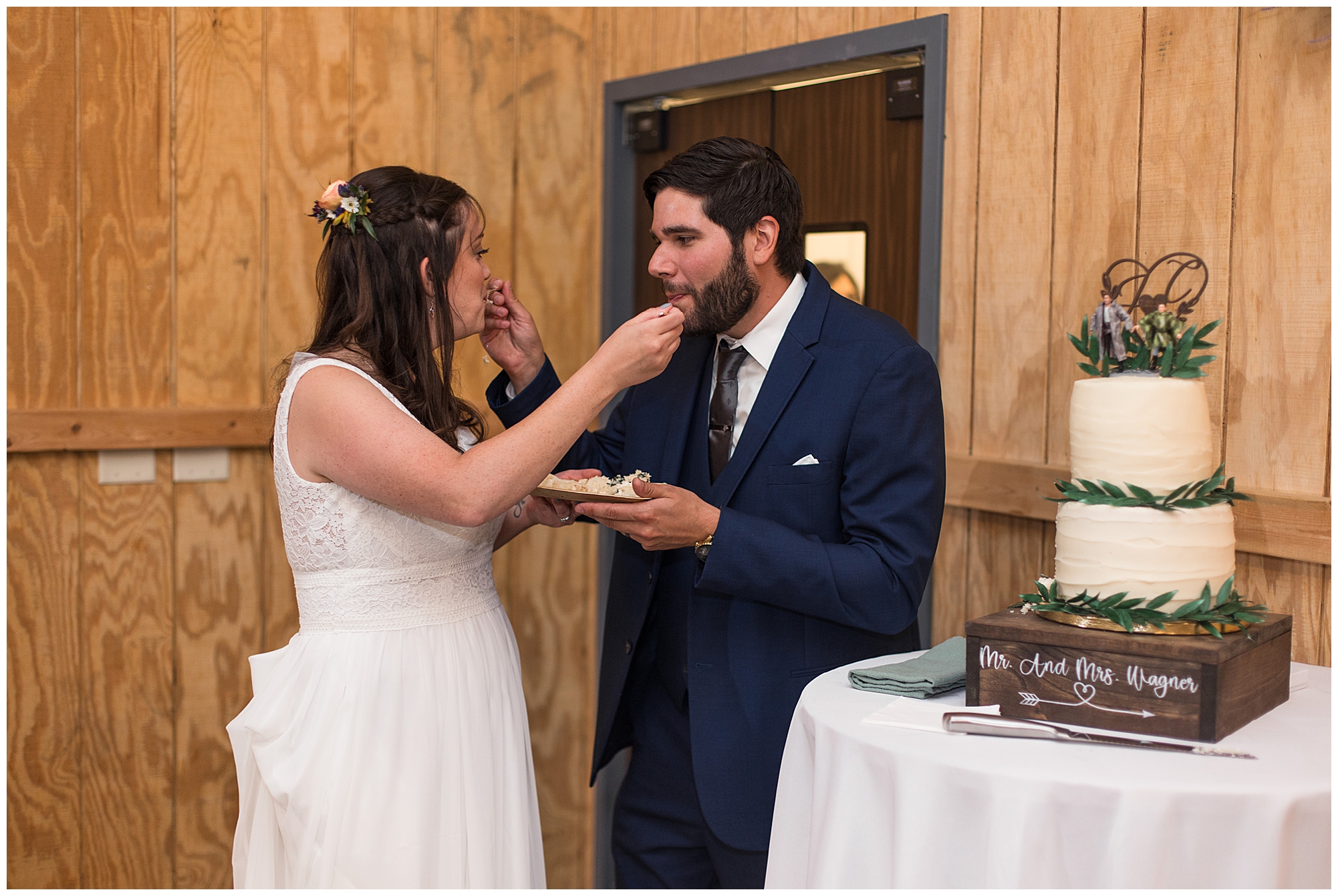 The reception was filled with many more favorites of the newlyweds including tables named after beloved breweries, accents of hunter green, a Star Wars cake topper, as well as lightsaber bridal party entrance. And while we are talking about the cake, it was made by Caitlin’s previous teacher, who she had for many years in a row as her class grew to the next grade level. Over the last few years, they have reconnected and call each other friends. Her teacher shared with me that she called the students her “Little Peeps” and as a surprise to Caitlin, she snuck the tiniest of yellow Peeps (like the Easter Peeps) onto the top of the cake. The reaction of the bride was so meaningful to both of them. The couple listened to many funny and thoughtful toasts, the bride and groom shared their first dance along with lovely dances with Caitlin’s father and Jake’s mother. And don’t worry, there was plenty of dancing, however this couple envisioned relaxing and spending time with their guests as much as possible. Jake’s brothers and family members even busted out their black leather jackets with various nostalgic emblems. I asked the backstory of the jackets and apparently years ago at a thrift story they had a huge box of these jackets. So they bought them and bring them out at special events and hand them out to new “club members” including Caitlin’s brother, who was given his jacket to celebrate. Hilarious! Before I left for the evening, I stole the couple, along with their bridal party of one more nod to Star Wars with some lightsaber photos. I adore Caitlin and Jake and wish them all the blessing in the galaxy for their marriage! May the Force be with you both!