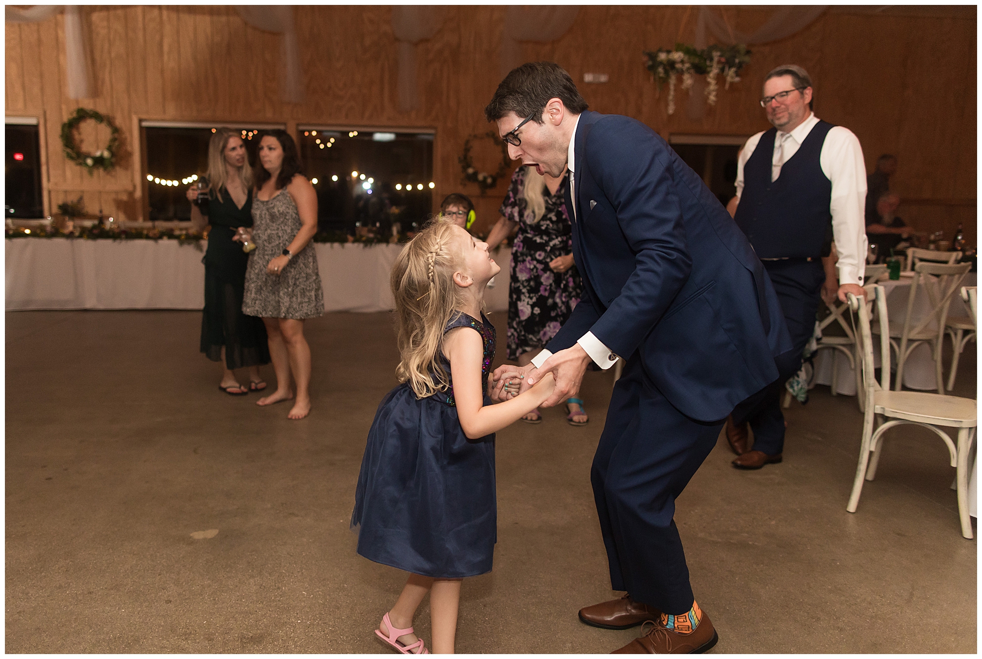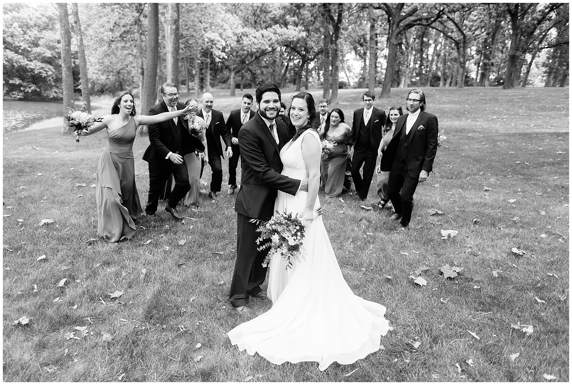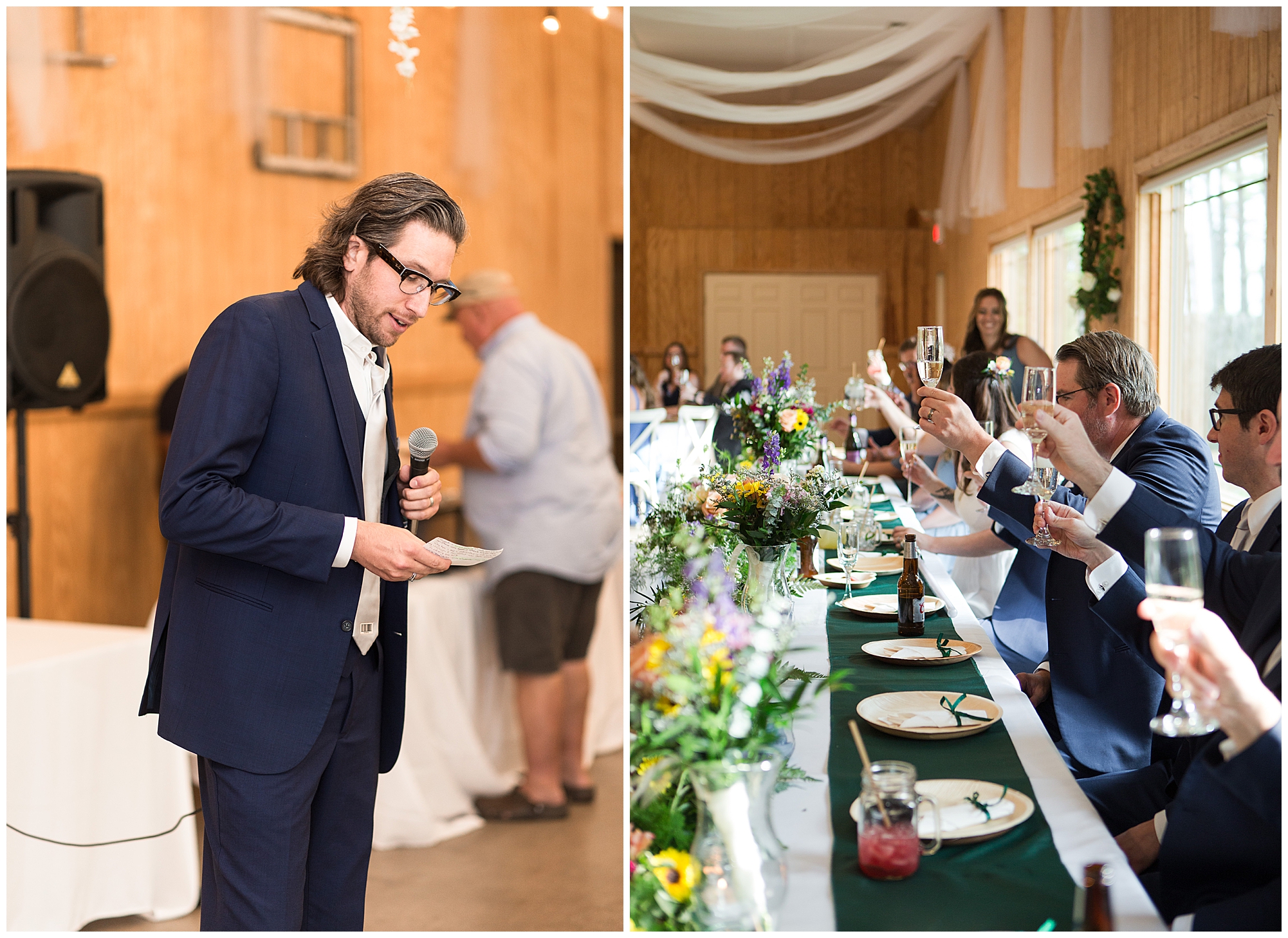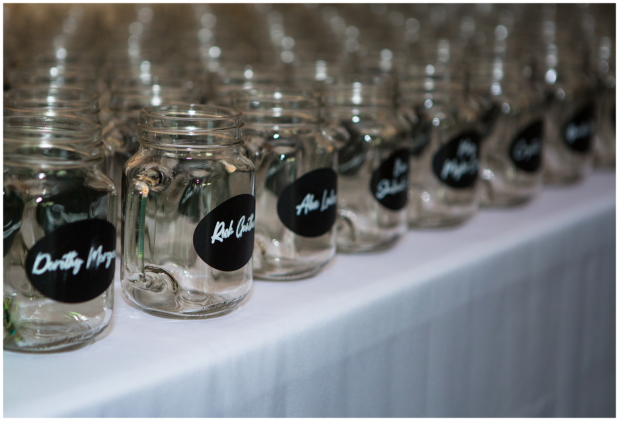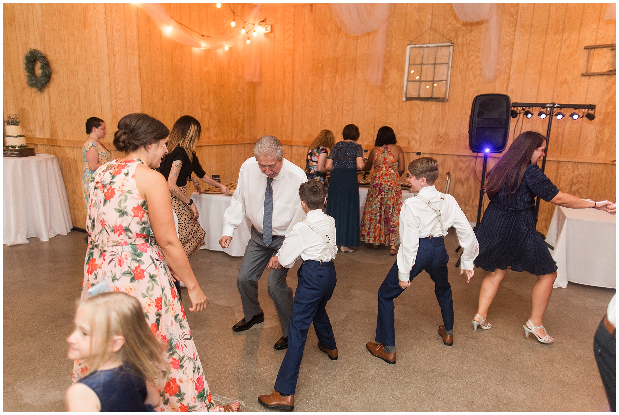 The reception was filled with many more favorites of the newlyweds including tables named after beloved breweries, accents of hunter green, a Star Wars cake topper, as well as lightsaber bridal party entrance. And while we are talking about the cake, it was made by Caitlin’s previous teacher, who she had for many years in a row as her class grew to the next grade level. Over the last few years, they have reconnected and call each other friends. Her teacher shared with me that she called the students her “Little Peeps” and as a surprise to Caitlin, she snuck the tiniest of yellow Peeps (like the Easter Peeps) onto the top of the cake. The reaction of the bride was so meaningful to both of them. The couple listened to many funny and thoughtful toasts, the bride and groom shared their first dance along with lovely dances with Caitlin’s father and Jake’s mother. And don’t worry, there was plenty of dancing, however this couple envisioned relaxing and spending time with their guests as much as possible. Jake’s brothers and family members even busted out their black leather jackets with various nostalgic emblems. I asked the backstory of the jackets and apparently years ago at a thrift story they had a huge box of these jackets. So they bought them and bring them out at special events and hand them out to new “club members” including Caitlin’s brother, who was given his jacket to celebrate. Hilarious! Before I left for the evening, I stole the couple, along with their bridal party of one more nod to Star Wars with some lightsaber photos. I adore Caitlin and Jake and wish them all the blessing in the galaxy for their marriage! May the Force be with you both!