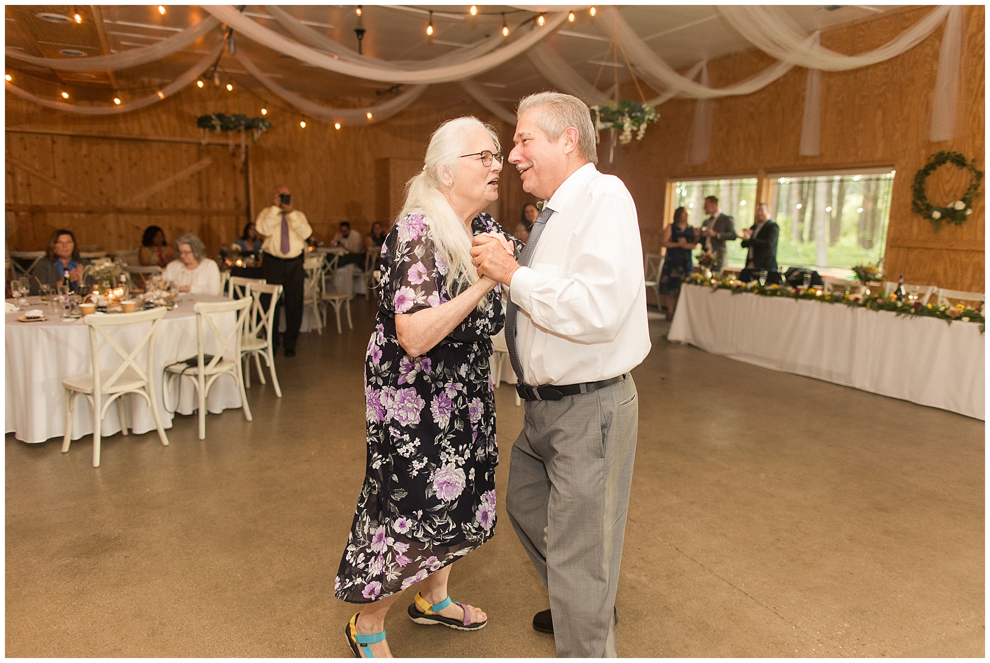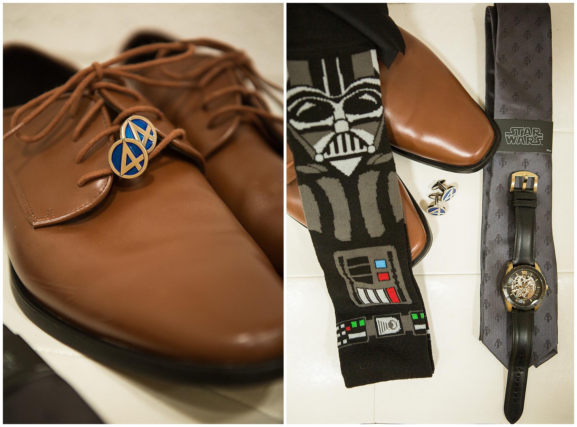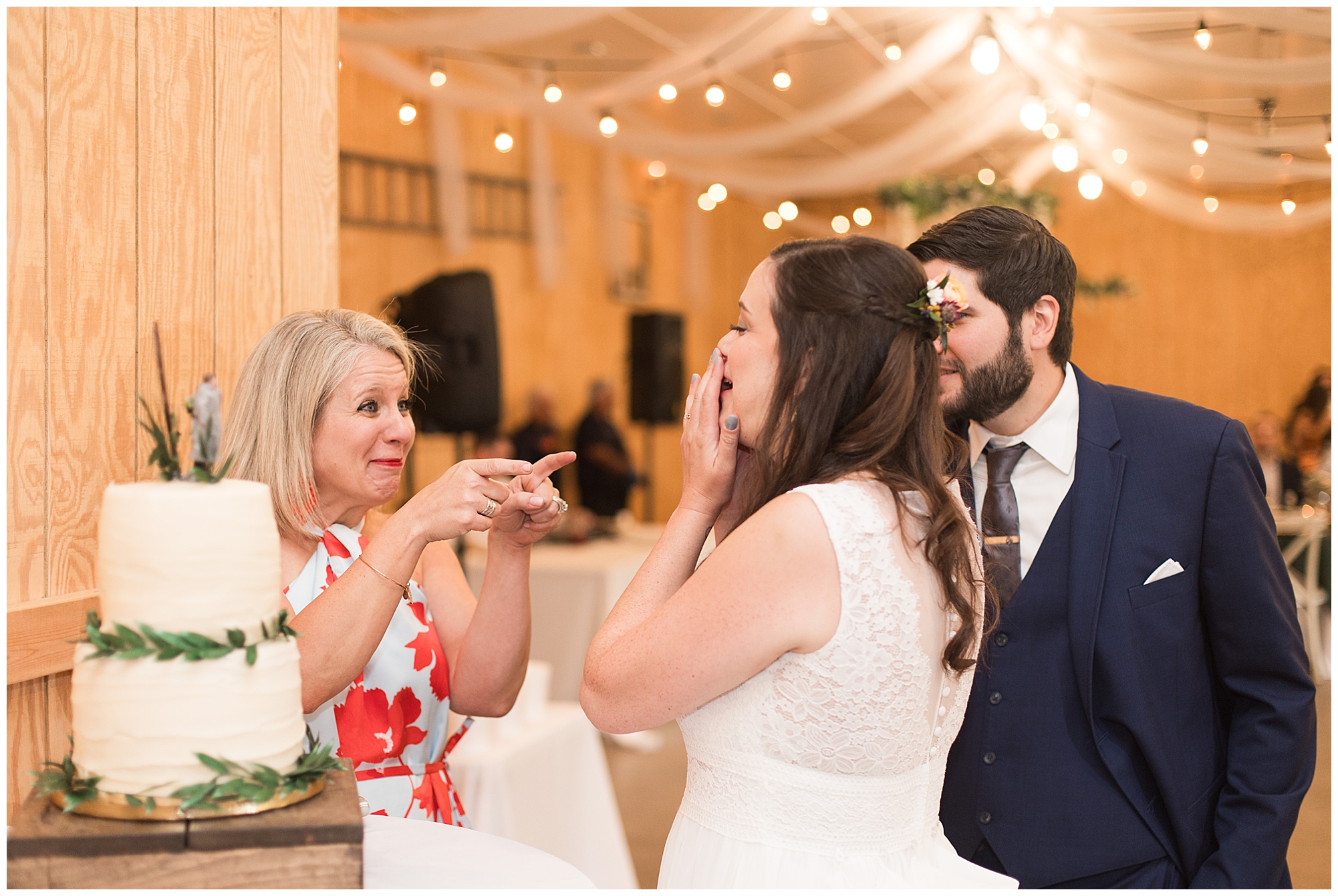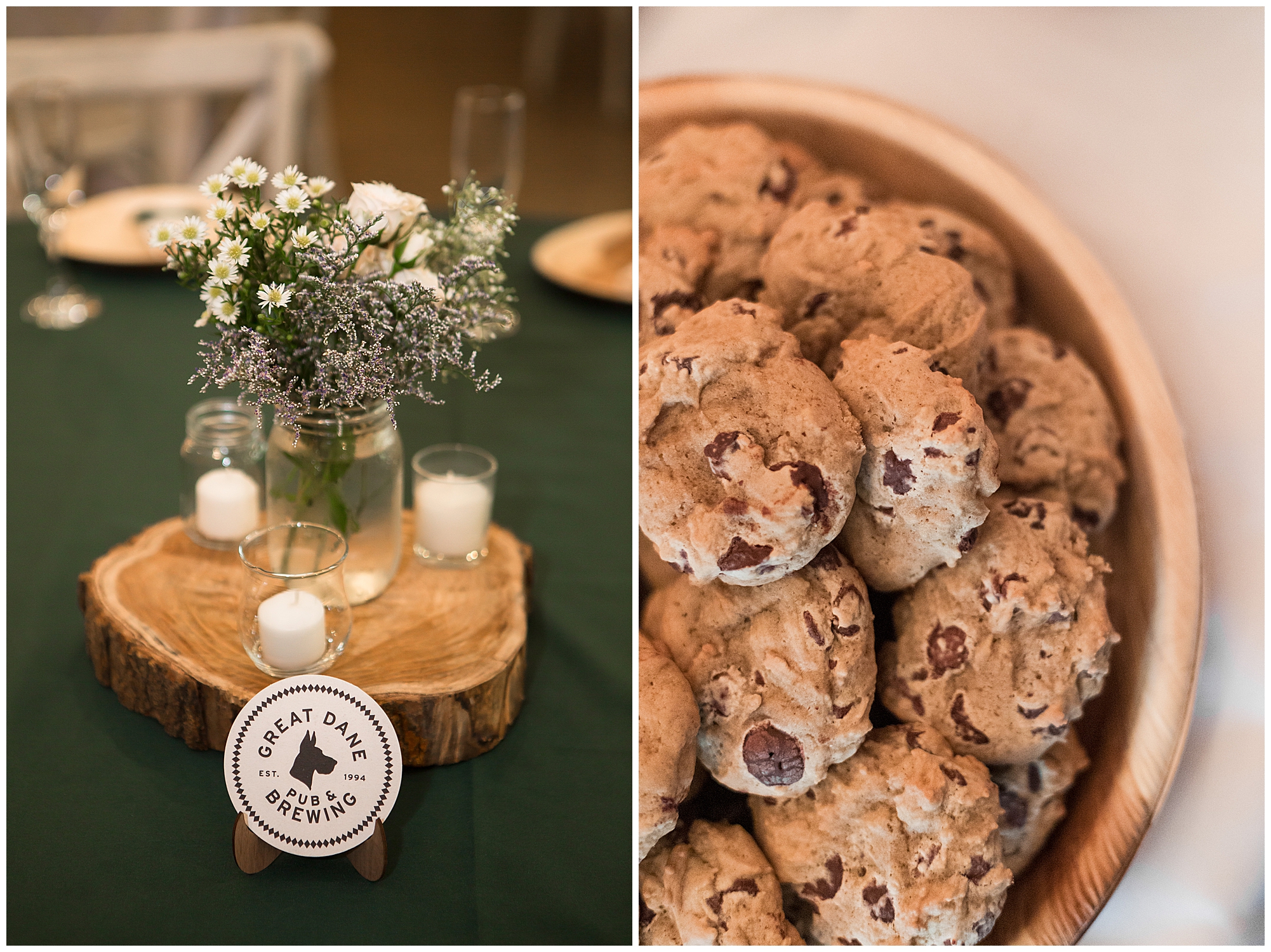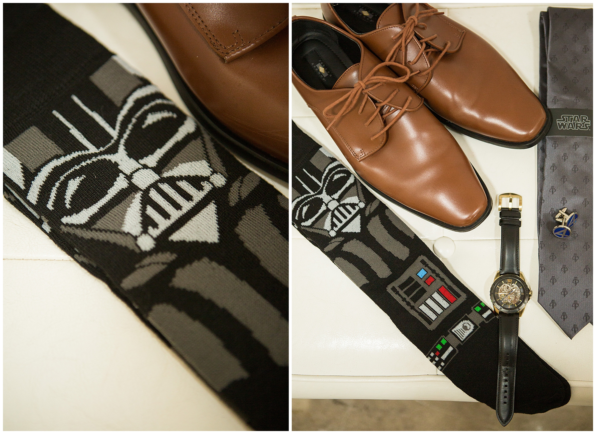 The reception was filled with many more favorites of the newlyweds including tables named after beloved breweries, accents of hunter green, a Star Wars cake topper, as well as lightsaber bridal party entrance. And while we are talking about the cake, it was made by Caitlin’s previous teacher, who she had for many years in a row as her class grew to the next grade level. Over the last few years, they have reconnected and call each other friends. Her teacher shared with me that she called the students her “Little Peeps” and as a surprise to Caitlin, she snuck the tiniest of yellow Peeps (like the Easter Peeps) onto the top of the cake. The reaction of the bride was so meaningful to both of them. The couple listened to many funny and thoughtful toasts, the bride and groom shared their first dance along with lovely dances with Caitlin’s father and Jake’s mother. And don’t worry, there was plenty of dancing, however this couple envisioned relaxing and spending time with their guests as much as possible. Jake’s brothers and family members even busted out their black leather jackets with various nostalgic emblems. I asked the backstory of the jackets and apparently years ago at a thrift story they had a huge box of these jackets. So they bought them and bring them out at special events and hand them out to new “club members” including Caitlin’s brother, who was given his jacket to celebrate. Hilarious! Before I left for the evening, I stole the couple, along with their bridal party of one more nod to Star Wars with some lightsaber photos. I adore Caitlin and Jake and wish them all the blessing in the galaxy for their marriage! May the Force be with you both!