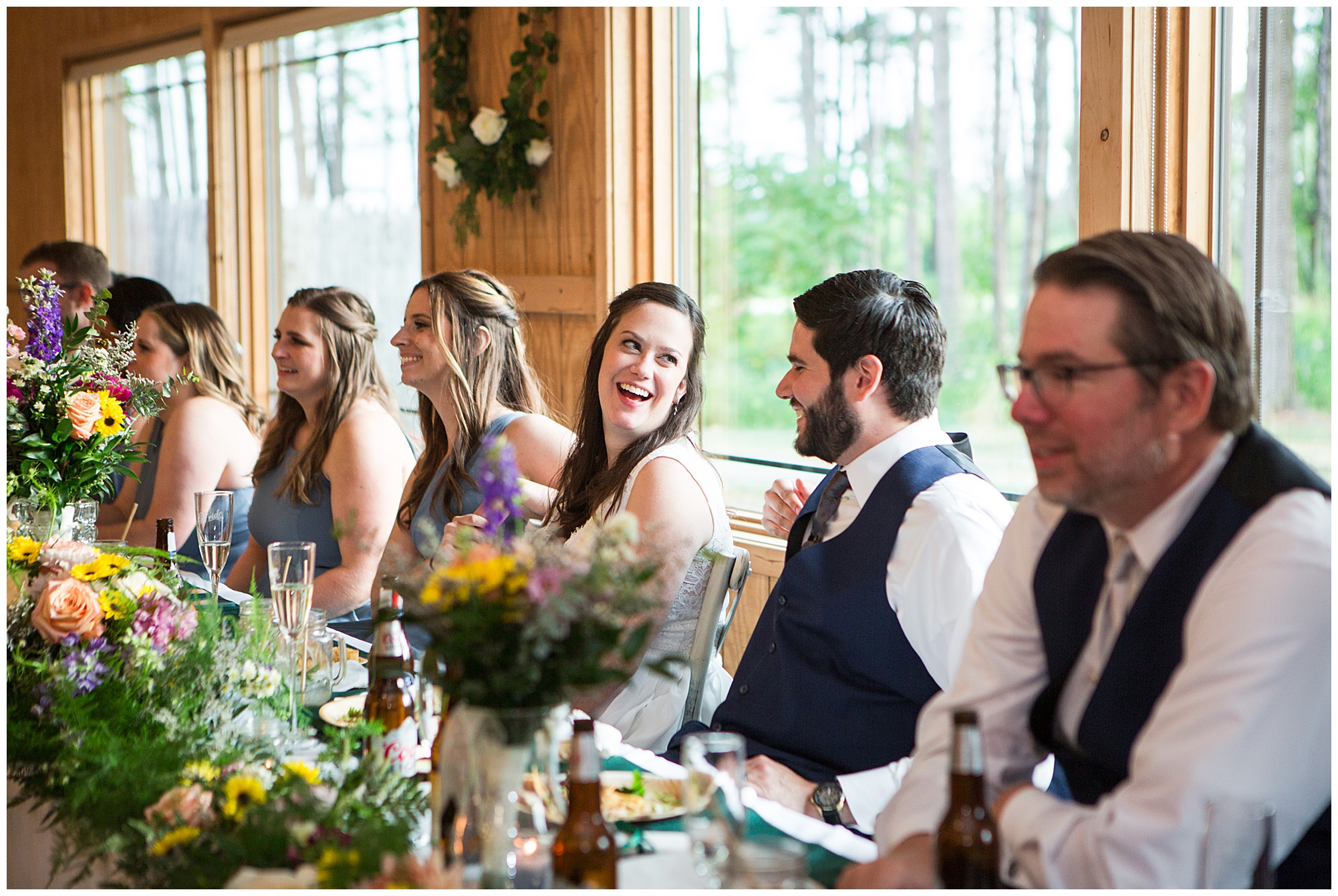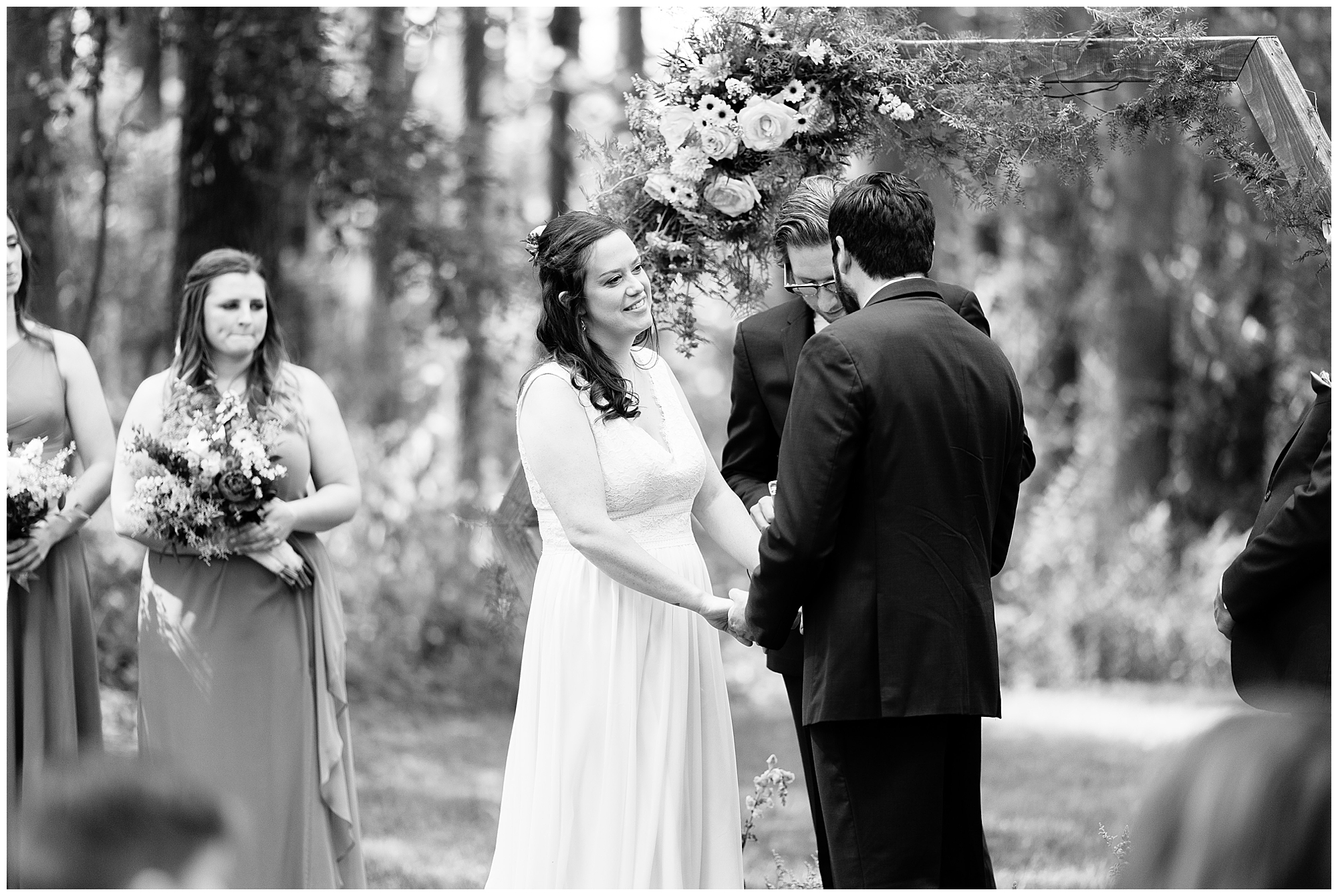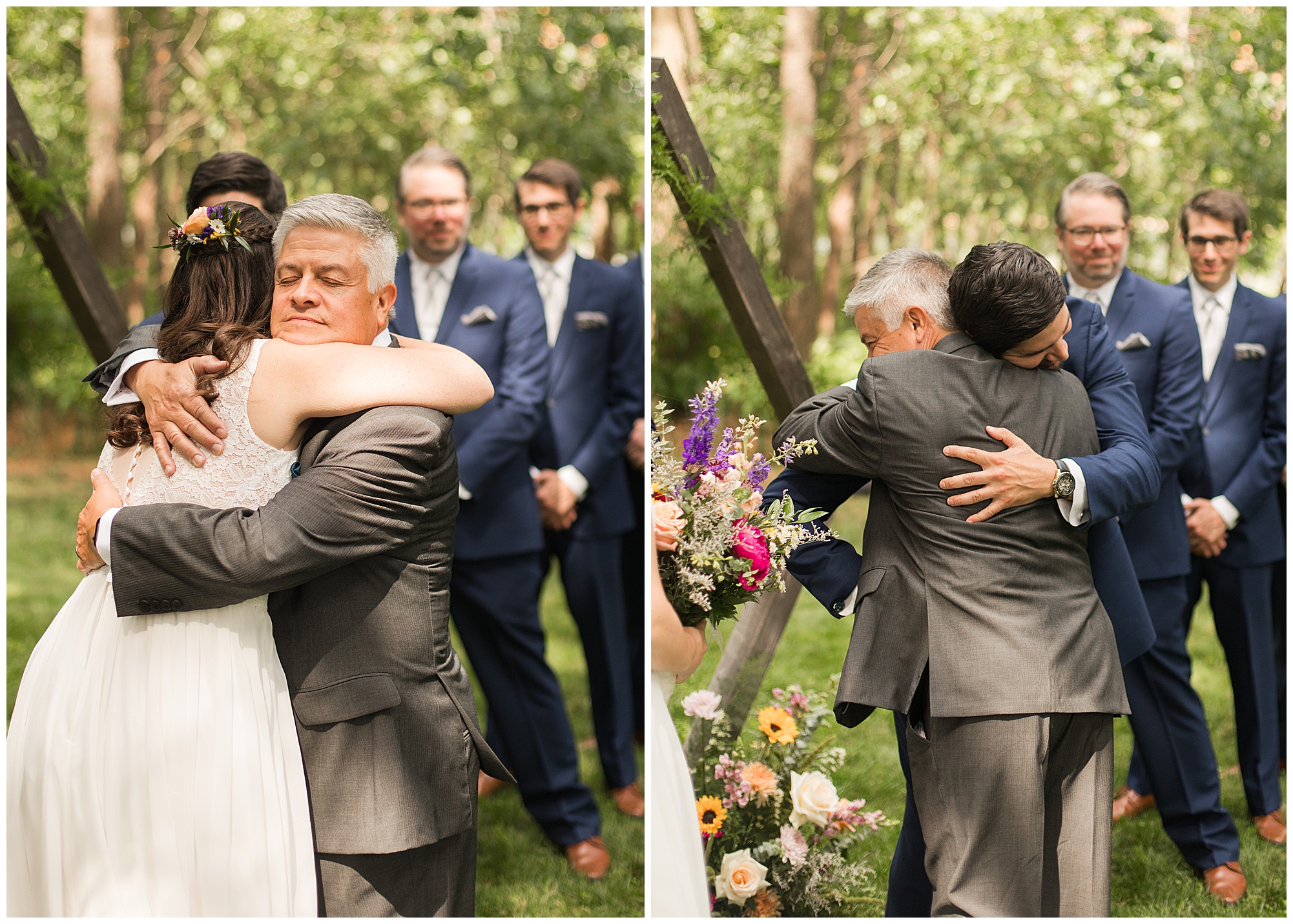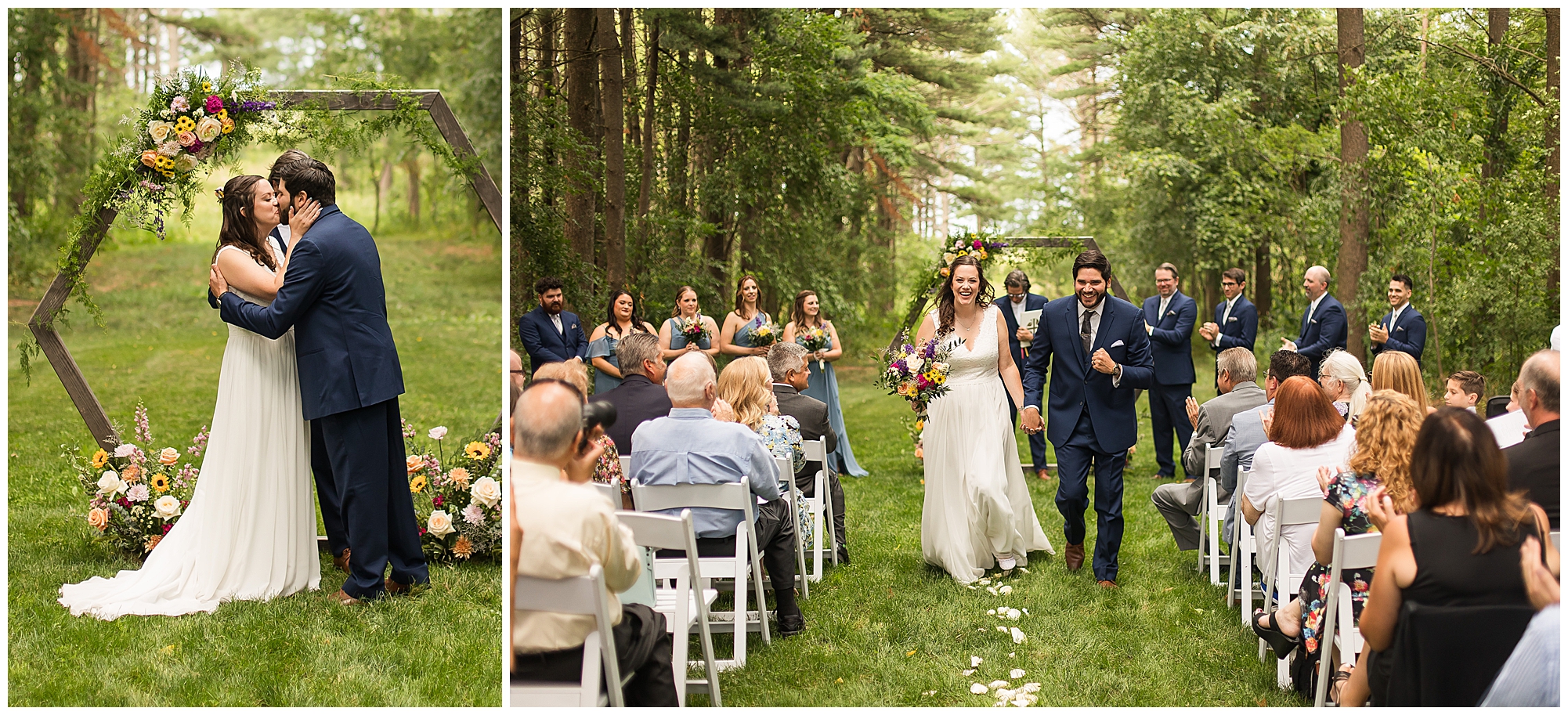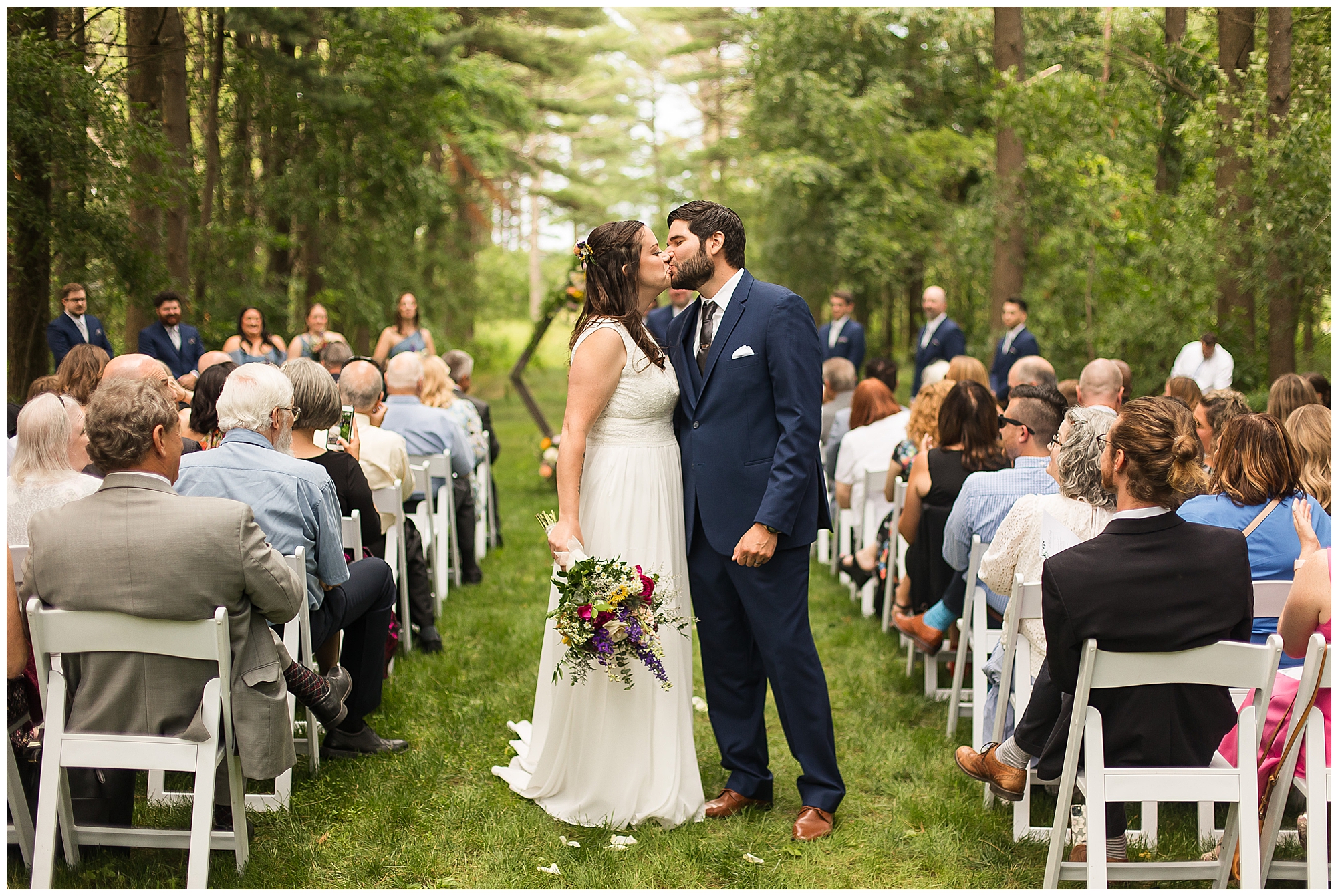The ceremony was set in a stunning spot with tall pine trees on either side of the floral covered arbor. It was truly a magical setting. Caitlin made her way down the aisle arm in arm with her father towards an awaiting Jake, who couldn’t have wiped the smile off his face if he tried. Jake’s brother performed the nuptials with sweet sentiments with a bit of humor sprinkled in. Caitlin and Jake exchanged vows, rings, and a kiss to seal the deal! Congrats, Mr. & Mrs. Wagner! May I also mention, that throughout the day, everyone was keeping their eyes on the radar as a huge storm was threatening to ruin the day right around ceremony time. However, due to so many prayers and the trust this couple had to move forward with their plans, the storm literally split and went right around the venue. We did get rain during the cocktail hour, but after a quick shower, the sun came back out until it was dark. You know they say rain on your wedding day is good luck!