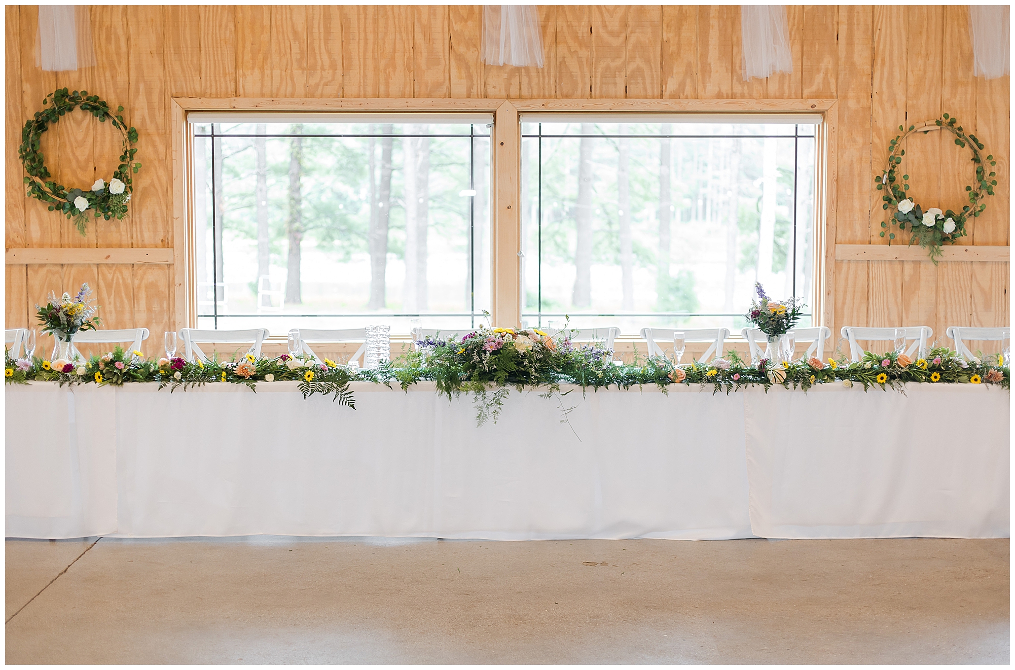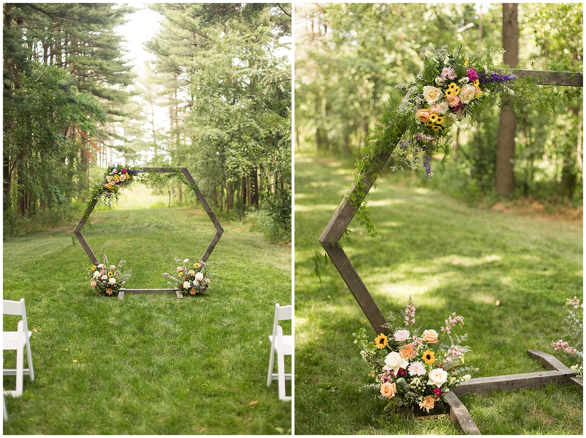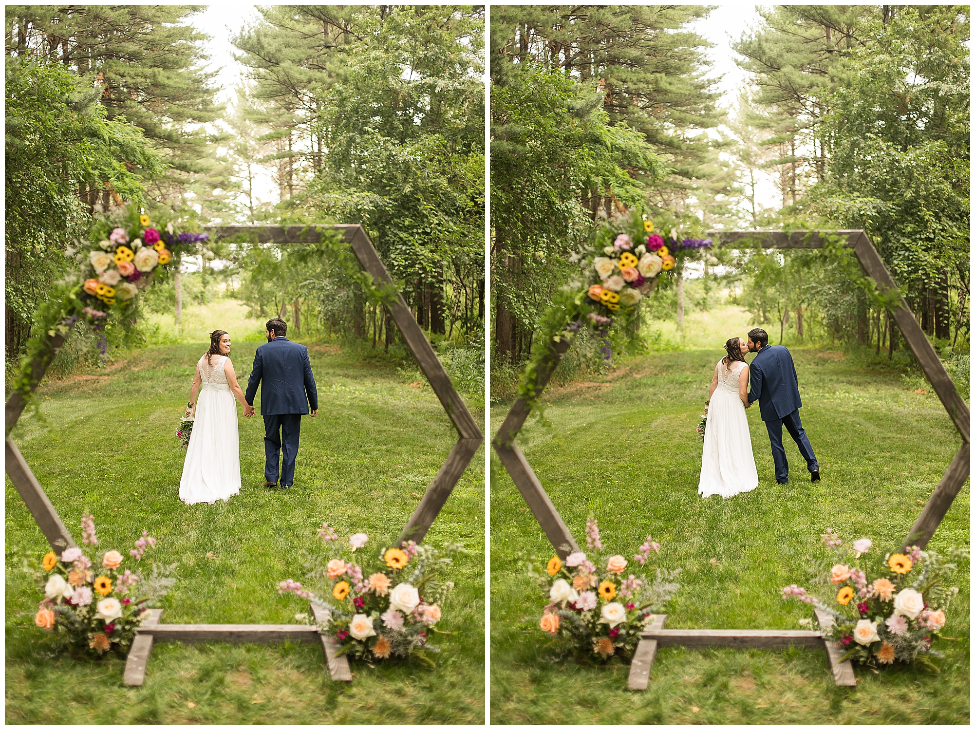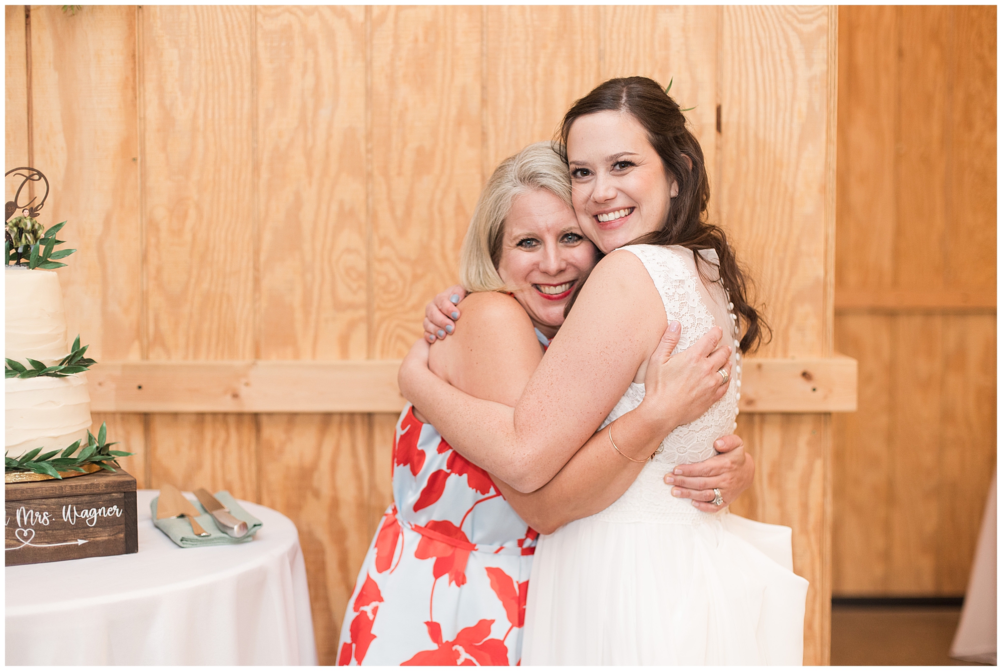 The ceremony was set in a stunning spot with tall pine trees on either side of the floral covered arbor. It was truly a magical setting. Caitlin made her way down the aisle arm in arm with her father towards an awaiting Jake, who couldn’t have wiped the smile off his face if he tried. Jake’s brother performed the nuptials with sweet sentiments with a bit of humor sprinkled in. Caitlin and Jake exchanged vows, rings, and a kiss to seal the deal! Congrats, Mr. & Mrs. Wagner! May I also mention, that throughout the day, everyone was keeping their eyes on the radar as a huge storm was threatening to ruin the day right around ceremony time. However, due to so many prayers and the trust this couple had to move forward with their plans, the storm literally split and went right around the venue. We did get rain during the cocktail hour, but after a quick shower, the sun came back out until it was dark. You know they say rain on your wedding day is good luck!