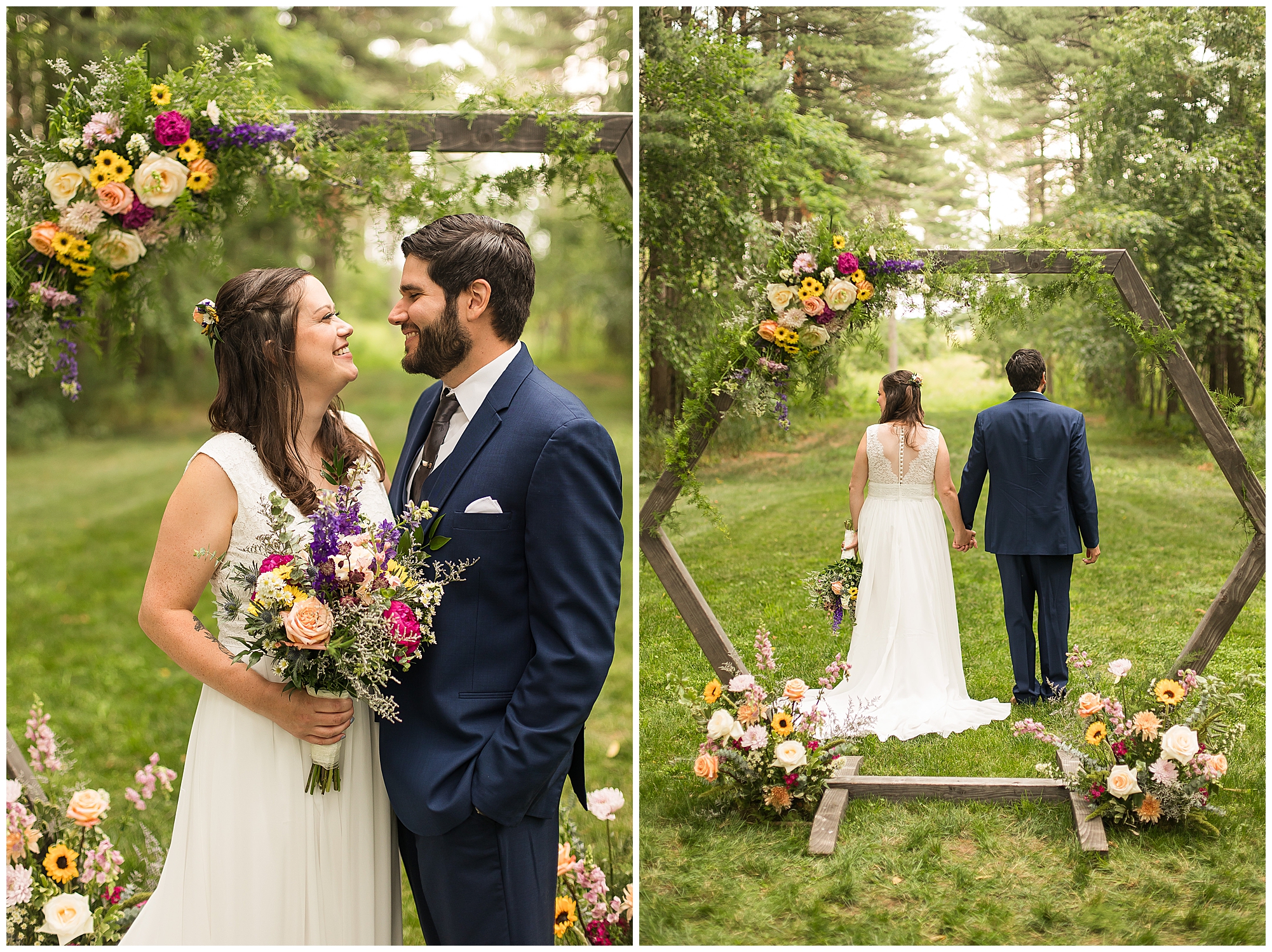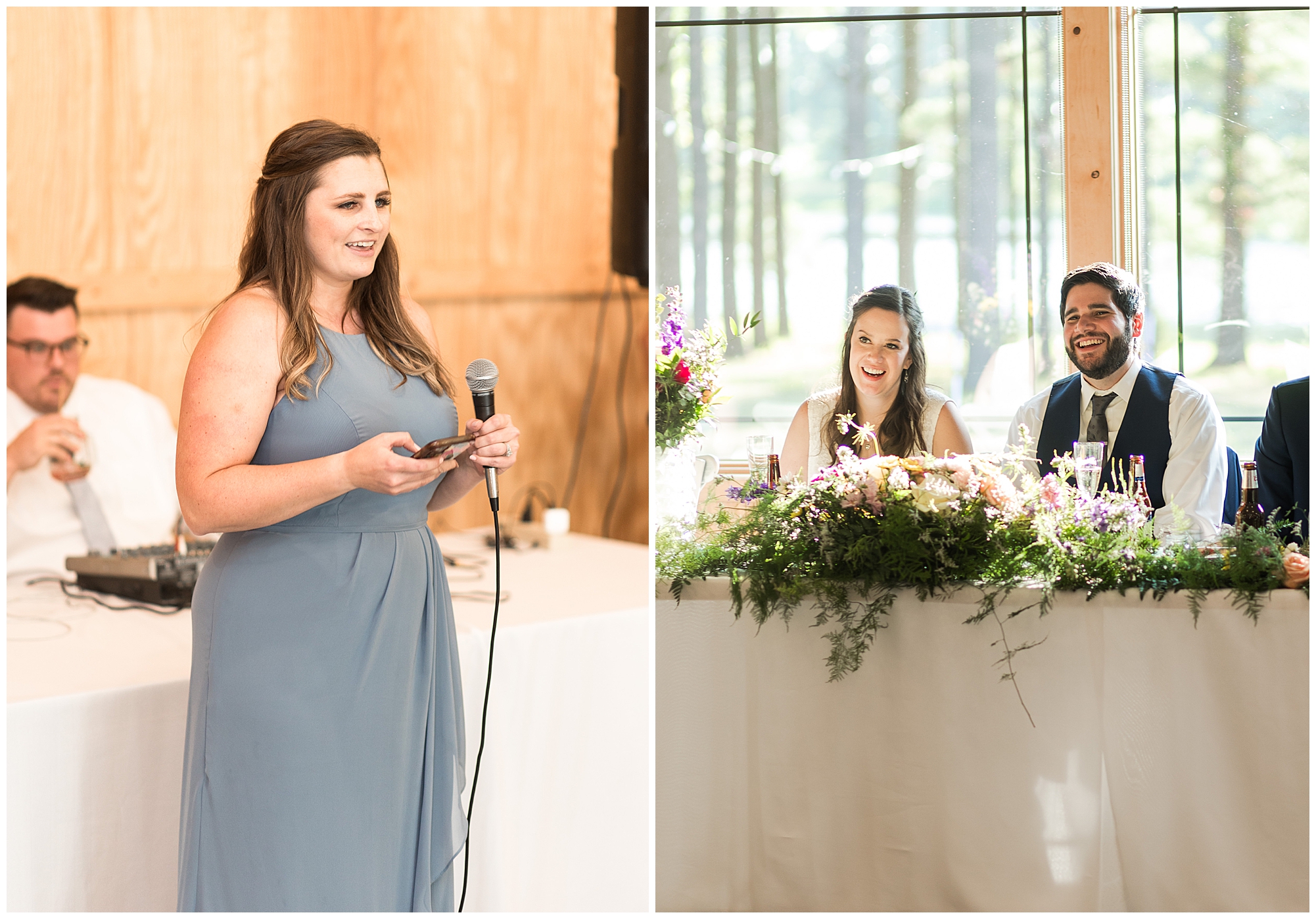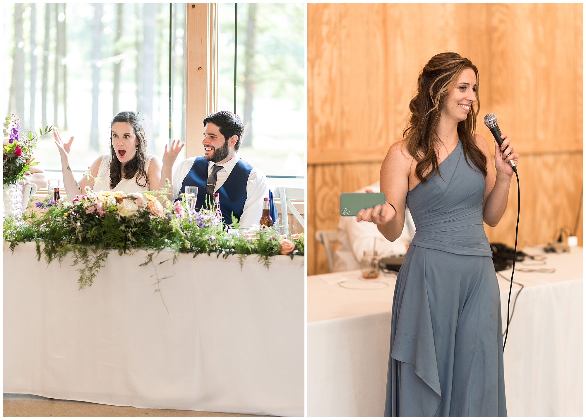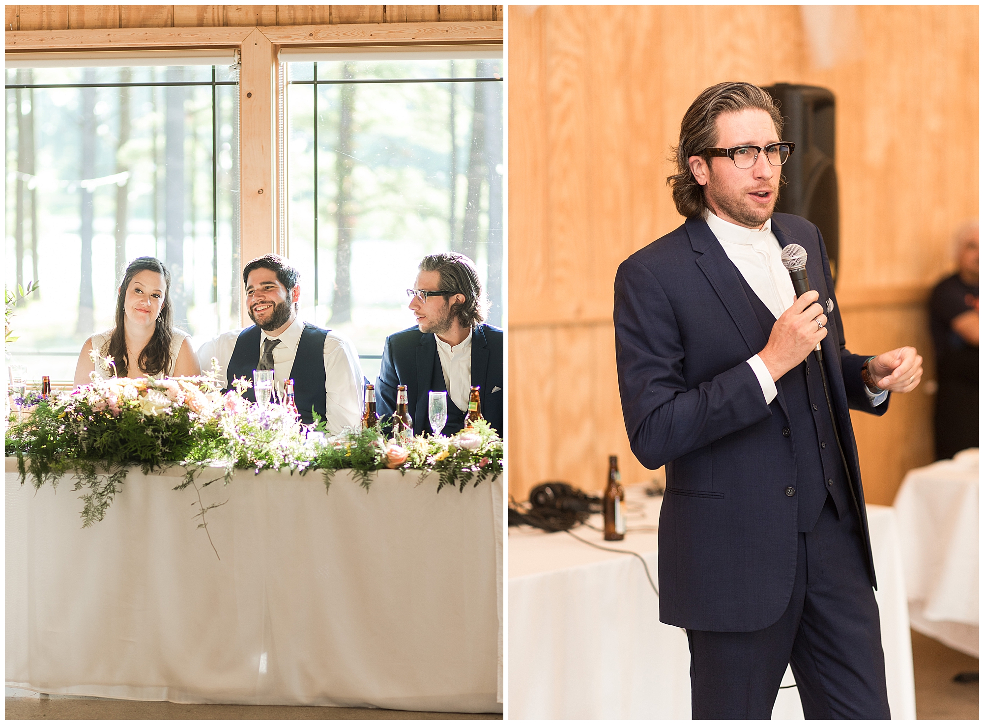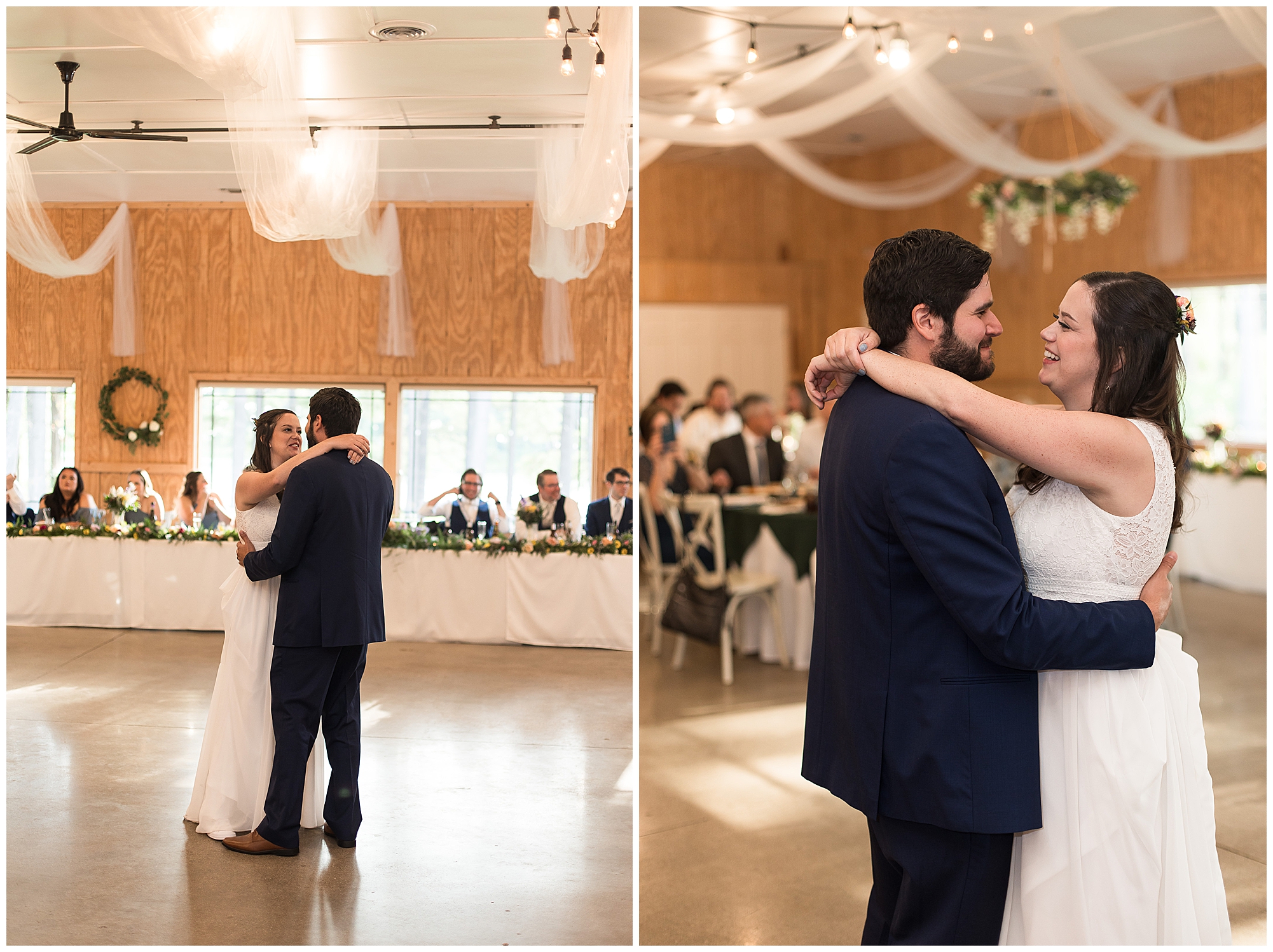 The ceremony was set in a stunning spot with tall pine trees on either side of the floral covered arbor. It was truly a magical setting. Caitlin made her way down the aisle arm in arm with her father towards an awaiting Jake, who couldn’t have wiped the smile off his face if he tried. Jake’s brother performed the nuptials with sweet sentiments with a bit of humor sprinkled in. Caitlin and Jake exchanged vows, rings, and a kiss to seal the deal! Congrats, Mr. & Mrs. Wagner! May I also mention, that throughout the day, everyone was keeping their eyes on the radar as a huge storm was threatening to ruin the day right around ceremony time. However, due to so many prayers and the trust this couple had to move forward with their plans, the storm literally split and went right around the venue. We did get rain during the cocktail hour, but after a quick shower, the sun came back out until it was dark. You know they say rain on your wedding day is good luck!
