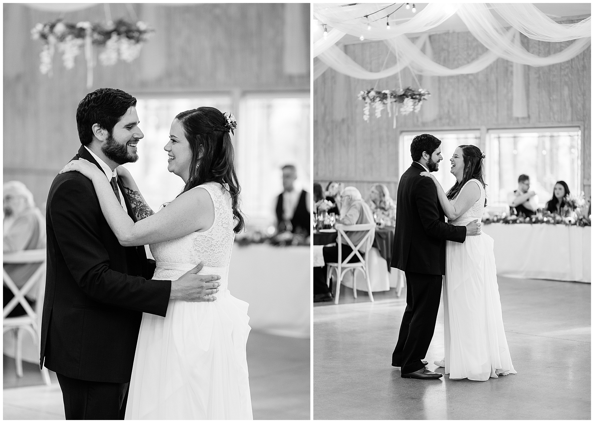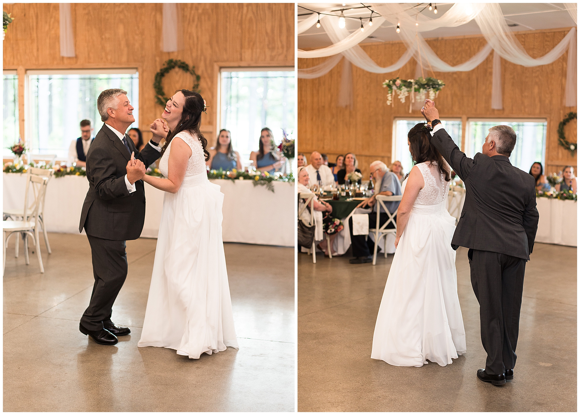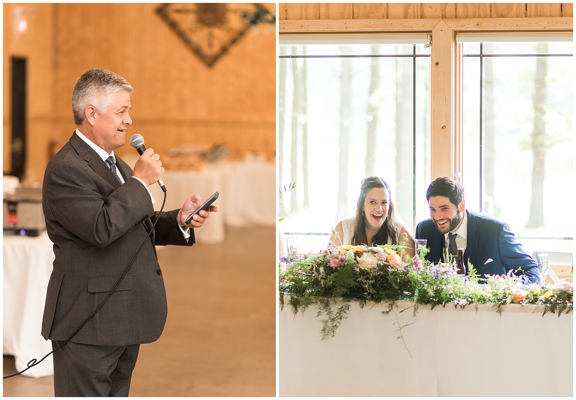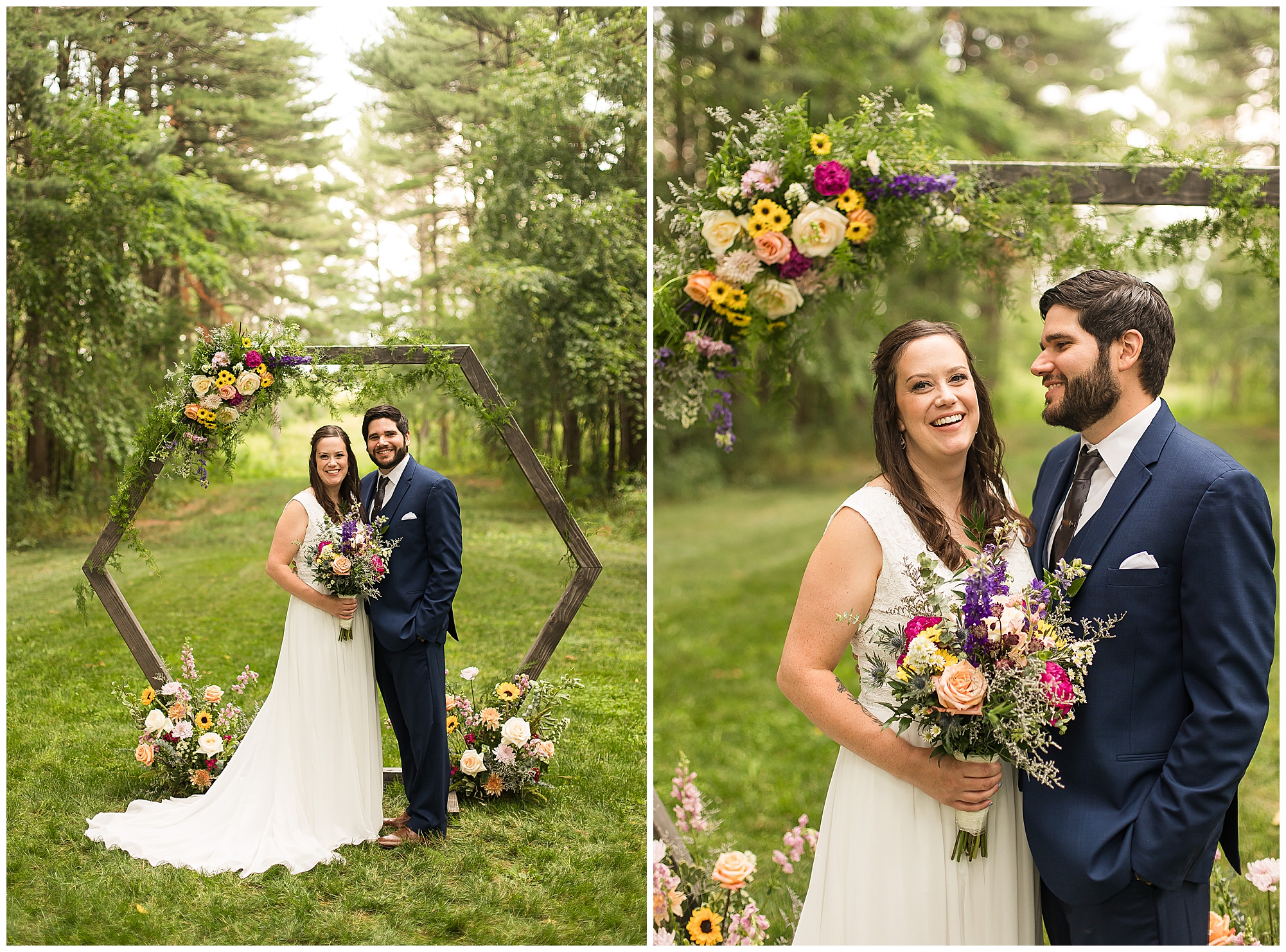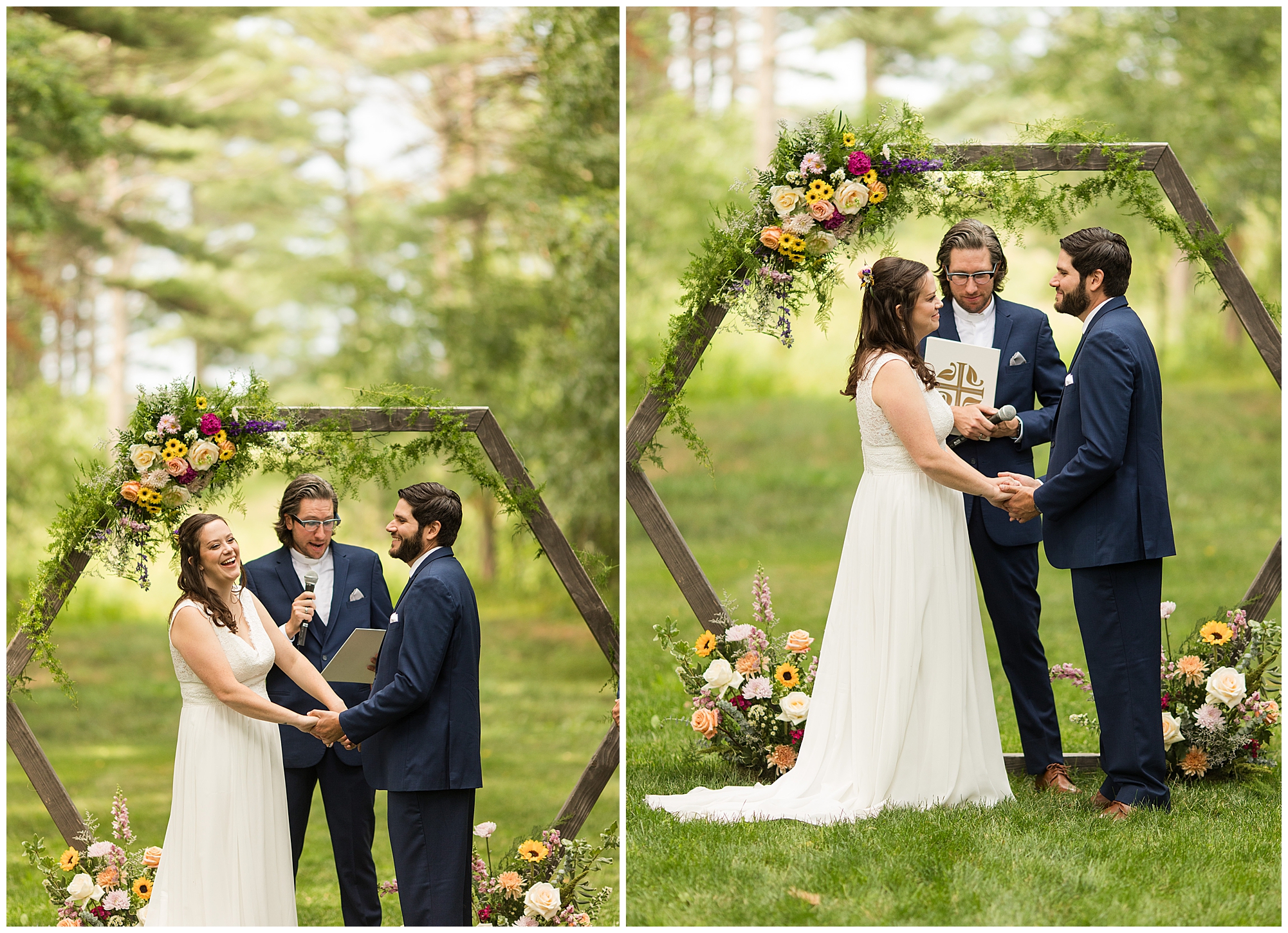 The ceremony was set in a stunning spot with tall pine trees on either side of the floral covered arbor. It was truly a magical setting. Caitlin made her way down the aisle arm in arm with her father towards an awaiting Jake, who couldn’t have wiped the smile off his face if he tried. Jake’s brother performed the nuptials with sweet sentiments with a bit of humor sprinkled in. Caitlin and Jake exchanged vows, rings, and a kiss to seal the deal! Congrats, Mr. & Mrs. Wagner! May I also mention, that throughout the day, everyone was keeping their eyes on the radar as a huge storm was threatening to ruin the day right around ceremony time. However, due to so many prayers and the trust this couple had to move forward with their plans, the storm literally split and went right around the venue. We did get rain during the cocktail hour, but after a quick shower, the sun came back out until it was dark. You know they say rain on your wedding day is good luck!