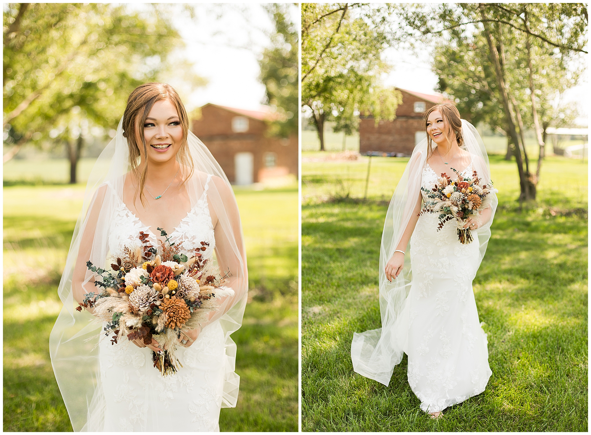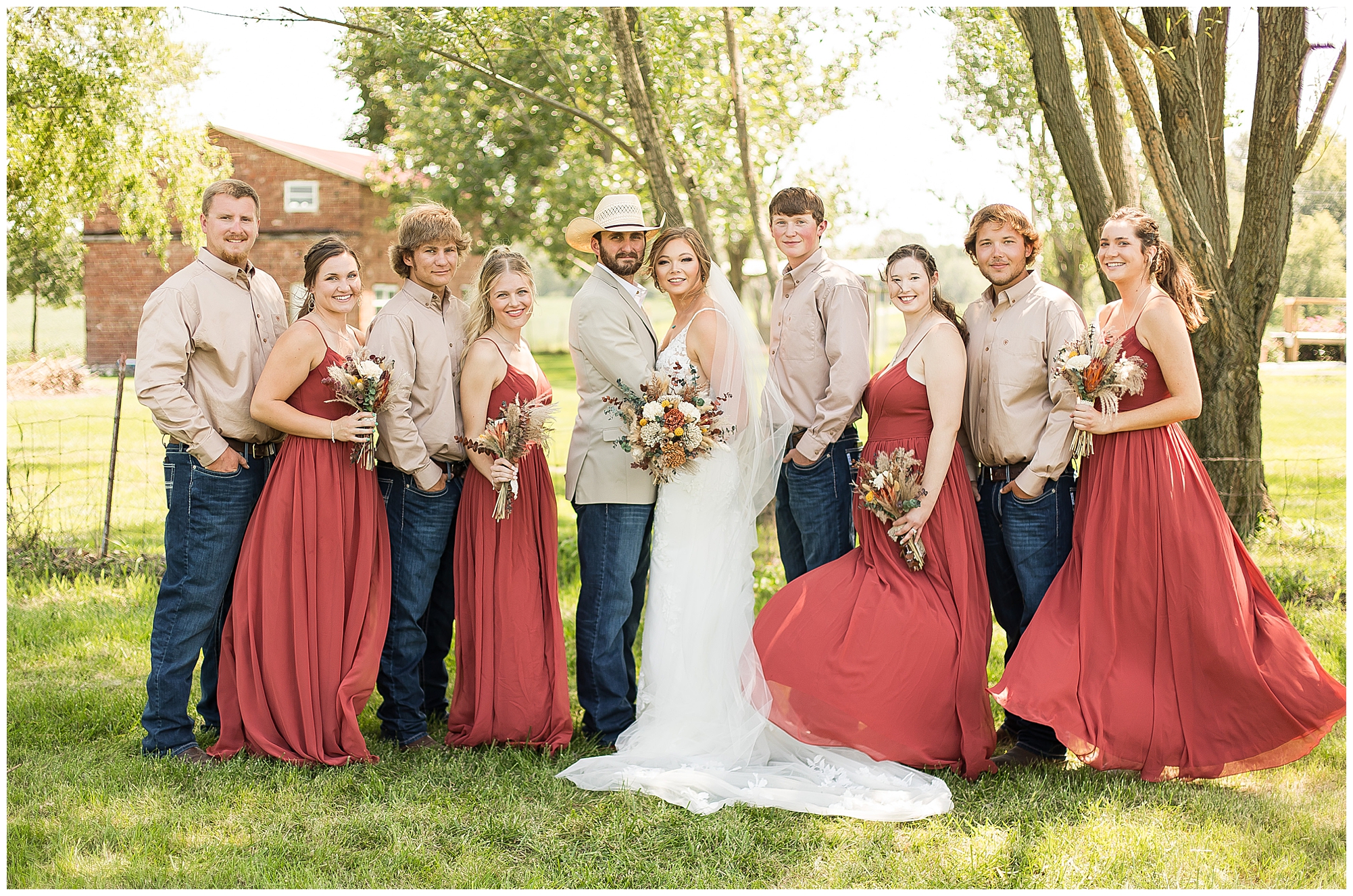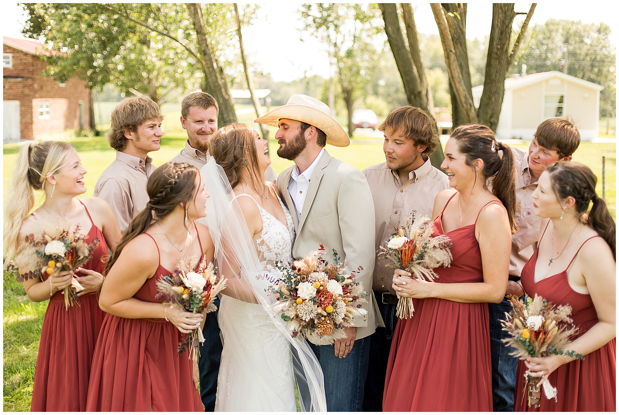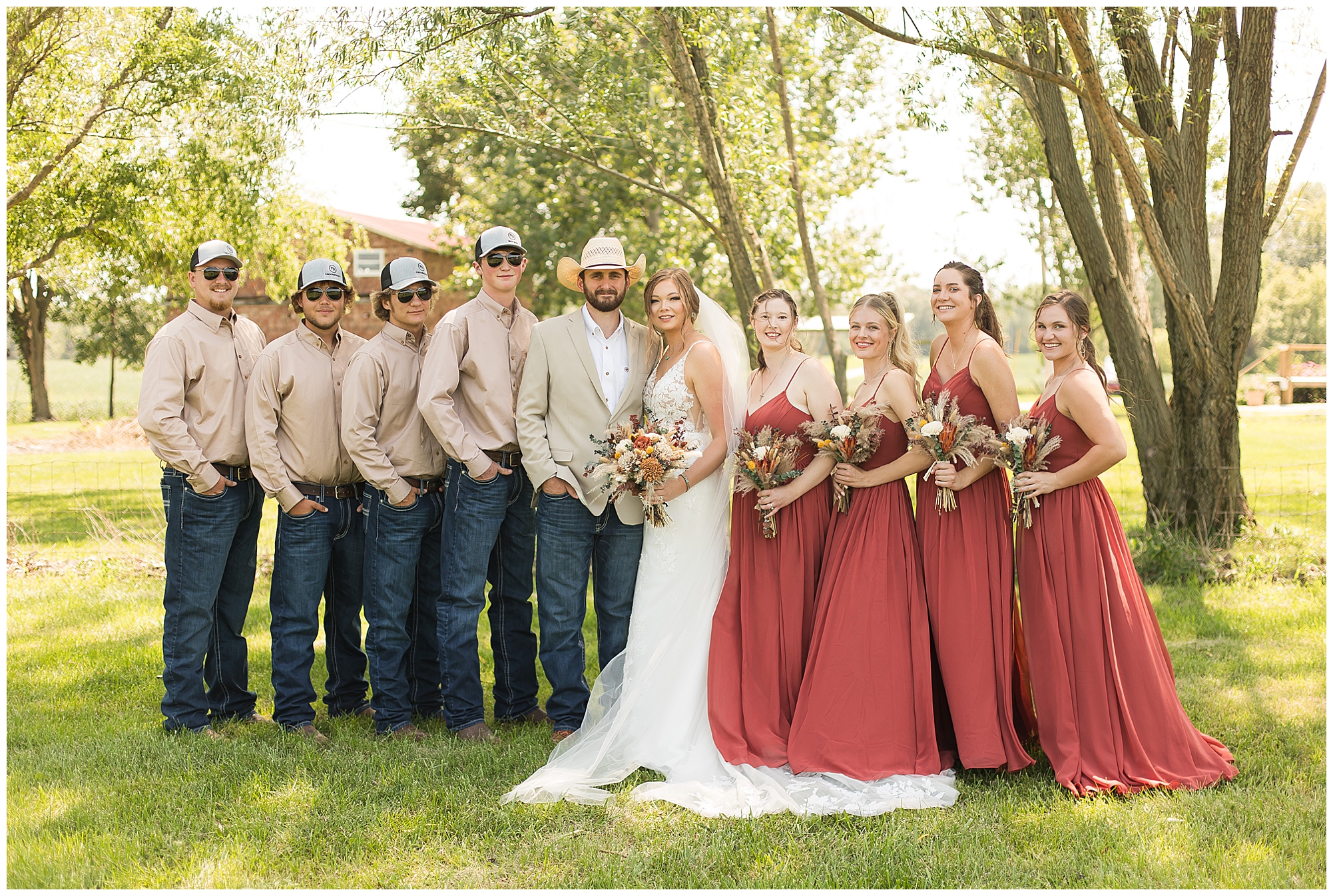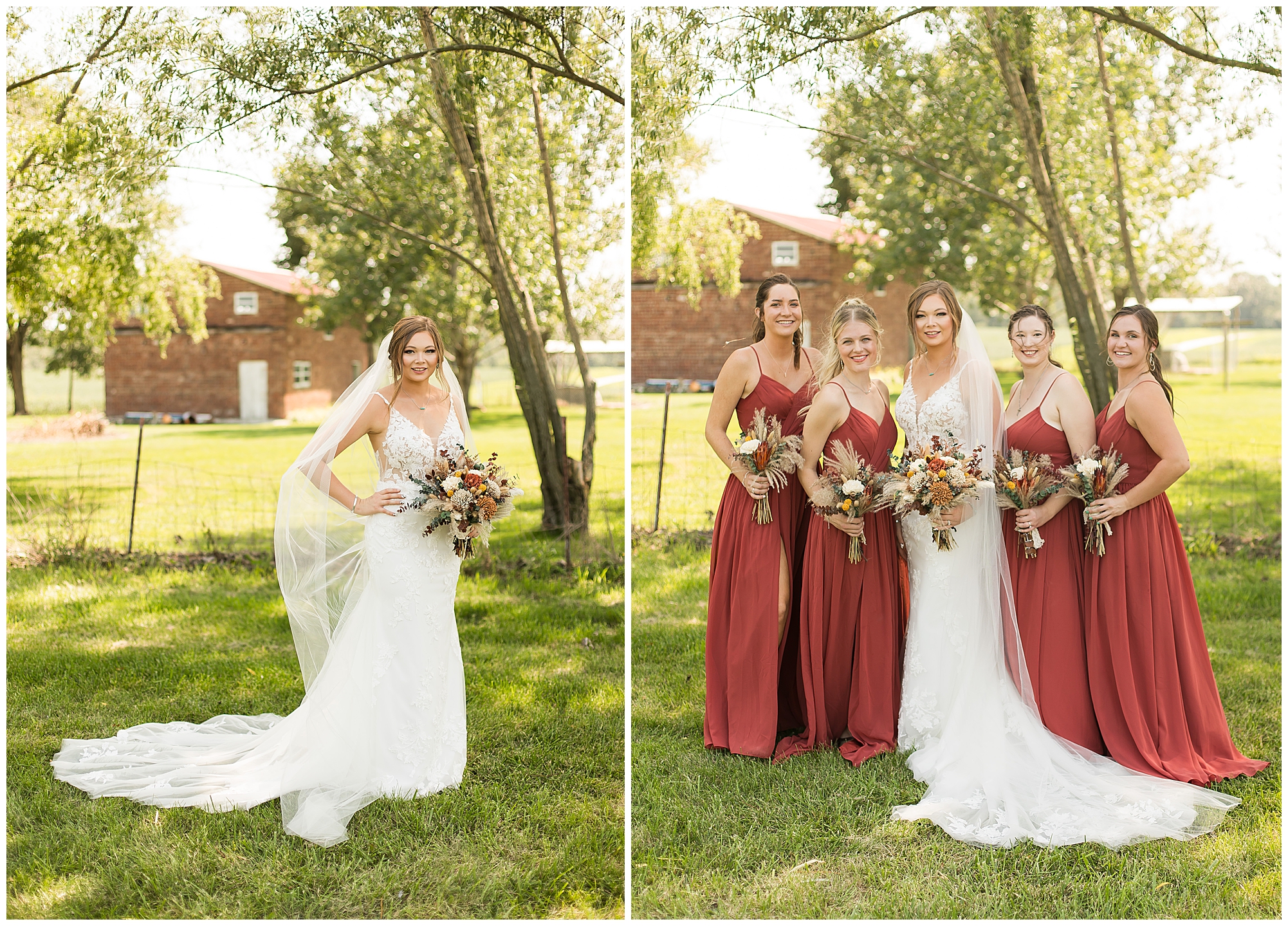 Becca and Trace’s rustic and rural wedding day was just want I imagined for these two. They both grew up or continue to work around the farm. They are a rodeo-loving couple, who takes every chance they can to show love to their support systems. And they adore a good belt buckle bigger than the state of Illinois! Becca and Trace are the epitome of what it means to be laid back and go with the flow. Which is what makes me love them so much! I began the beautiful mid-August day with Becca and her ladies as they were getting their hair and makeup done. This bride was all smiles and couldn’t have been more excited about what the future holds. Luckily for me, I have worked with Becca years before her special day, when I photographed her brother, Nathan’s wedding to Jenny. So I have been very much looking forward to seeing all of her family again. The lovely burnt orange bridesmaids dresses and pops of creams and turquoise were throughout the accessories and bride’s details. When it came time to get Becca dressed she was absolutely stunning in her floral appliqué gown with hints of sparkles and leaf embroidery. When she added the cathedral length veil, which was her something borrowed from her sister-in-law, Jenny, she seriously could have been on the cover of a bridal magazine!