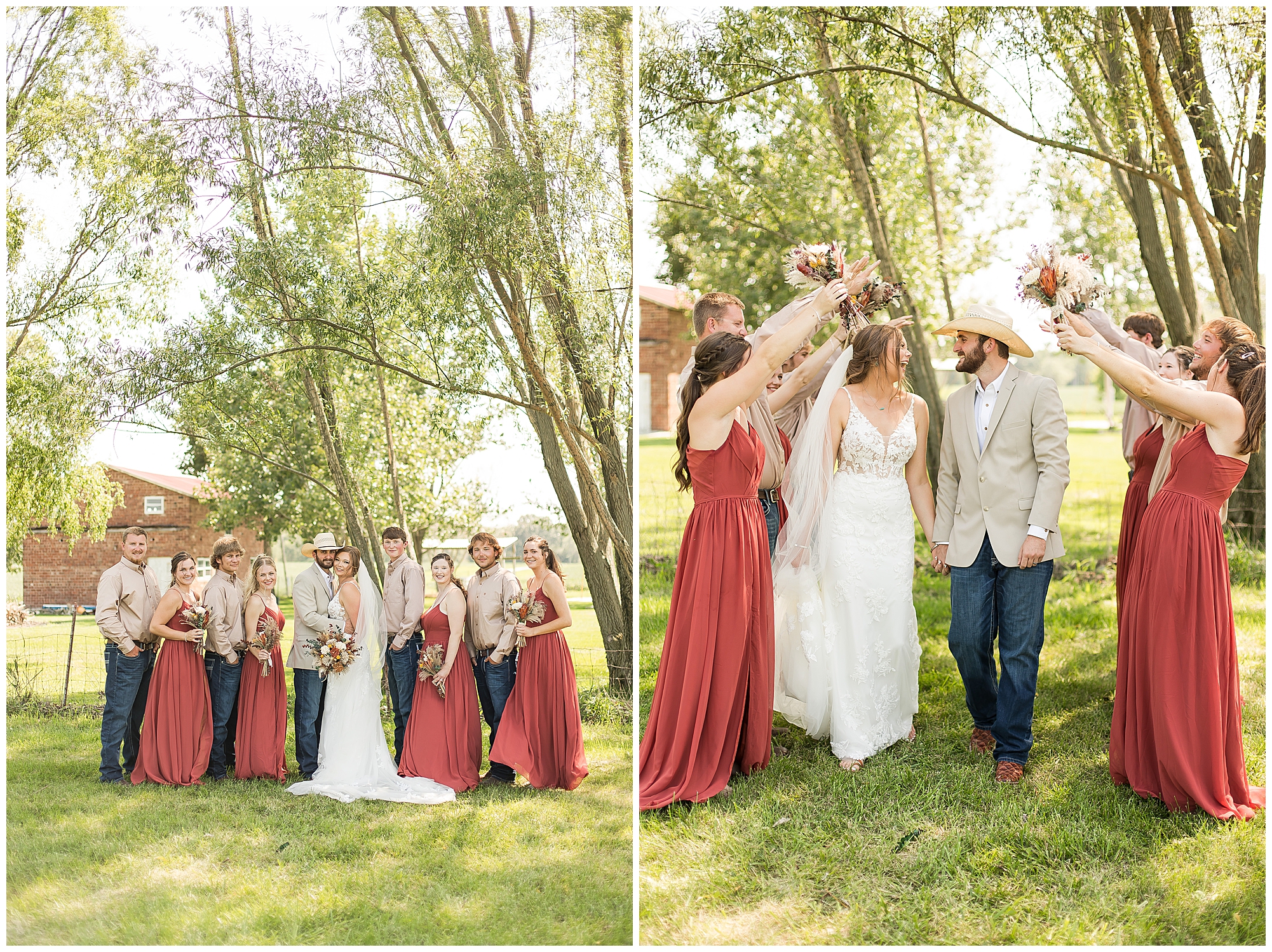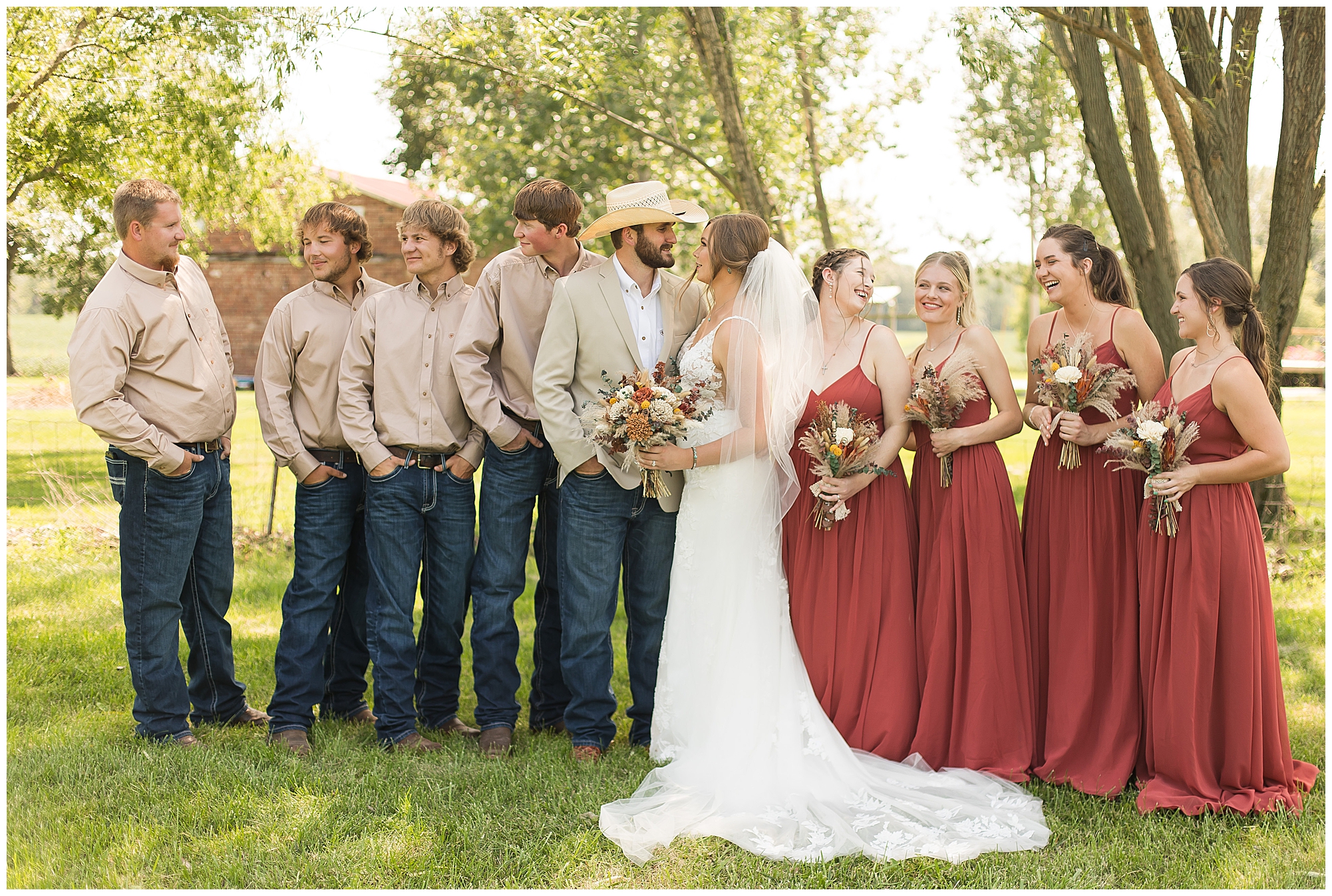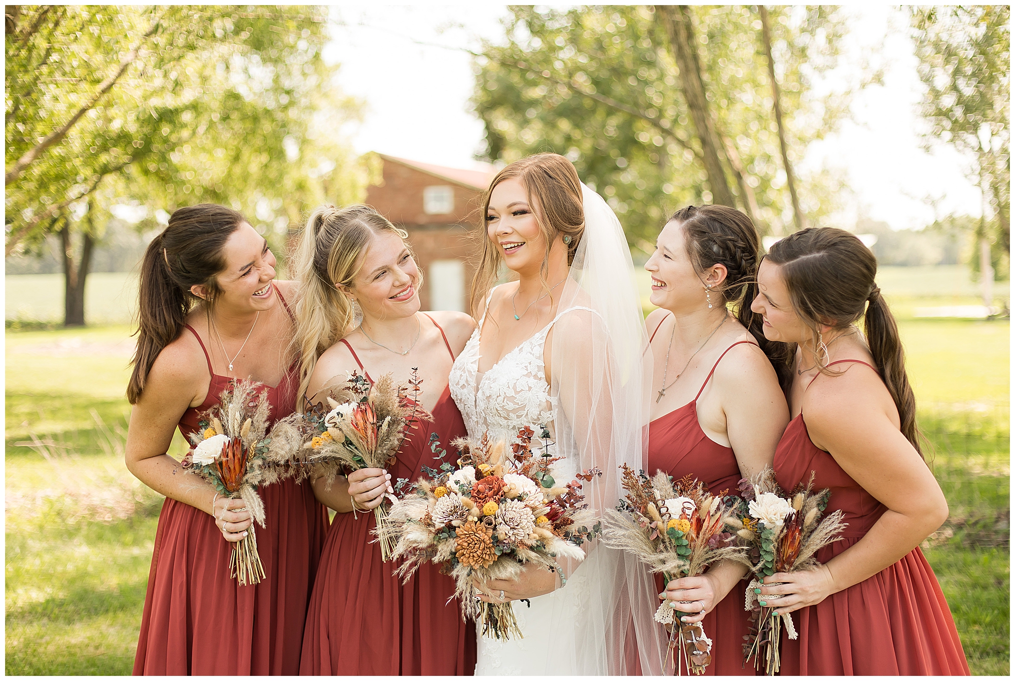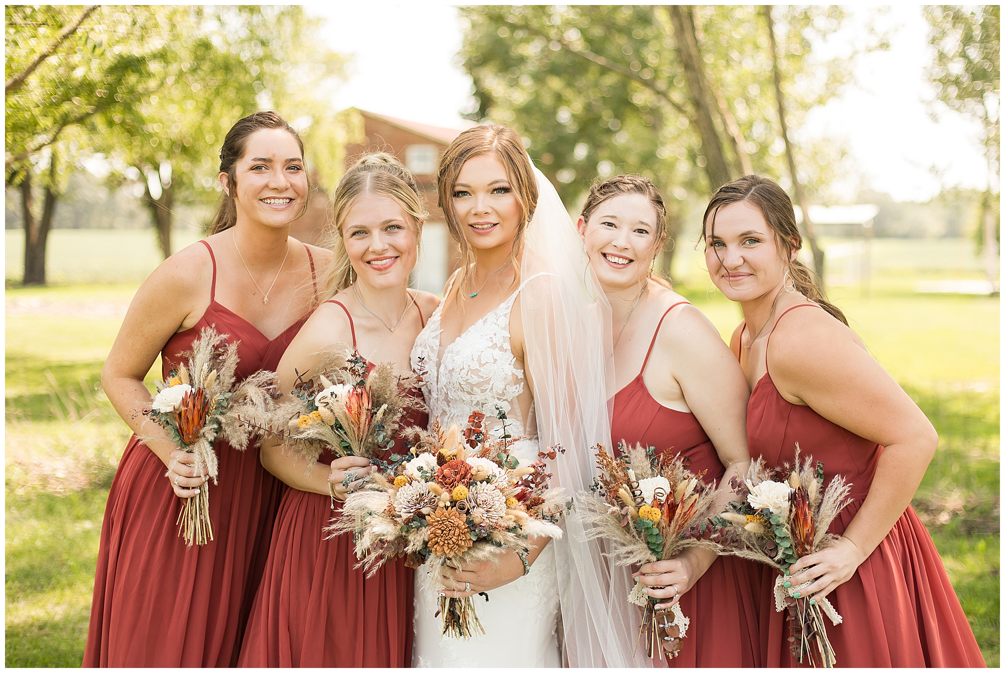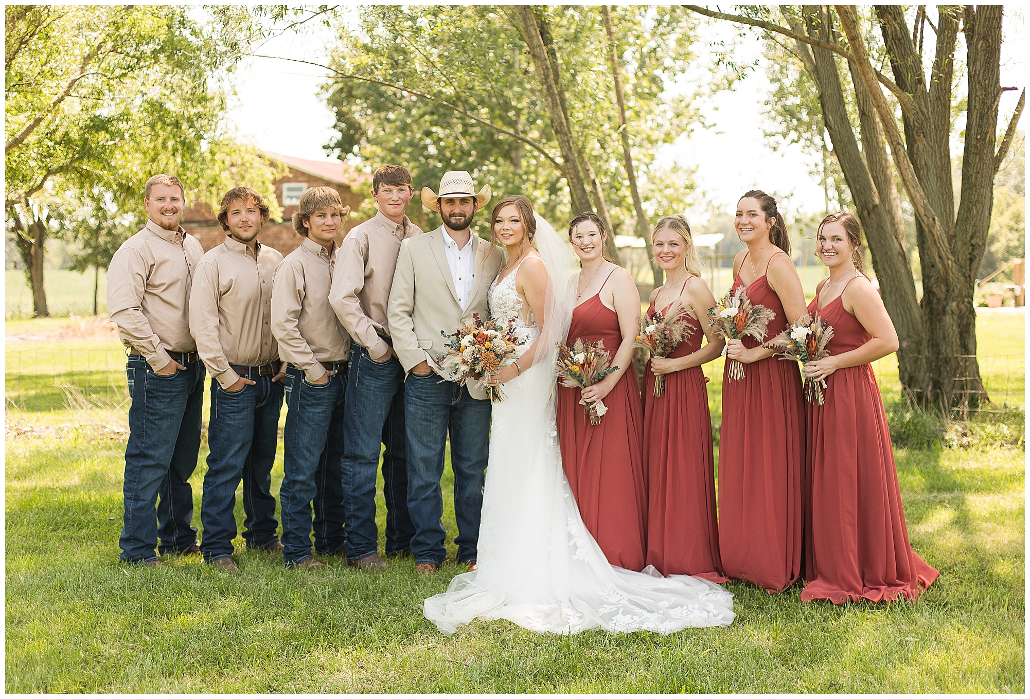 Becca and Trace’s rustic and rural wedding day was just want I imagined for these two. They both grew up or continue to work around the farm. They are a rodeo-loving couple, who takes every chance they can to show love to their support systems. And they adore a good belt buckle bigger than the state of Illinois! Becca and Trace are the epitome of what it means to be laid back and go with the flow. Which is what makes me love them so much! I began the beautiful mid-August day with Becca and her ladies as they were getting their hair and makeup done. This bride was all smiles and couldn’t have been more excited about what the future holds. Luckily for me, I have worked with Becca years before her special day, when I photographed her brother, Nathan’s wedding to Jenny. So I have been very much looking forward to seeing all of her family again. The lovely burnt orange bridesmaids dresses and pops of creams and turquoise were throughout the accessories and bride’s details. When it came time to get Becca dressed she was absolutely stunning in her floral appliqué gown with hints of sparkles and leaf embroidery. When she added the cathedral length veil, which was her something borrowed from her sister-in-law, Jenny, she seriously could have been on the cover of a bridal magazine!