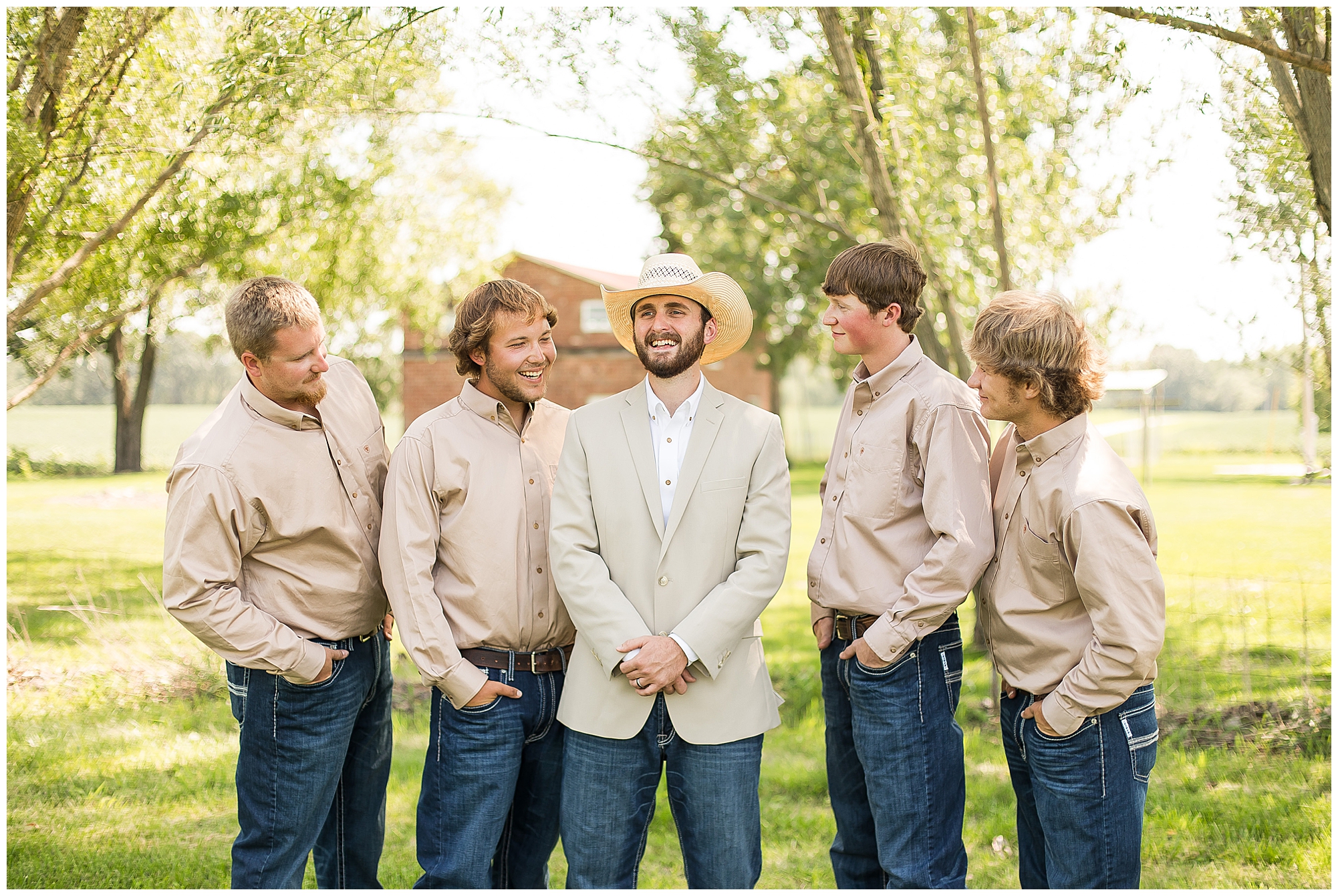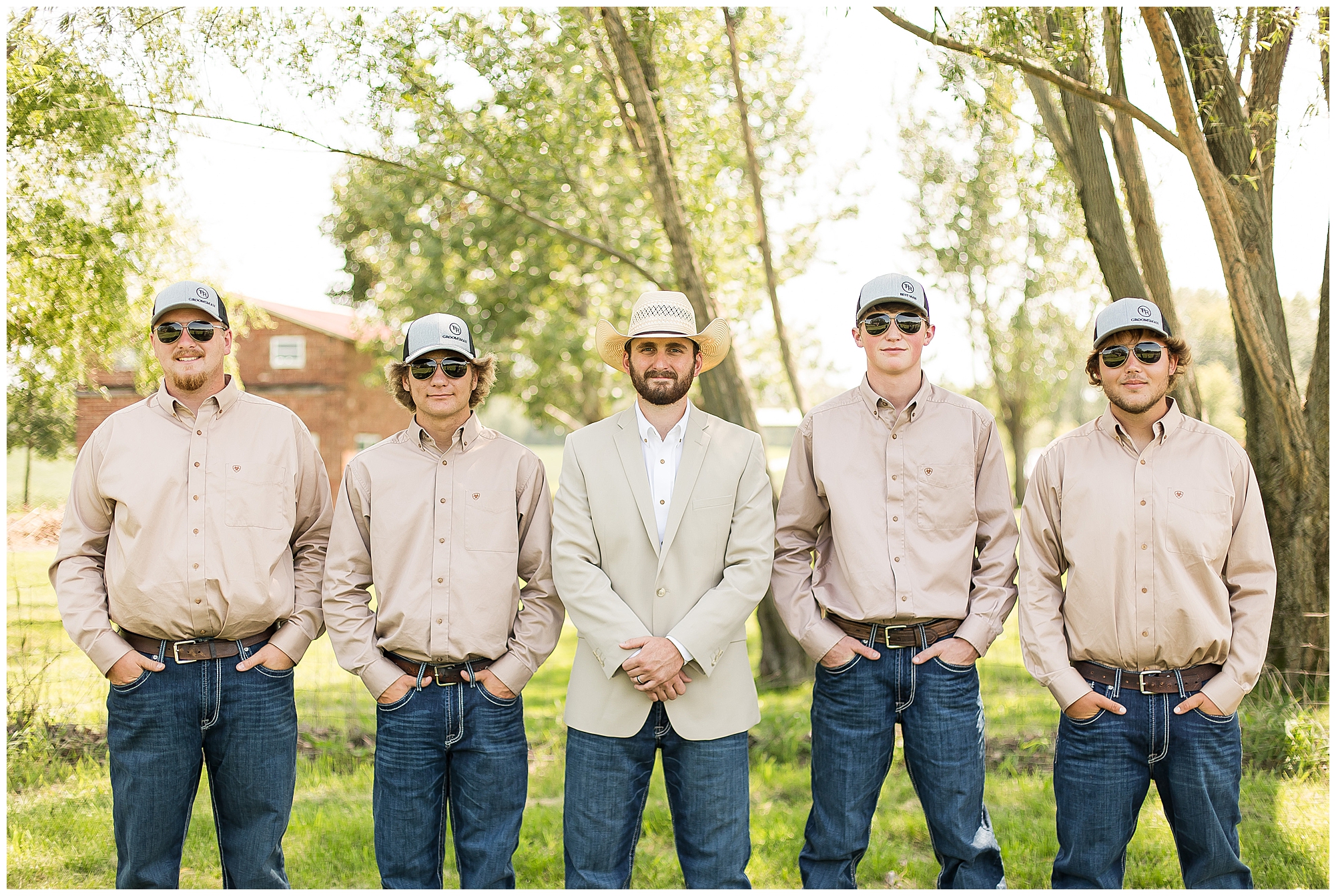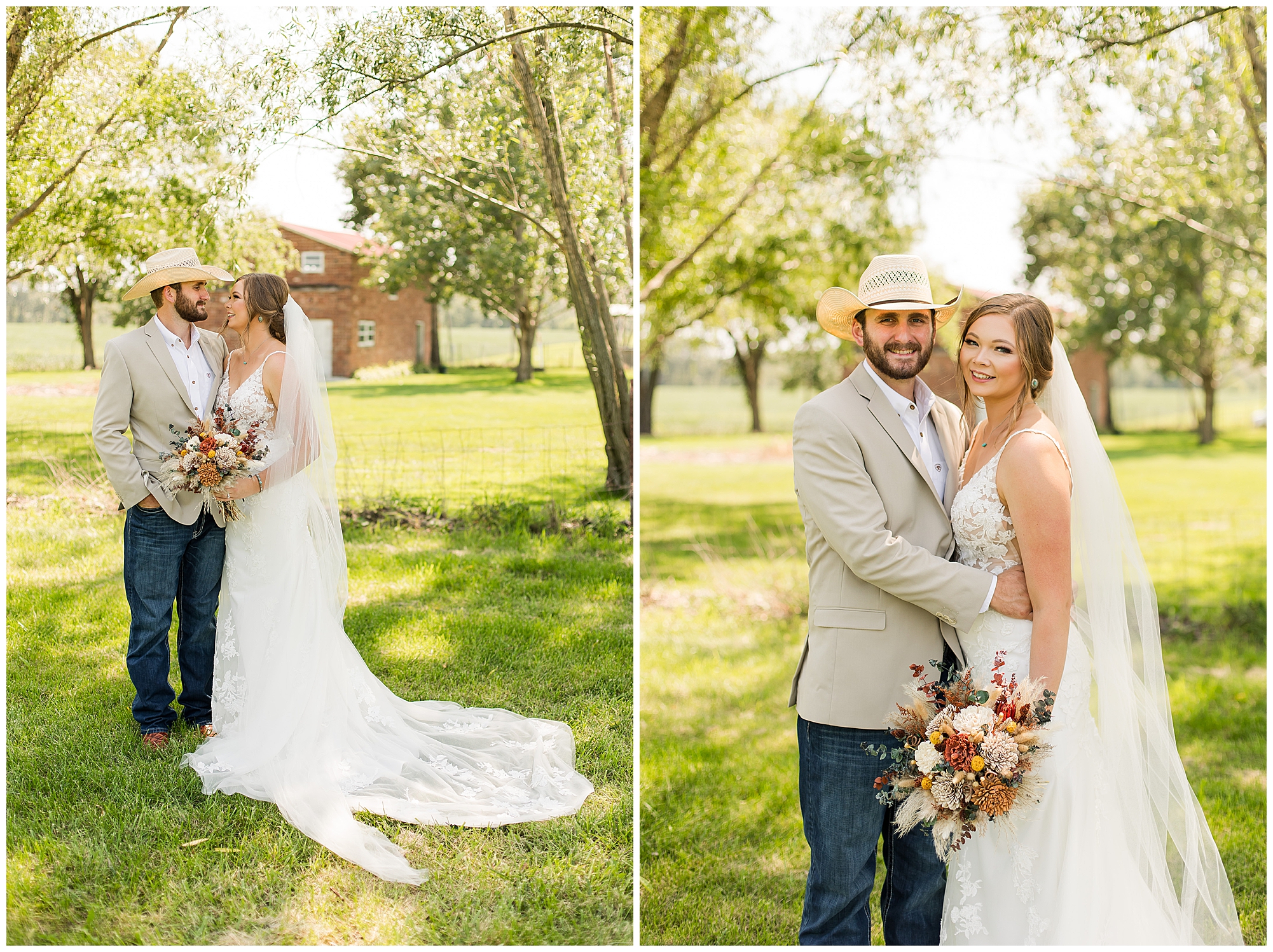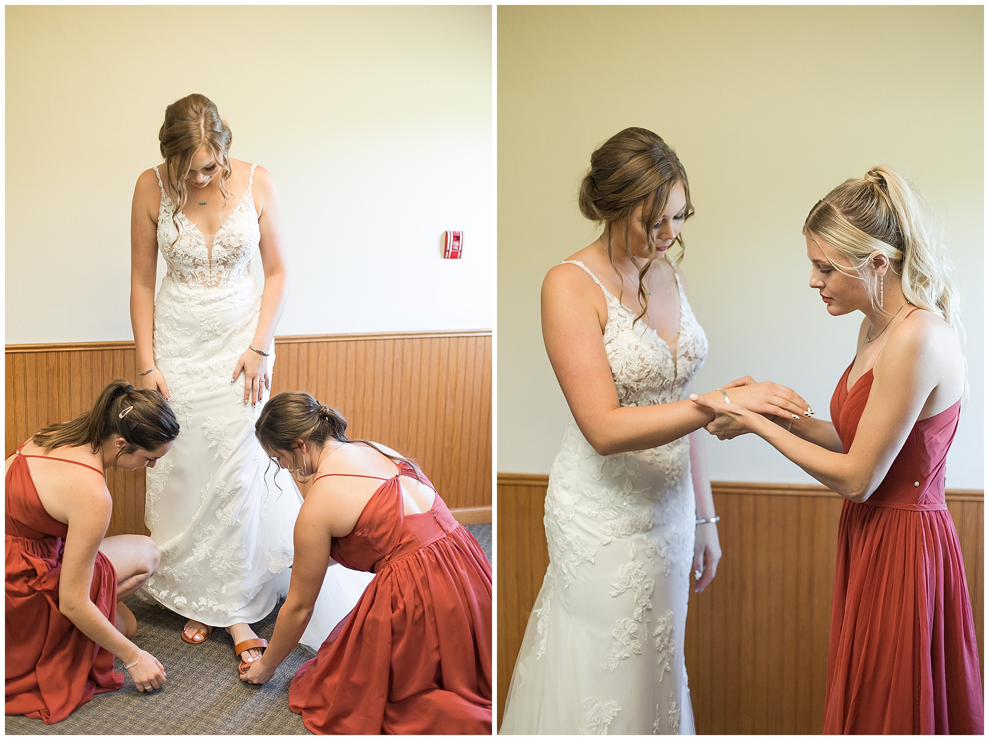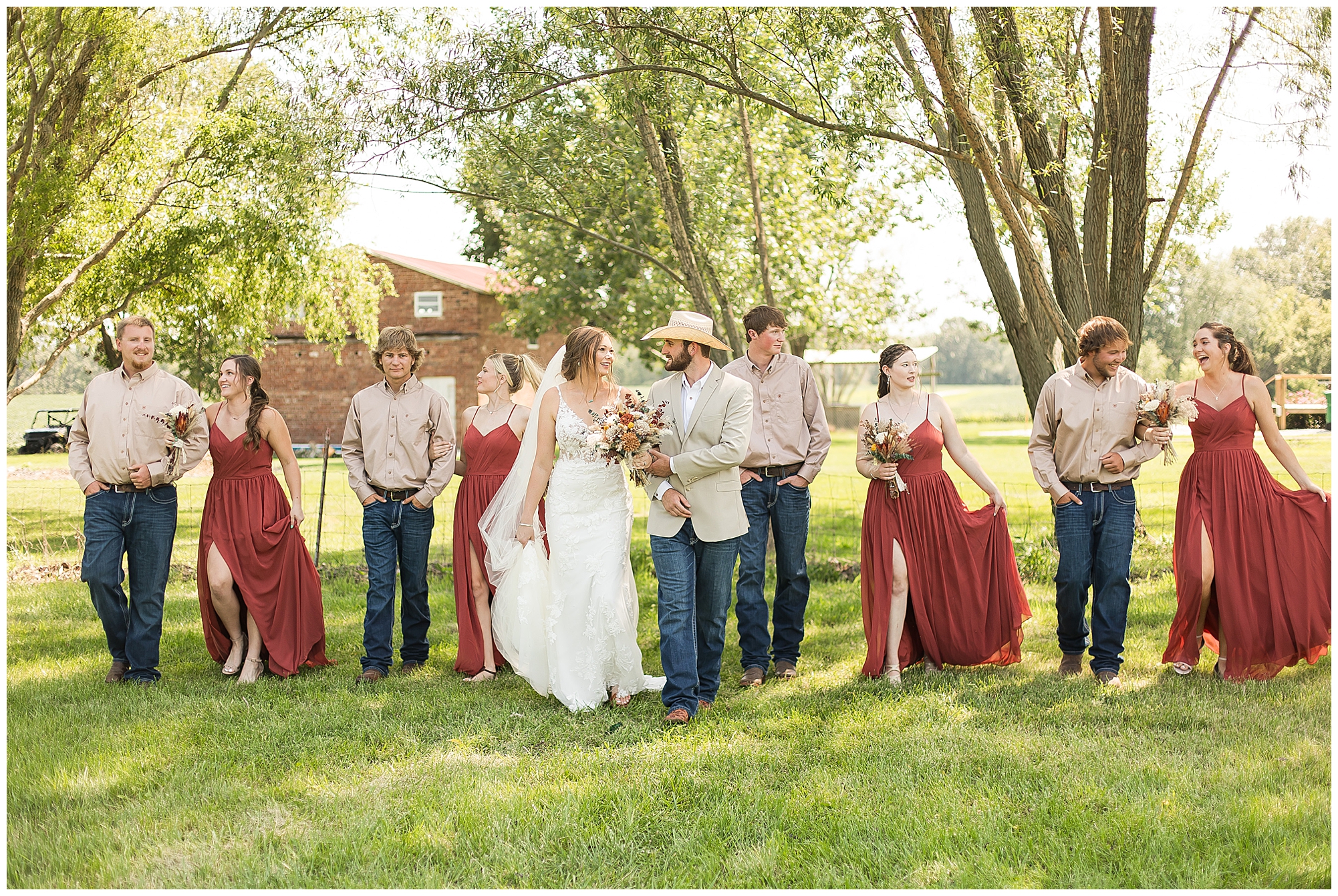 Becca and Trace’s rustic and rural wedding day was just want I imagined for these two. They both grew up or continue to work around the farm. They are a rodeo-loving couple, who takes every chance they can to show love to their support systems. And they adore a good belt buckle bigger than the state of Illinois! Becca and Trace are the epitome of what it means to be laid back and go with the flow. Which is what makes me love them so much! I began the beautiful mid-August day with Becca and her ladies as they were getting their hair and makeup done. This bride was all smiles and couldn’t have been more excited about what the future holds. Luckily for me, I have worked with Becca years before her special day, when I photographed her brother, Nathan’s wedding to Jenny. So I have been very much looking forward to seeing all of her family again. The lovely burnt orange bridesmaids dresses and pops of creams and turquoise were throughout the accessories and bride’s details. When it came time to get Becca dressed she was absolutely stunning in her floral appliqué gown with hints of sparkles and leaf embroidery. When she added the cathedral length veil, which was her something borrowed from her sister-in-law, Jenny, she seriously could have been on the cover of a bridal magazine!
