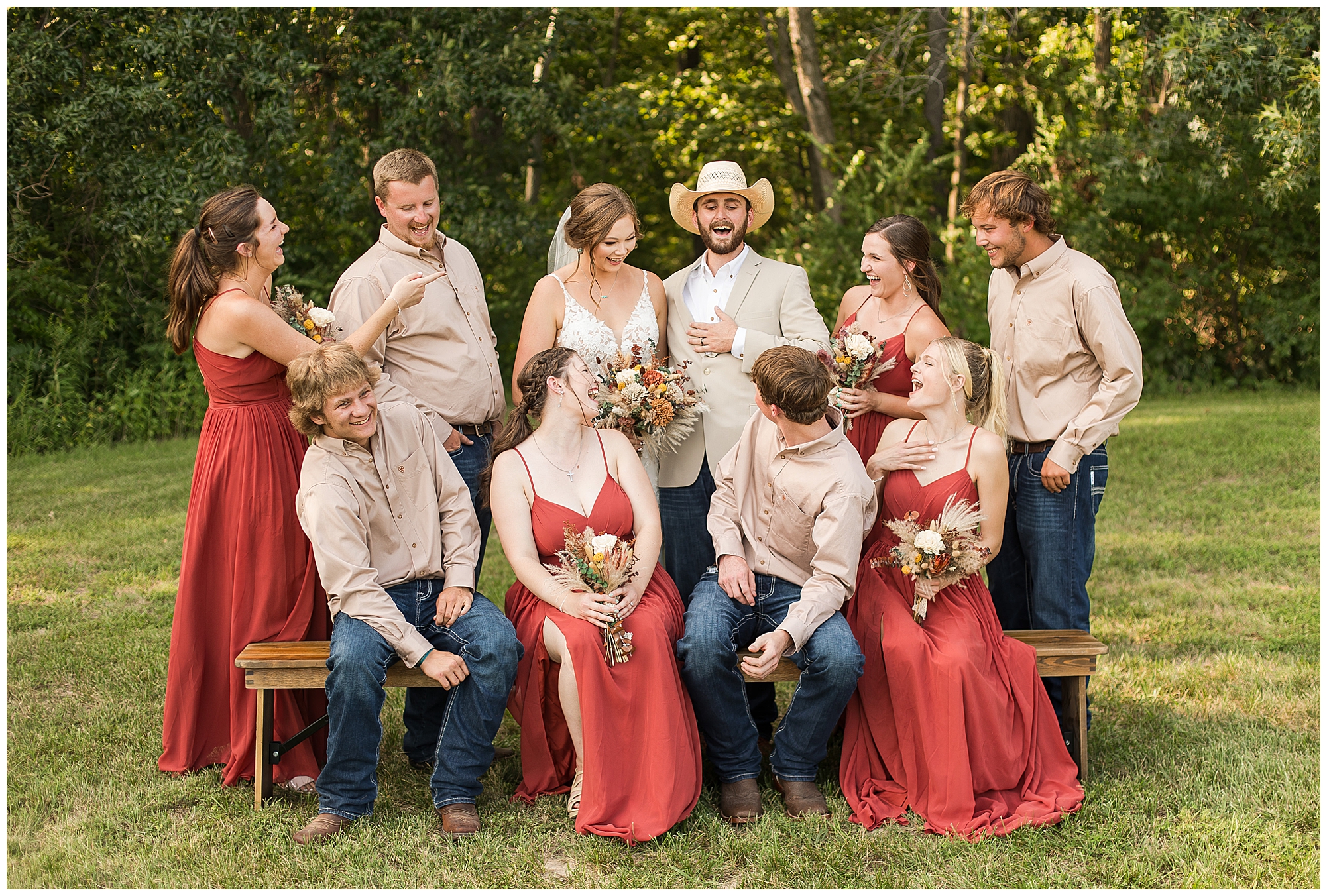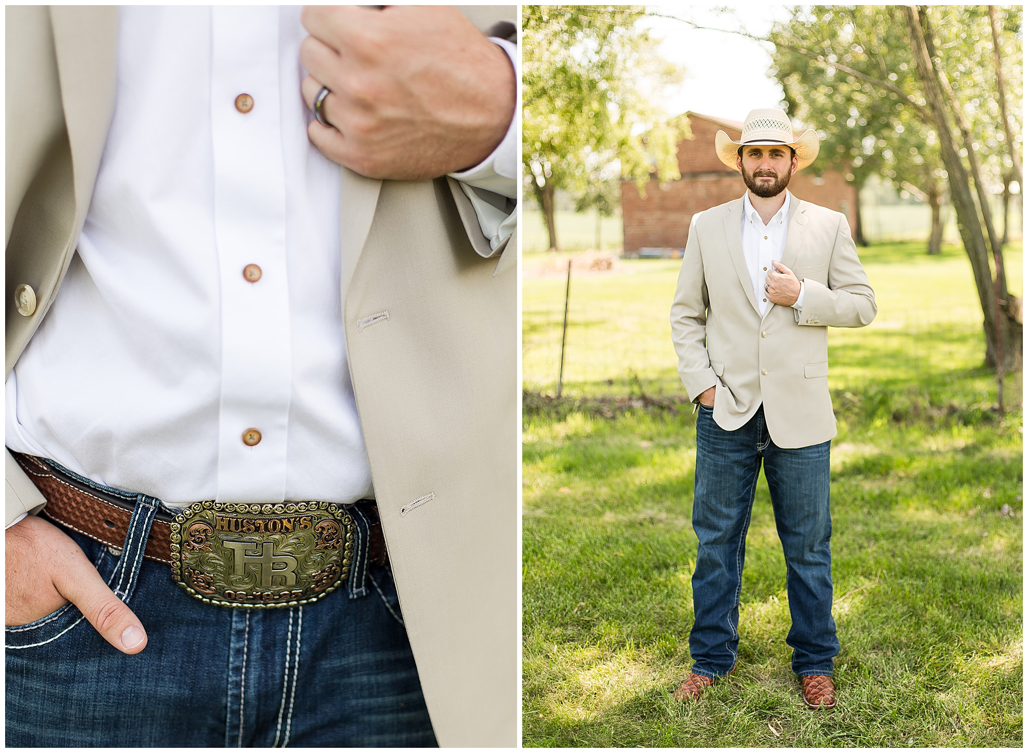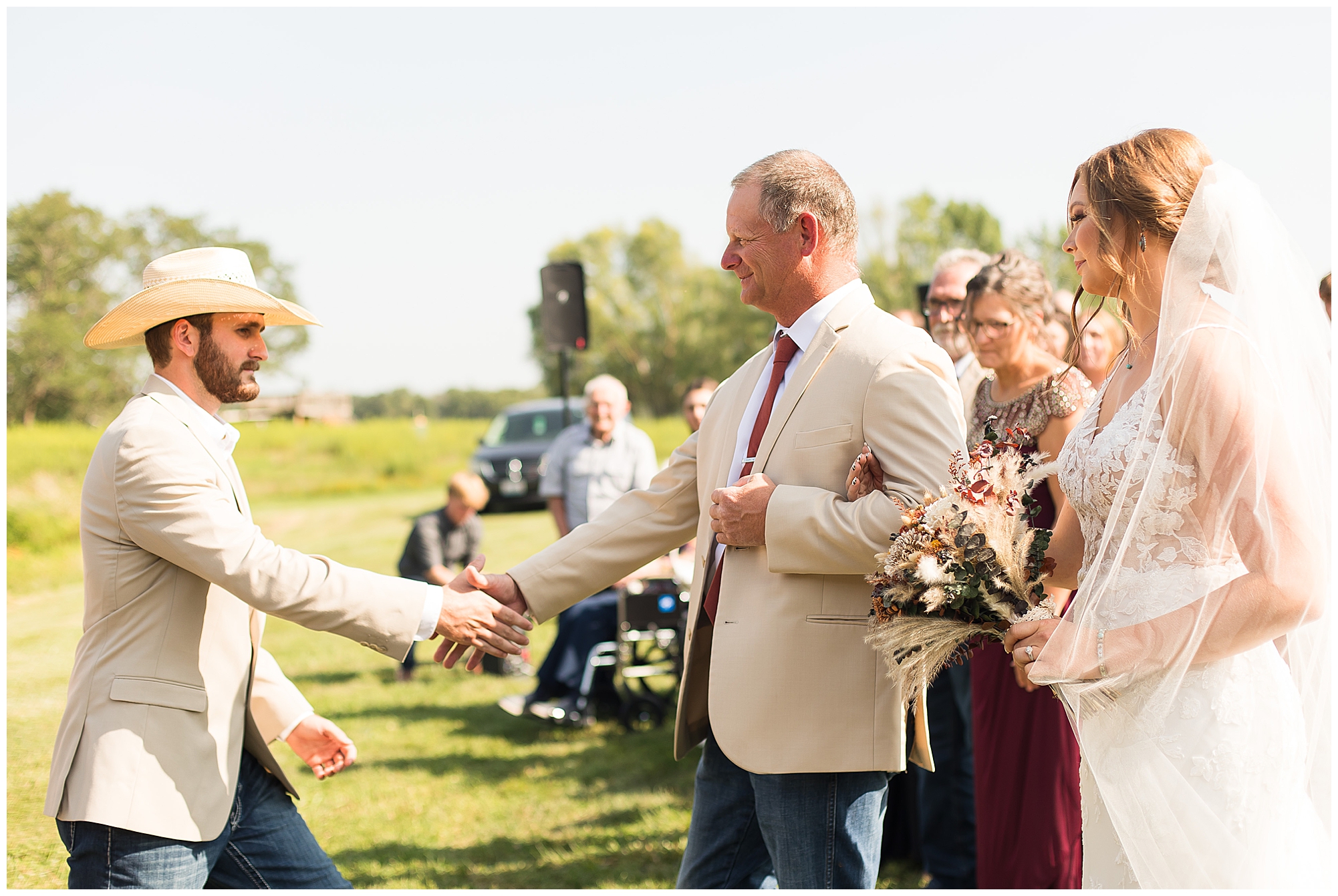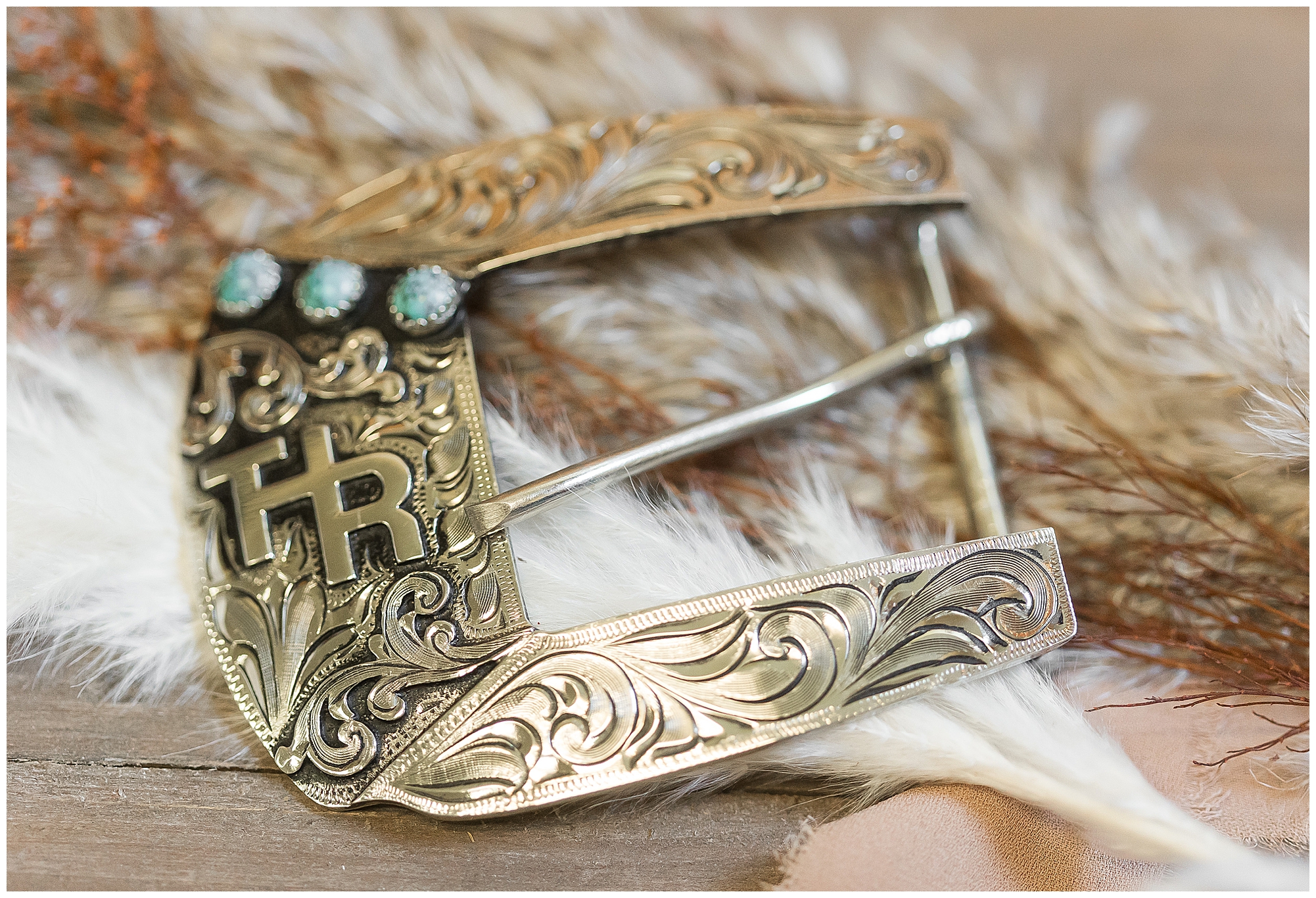 Becca and Trace’s rustic and rural wedding day was just want I imagined for these two. They both grew up or continue to work around the farm. They are a rodeo-loving couple, who takes every chance they can to show love to their support systems. And they adore a good belt buckle bigger than the state of Illinois! Becca and Trace are the epitome of what it means to be laid back and go with the flow. Which is what makes me love them so much! I began the beautiful mid-August day with Becca and her ladies as they were getting their hair and makeup done. This bride was all smiles and couldn’t have been more excited about what the future holds. Luckily for me, I have worked with Becca years before her special day, when I photographed her brother, Nathan’s wedding to Jenny. So I have been very much looking forward to seeing all of her family again. The lovely burnt orange bridesmaids dresses and pops of creams and turquoise were throughout the accessories and bride’s details. When it came time to get Becca dressed she was absolutely stunning in her floral appliqué gown with hints of sparkles and leaf embroidery. When she added the cathedral length veil, which was her something borrowed from her sister-in-law, Jenny, she seriously could have been on the cover of a bridal magazine!
