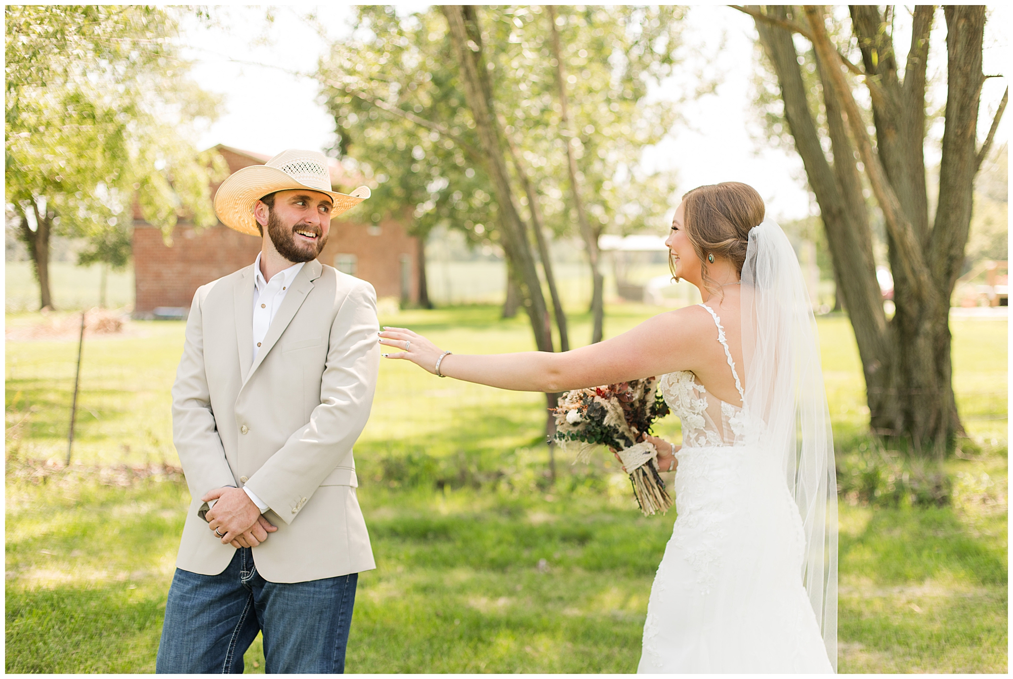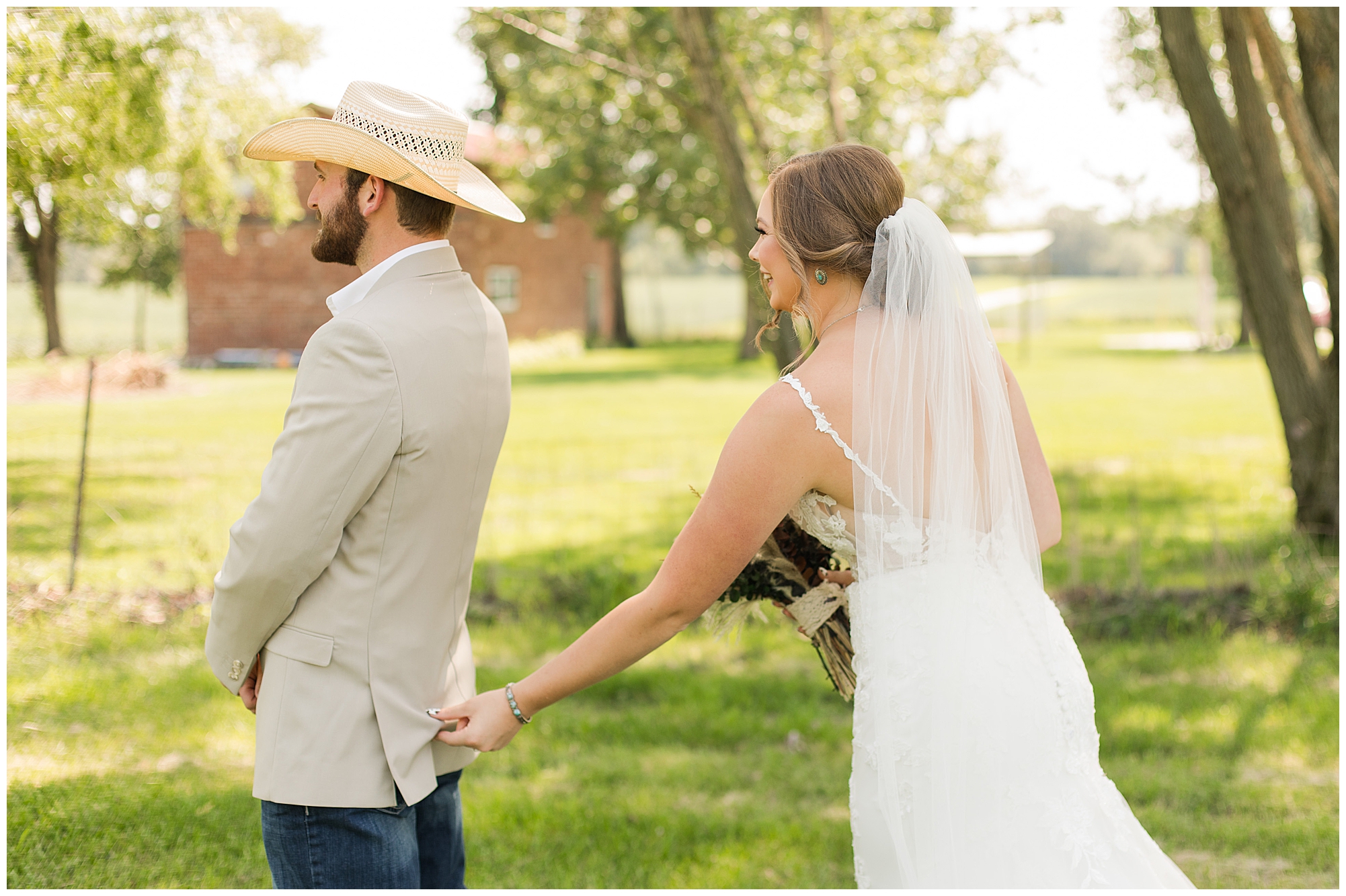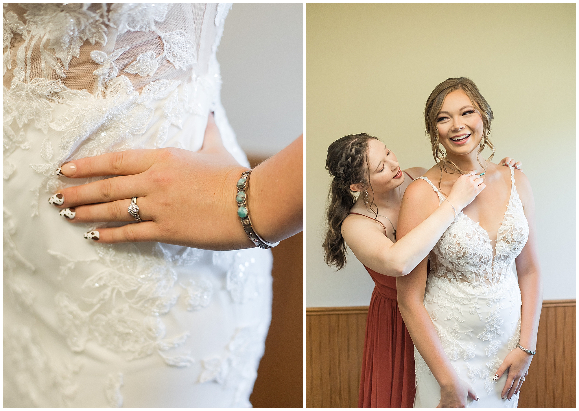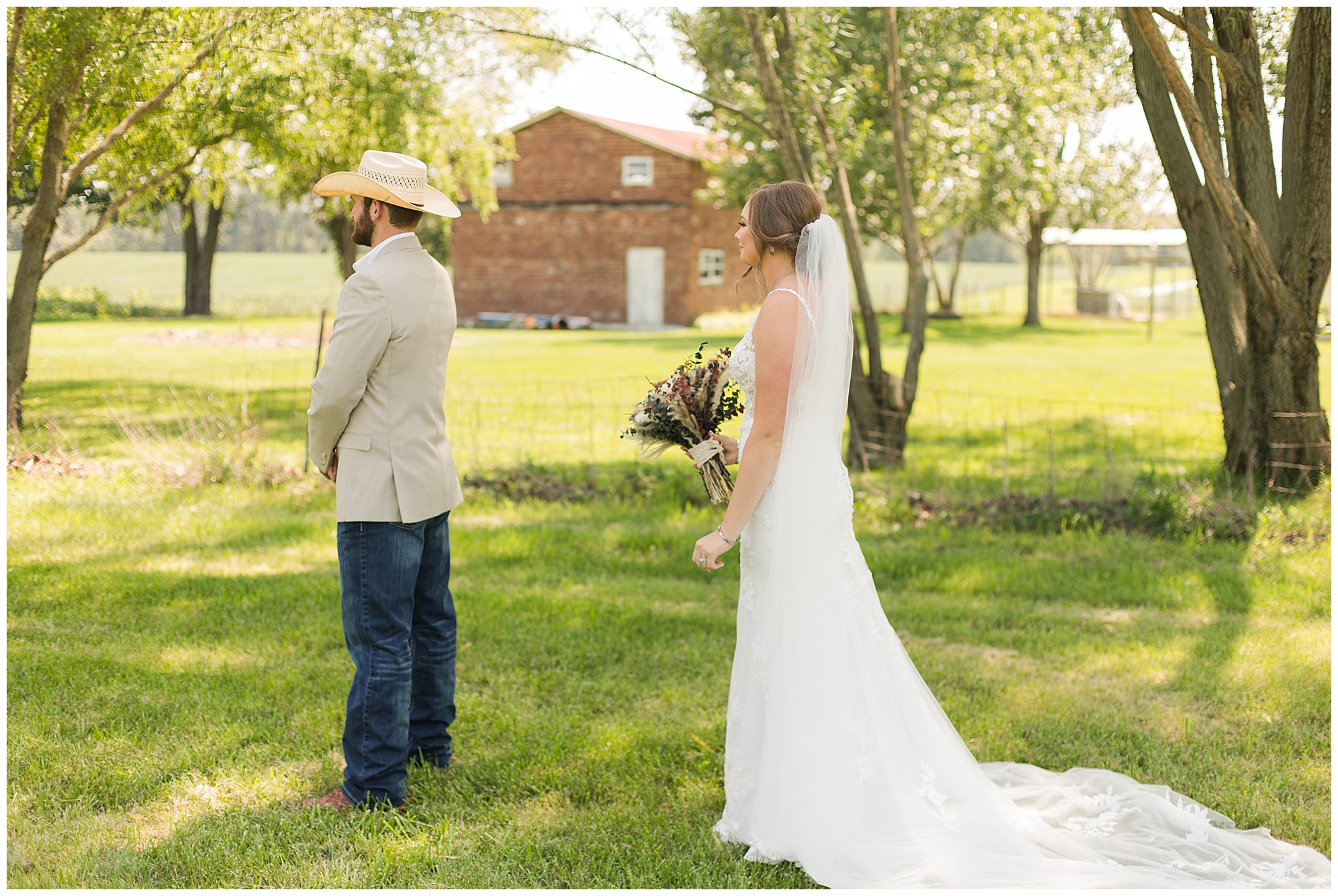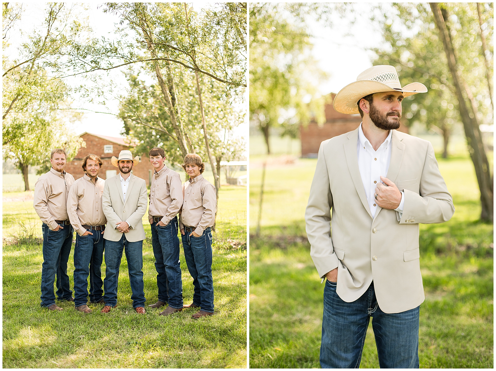 Becca and Trace’s rustic and rural wedding day was just want I imagined for these two. They both grew up or continue to work around the farm. They are a rodeo-loving couple, who takes every chance they can to show love to their support systems. And they adore a good belt buckle bigger than the state of Illinois! Becca and Trace are the epitome of what it means to be laid back and go with the flow. Which is what makes me love them so much! I began the beautiful mid-August day with Becca and her ladies as they were getting their hair and makeup done. This bride was all smiles and couldn’t have been more excited about what the future holds. Luckily for me, I have worked with Becca years before her special day, when I photographed her brother, Nathan’s wedding to Jenny. So I have been very much looking forward to seeing all of her family again. The lovely burnt orange bridesmaids dresses and pops of creams and turquoise were throughout the accessories and bride’s details. When it came time to get Becca dressed she was absolutely stunning in her floral appliqué gown with hints of sparkles and leaf embroidery. When she added the cathedral length veil, which was her something borrowed from her sister-in-law, Jenny, she seriously could have been on the cover of a bridal magazine!