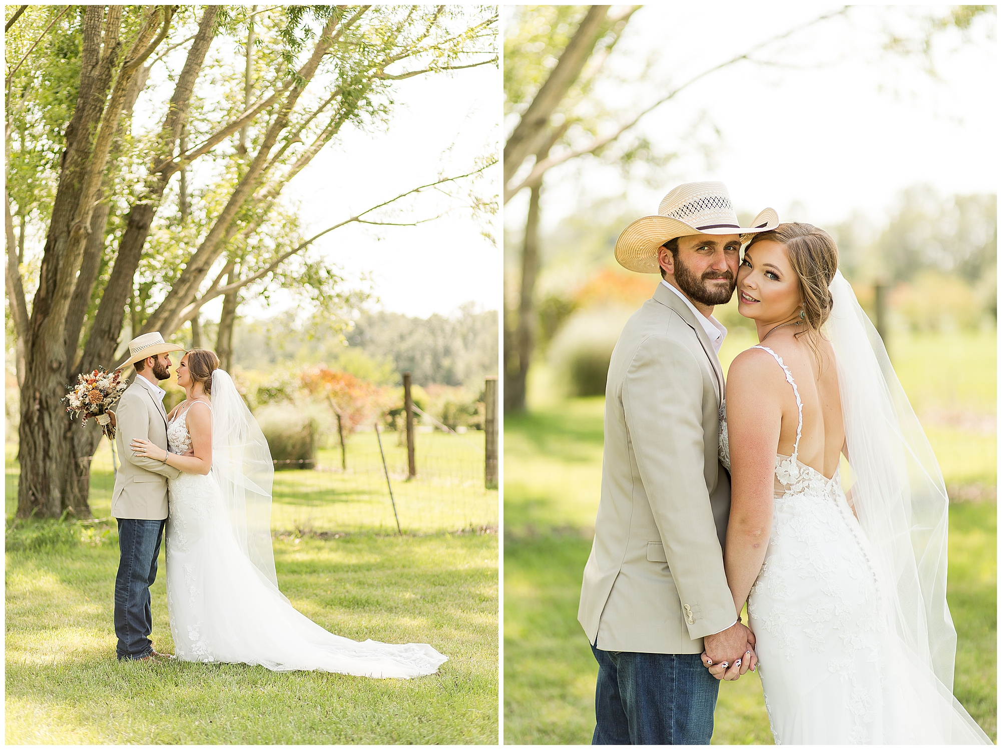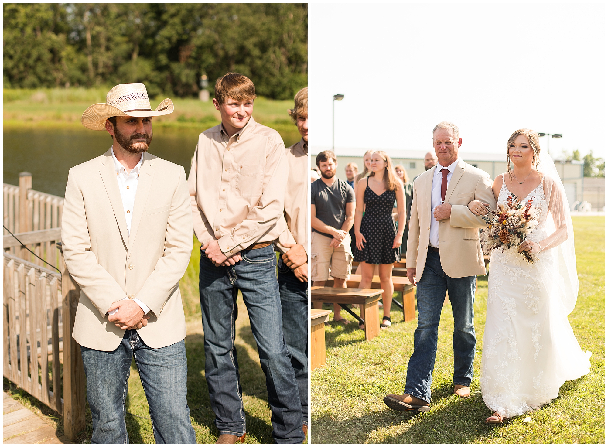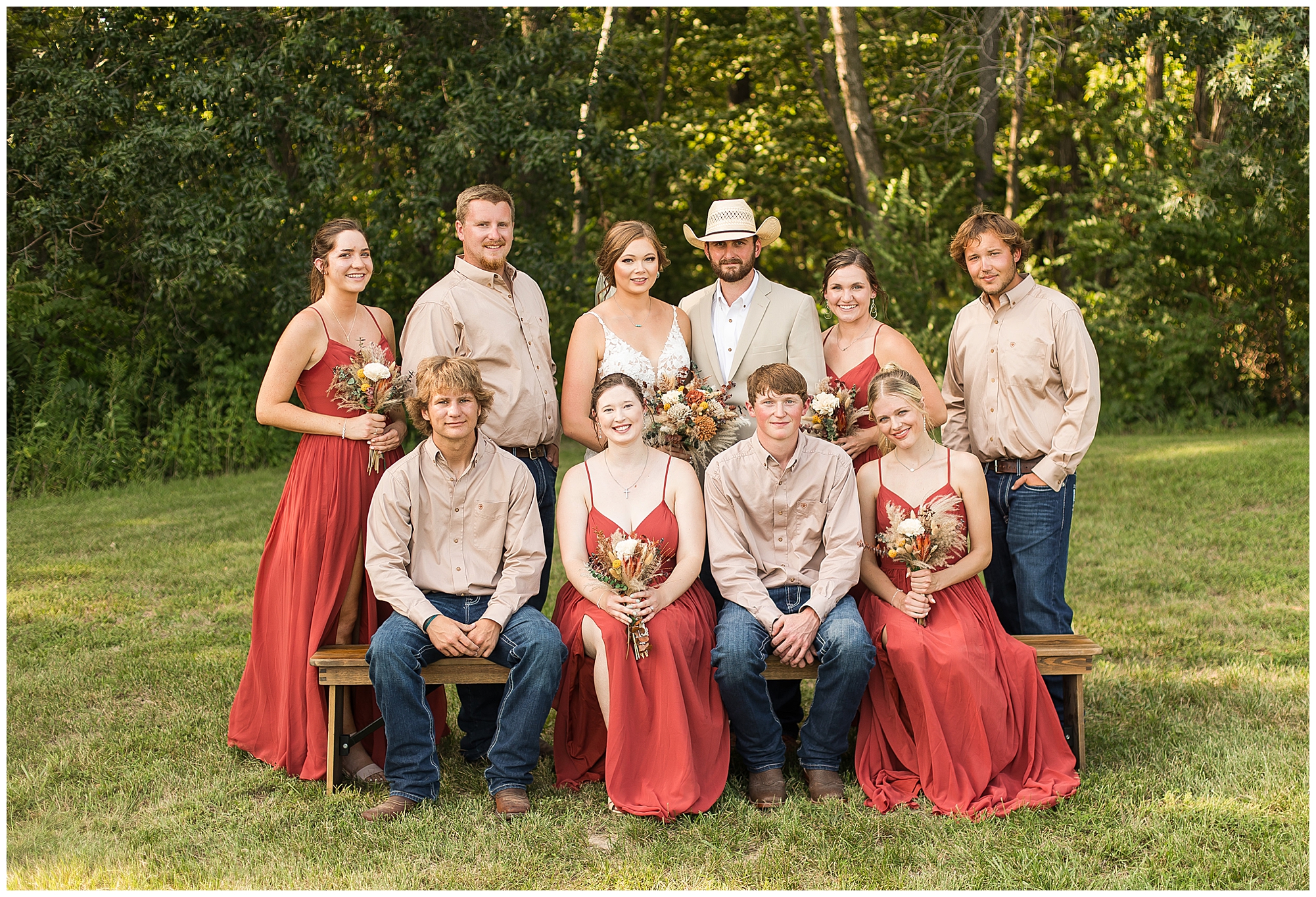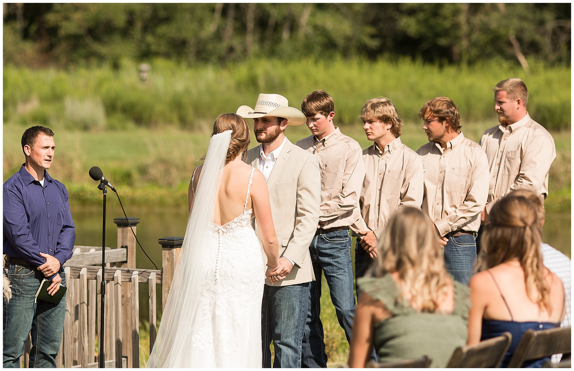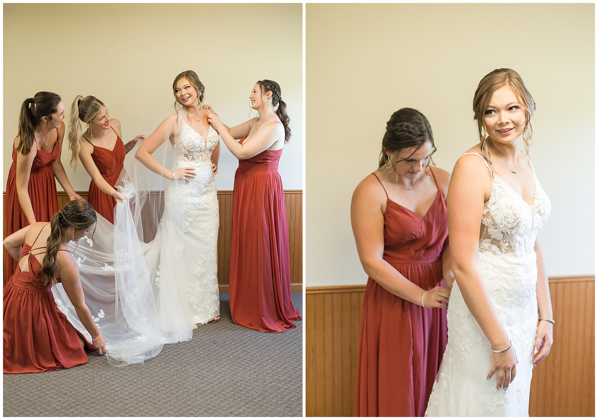 Becca and Trace’s rustic and rural wedding day was just want I imagined for these two. They both grew up or continue to work around the farm. They are a rodeo-loving couple, who takes every chance they can to show love to their support systems. And they adore a good belt buckle bigger than the state of Illinois! Becca and Trace are the epitome of what it means to be laid back and go with the flow. Which is what makes me love them so much! I began the beautiful mid-August day with Becca and her ladies as they were getting their hair and makeup done. This bride was all smiles and couldn’t have been more excited about what the future holds. Luckily for me, I have worked with Becca years before her special day, when I photographed her brother, Nathan’s wedding to Jenny. So I have been very much looking forward to seeing all of her family again. The lovely burnt orange bridesmaids dresses and pops of creams and turquoise were throughout the accessories and bride’s details. When it came time to get Becca dressed she was absolutely stunning in her floral appliqué gown with hints of sparkles and leaf embroidery. When she added the cathedral length veil, which was her something borrowed from her sister-in-law, Jenny, she seriously could have been on the cover of a bridal magazine!