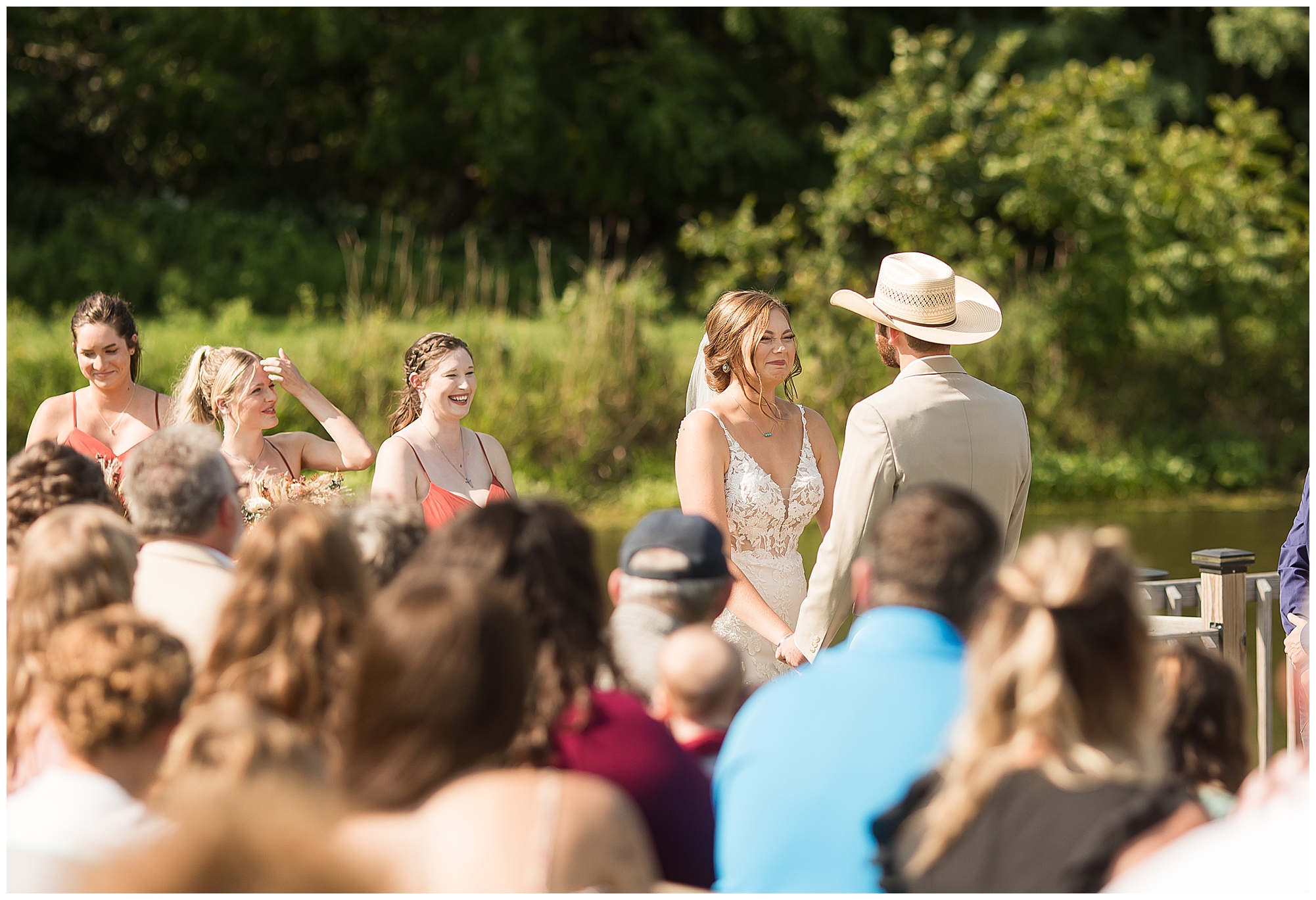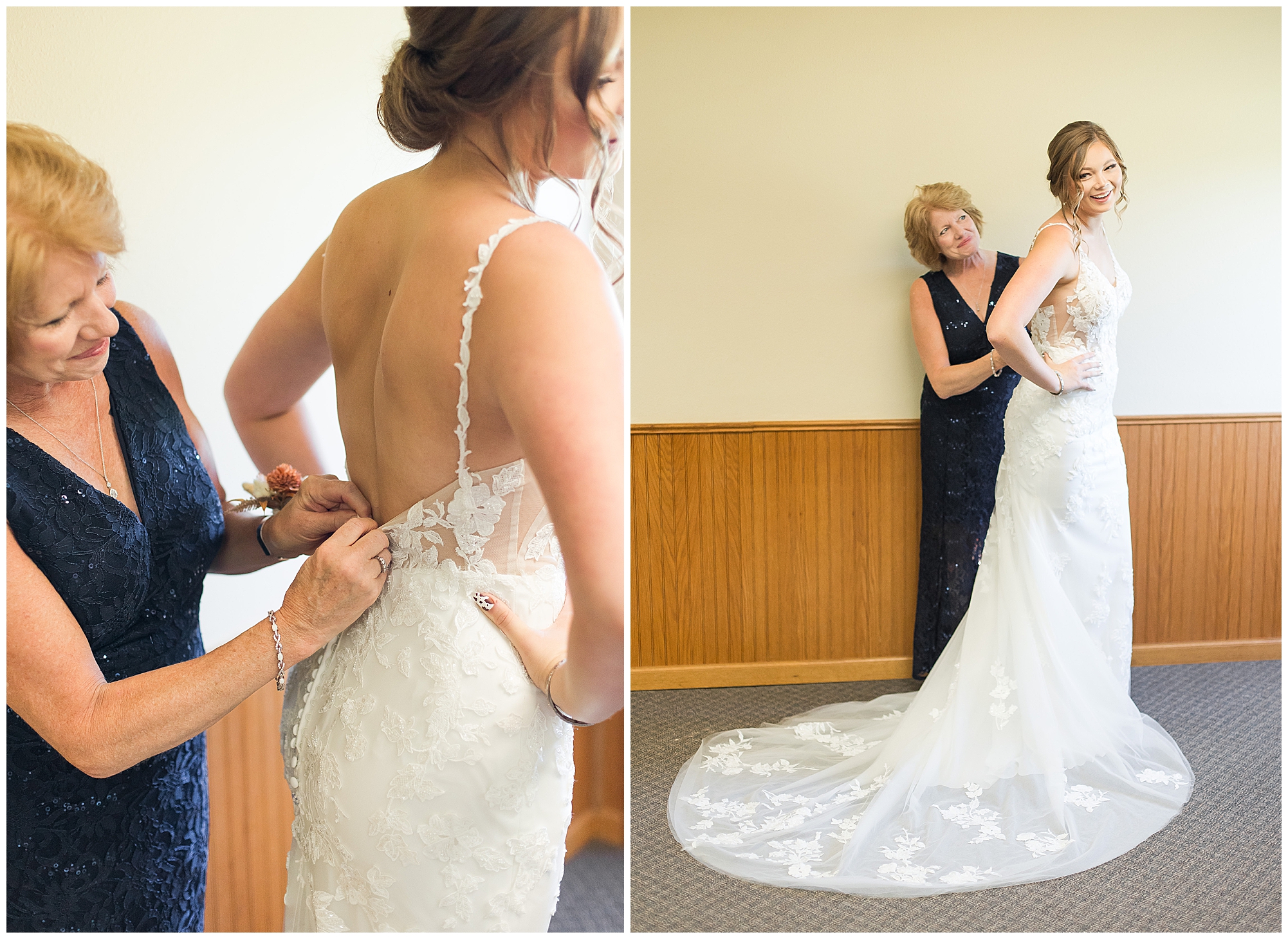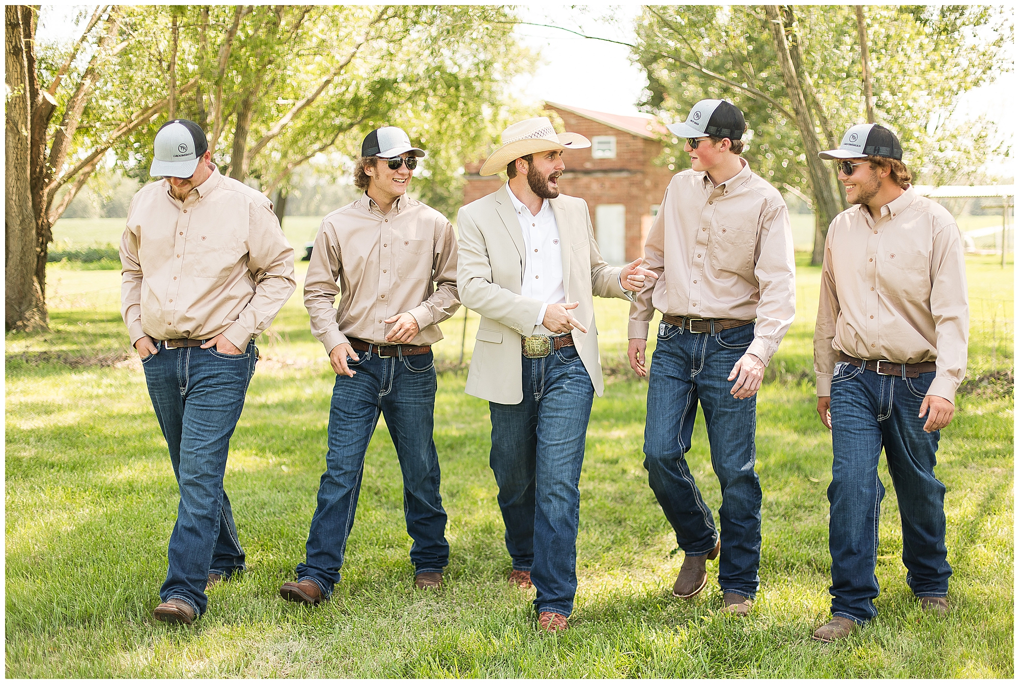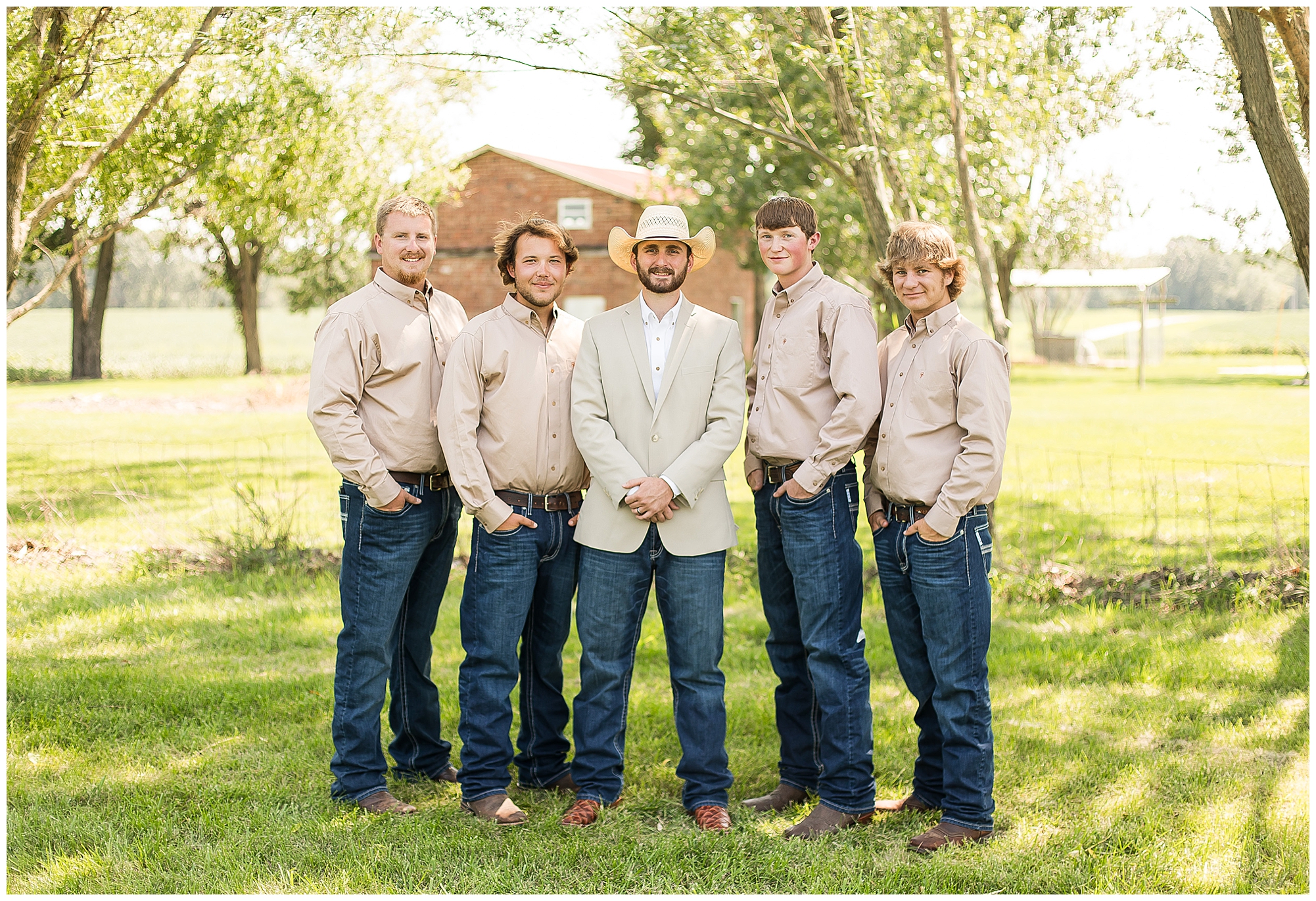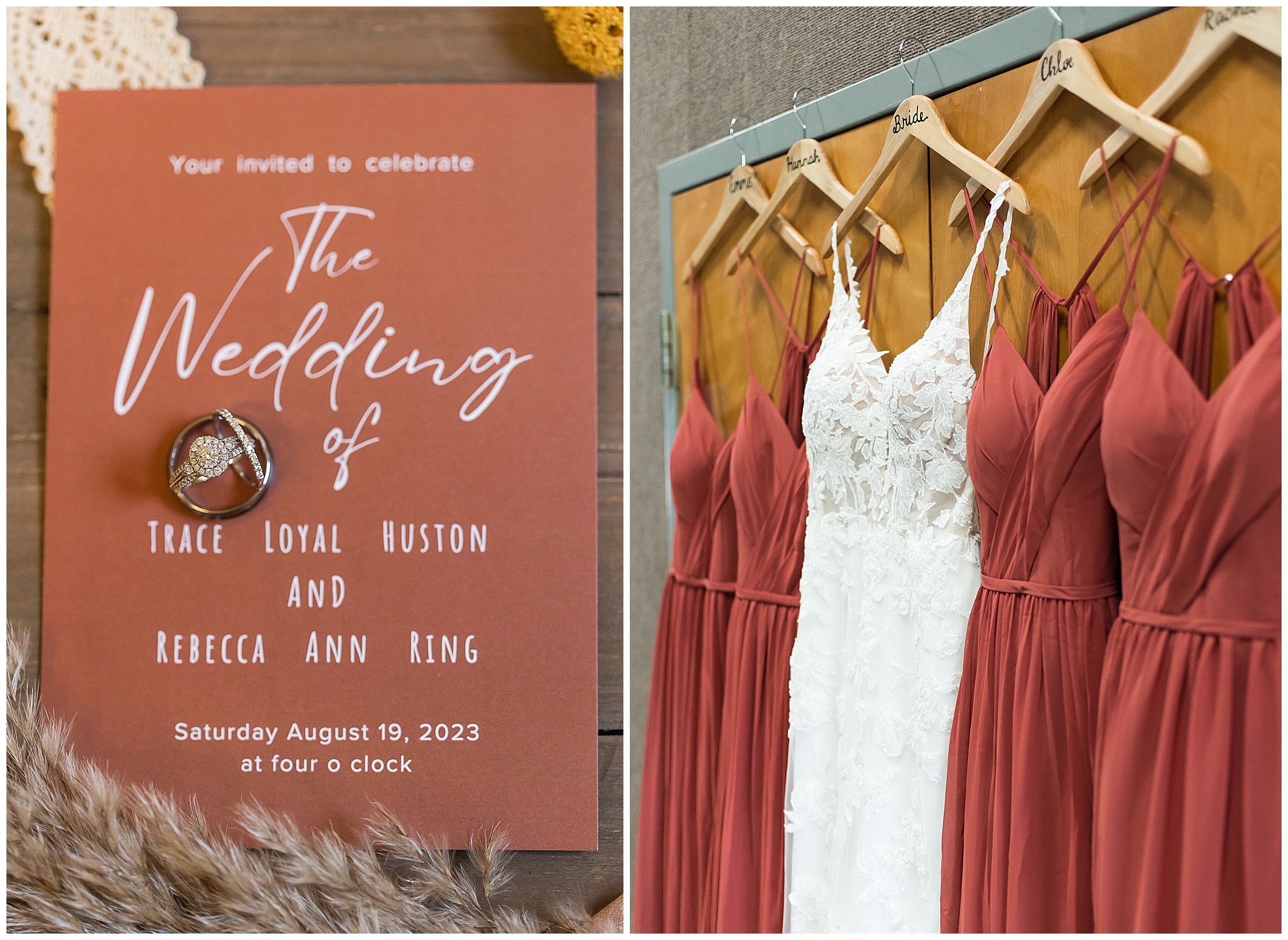 Becca and Trace’s rustic and rural wedding day was just want I imagined for these two. They both grew up or continue to work around the farm. They are a rodeo-loving couple, who takes every chance they can to show love to their support systems. And they adore a good belt buckle bigger than the state of Illinois! Becca and Trace are the epitome of what it means to be laid back and go with the flow. Which is what makes me love them so much! I began the beautiful mid-August day with Becca and her ladies as they were getting their hair and makeup done. This bride was all smiles and couldn’t have been more excited about what the future holds. Luckily for me, I have worked with Becca years before her special day, when I photographed her brother, Nathan’s wedding to Jenny. So I have been very much looking forward to seeing all of her family again. The lovely burnt orange bridesmaids dresses and pops of creams and turquoise were throughout the accessories and bride’s details. When it came time to get Becca dressed she was absolutely stunning in her floral appliqué gown with hints of sparkles and leaf embroidery. When she added the cathedral length veil, which was her something borrowed from her sister-in-law, Jenny, she seriously could have been on the cover of a bridal magazine!