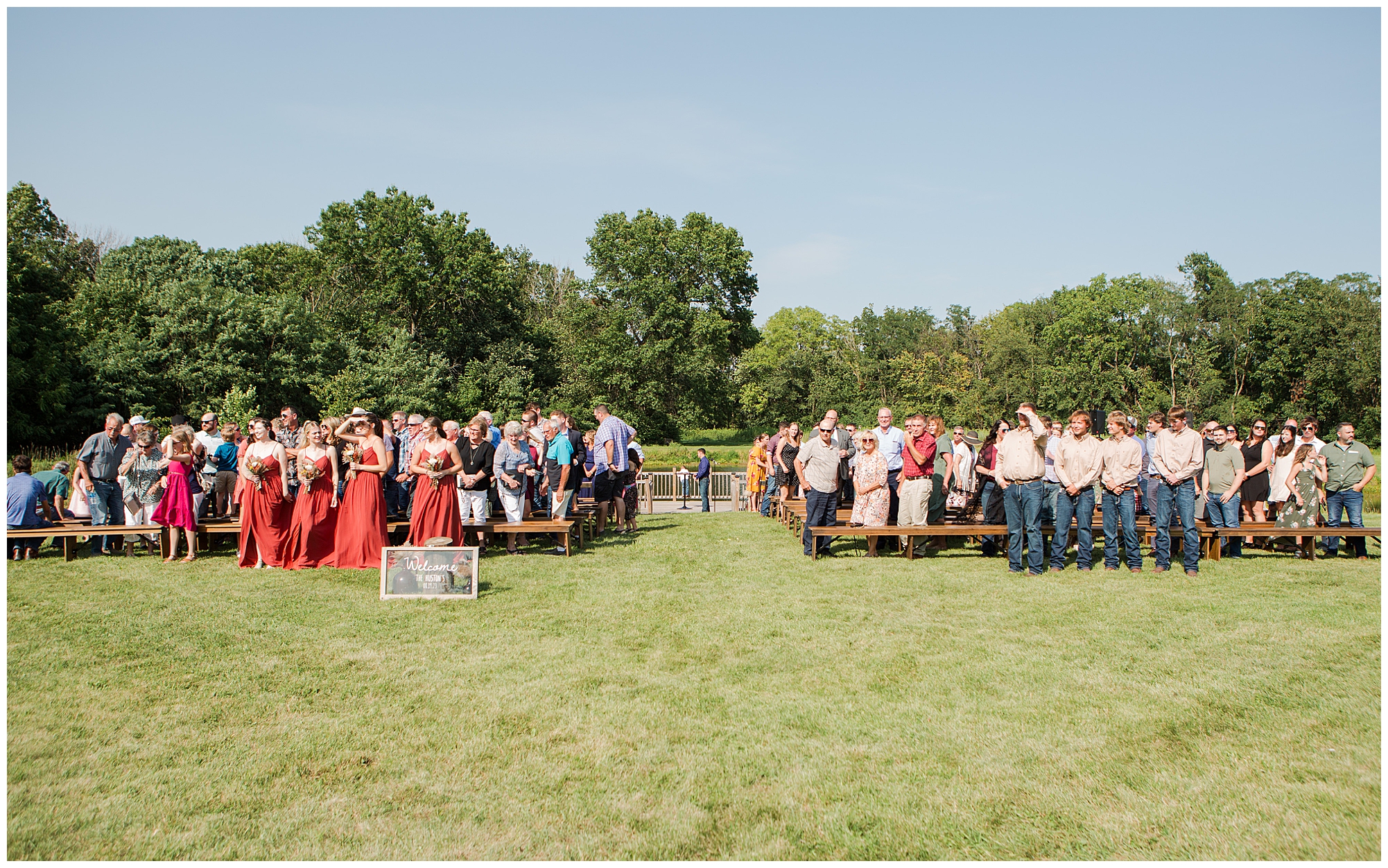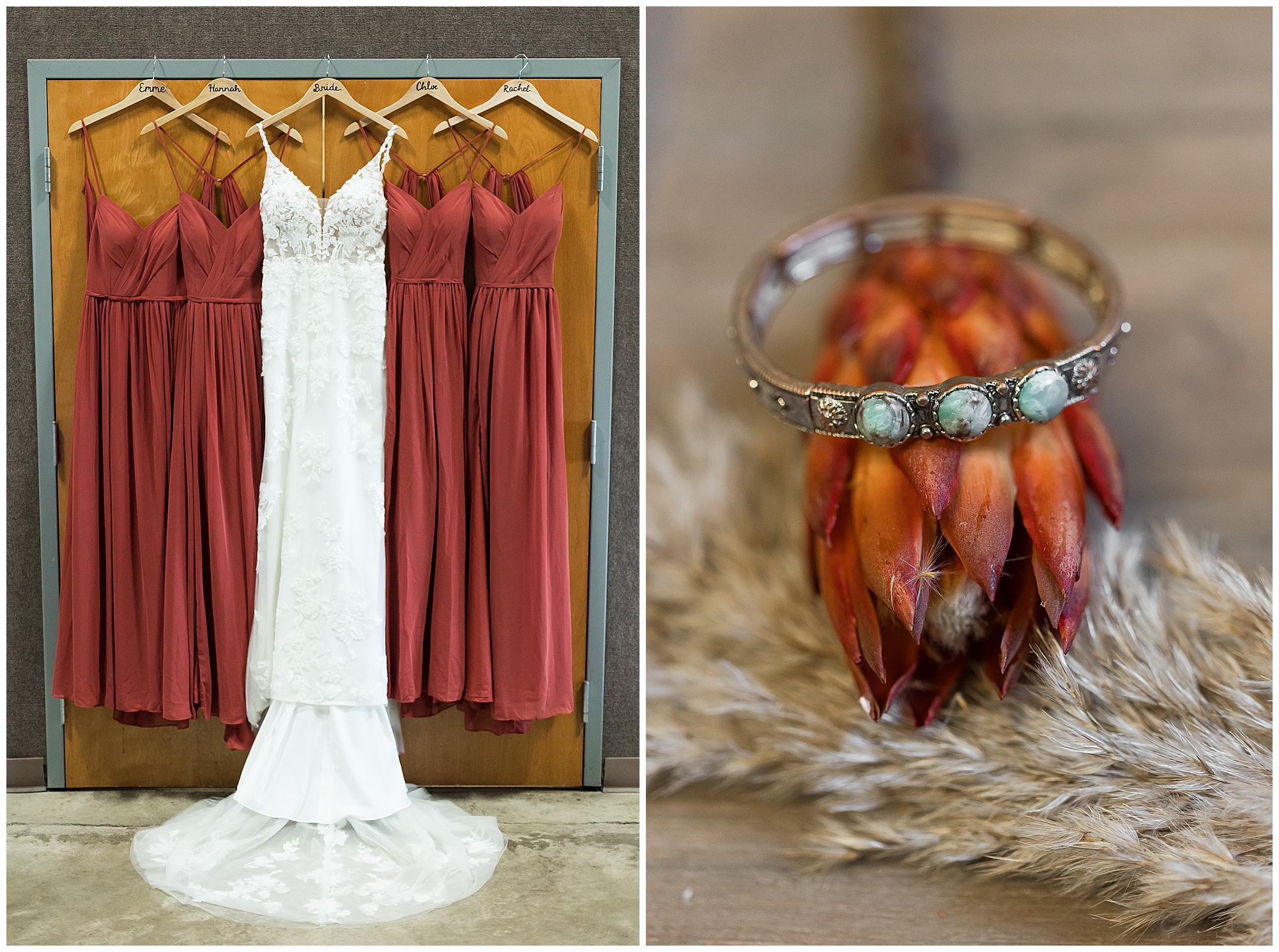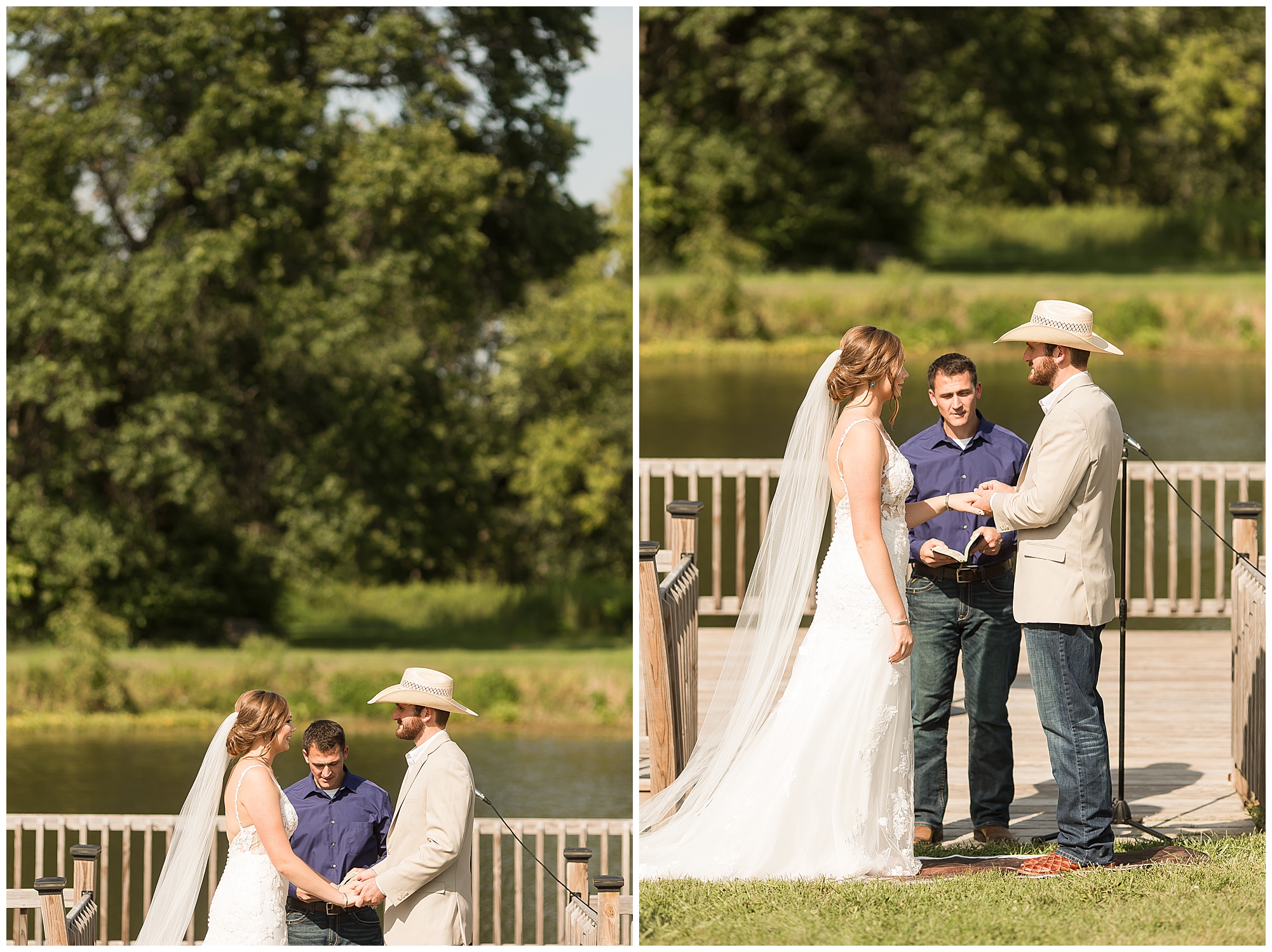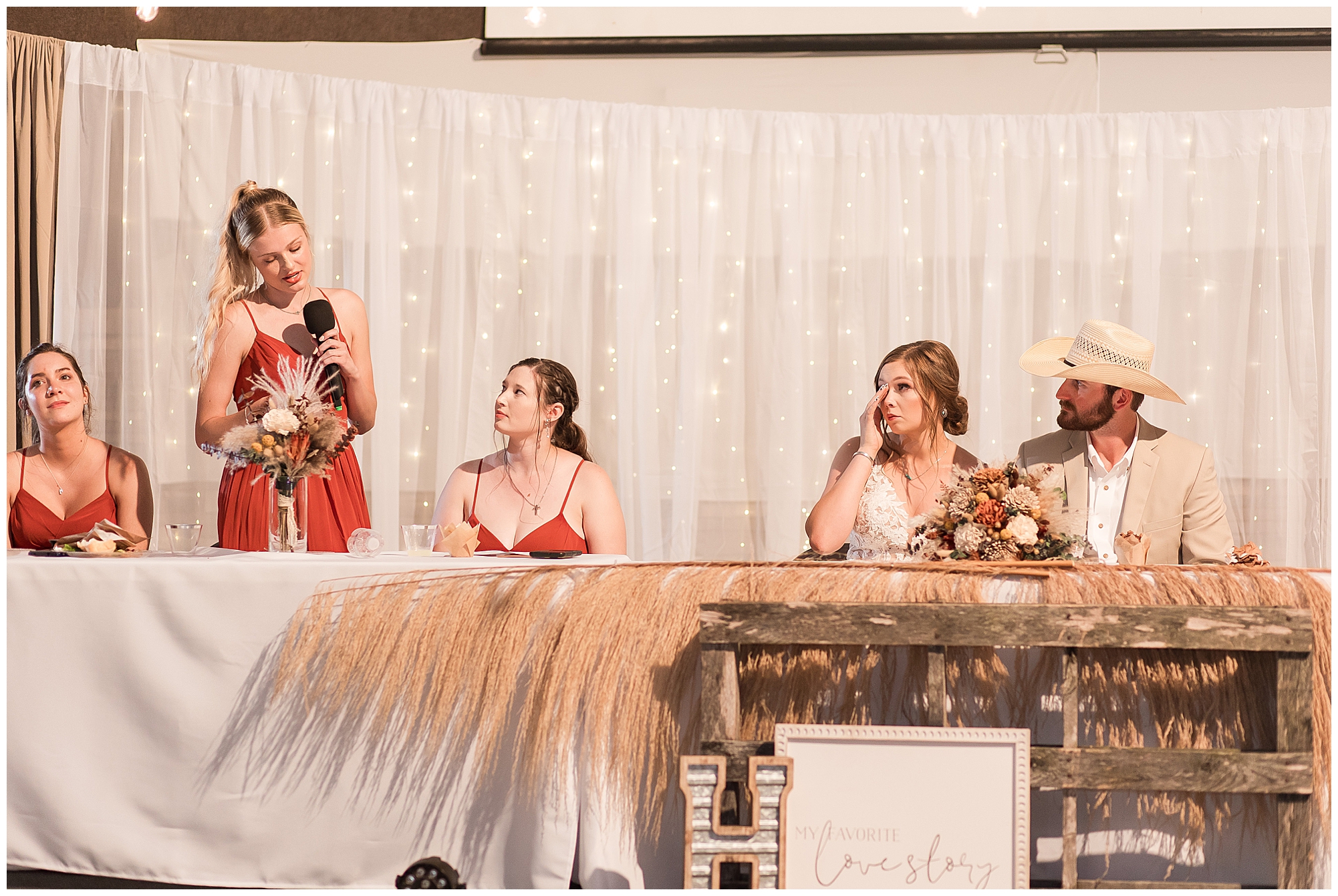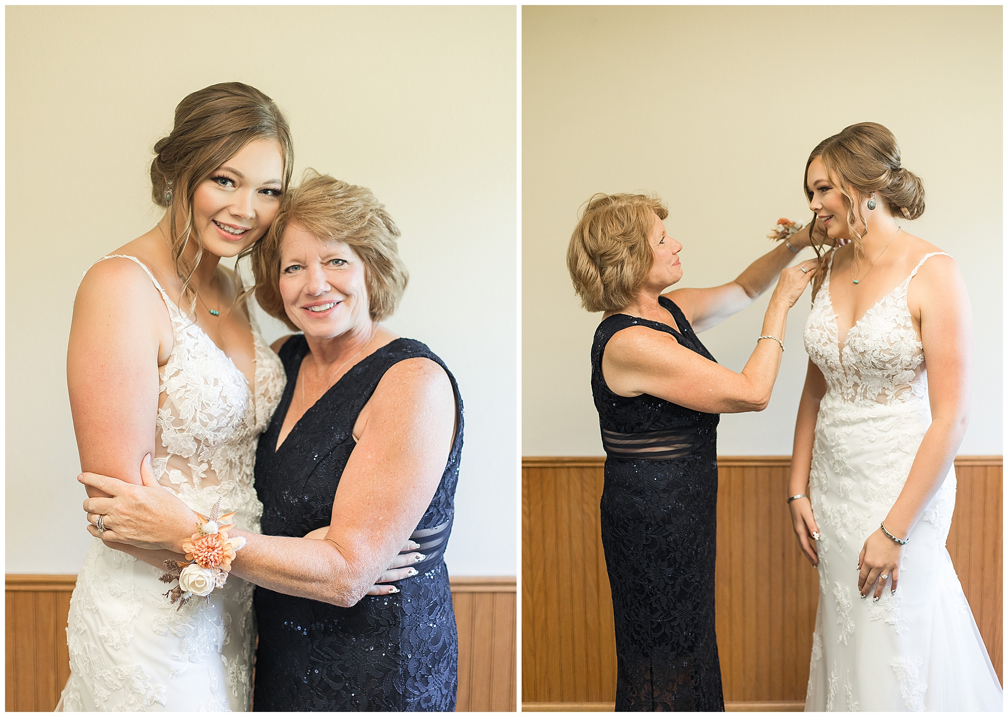 Becca and Trace’s rustic and rural wedding day was just want I imagined for these two. They both grew up or continue to work around the farm. They are a rodeo-loving couple, who takes every chance they can to show love to their support systems. And they adore a good belt buckle bigger than the state of Illinois! Becca and Trace are the epitome of what it means to be laid back and go with the flow. Which is what makes me love them so much! I began the beautiful mid-August day with Becca and her ladies as they were getting their hair and makeup done. This bride was all smiles and couldn’t have been more excited about what the future holds. Luckily for me, I have worked with Becca years before her special day, when I photographed her brother, Nathan’s wedding to Jenny. So I have been very much looking forward to seeing all of her family again. The lovely burnt orange bridesmaids dresses and pops of creams and turquoise were throughout the accessories and bride’s details. When it came time to get Becca dressed she was absolutely stunning in her floral appliqué gown with hints of sparkles and leaf embroidery. When she added the cathedral length veil, which was her something borrowed from her sister-in-law, Jenny, she seriously could have been on the cover of a bridal magazine!