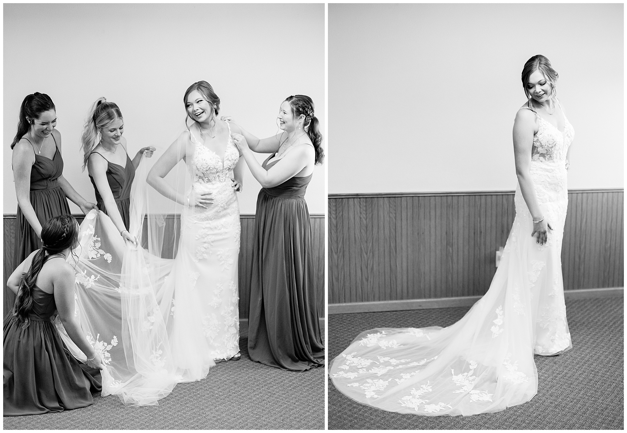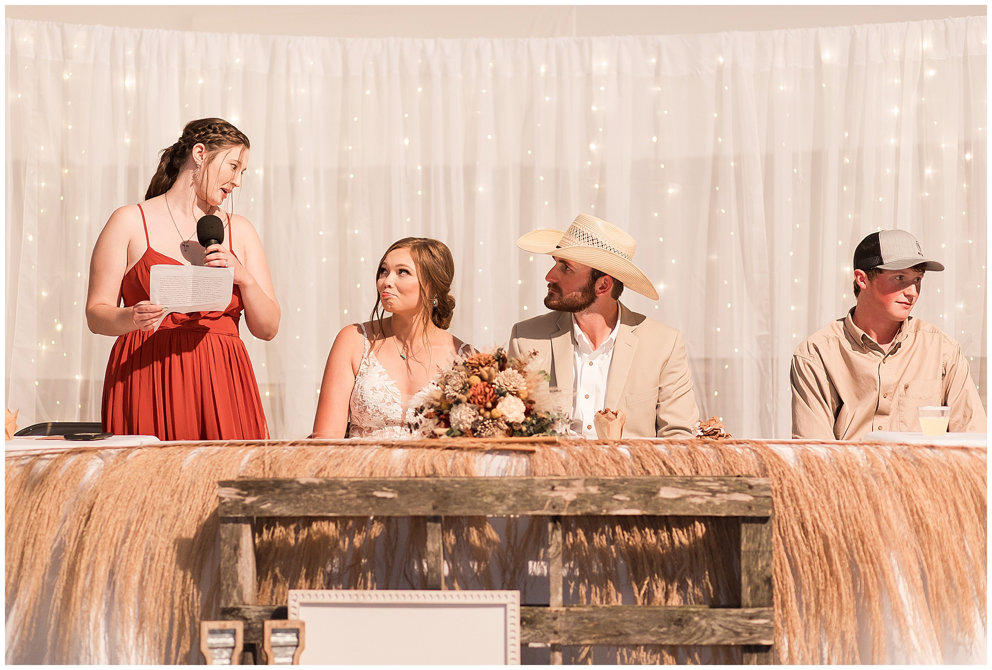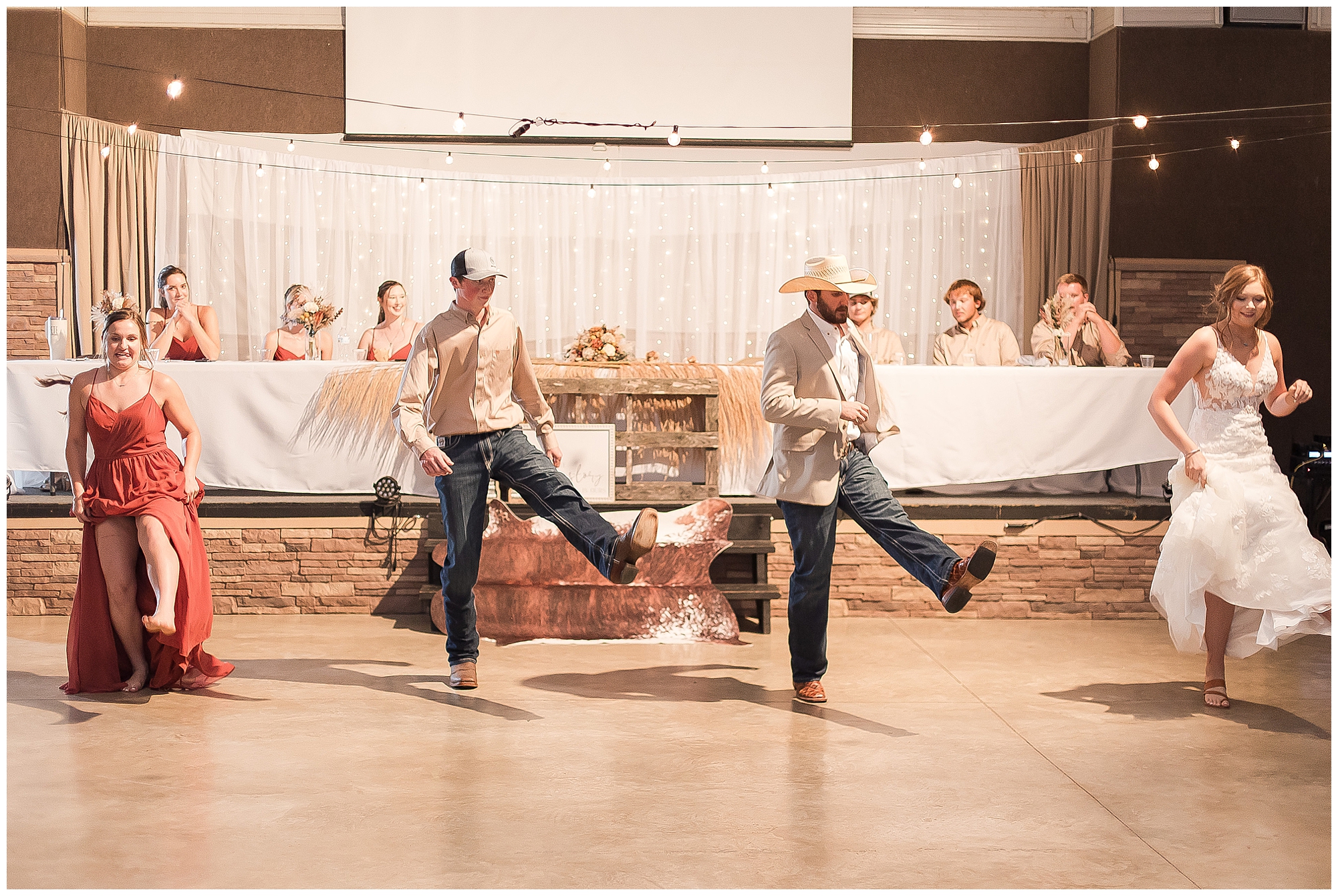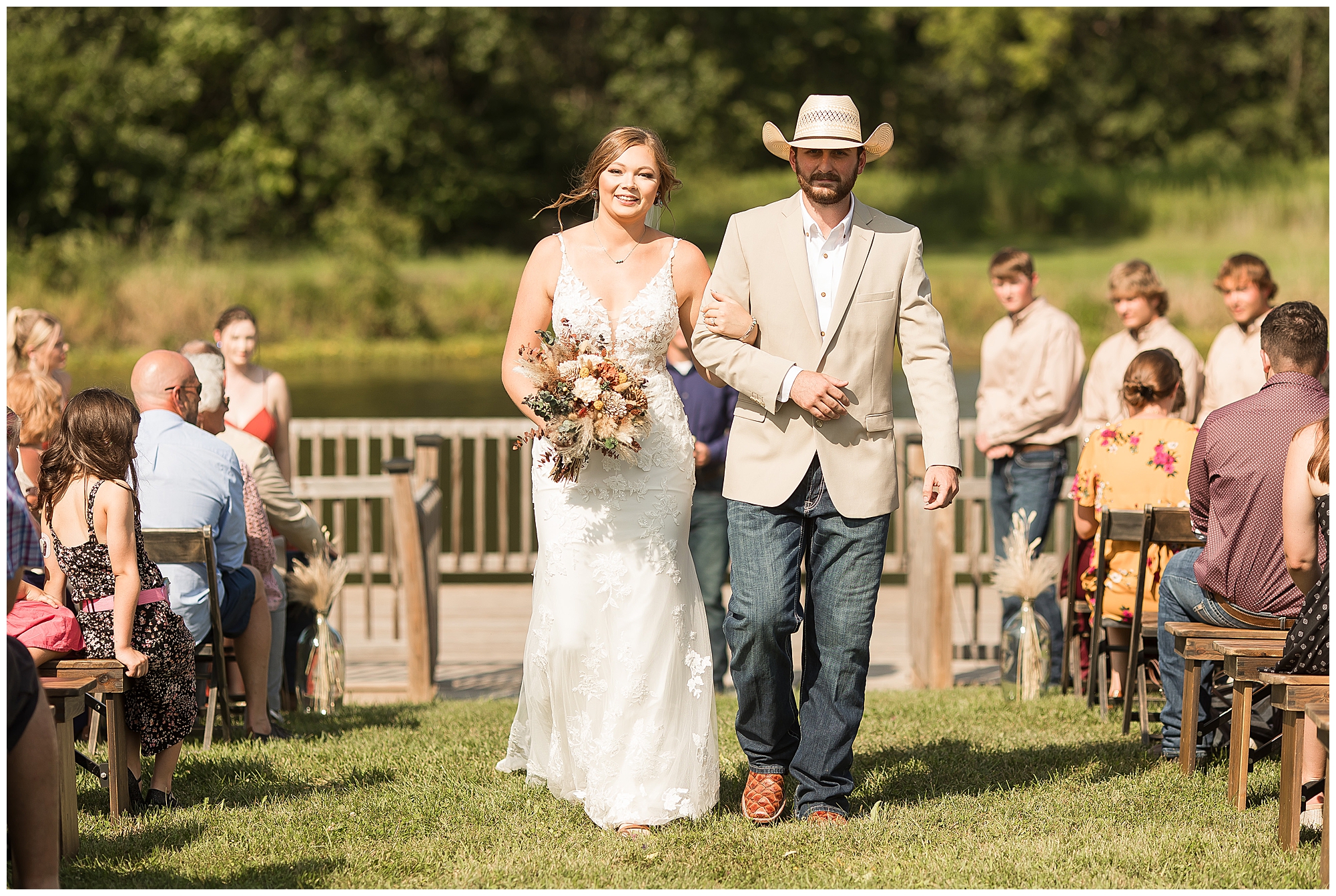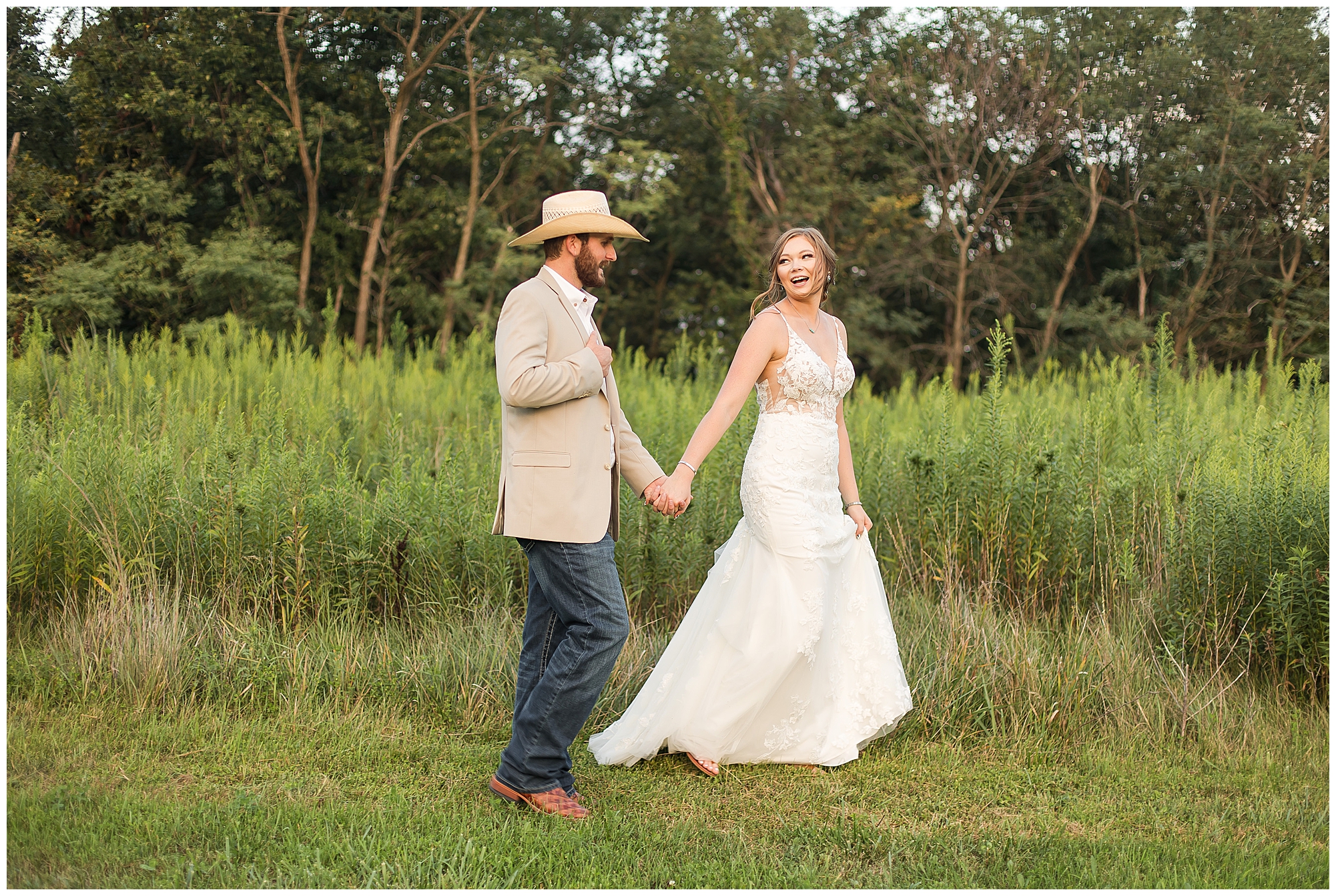 Becca and Trace’s rustic and rural wedding day was just want I imagined for these two. They both grew up or continue to work around the farm. They are a rodeo-loving couple, who takes every chance they can to show love to their support systems. And they adore a good belt buckle bigger than the state of Illinois! Becca and Trace are the epitome of what it means to be laid back and go with the flow. Which is what makes me love them so much! I began the beautiful mid-August day with Becca and her ladies as they were getting their hair and makeup done. This bride was all smiles and couldn’t have been more excited about what the future holds. Luckily for me, I have worked with Becca years before her special day, when I photographed her brother, Nathan’s wedding to Jenny. So I have been very much looking forward to seeing all of her family again. The lovely burnt orange bridesmaids dresses and pops of creams and turquoise were throughout the accessories and bride’s details. When it came time to get Becca dressed she was absolutely stunning in her floral appliqué gown with hints of sparkles and leaf embroidery. When she added the cathedral length veil, which was her something borrowed from her sister-in-law, Jenny, she seriously could have been on the cover of a bridal magazine!