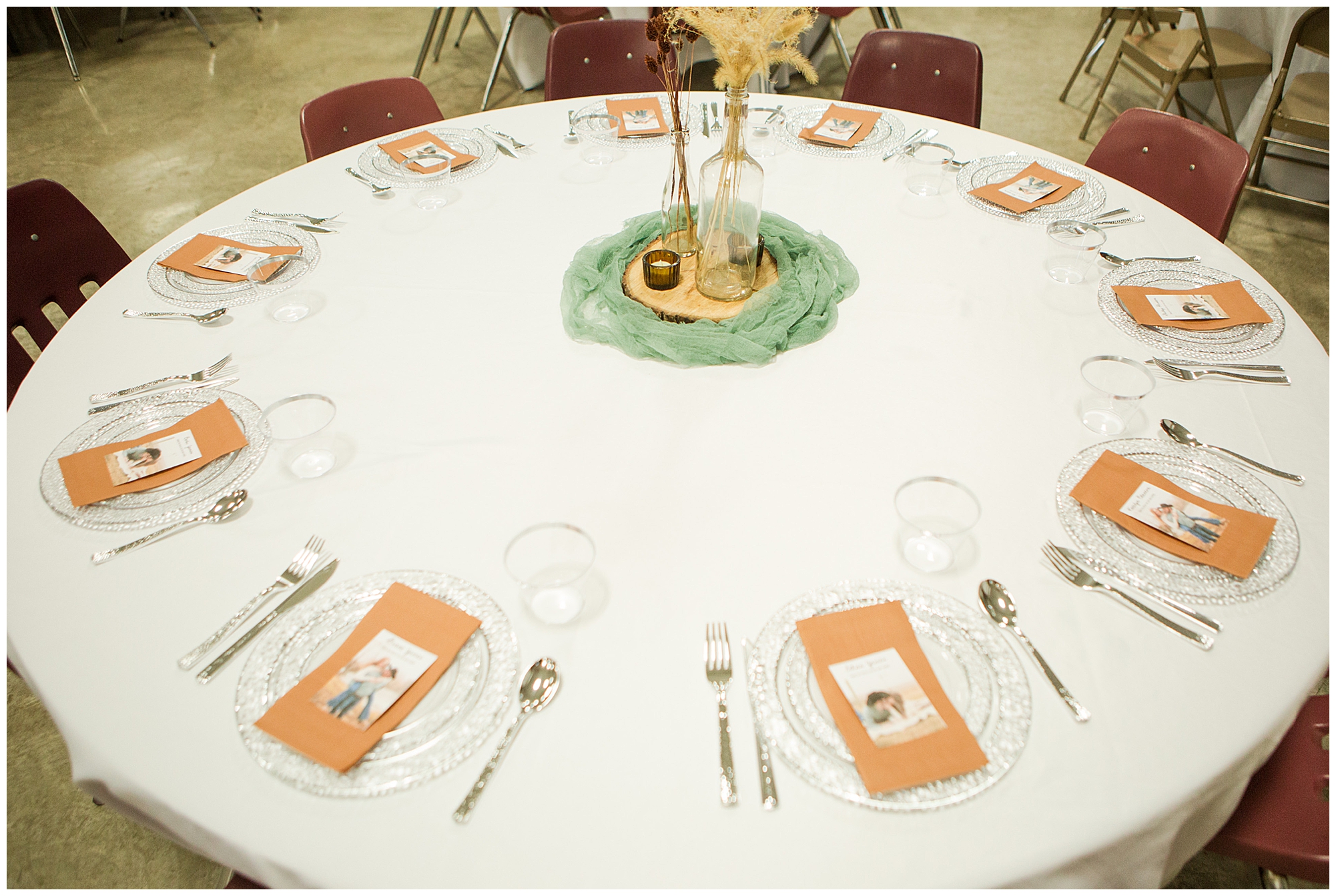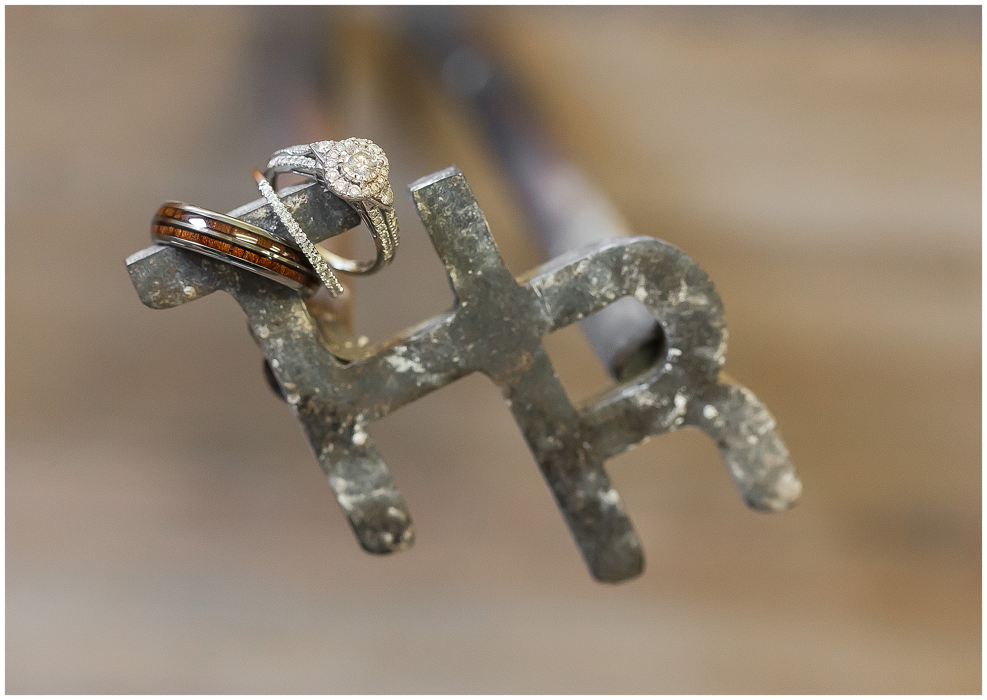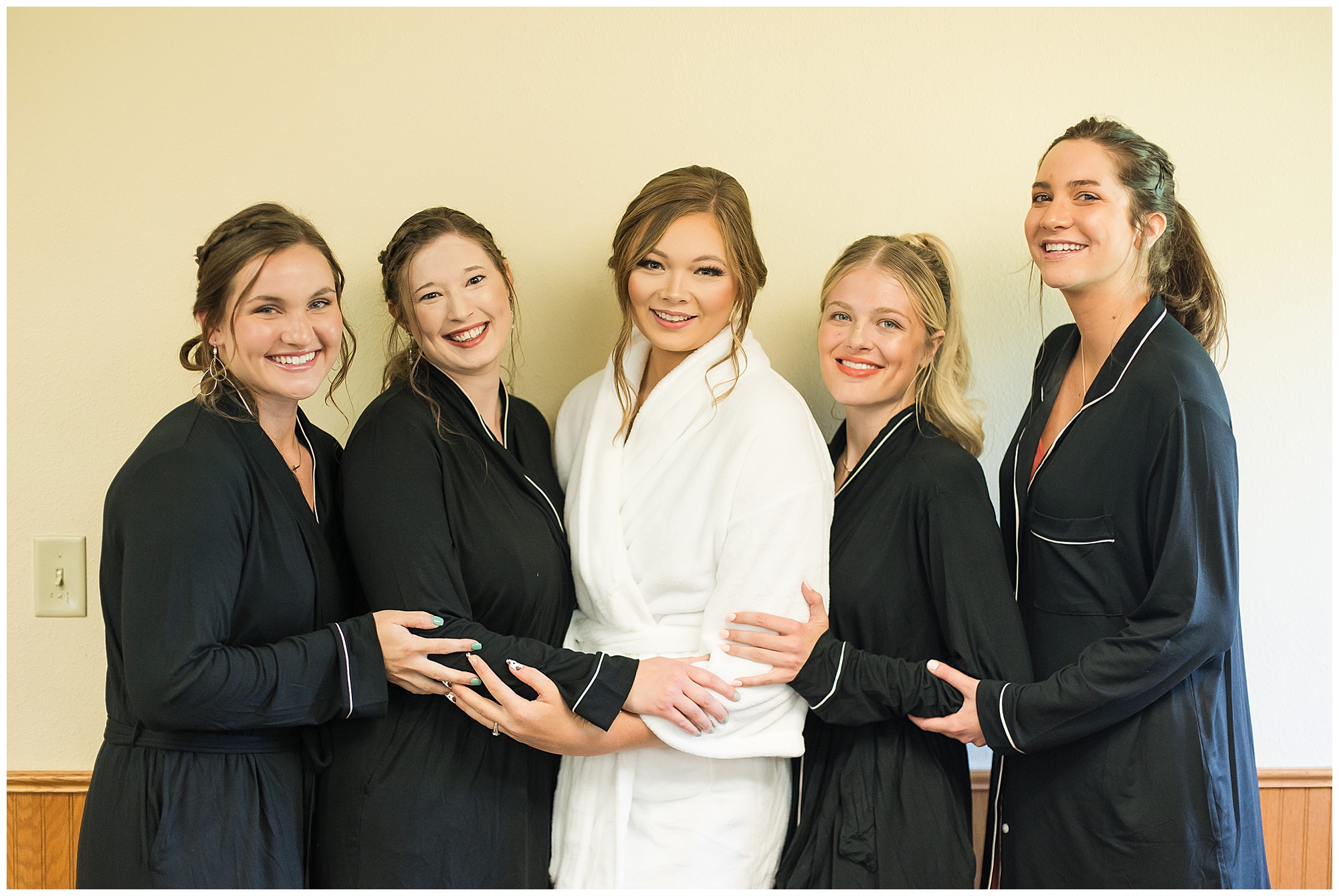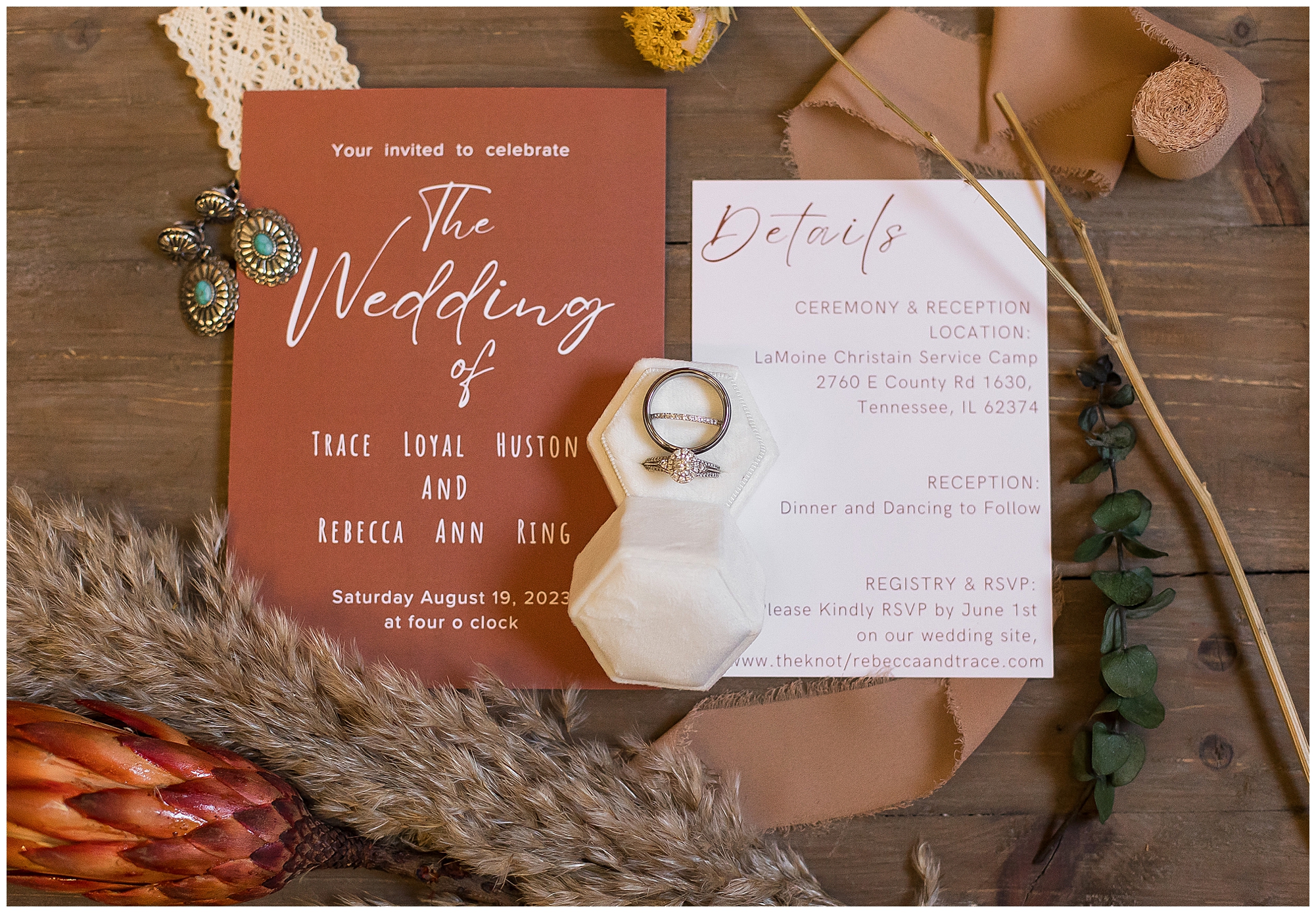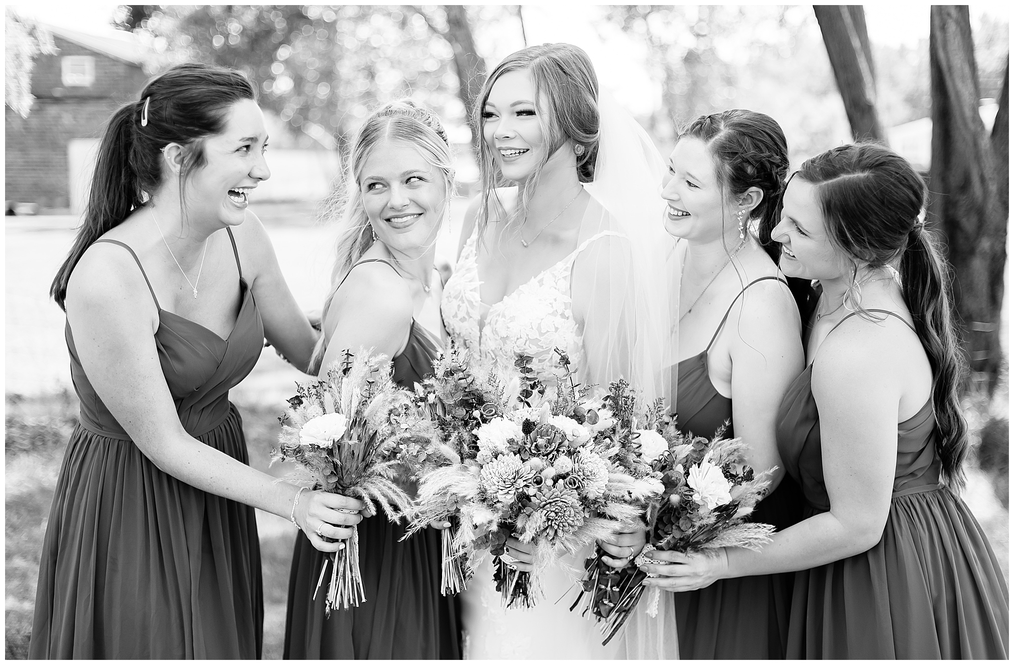 Becca and Trace’s rustic and rural wedding day was just want I imagined for these two. They both grew up or continue to work around the farm. They are a rodeo-loving couple, who takes every chance they can to show love to their support systems. And they adore a good belt buckle bigger than the state of Illinois! Becca and Trace are the epitome of what it means to be laid back and go with the flow. Which is what makes me love them so much! I began the beautiful mid-August day with Becca and her ladies as they were getting their hair and makeup done. This bride was all smiles and couldn’t have been more excited about what the future holds. Luckily for me, I have worked with Becca years before her special day, when I photographed her brother, Nathan’s wedding to Jenny. So I have been very much looking forward to seeing all of her family again. The lovely burnt orange bridesmaids dresses and pops of creams and turquoise were throughout the accessories and bride’s details. When it came time to get Becca dressed she was absolutely stunning in her floral appliqué gown with hints of sparkles and leaf embroidery. When she added the cathedral length veil, which was her something borrowed from her sister-in-law, Jenny, she seriously could have been on the cover of a bridal magazine!