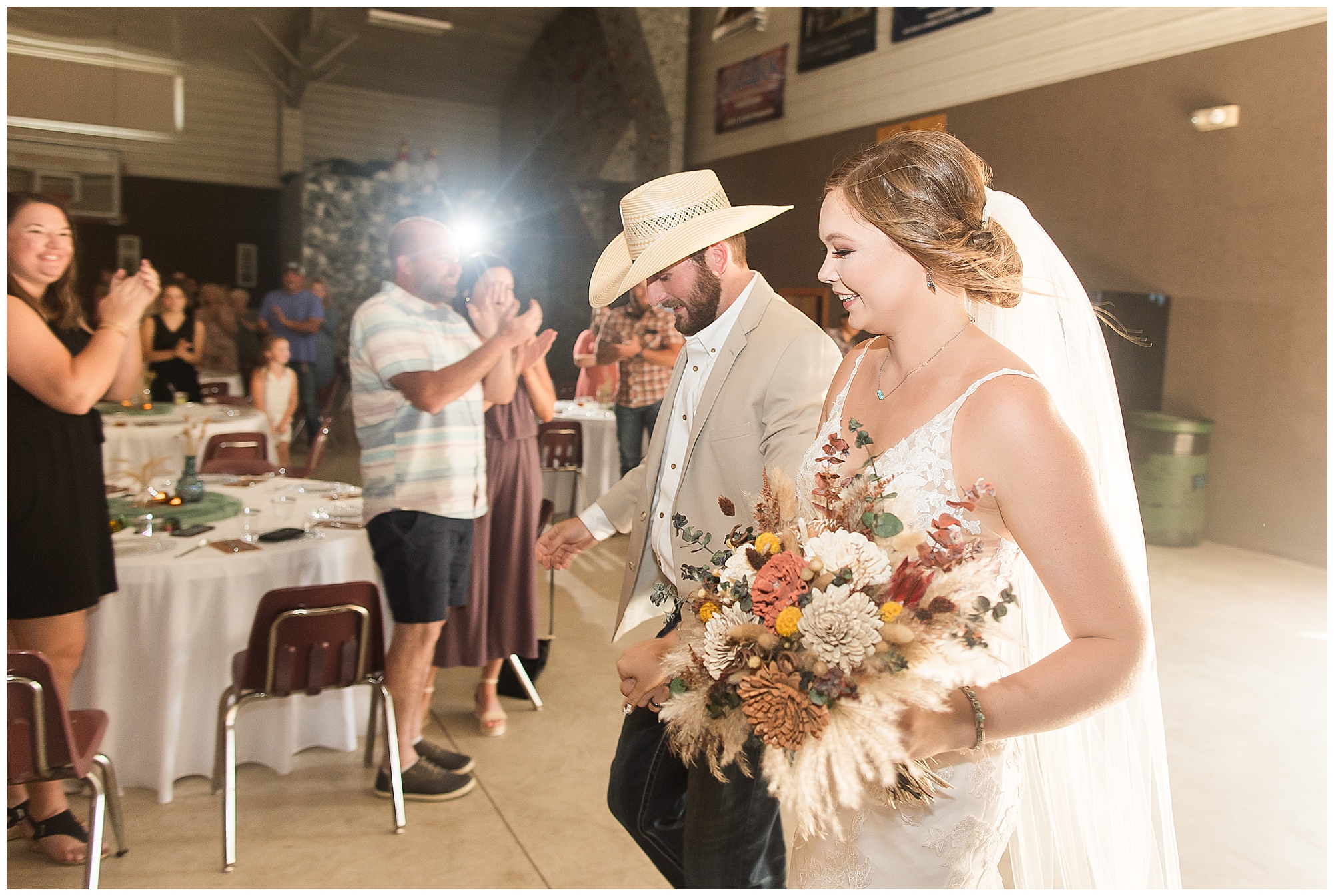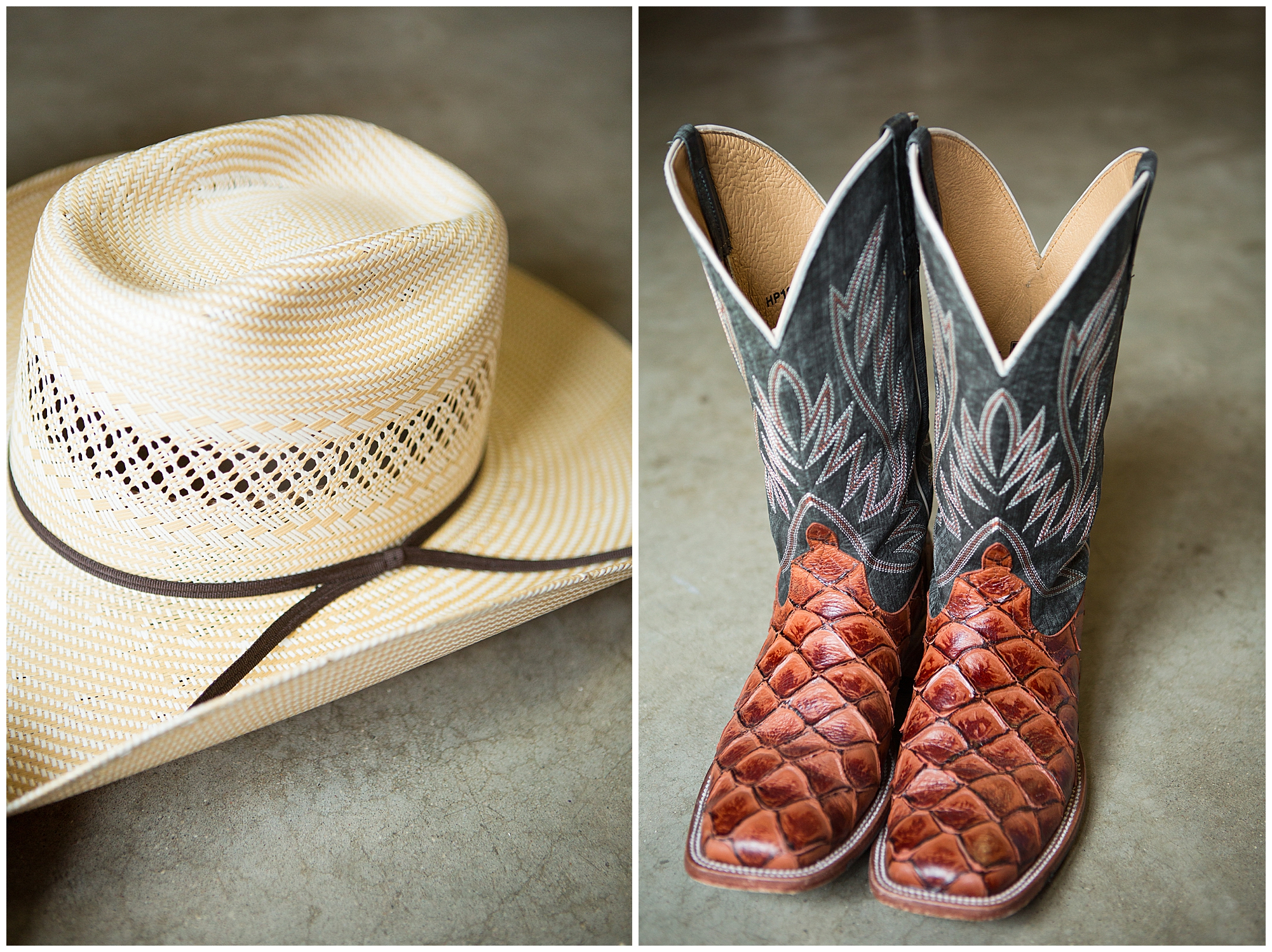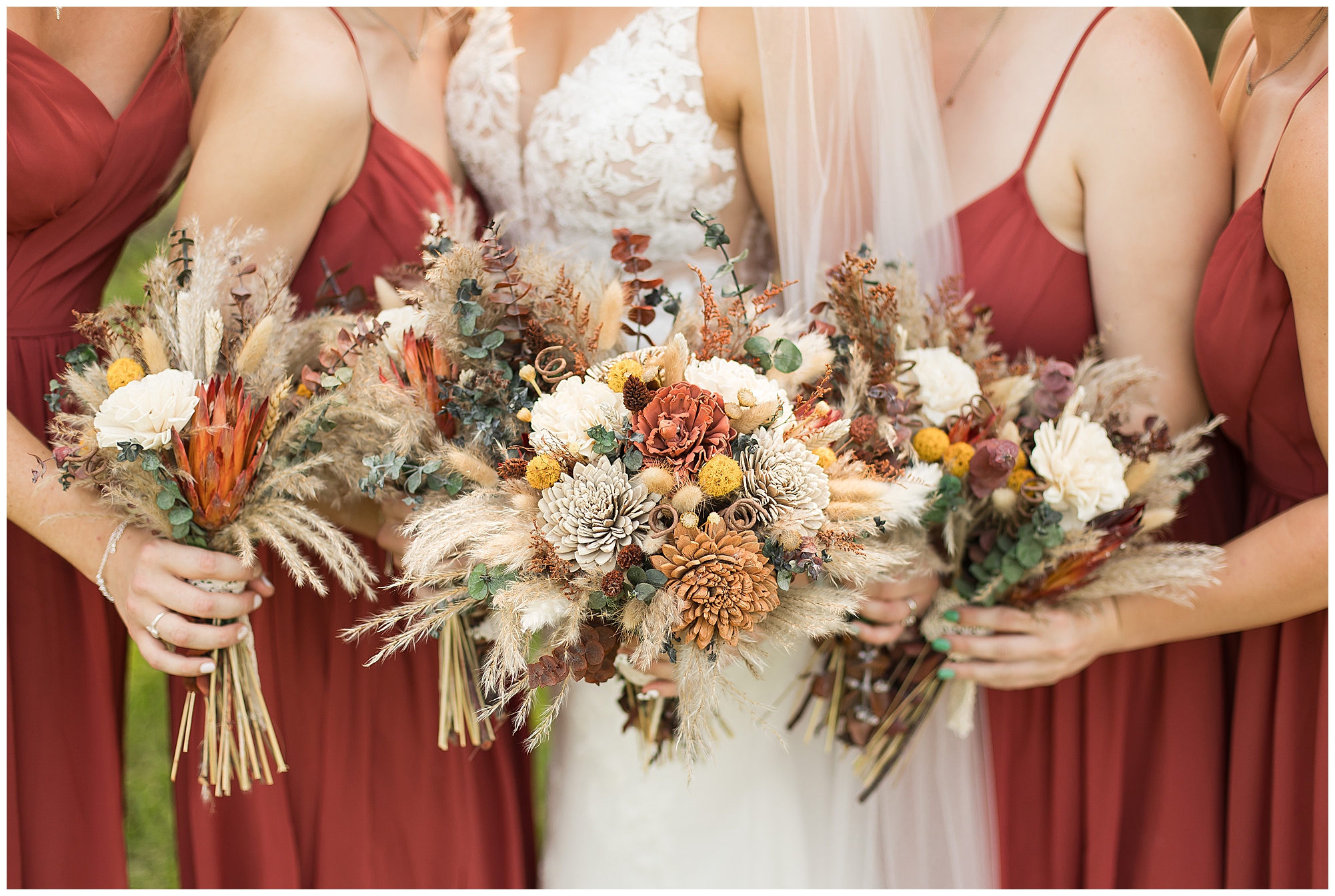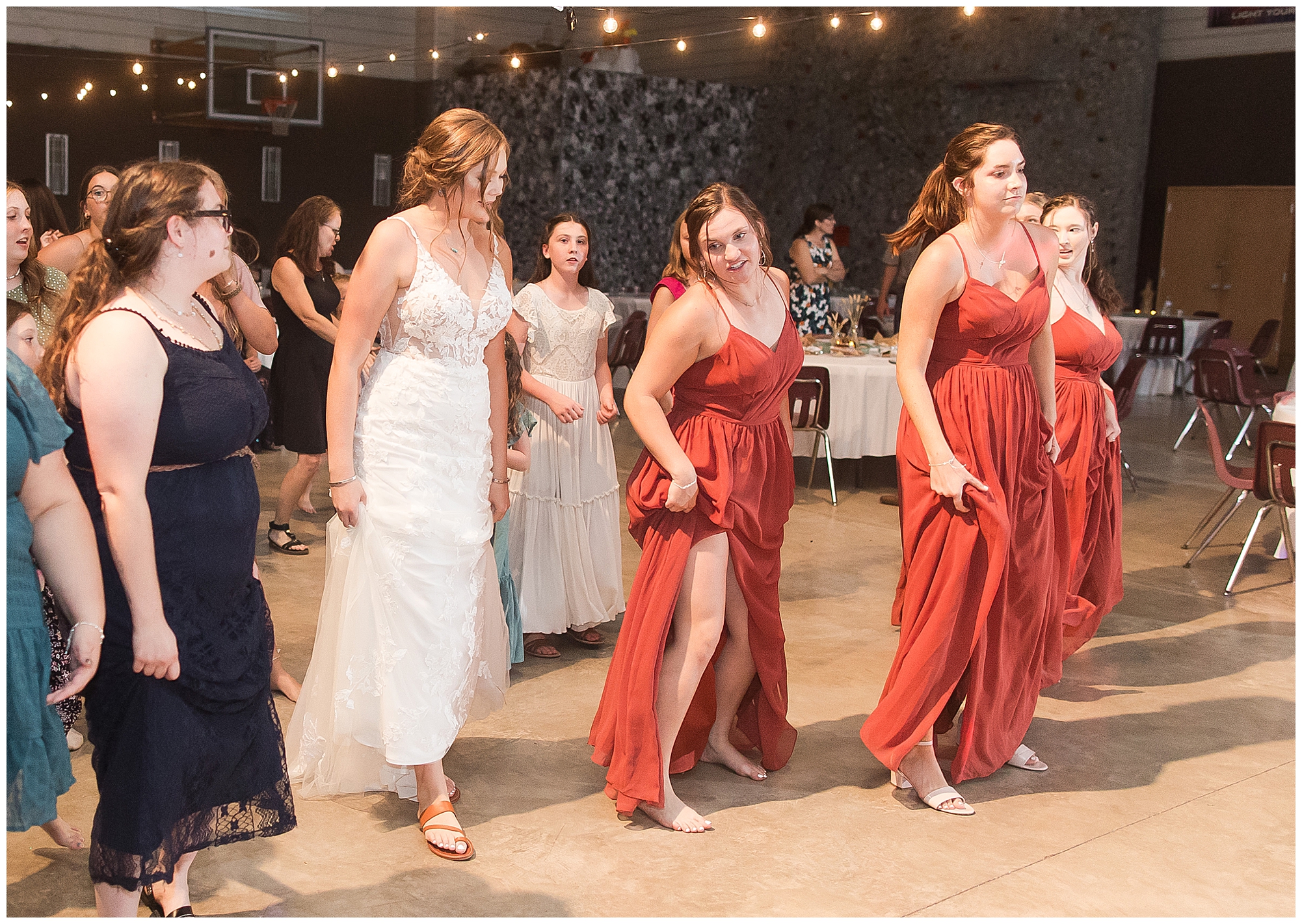 Becca and Trace’s rustic and rural wedding day was just want I imagined for these two. They both grew up or continue to work around the farm. They are a rodeo-loving couple, who takes every chance they can to show love to their support systems. And they adore a good belt buckle bigger than the state of Illinois! Becca and Trace are the epitome of what it means to be laid back and go with the flow. Which is what makes me love them so much! I began the beautiful mid-August day with Becca and her ladies as they were getting their hair and makeup done. This bride was all smiles and couldn’t have been more excited about what the future holds. Luckily for me, I have worked with Becca years before her special day, when I photographed her brother, Nathan’s wedding to Jenny. So I have been very much looking forward to seeing all of her family again. The lovely burnt orange bridesmaids dresses and pops of creams and turquoise were throughout the accessories and bride’s details. When it came time to get Becca dressed she was absolutely stunning in her floral appliqué gown with hints of sparkles and leaf embroidery. When she added the cathedral length veil, which was her something borrowed from her sister-in-law, Jenny, she seriously could have been on the cover of a bridal magazine!