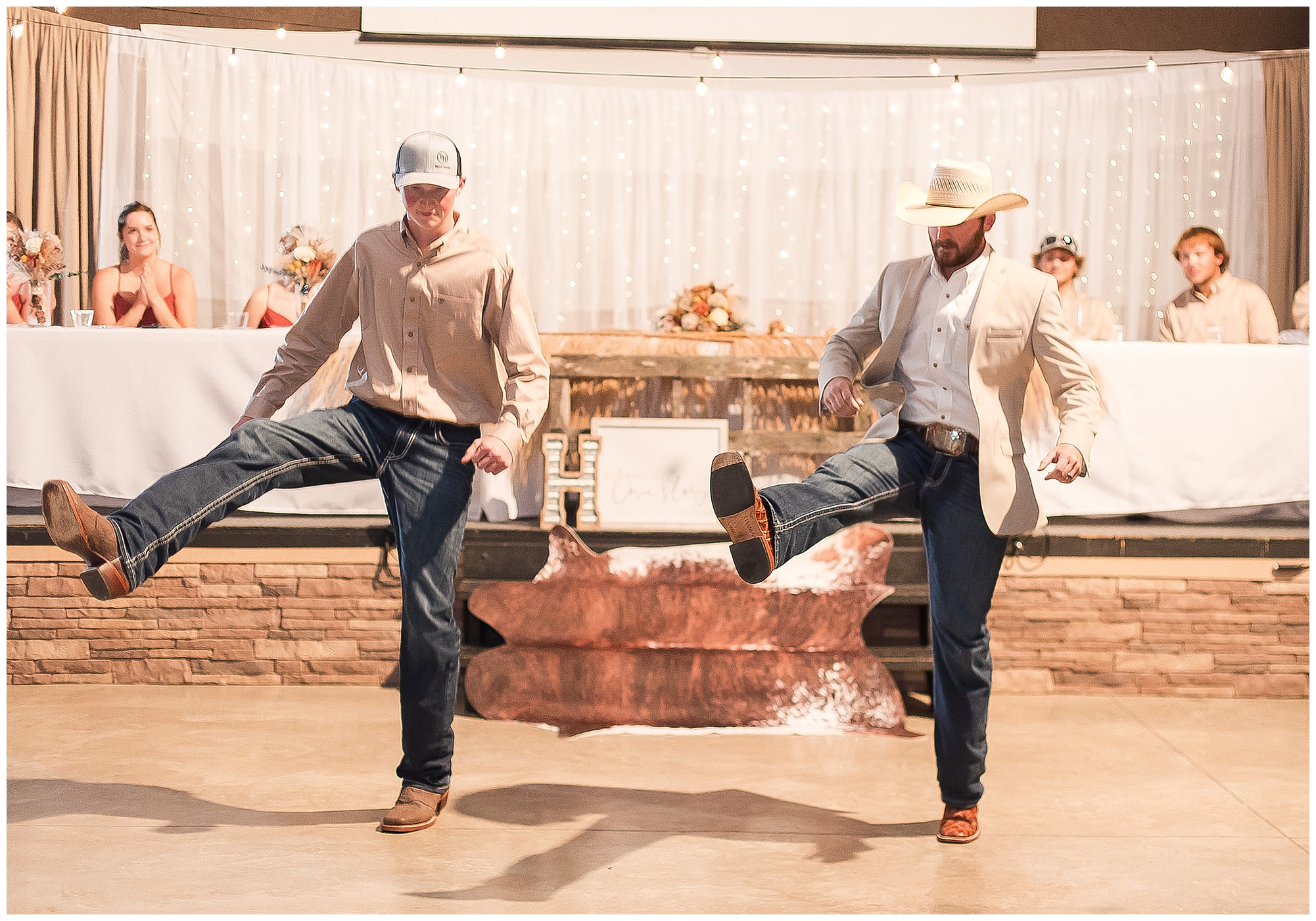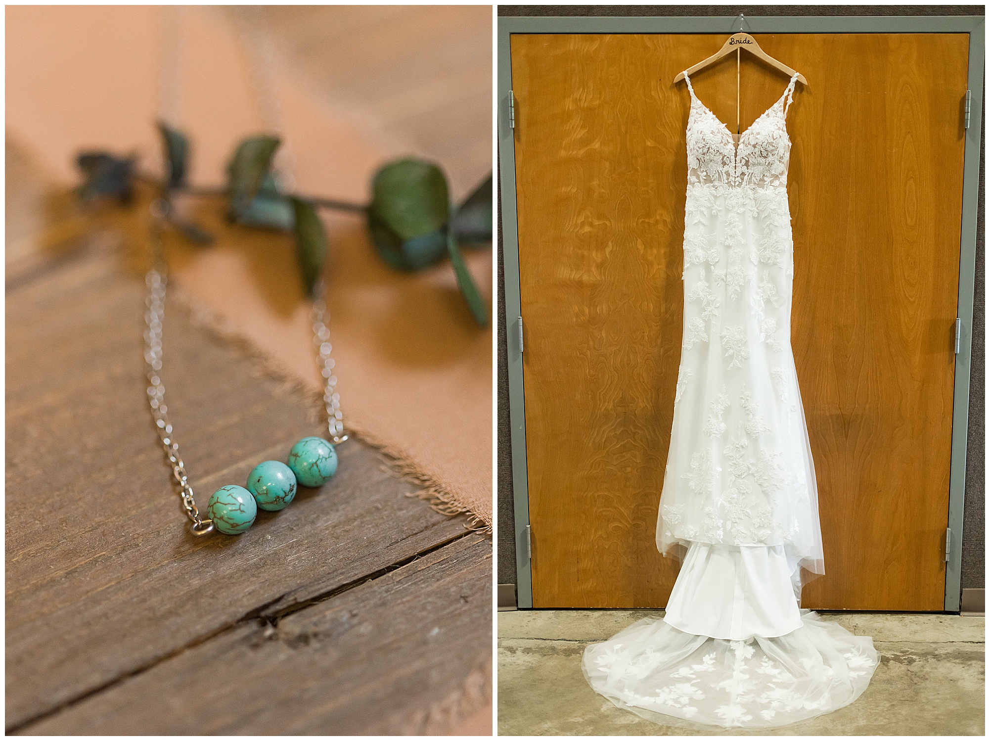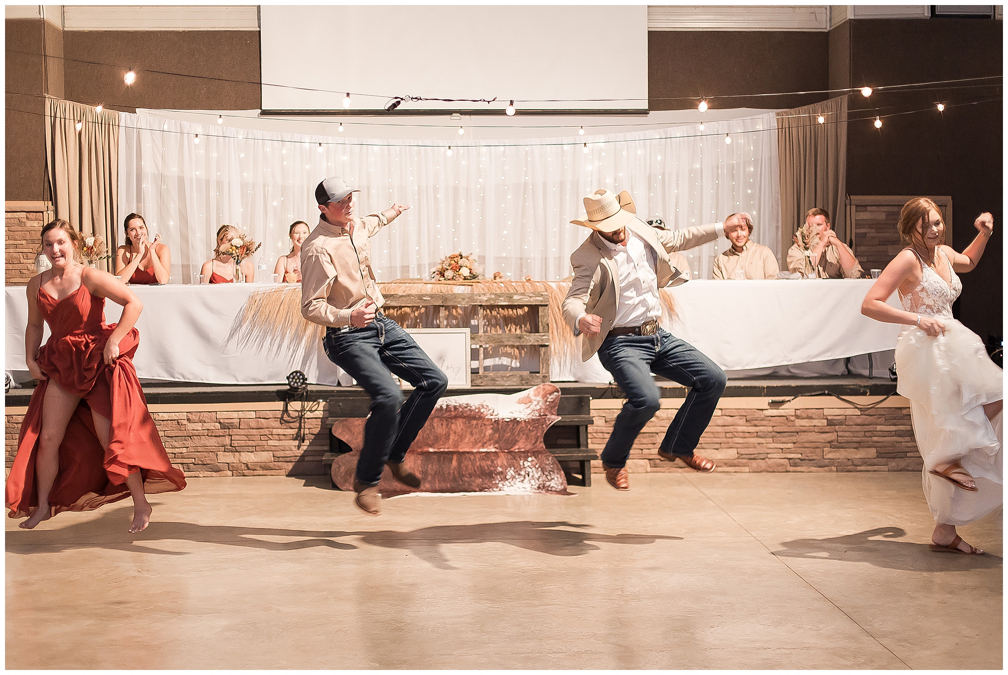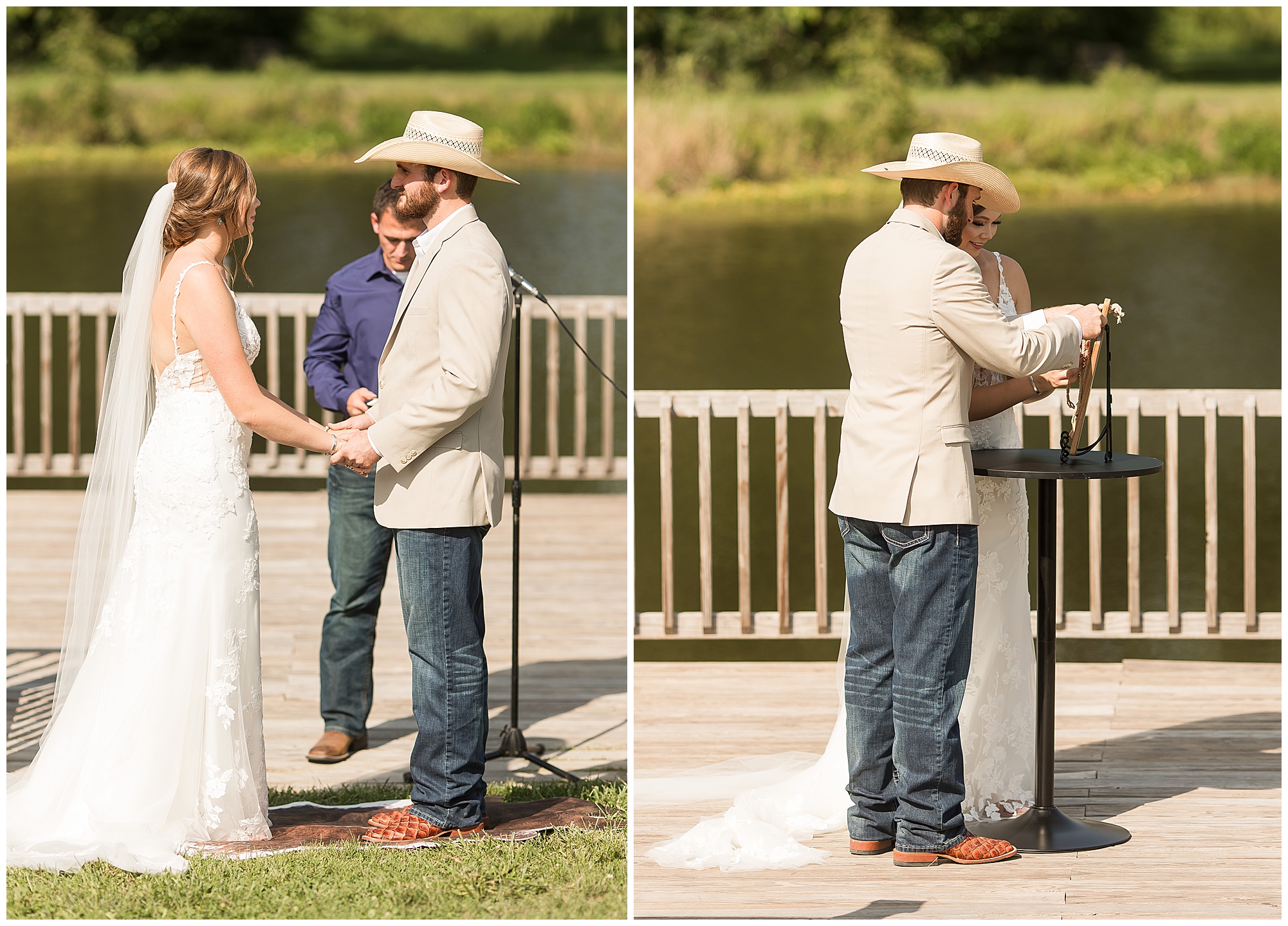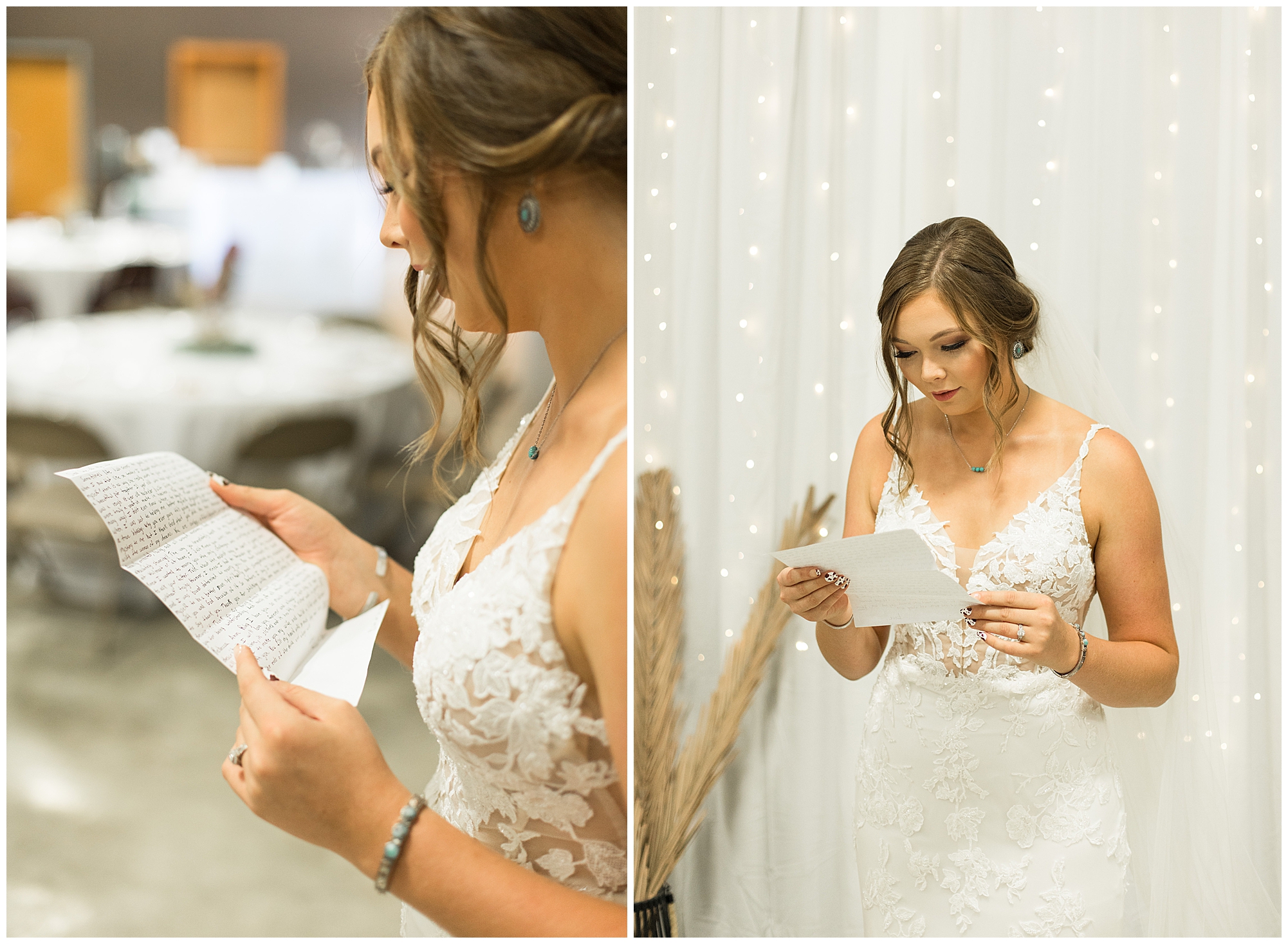 Becca and Trace’s rustic and rural wedding day was just want I imagined for these two. They both grew up or continue to work around the farm. They are a rodeo-loving couple, who takes every chance they can to show love to their support systems. And they adore a good belt buckle bigger than the state of Illinois! Becca and Trace are the epitome of what it means to be laid back and go with the flow. Which is what makes me love them so much! I began the beautiful mid-August day with Becca and her ladies as they were getting their hair and makeup done. This bride was all smiles and couldn’t have been more excited about what the future holds. Luckily for me, I have worked with Becca years before her special day, when I photographed her brother, Nathan’s wedding to Jenny. So I have been very much looking forward to seeing all of her family again. The lovely burnt orange bridesmaids dresses and pops of creams and turquoise were throughout the accessories and bride’s details. When it came time to get Becca dressed she was absolutely stunning in her floral appliqué gown with hints of sparkles and leaf embroidery. When she added the cathedral length veil, which was her something borrowed from her sister-in-law, Jenny, she seriously could have been on the cover of a bridal magazine!