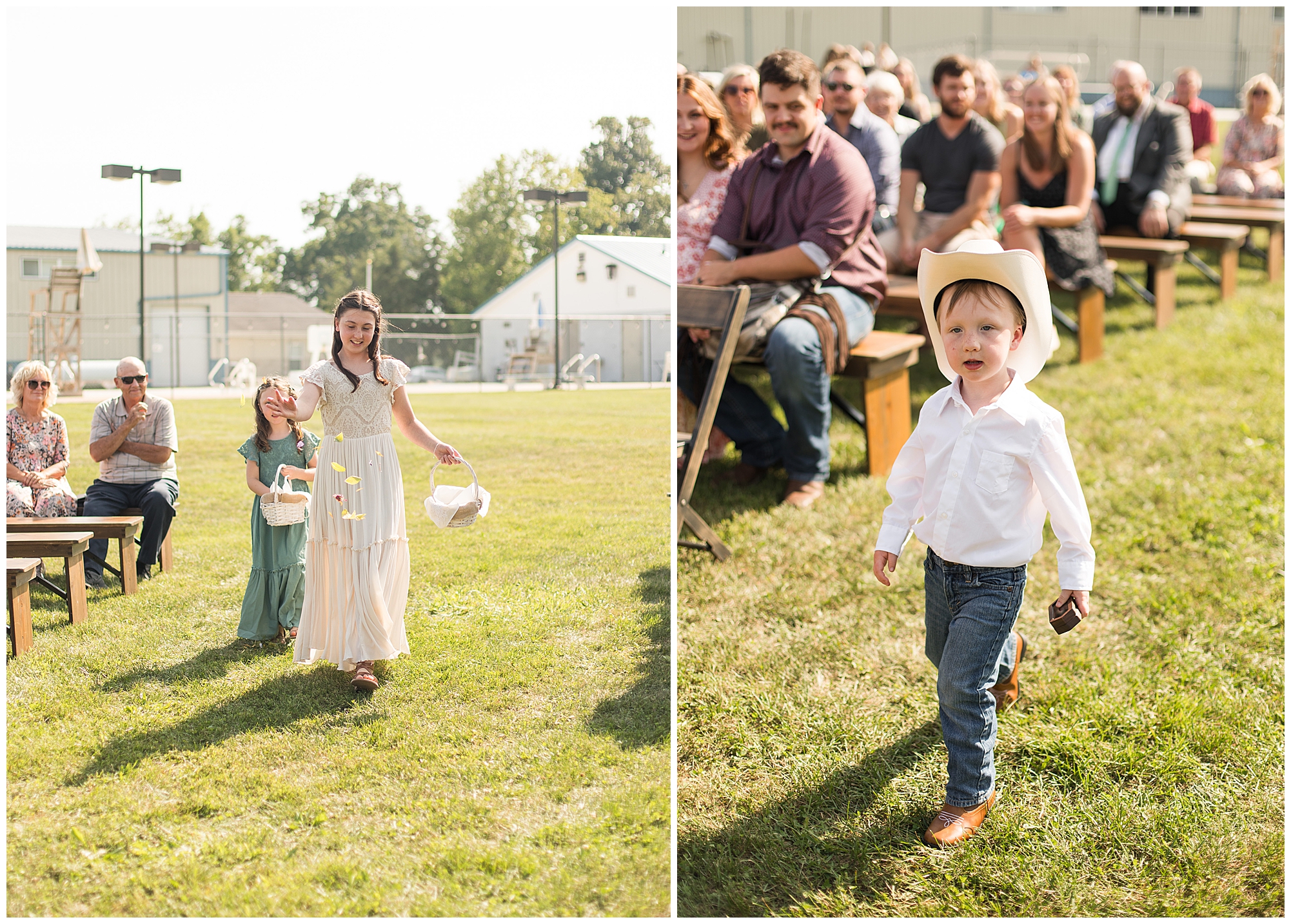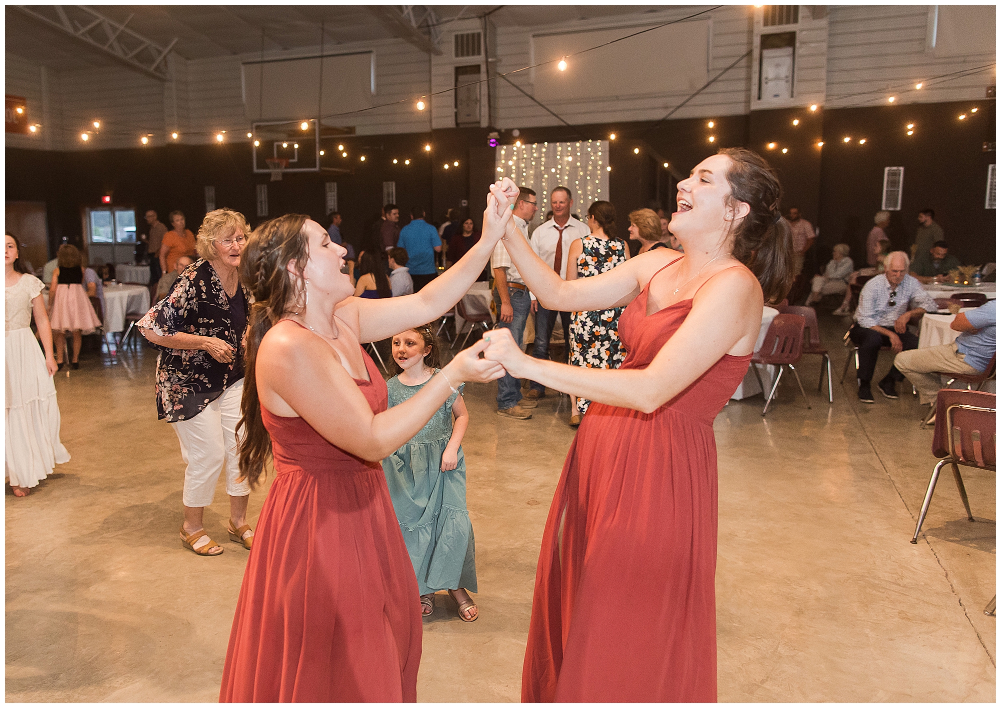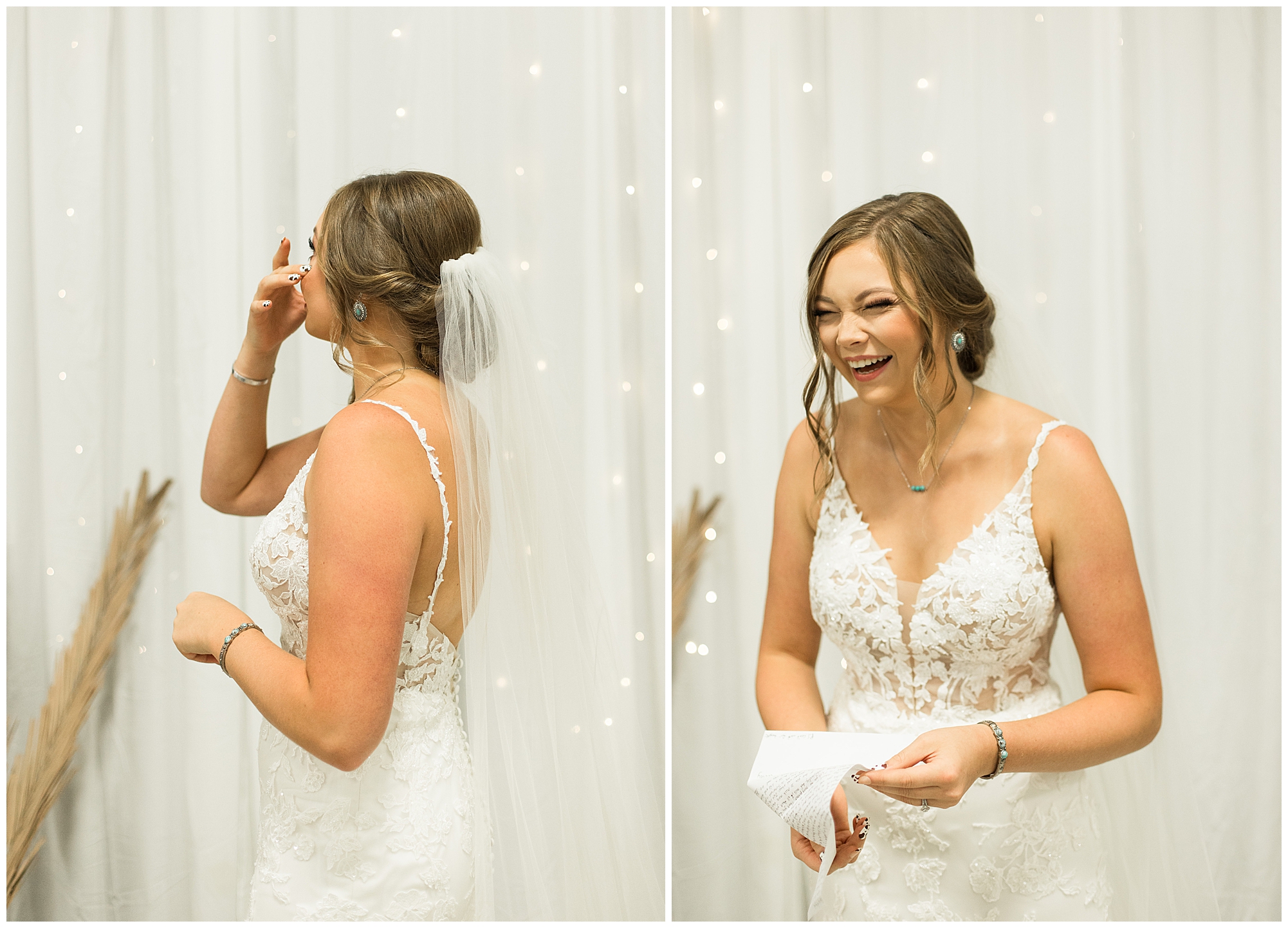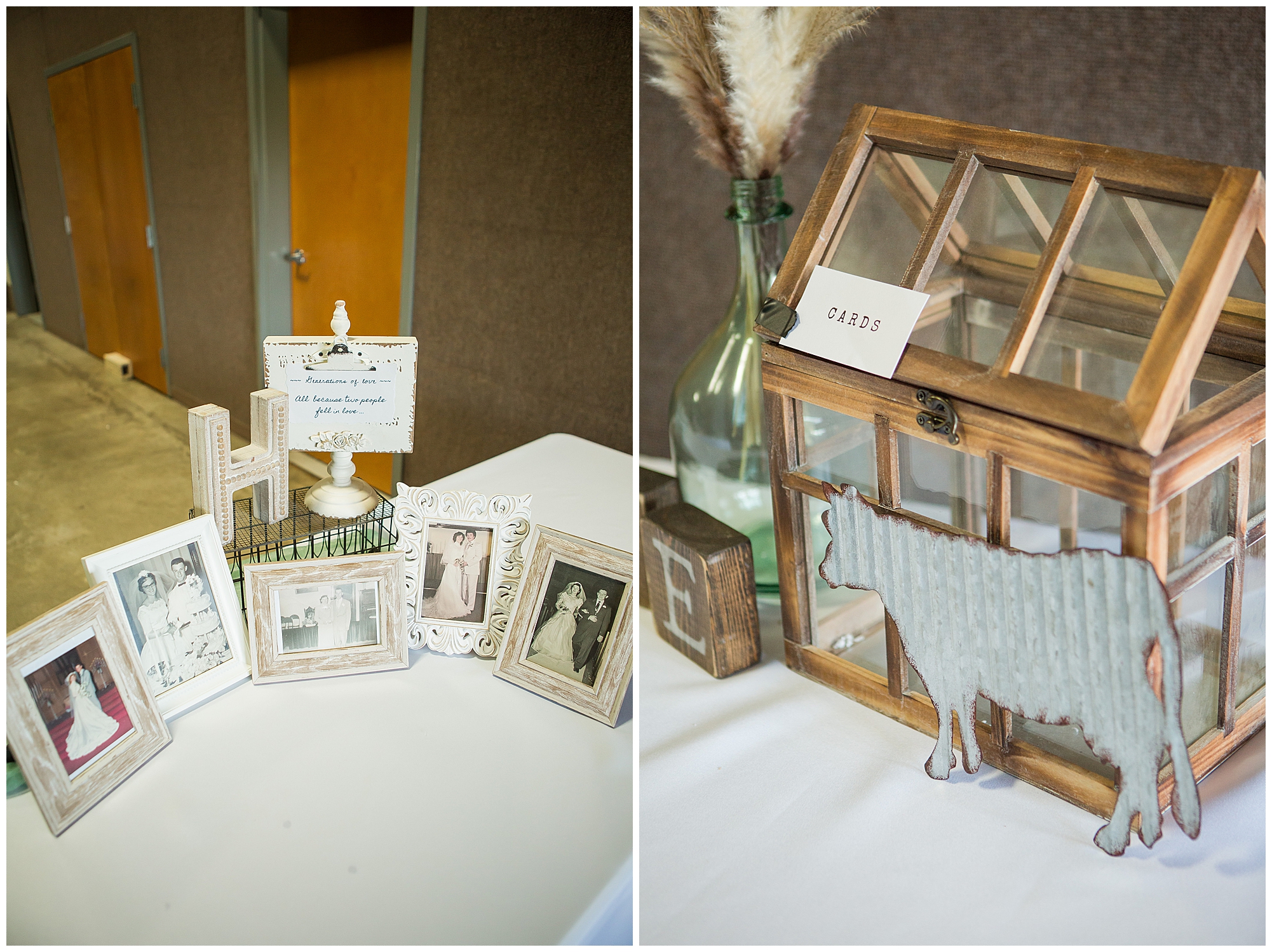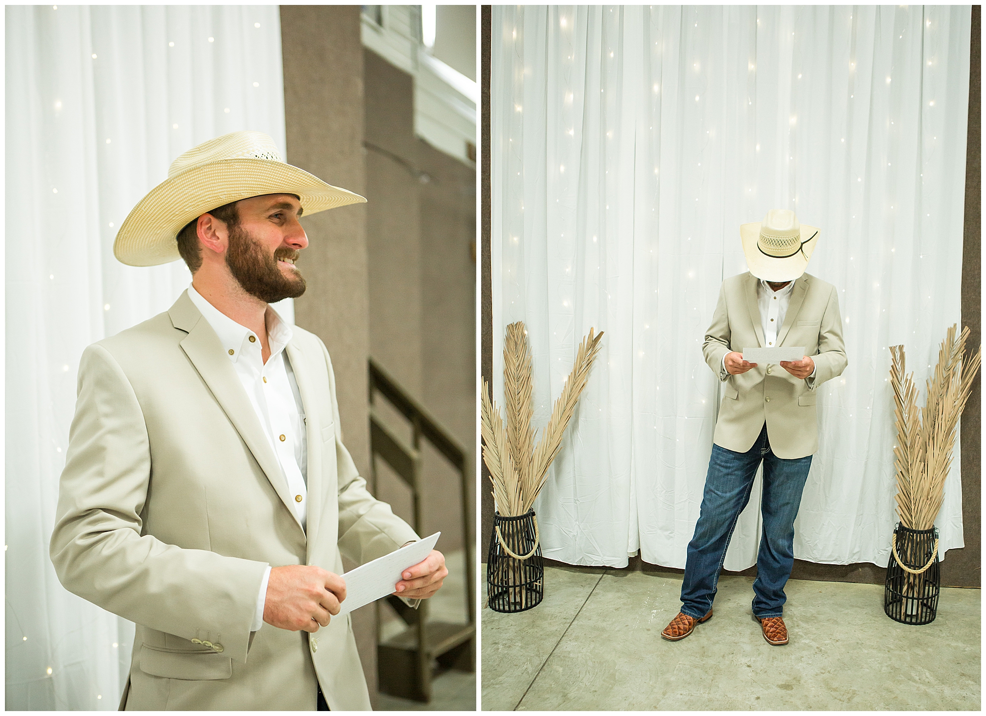 Becca and Trace’s rustic and rural wedding day was just want I imagined for these two. They both grew up or continue to work around the farm. They are a rodeo-loving couple, who takes every chance they can to show love to their support systems. And they adore a good belt buckle bigger than the state of Illinois! Becca and Trace are the epitome of what it means to be laid back and go with the flow. Which is what makes me love them so much! I began the beautiful mid-August day with Becca and her ladies as they were getting their hair and makeup done. This bride was all smiles and couldn’t have been more excited about what the future holds. Luckily for me, I have worked with Becca years before her special day, when I photographed her brother, Nathan’s wedding to Jenny. So I have been very much looking forward to seeing all of her family again. The lovely burnt orange bridesmaids dresses and pops of creams and turquoise were throughout the accessories and bride’s details. When it came time to get Becca dressed she was absolutely stunning in her floral appliqué gown with hints of sparkles and leaf embroidery. When she added the cathedral length veil, which was her something borrowed from her sister-in-law, Jenny, she seriously could have been on the cover of a bridal magazine!