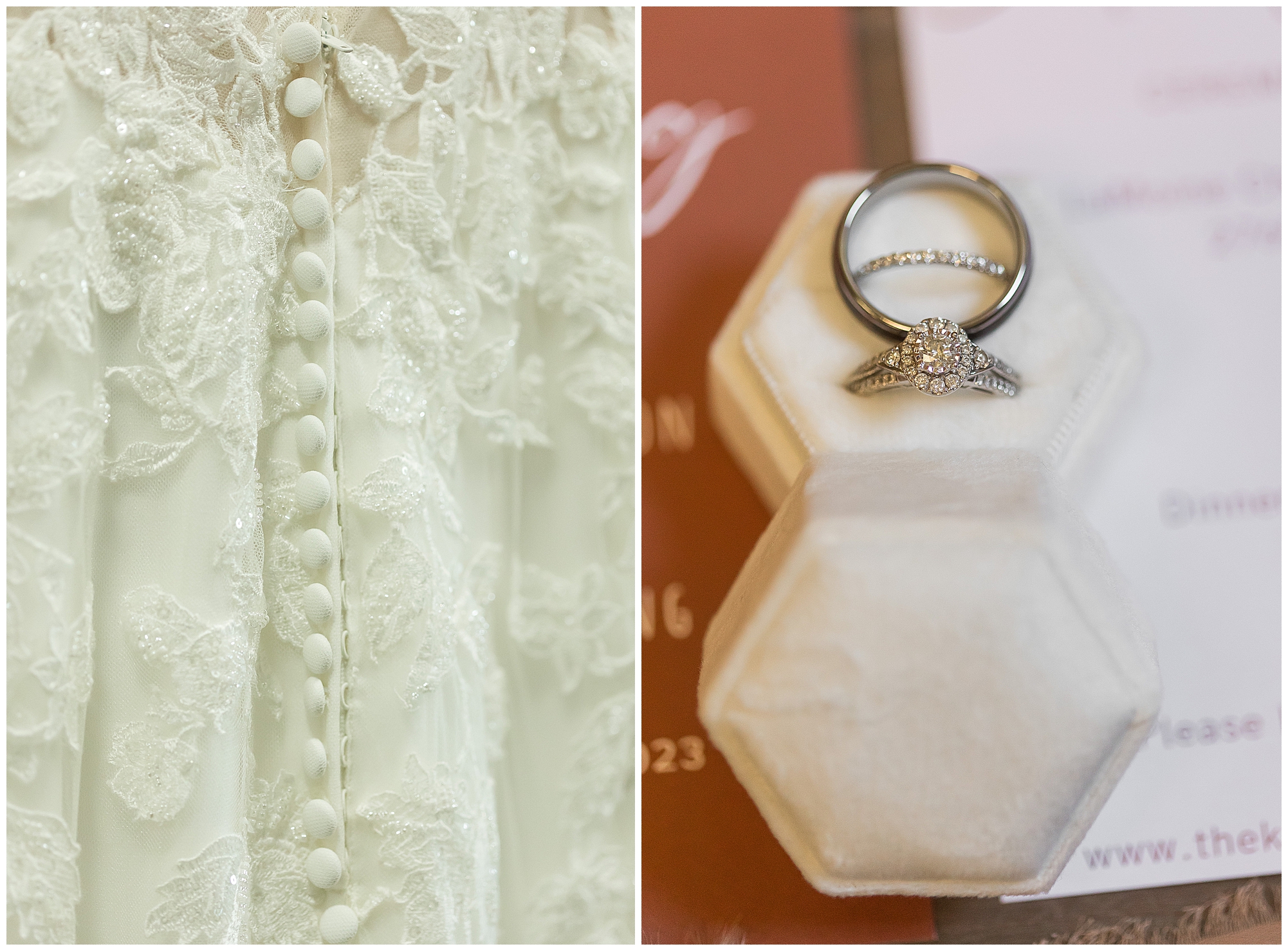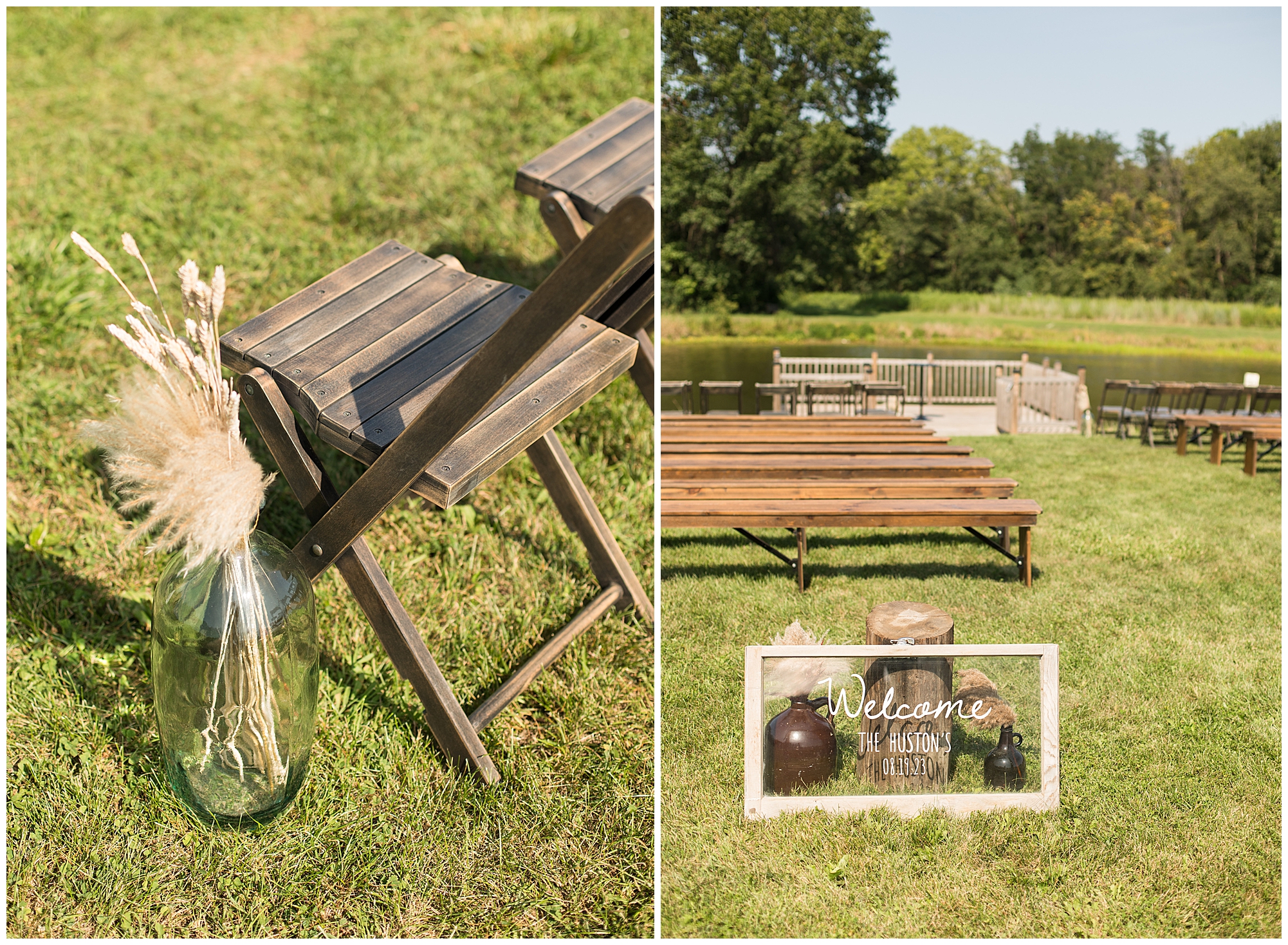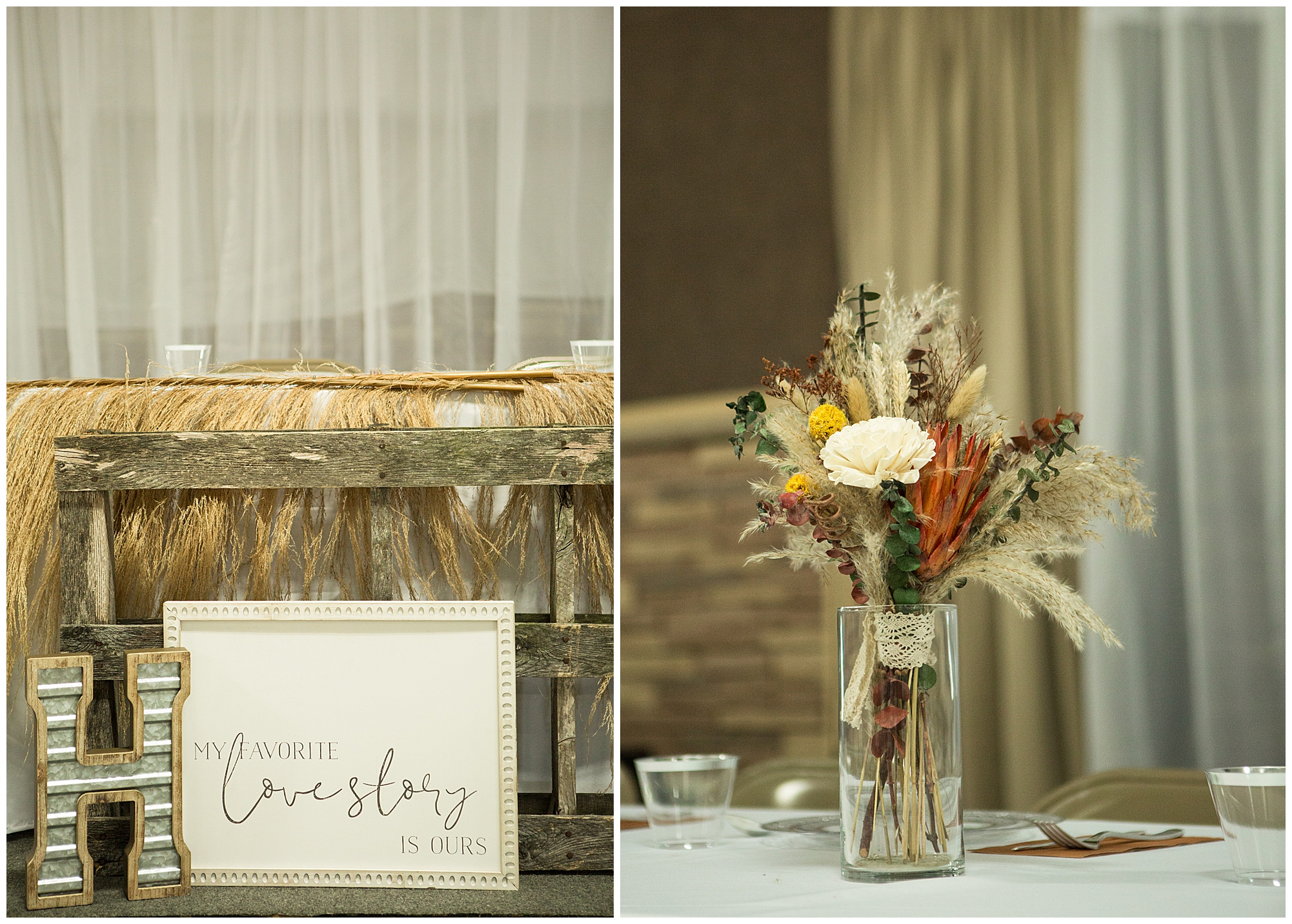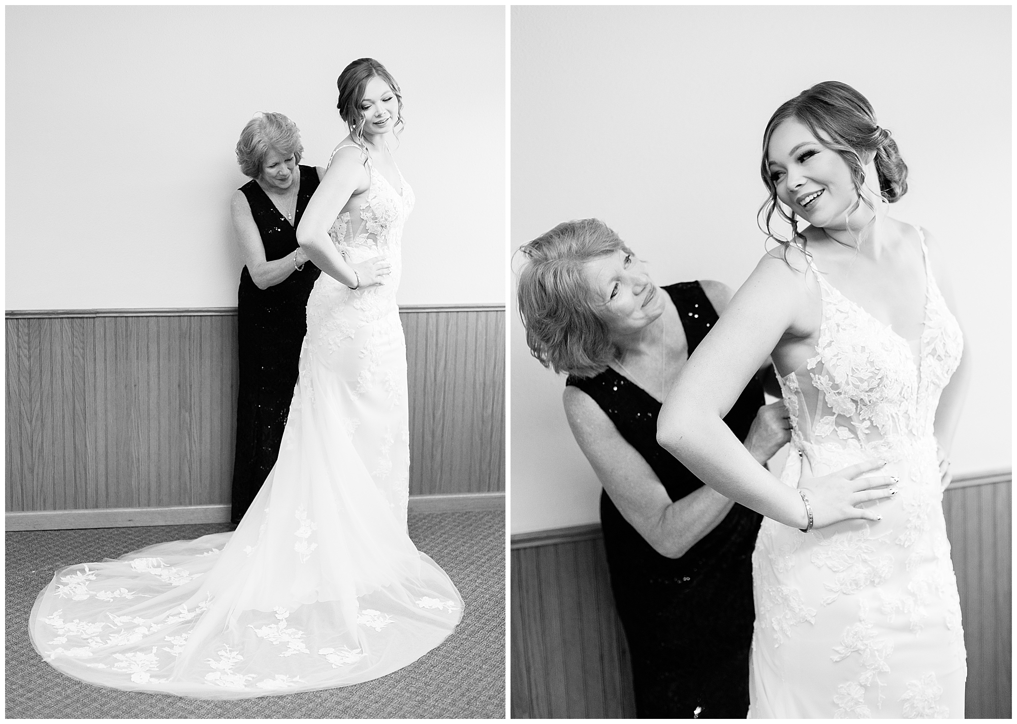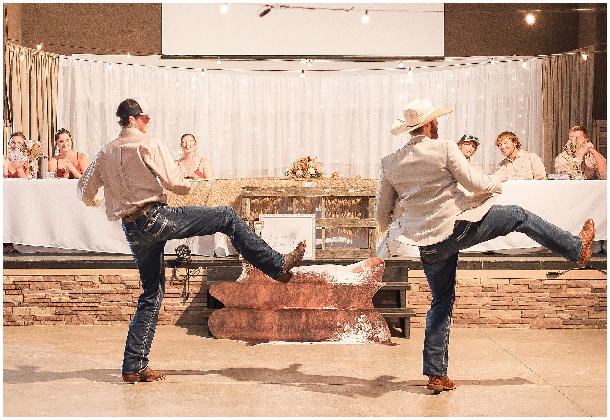Becca and Trace’s rustic and rural wedding day was just want I imagined for these two. They both grew up or continue to work around the farm. They are a rodeo-loving couple, who takes every chance they can to show love to their support systems. And they adore a good belt buckle bigger than the state of Illinois! Becca and Trace are the epitome of what it means to be laid back and go with the flow. Which is what makes me love them so much! I began the beautiful mid-August day with Becca and her ladies as they were getting their hair and makeup done. This bride was all smiles and couldn’t have been more excited about what the future holds. Luckily for me, I have worked with Becca years before her special day, when I photographed her brother, Nathan’s wedding to Jenny. So I have been very much looking forward to seeing all of her family again. The lovely burnt orange bridesmaids dresses and pops of creams and turquoise were throughout the accessories and bride’s details. When it came time to get Becca dressed she was absolutely stunning in her floral appliqué gown with hints of sparkles and leaf embroidery. When she added the cathedral length veil, which was her something borrowed from her sister-in-law, Jenny, she seriously could have been on the cover of a bridal magazine!