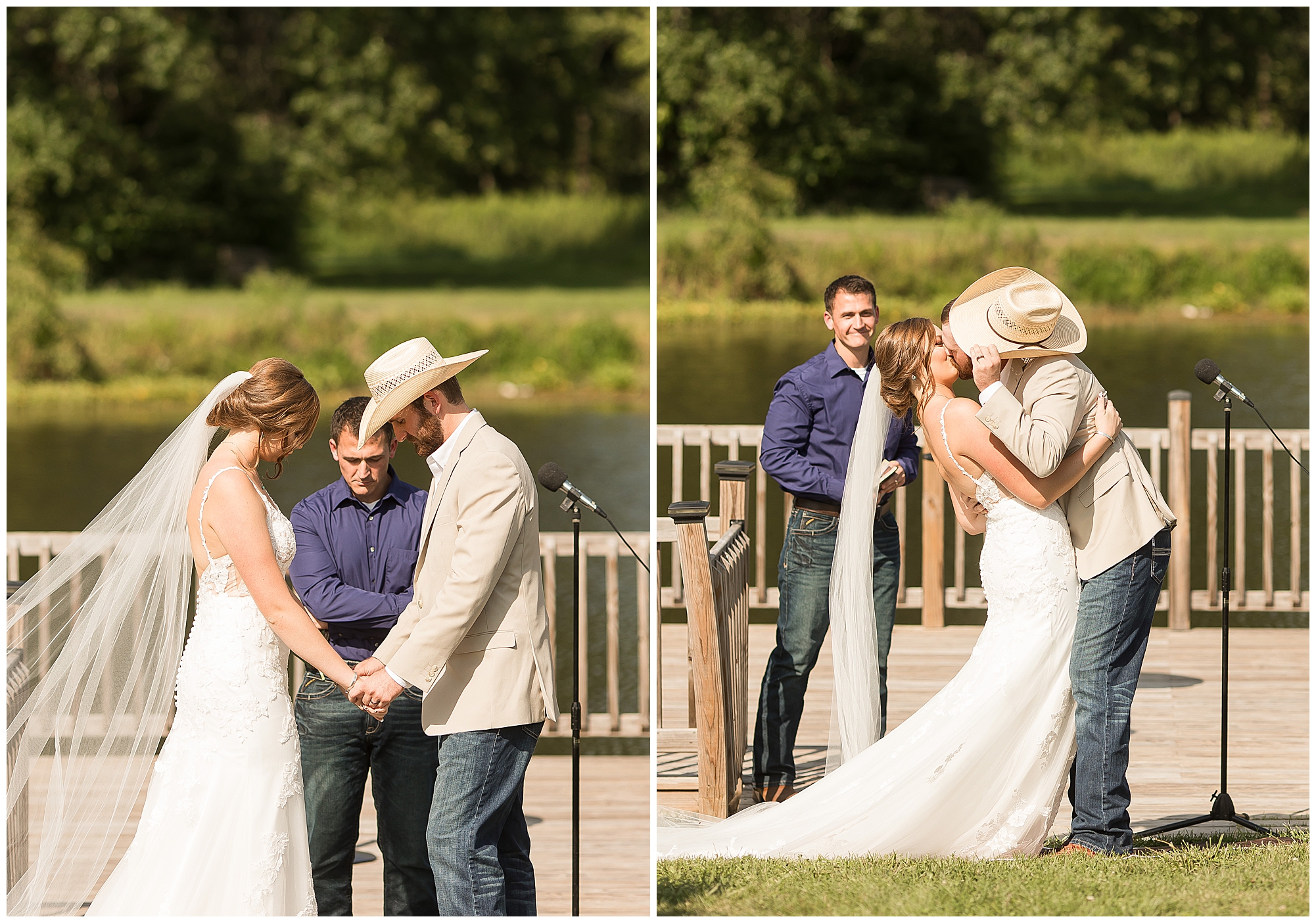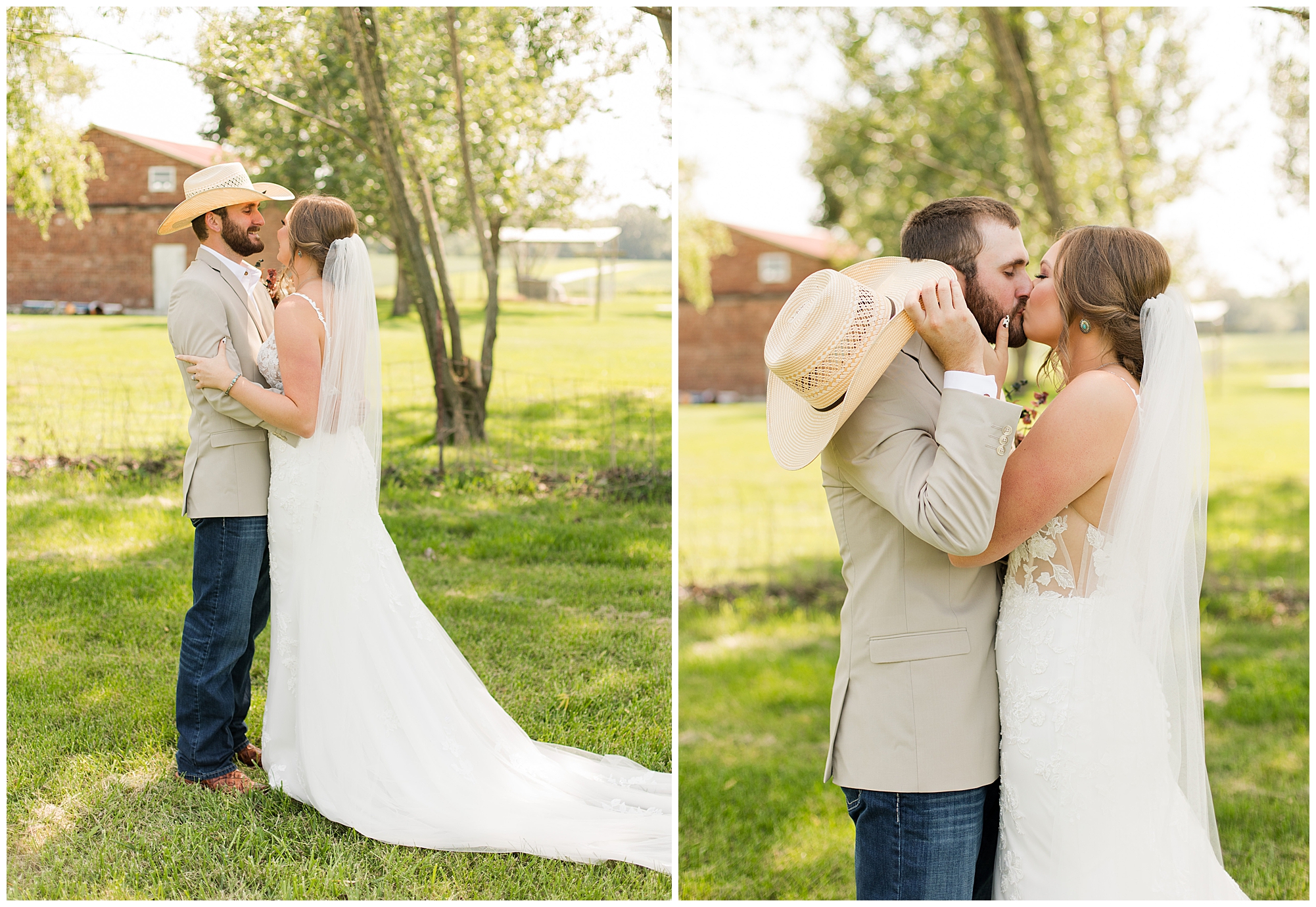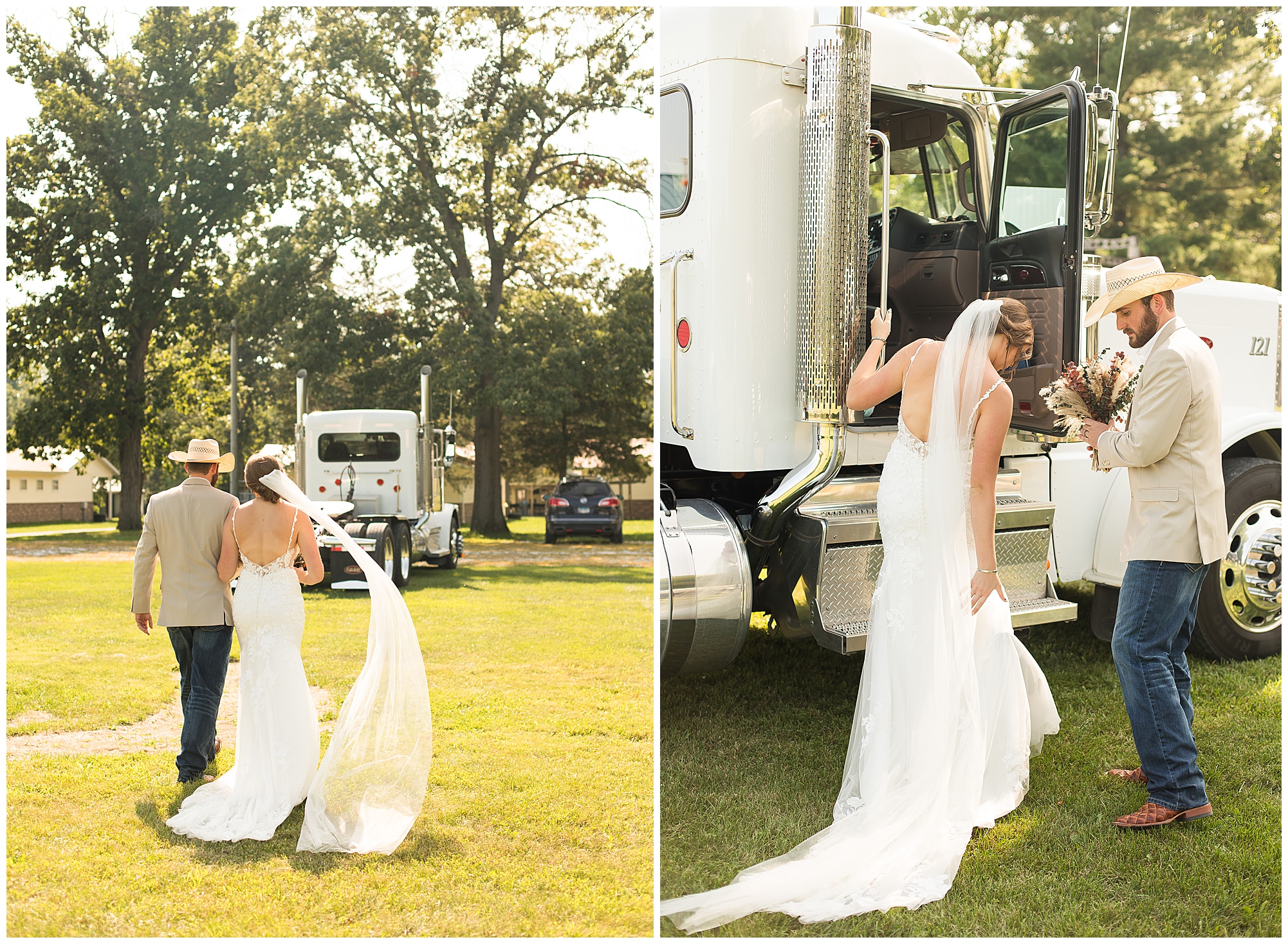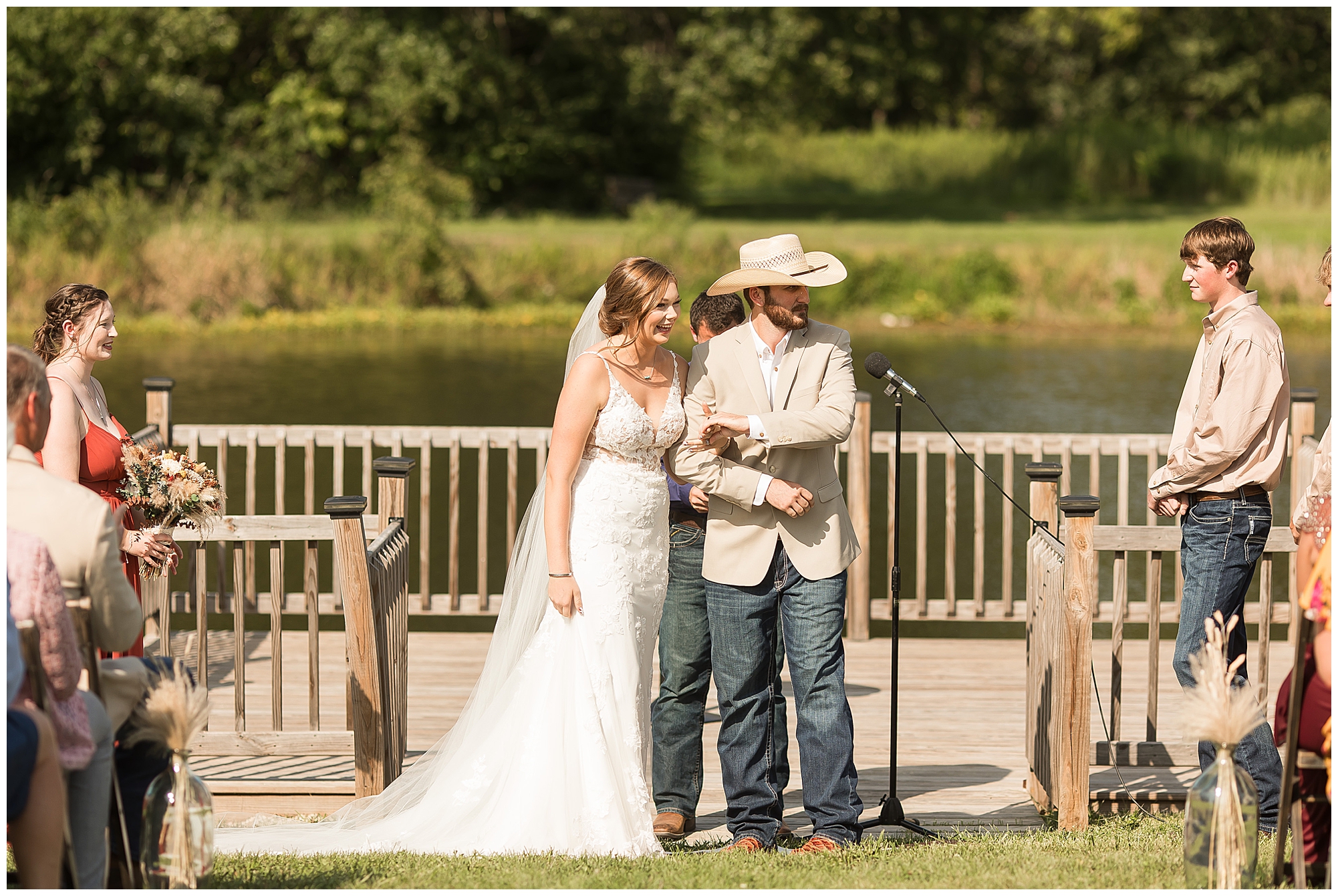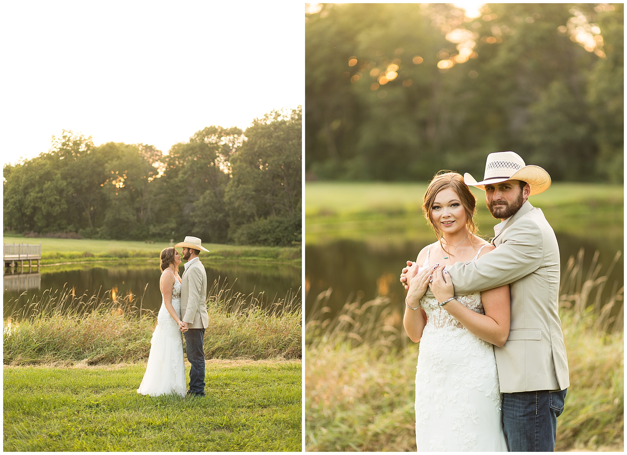 Before we knew it, the ceremony was upon us. Their nuptials took place right in front of a tree-lined pond surrounded by their loved ones. Becca’s dad walked her down the aisle as Trace held back his emotions. Many graceful words were spoken, rings were exchanged, and they sealed their love with a kiss. Congrats to the new Mr. & Mrs. Huston! They exited to their getaway vehicle, a semi-truck from the farm where Trace works. Their guests stood and watched as they rode off and Trace gave them a big honk from the cab! When they returned we finished up family formals before they entered into their reception. Their decor consisted of centerpieces of mason jars filled with wheat along with other florals, windmills (similar to the one found during their engagement session), and cows which these two adore. I mean come on did you peep Becca’s nails?! They were showered with blessings during their toasts, took a few spins around the dance floor with each other and family, and just spent every moment enjoying their evening. Before I let them go for the day, however, I had to steal them for a few sunset photos. We had been waiting for the perfect lighting around the pond and this was it! The pure joy these two had in one another’s arms was something magical. I feel so incredibly blessed to have captured it all! I’m sending all my blessings to the new Mr. & Mrs. Huston!